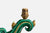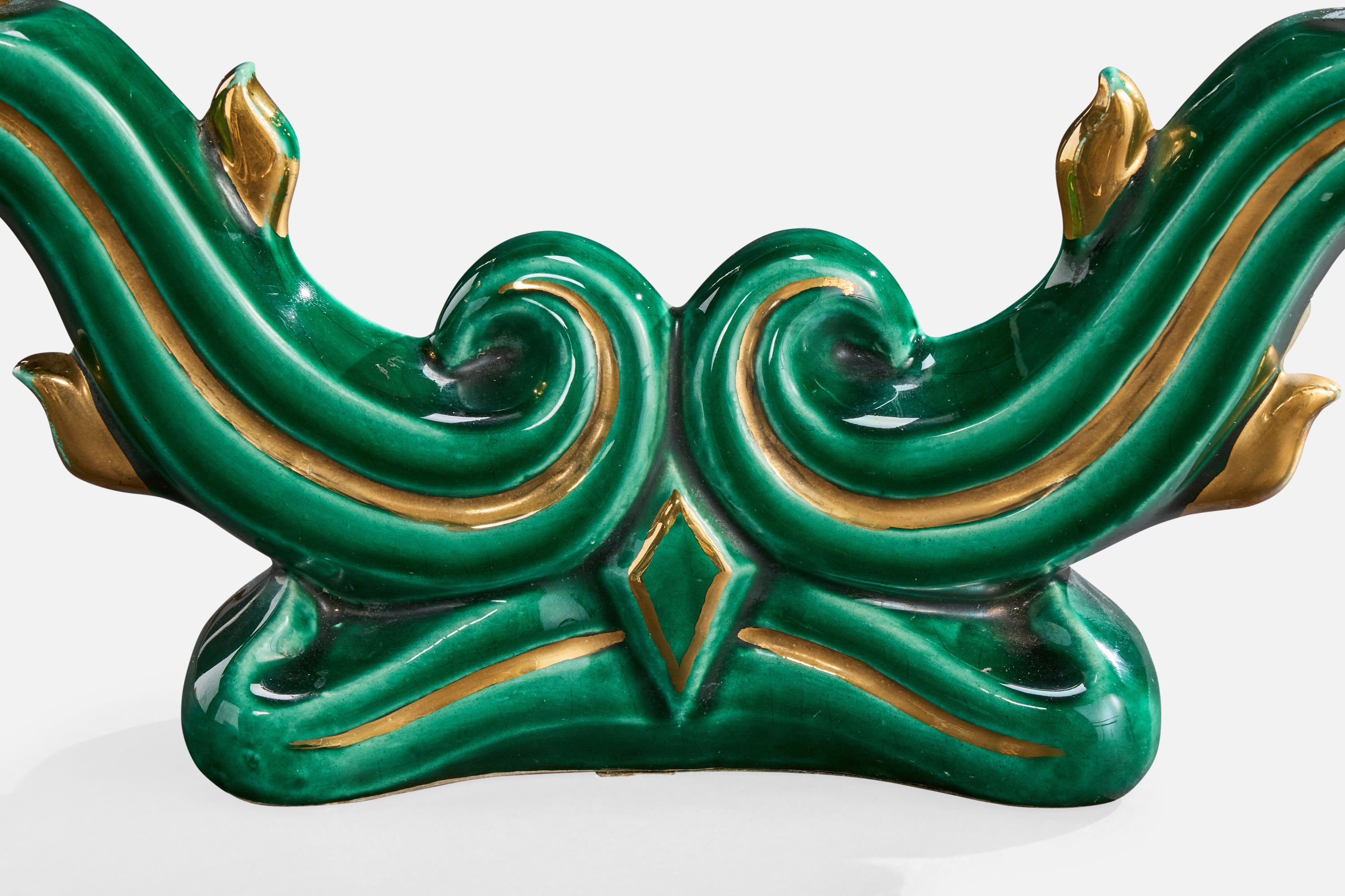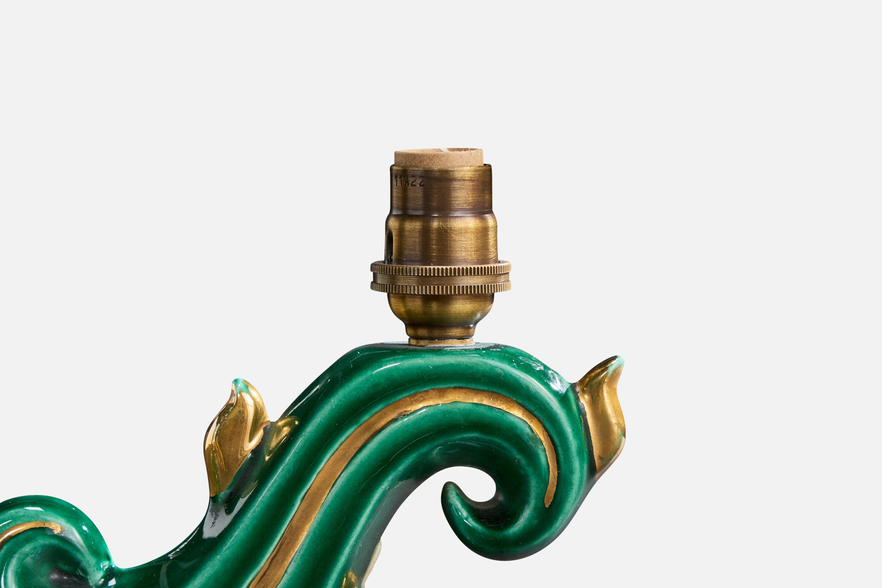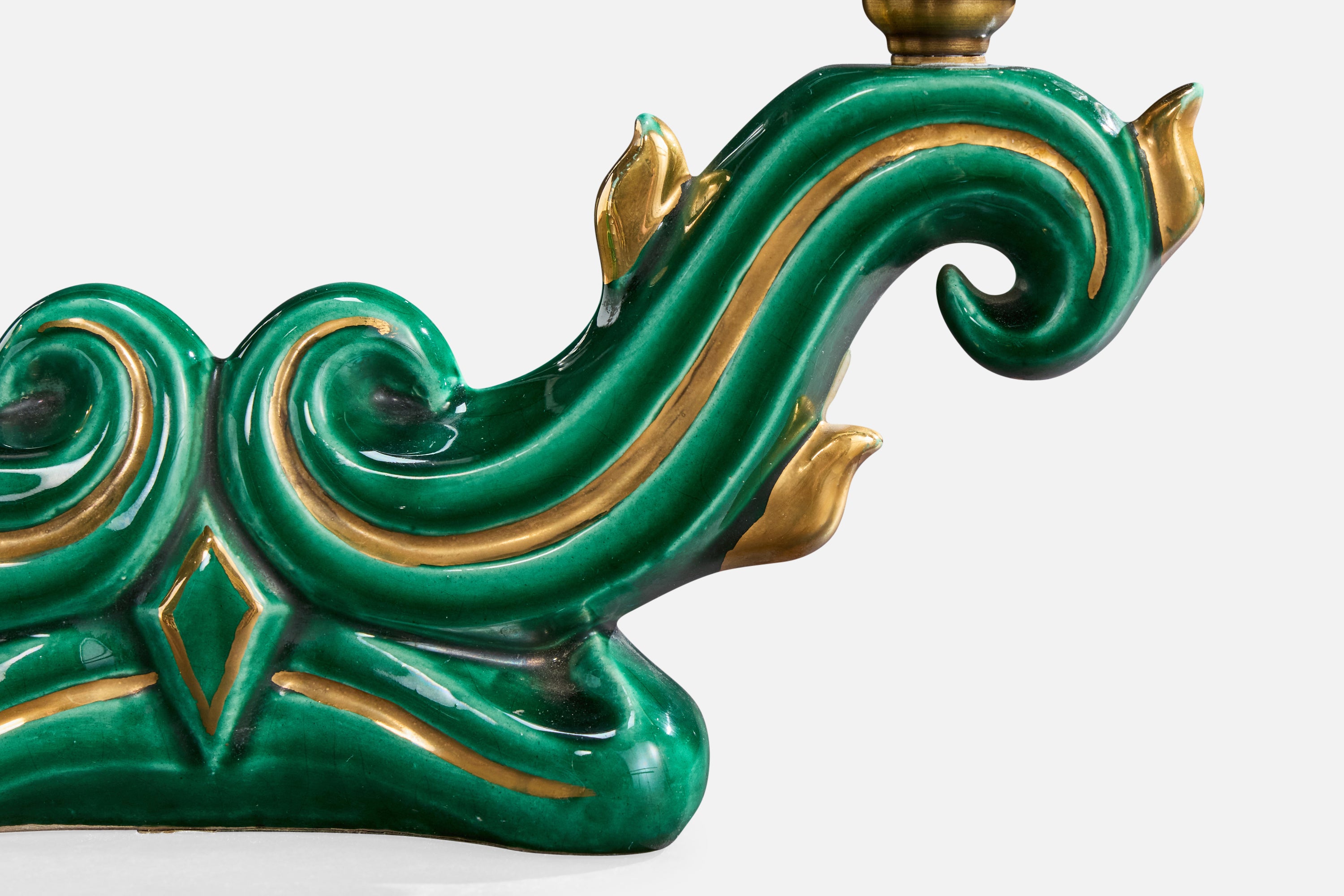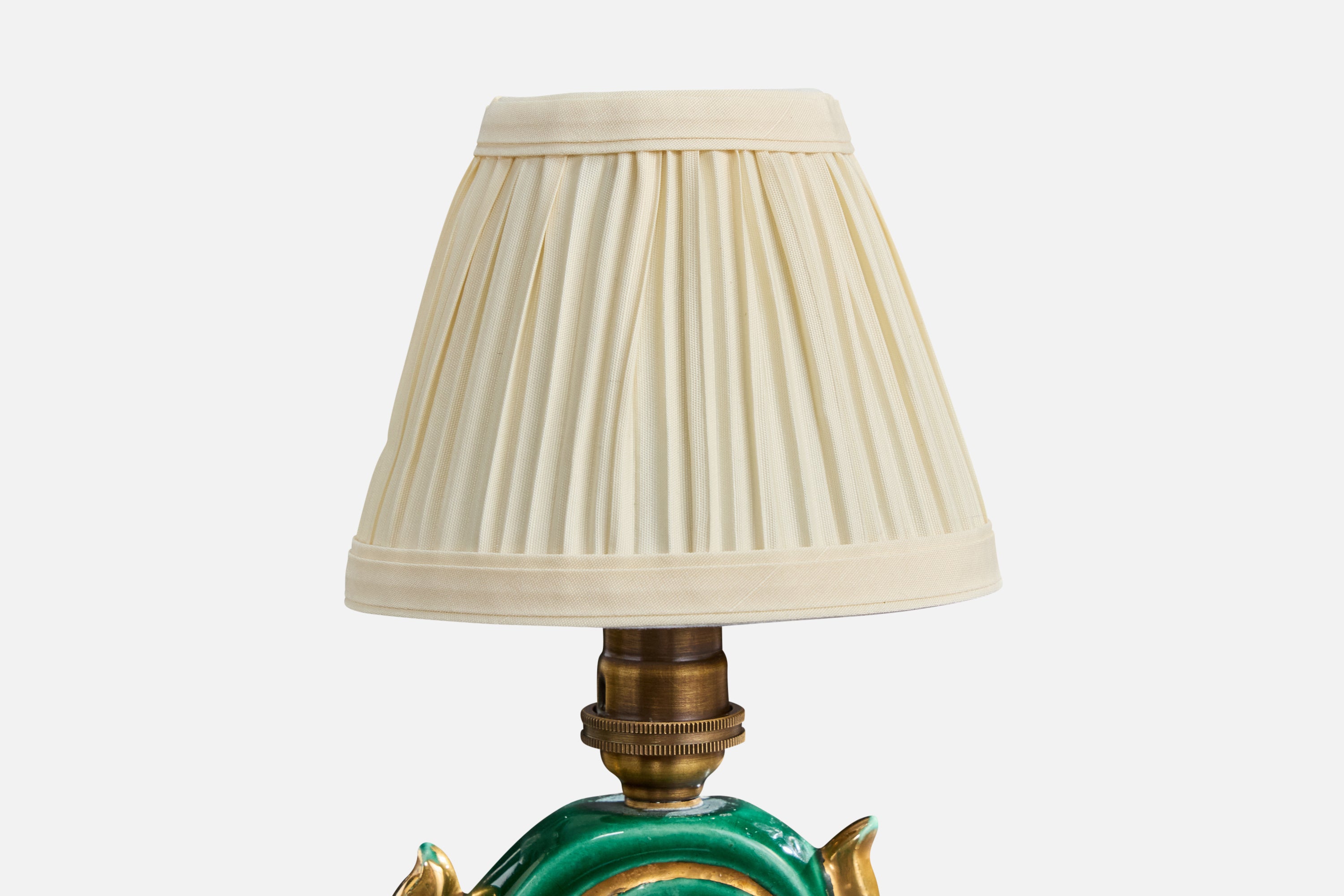 A pair of gold, green-glazed ceramic, brass and off-white fabric table lamps designed and produced in France, c. 1960s.