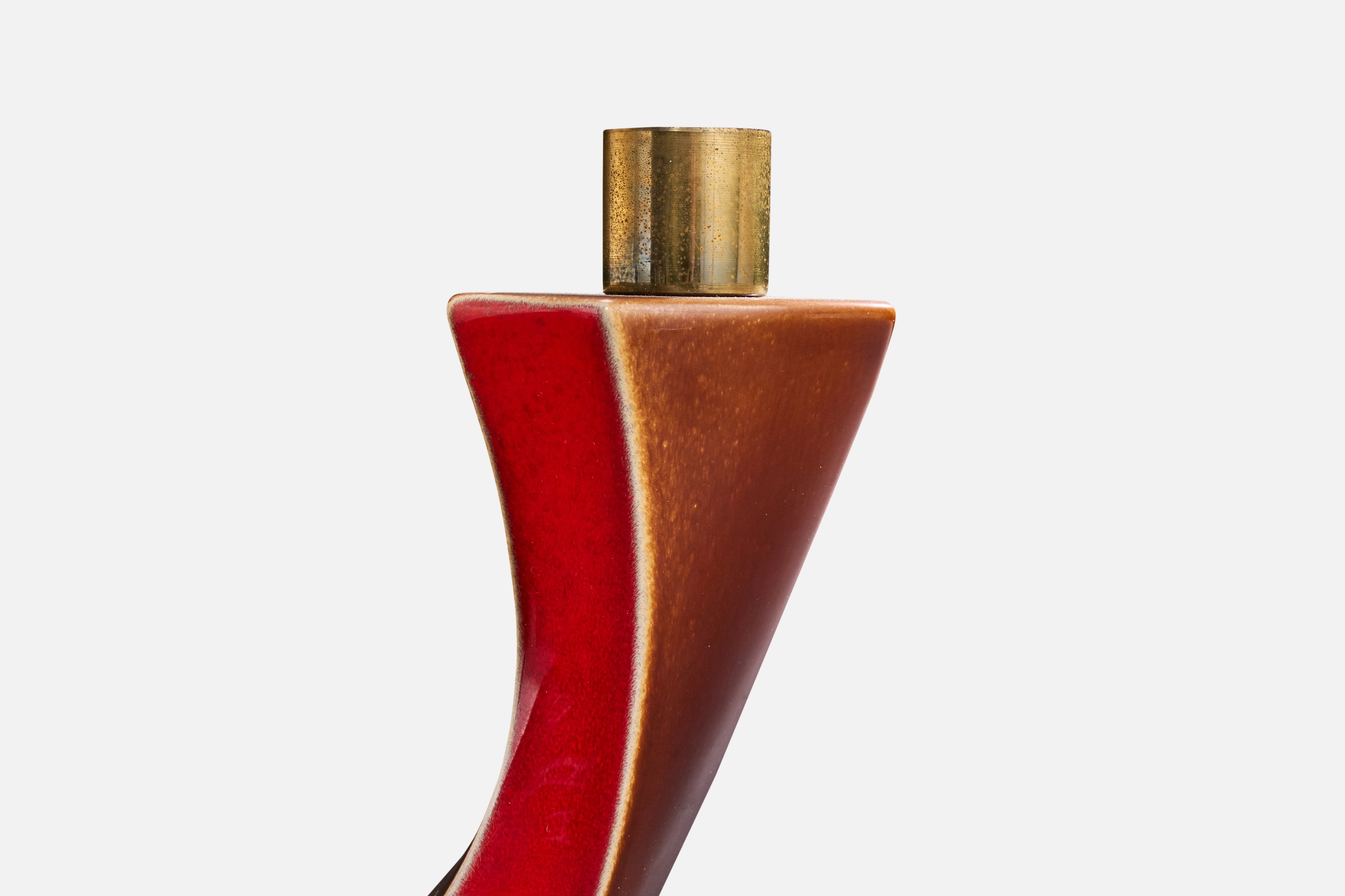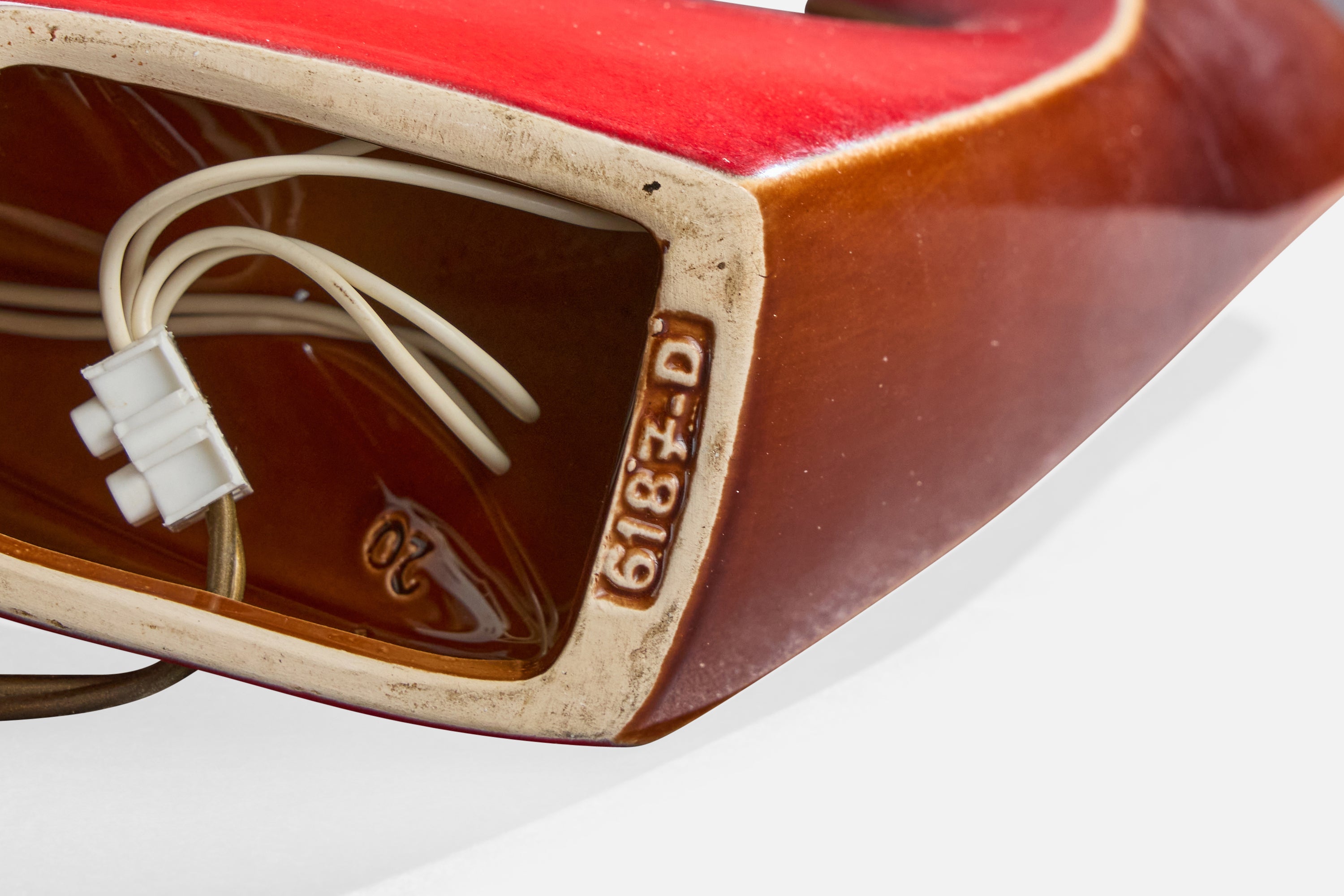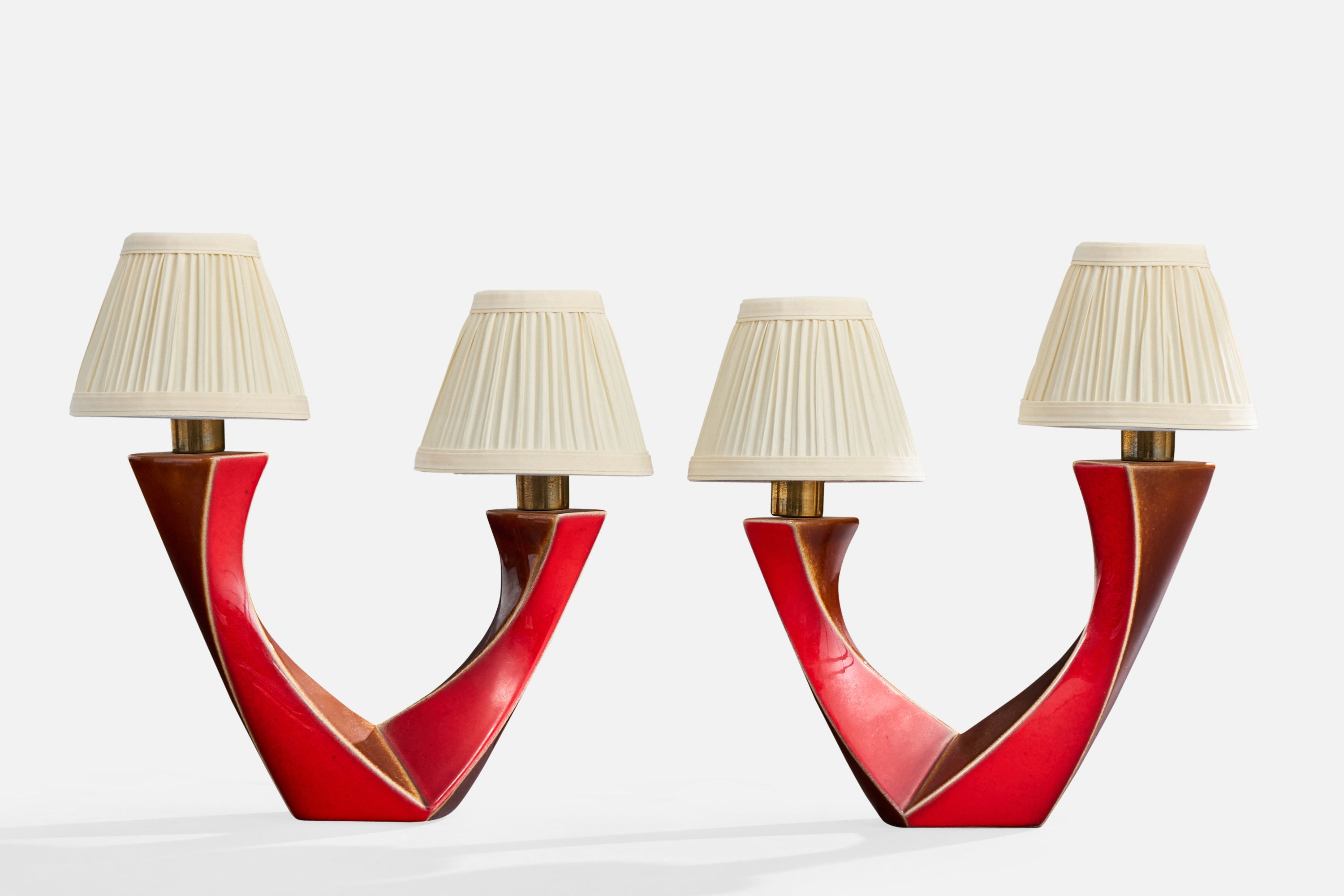 A pair of red brown ceramic, brass, and off-white fabric table lamps designed and produced in France, c. 1960s.