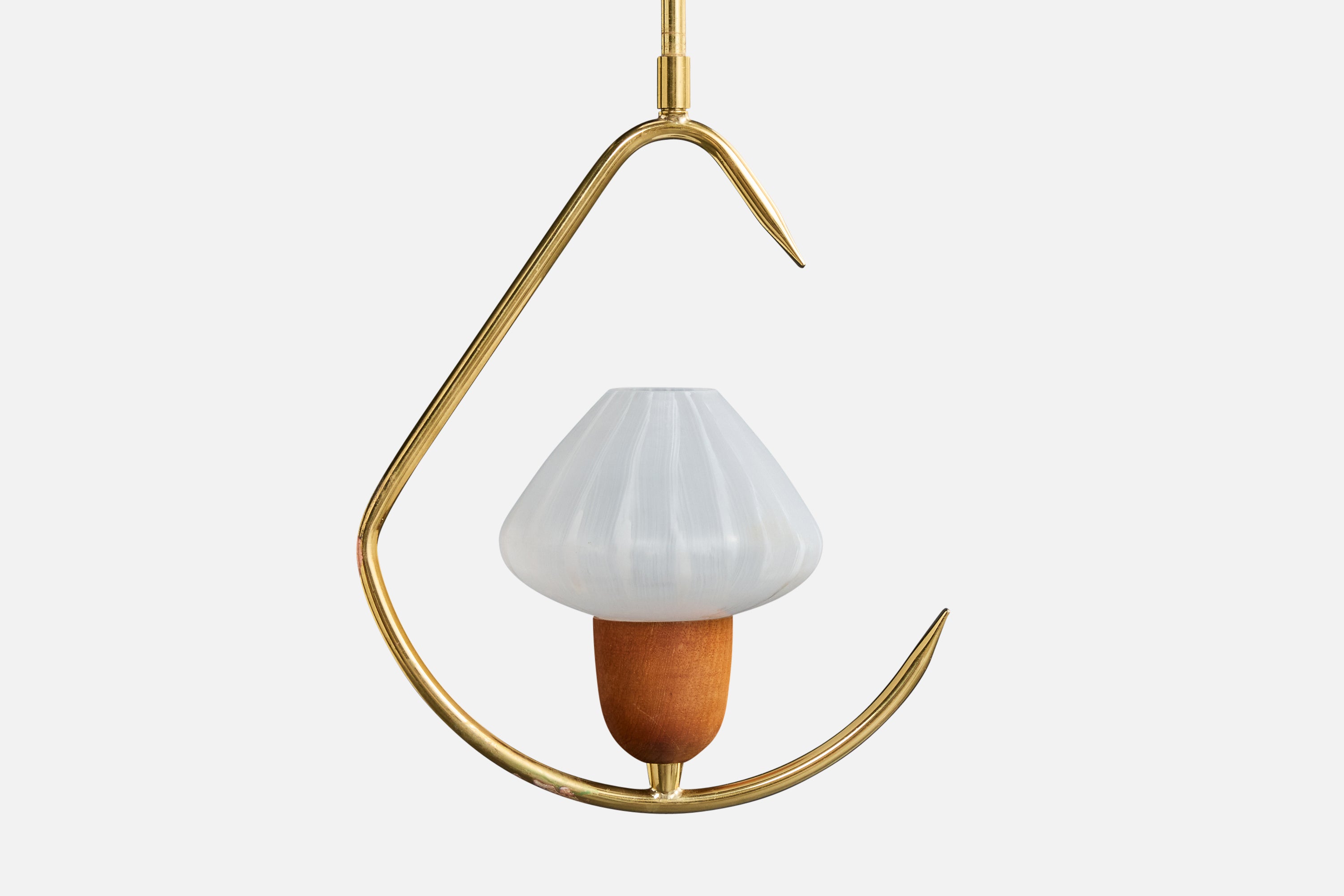 A brass, teak and white opaline glass pendant light designed and produced in Sweden, c. 1950s.