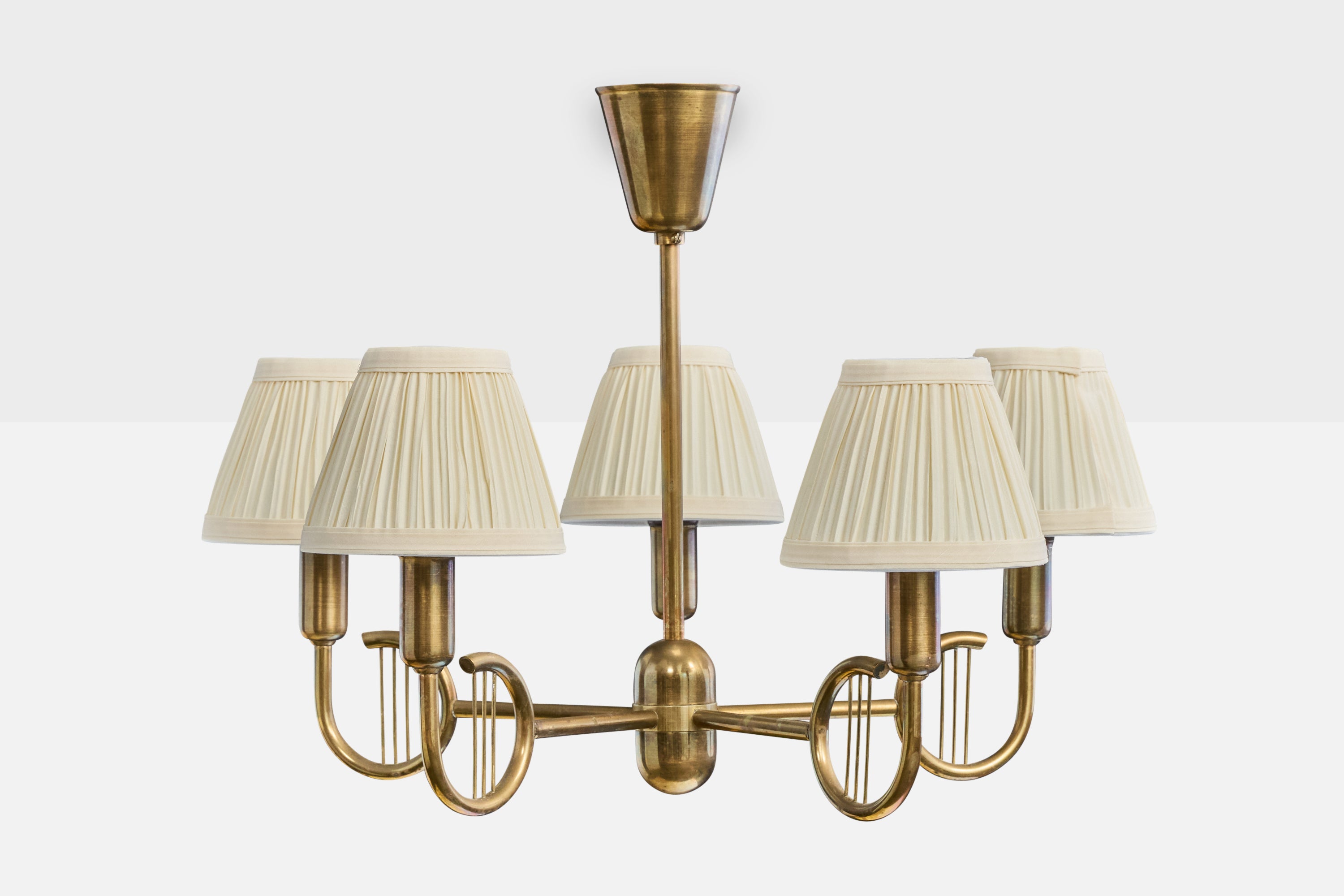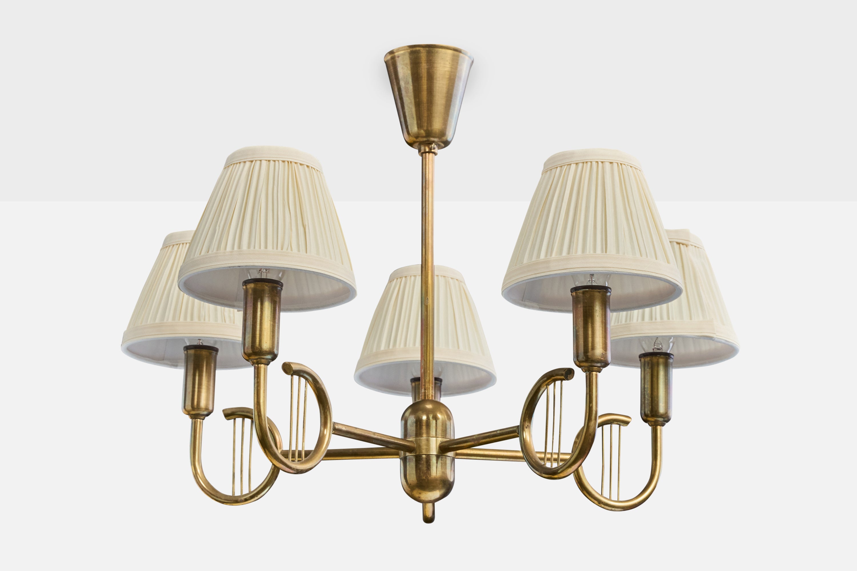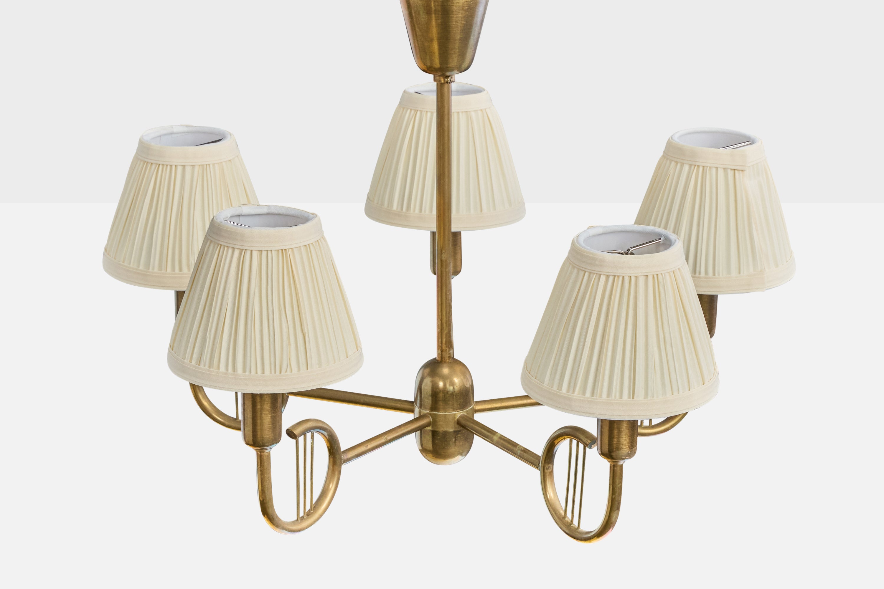 A brass and off-white fabric chandelier designed and produced in Denmark, c. 1950s.