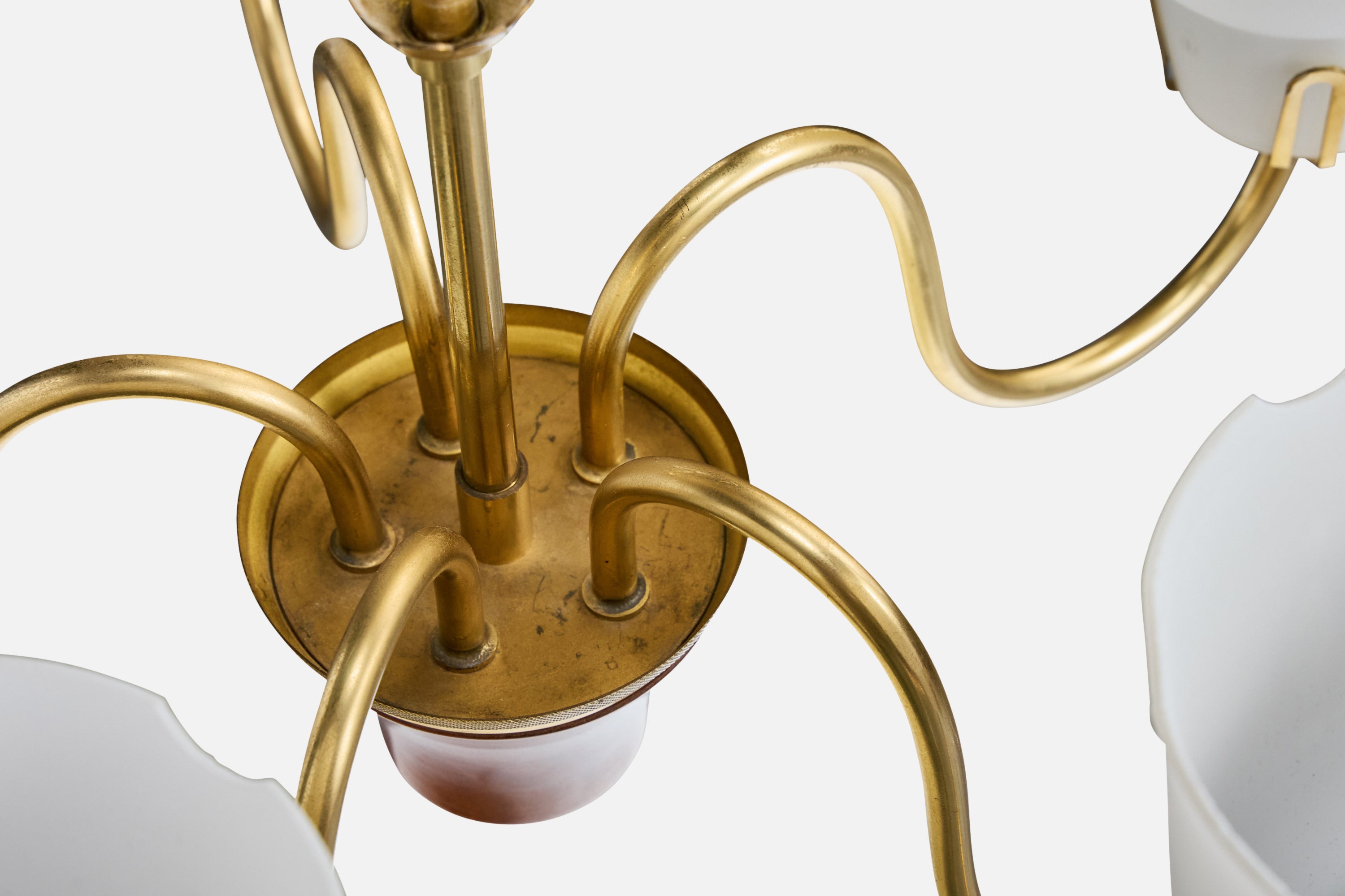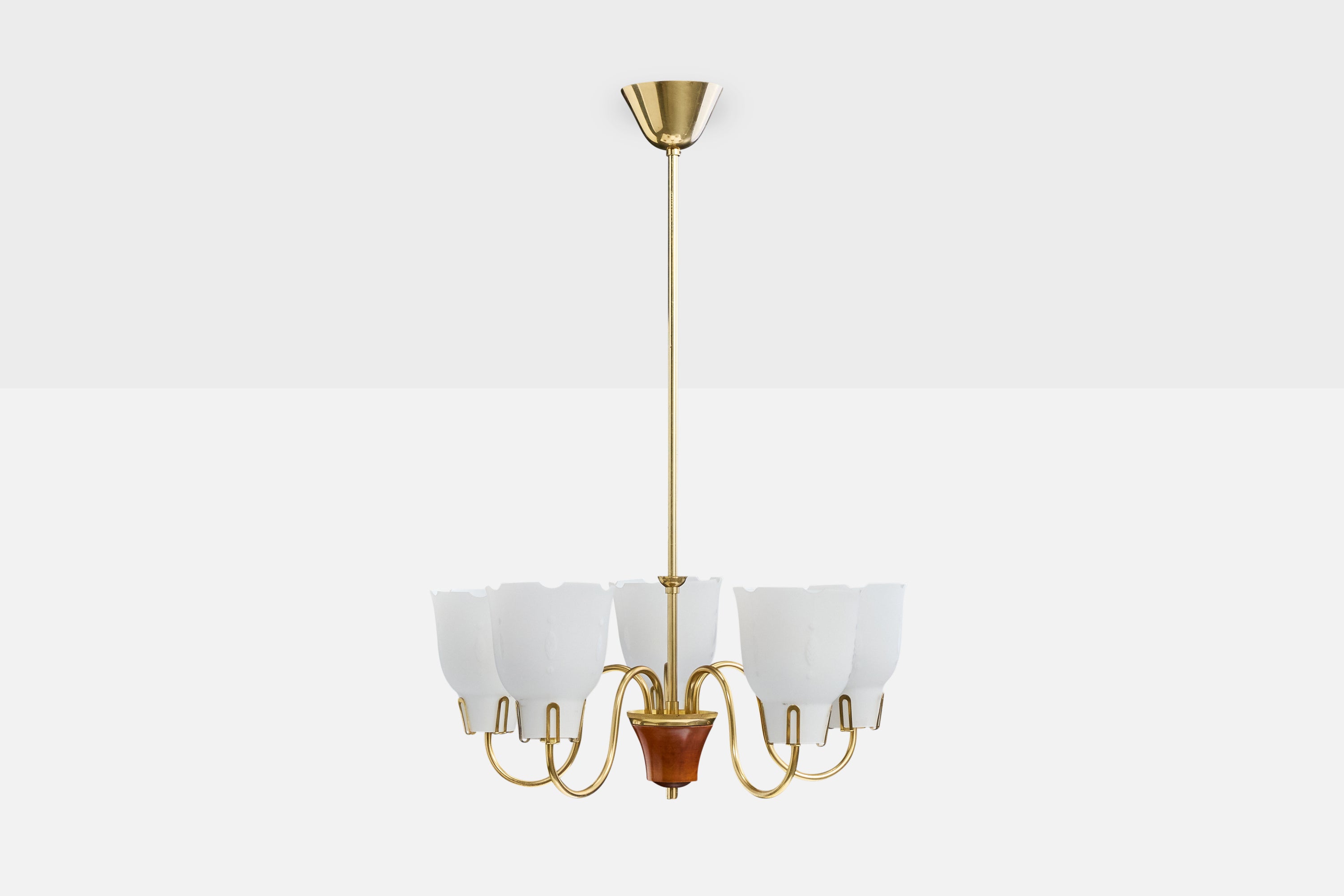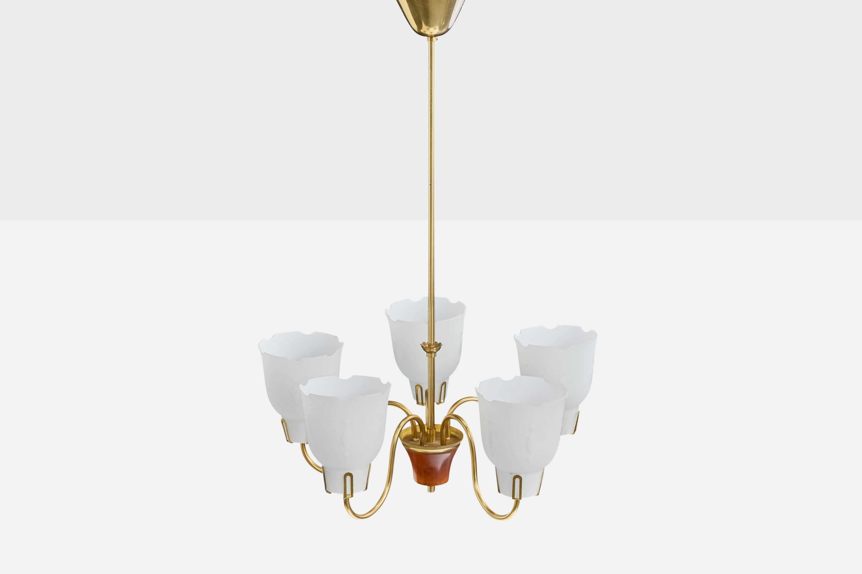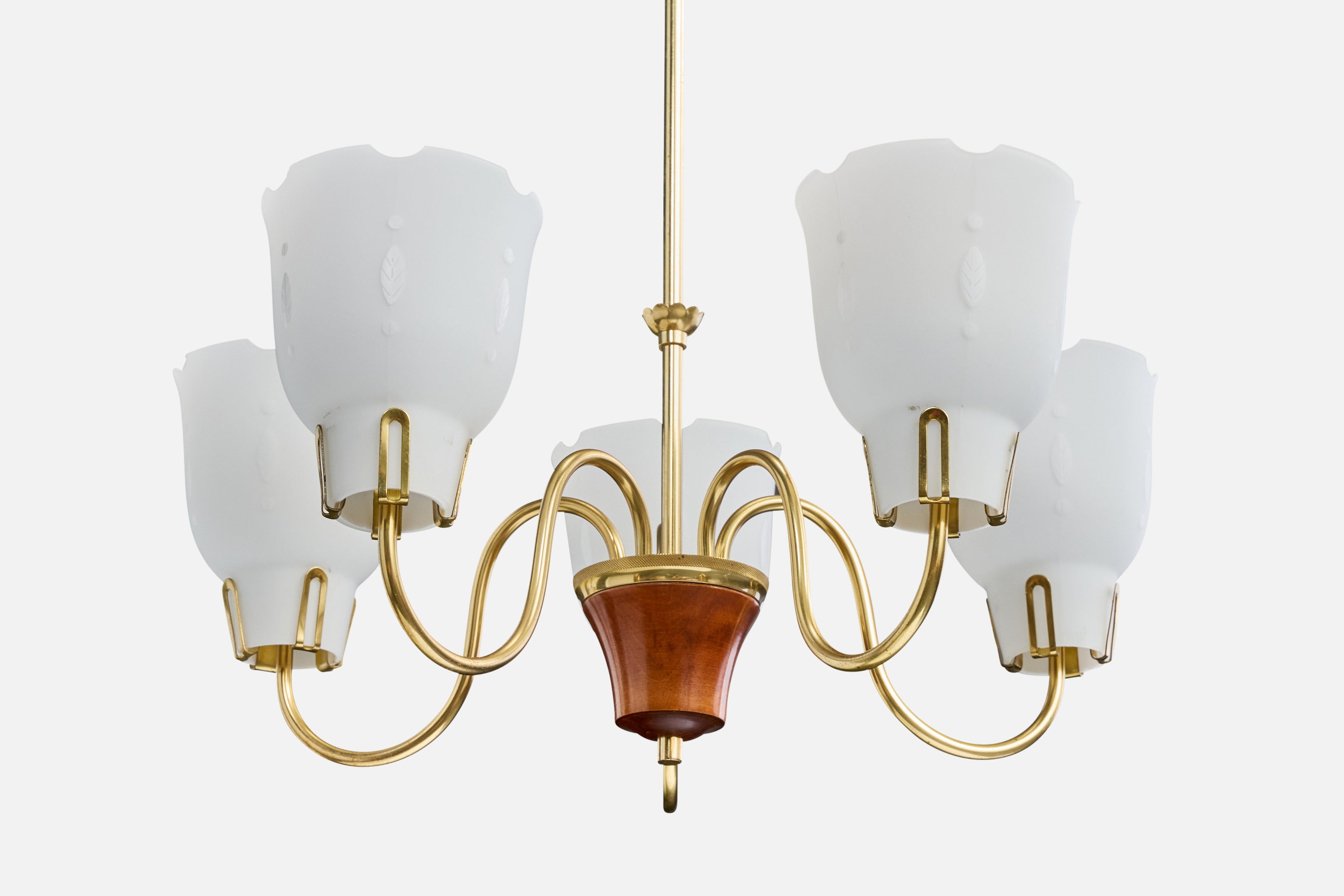 A brass, wood and white opaline glass chandelier designed and produced in Sweden, c. 1950s.