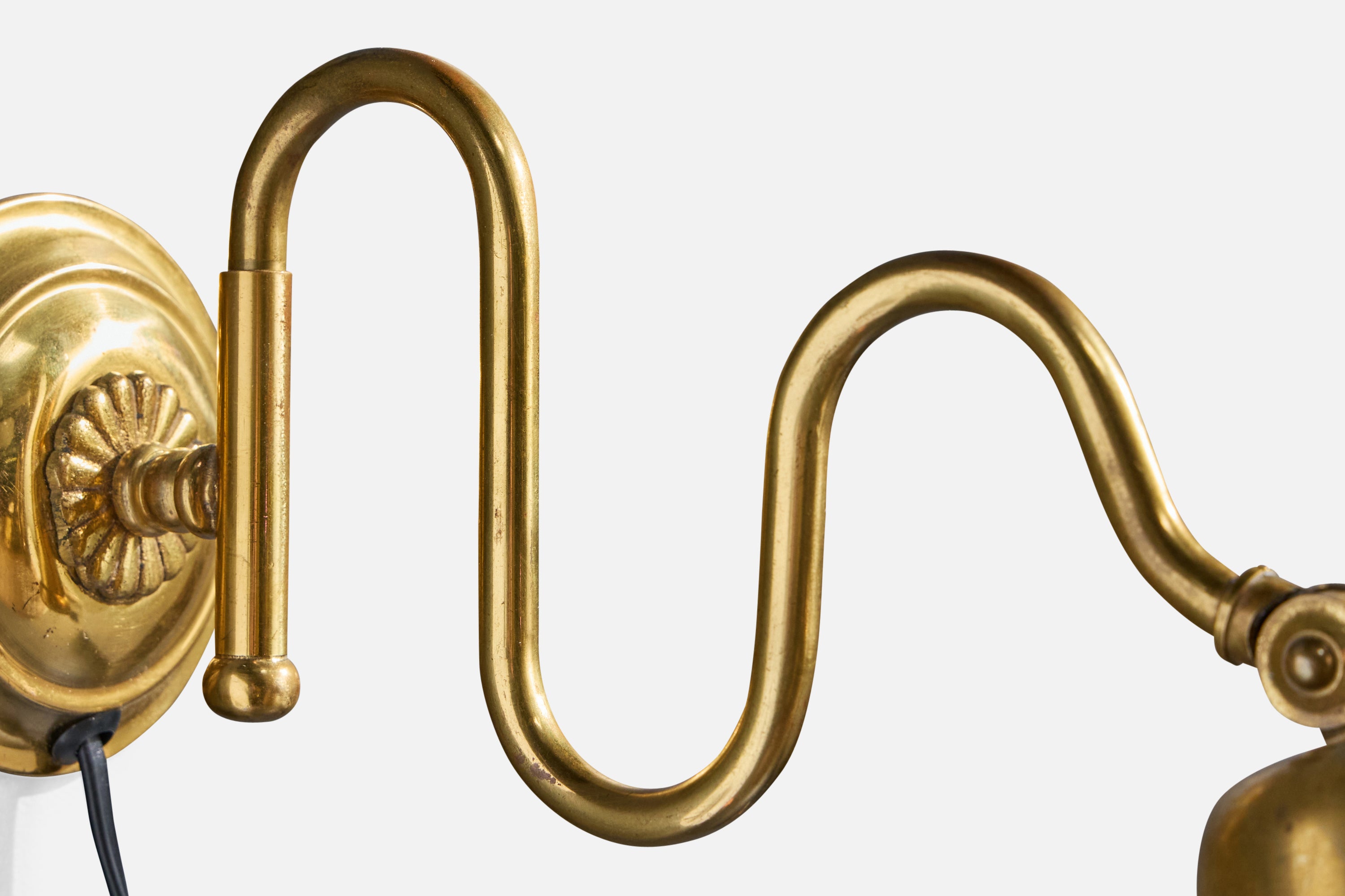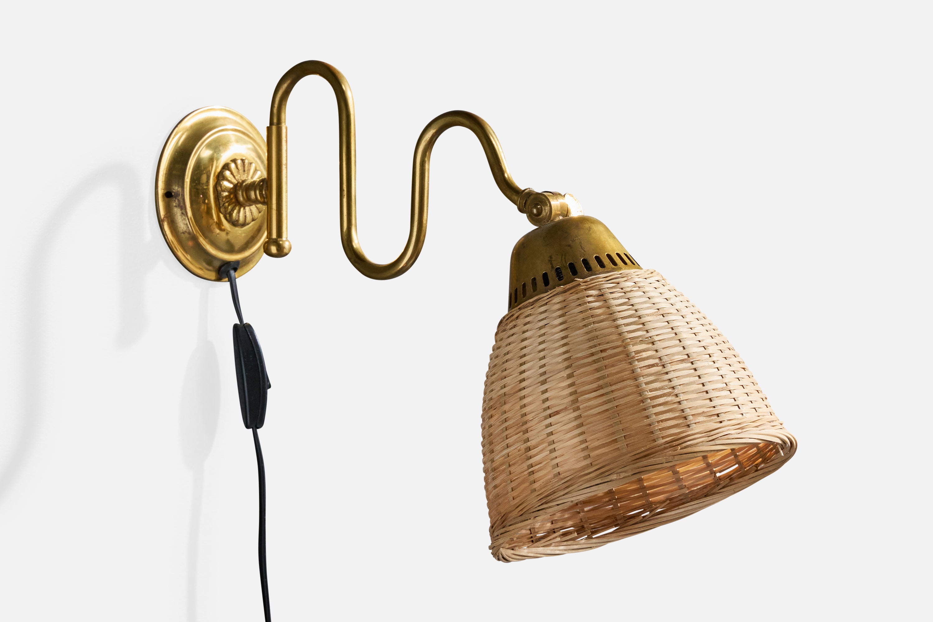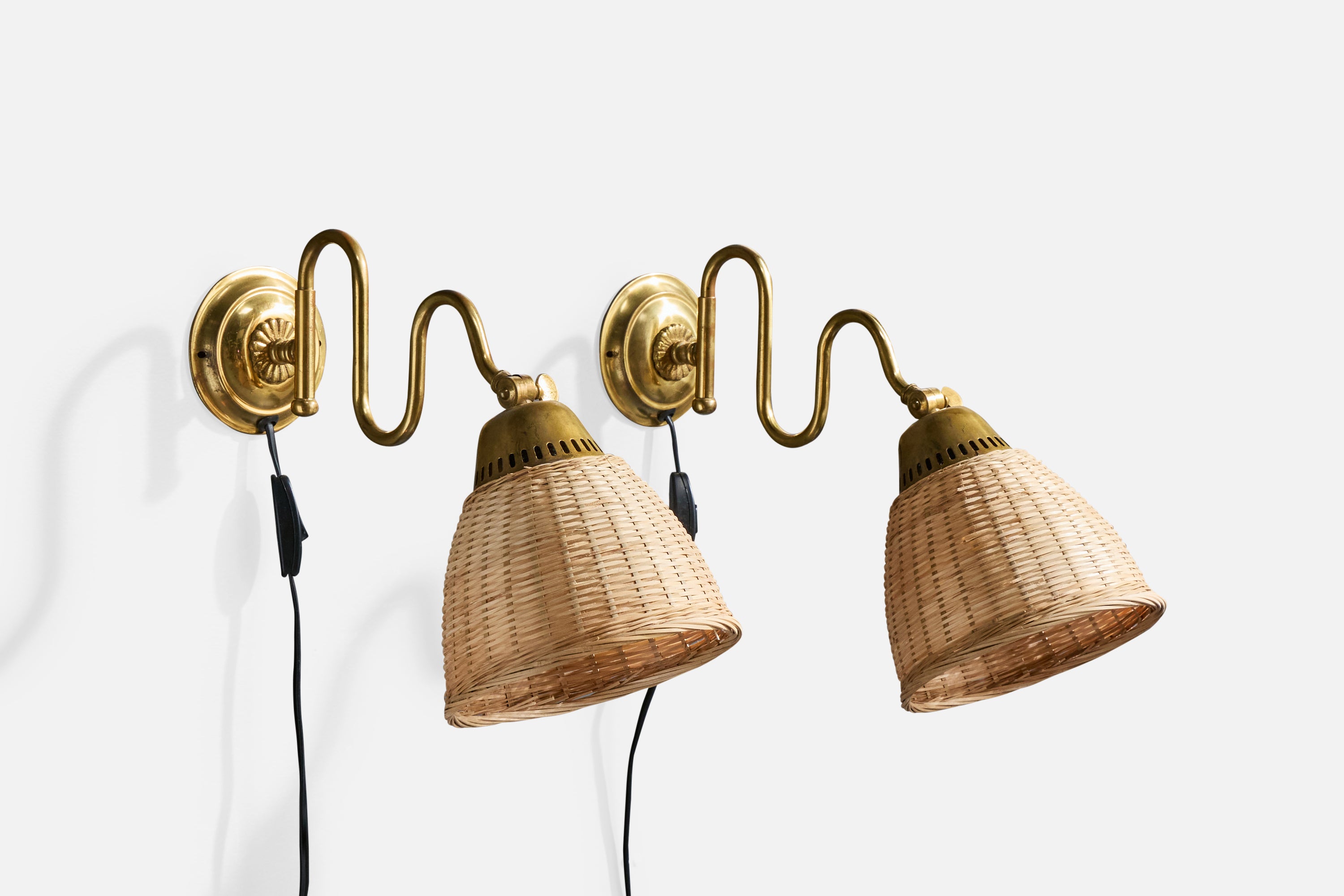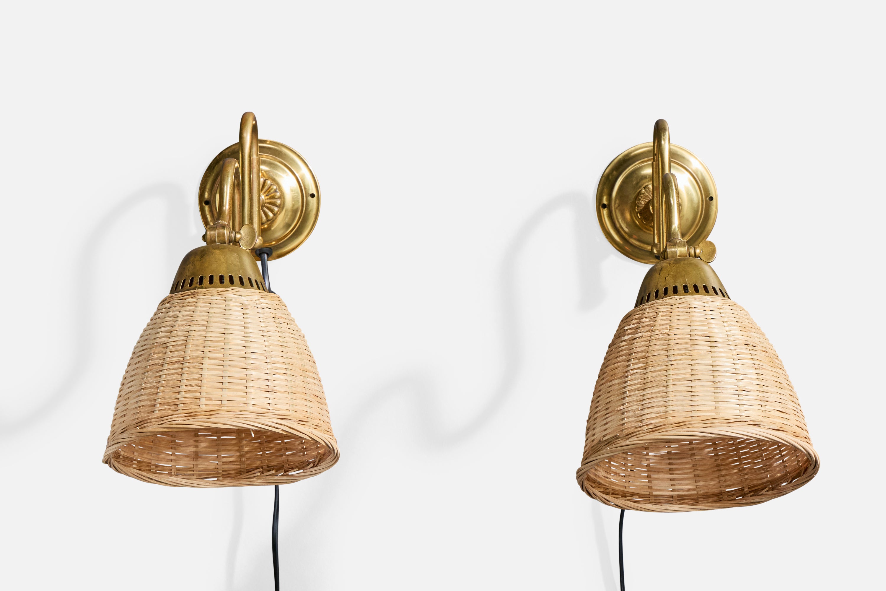 A pair of adjustable brass and rattan wall lights designed and produced in Sweden, c. 1940s.