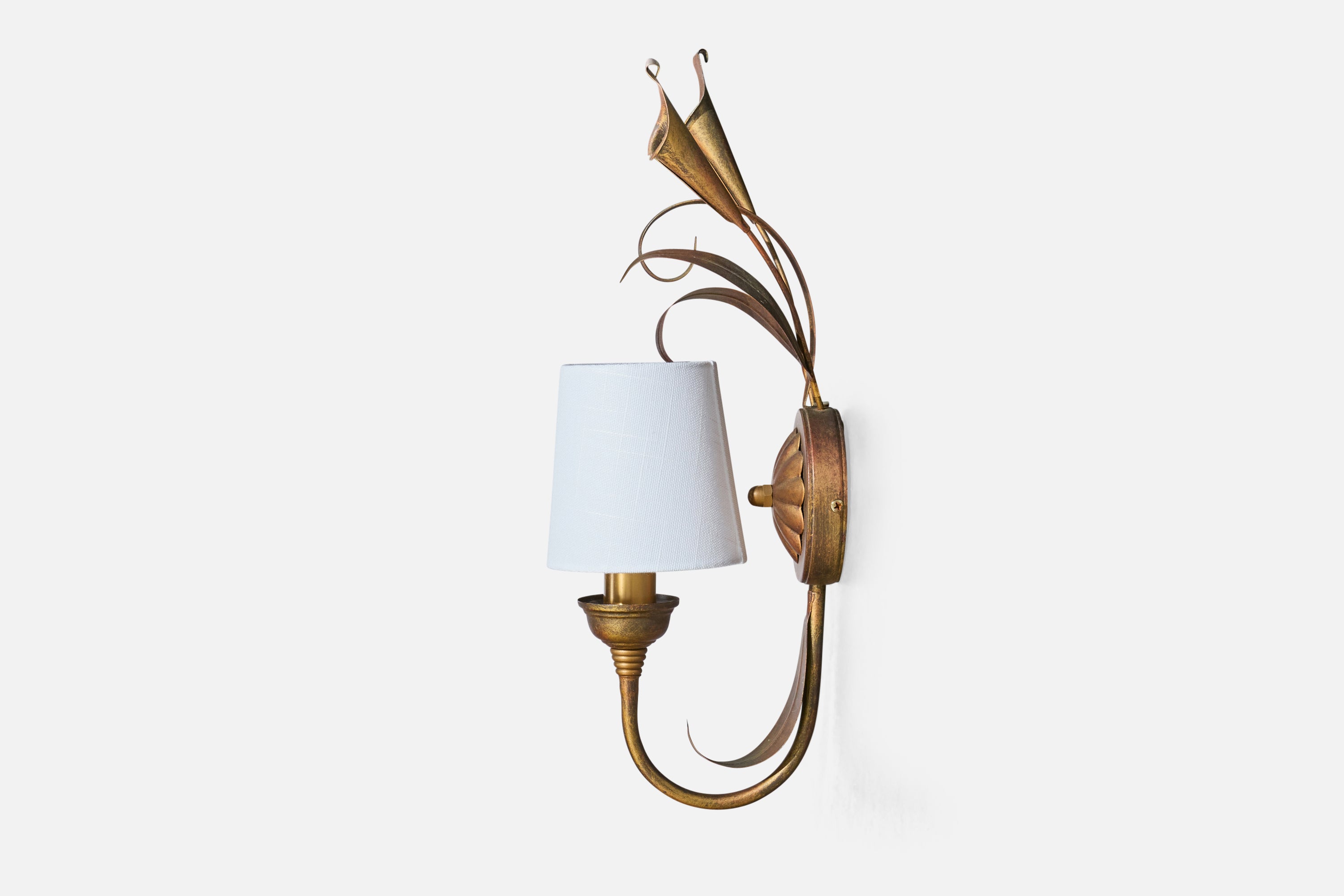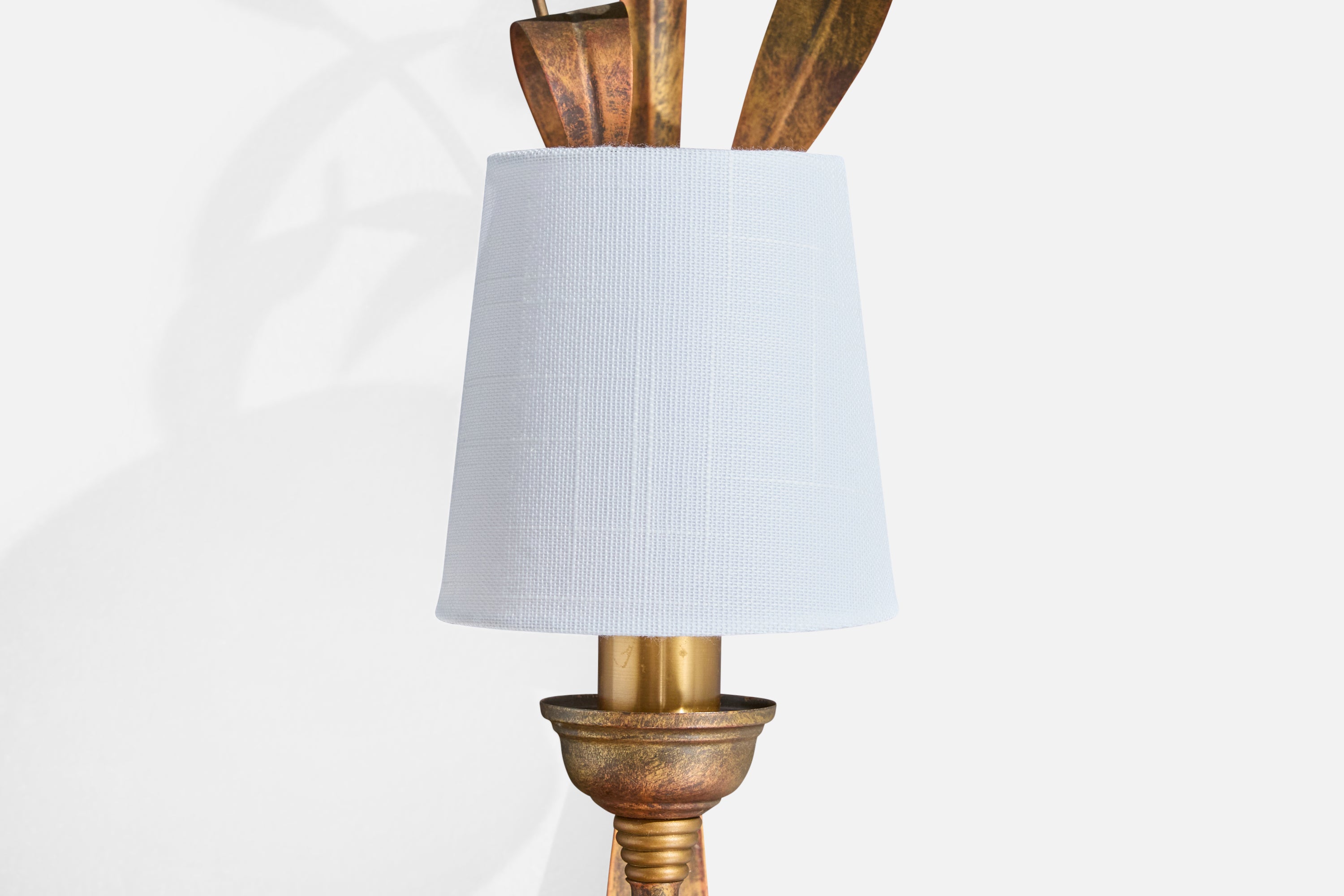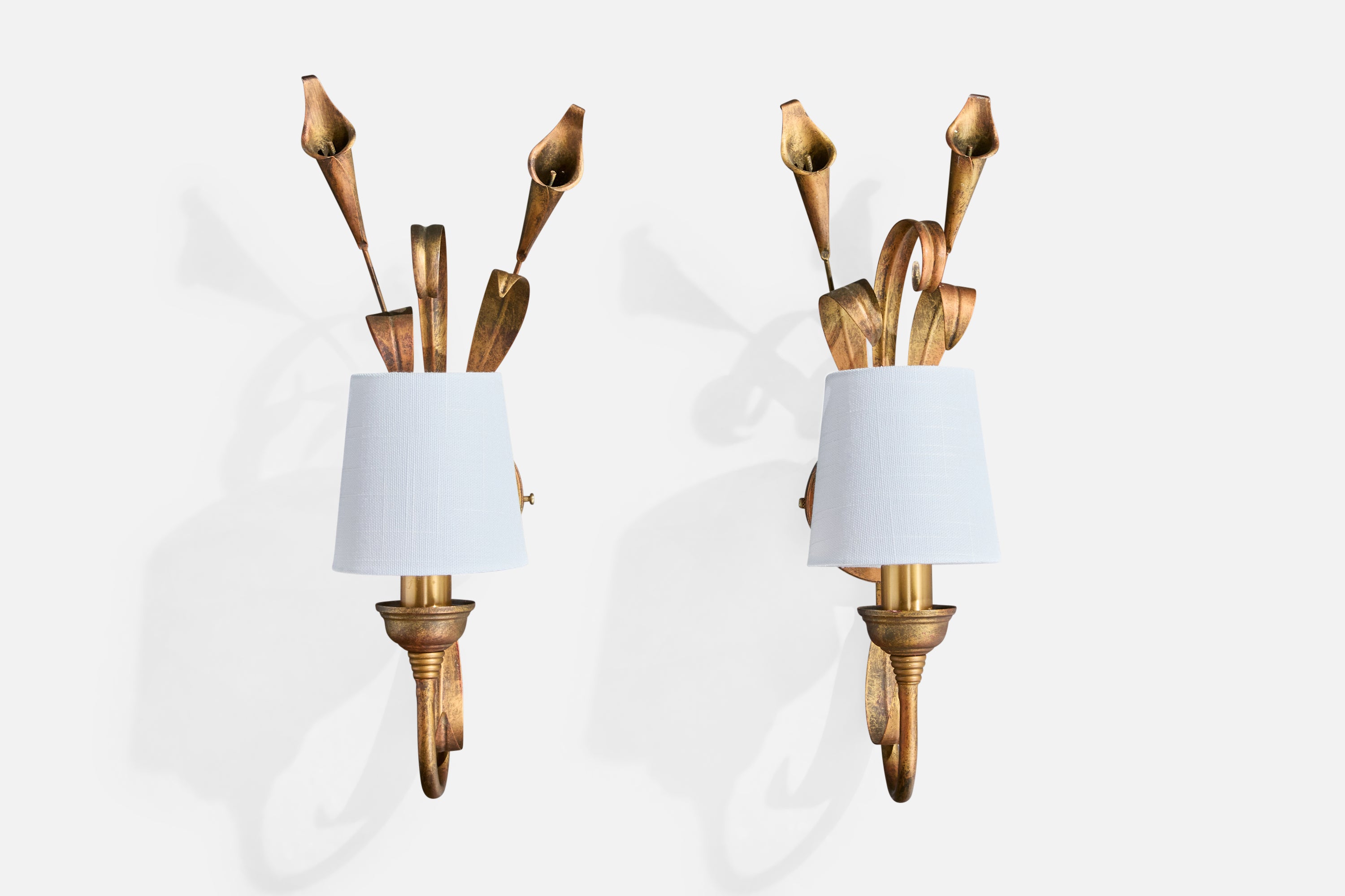 A pair of bronze-painted metal, brass and white fabric wall lights produced by Massive, France, c. 1980s.