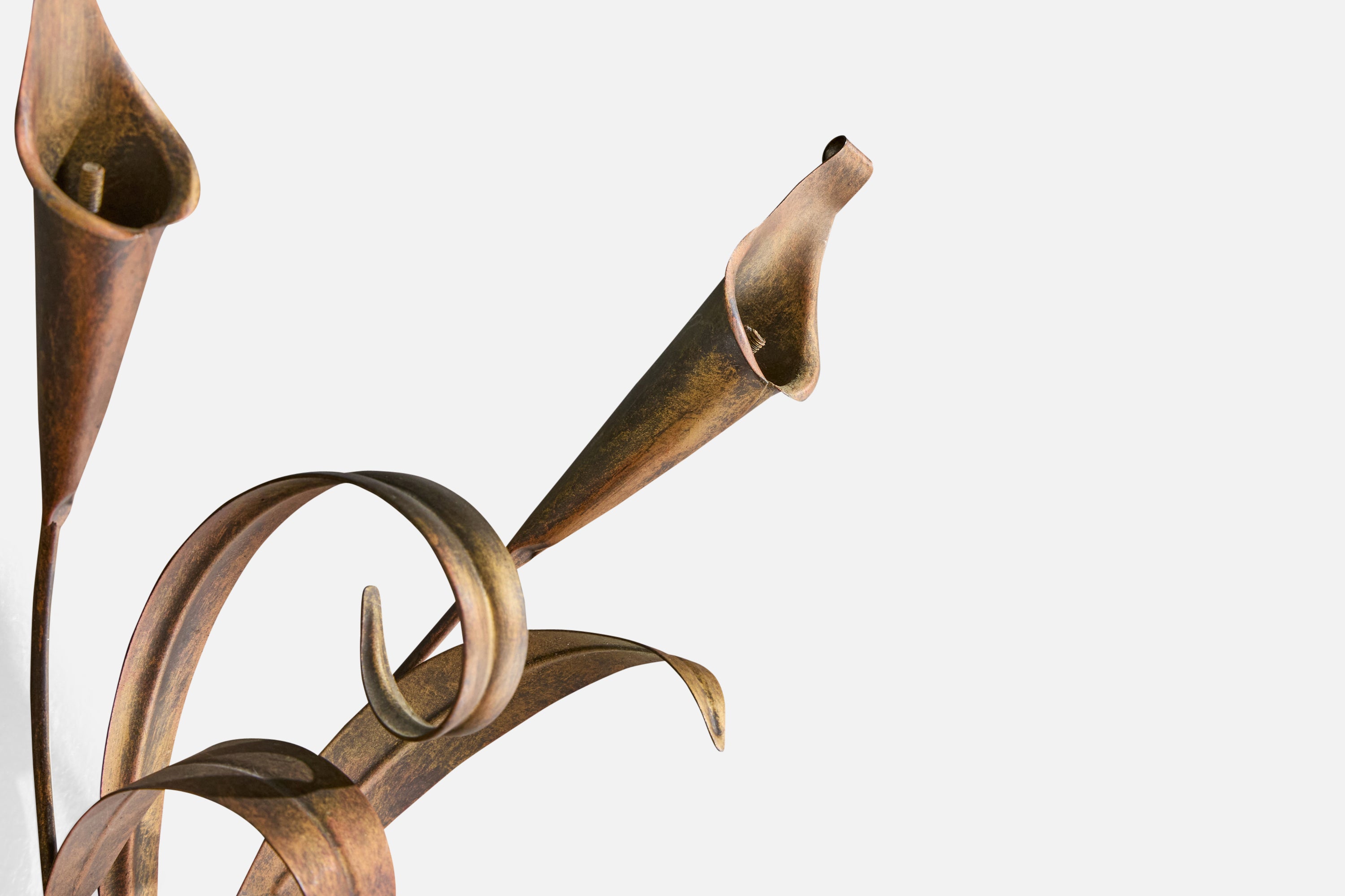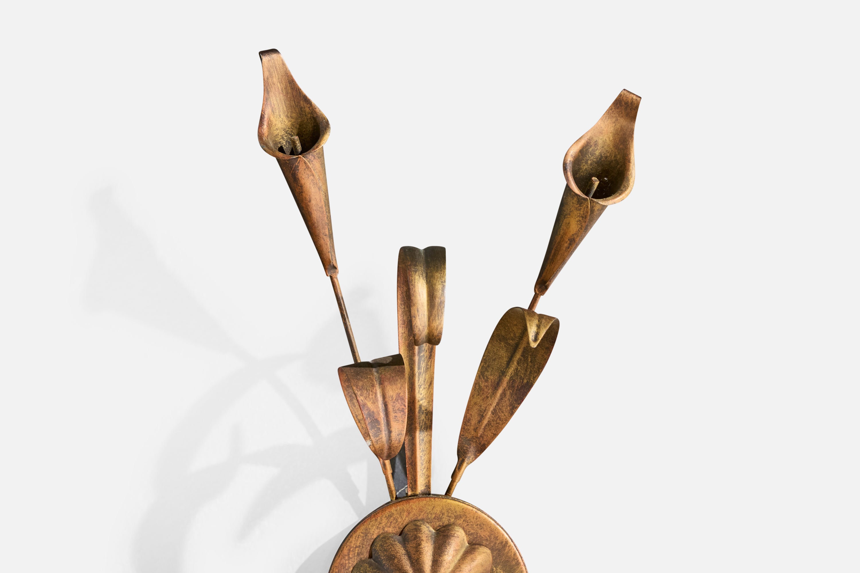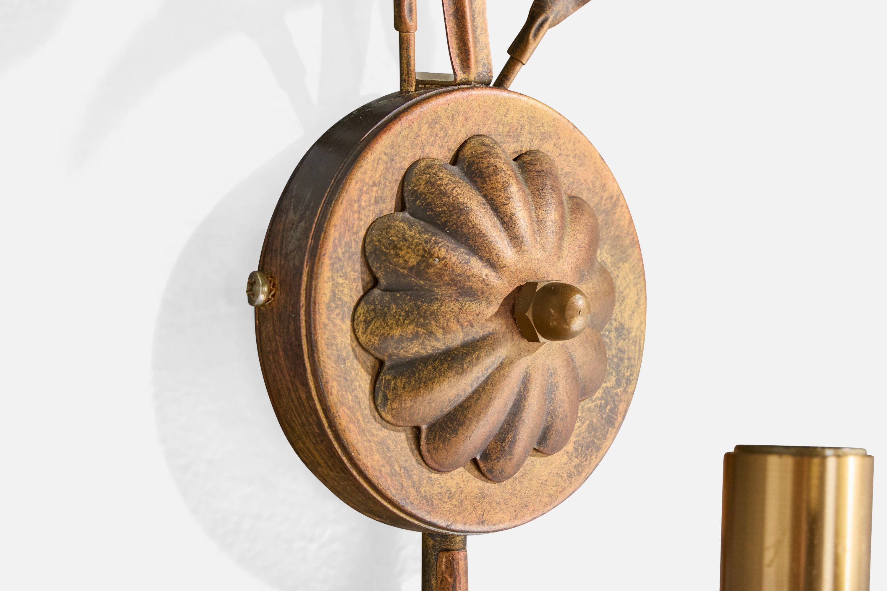 A pair of bronze-painted metal, brass and white fabric wall lights produced by Massive, France, c. 1980s.