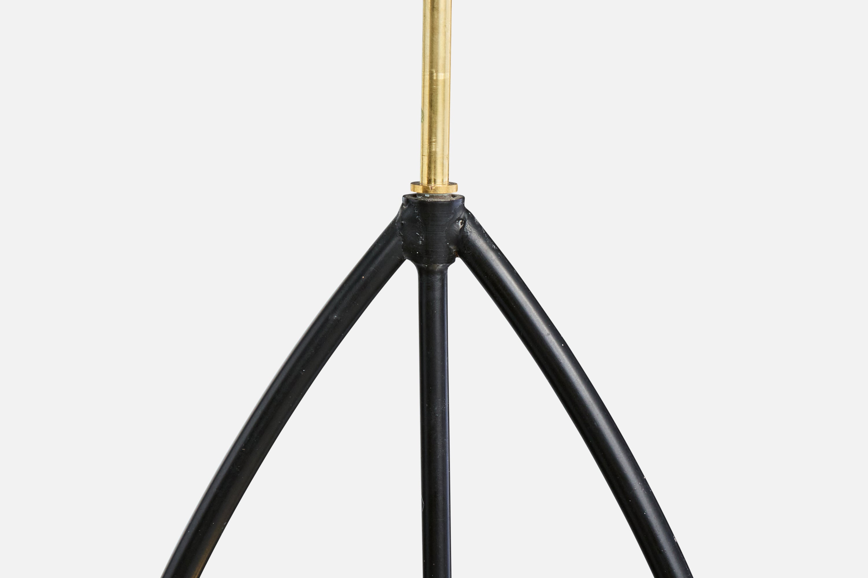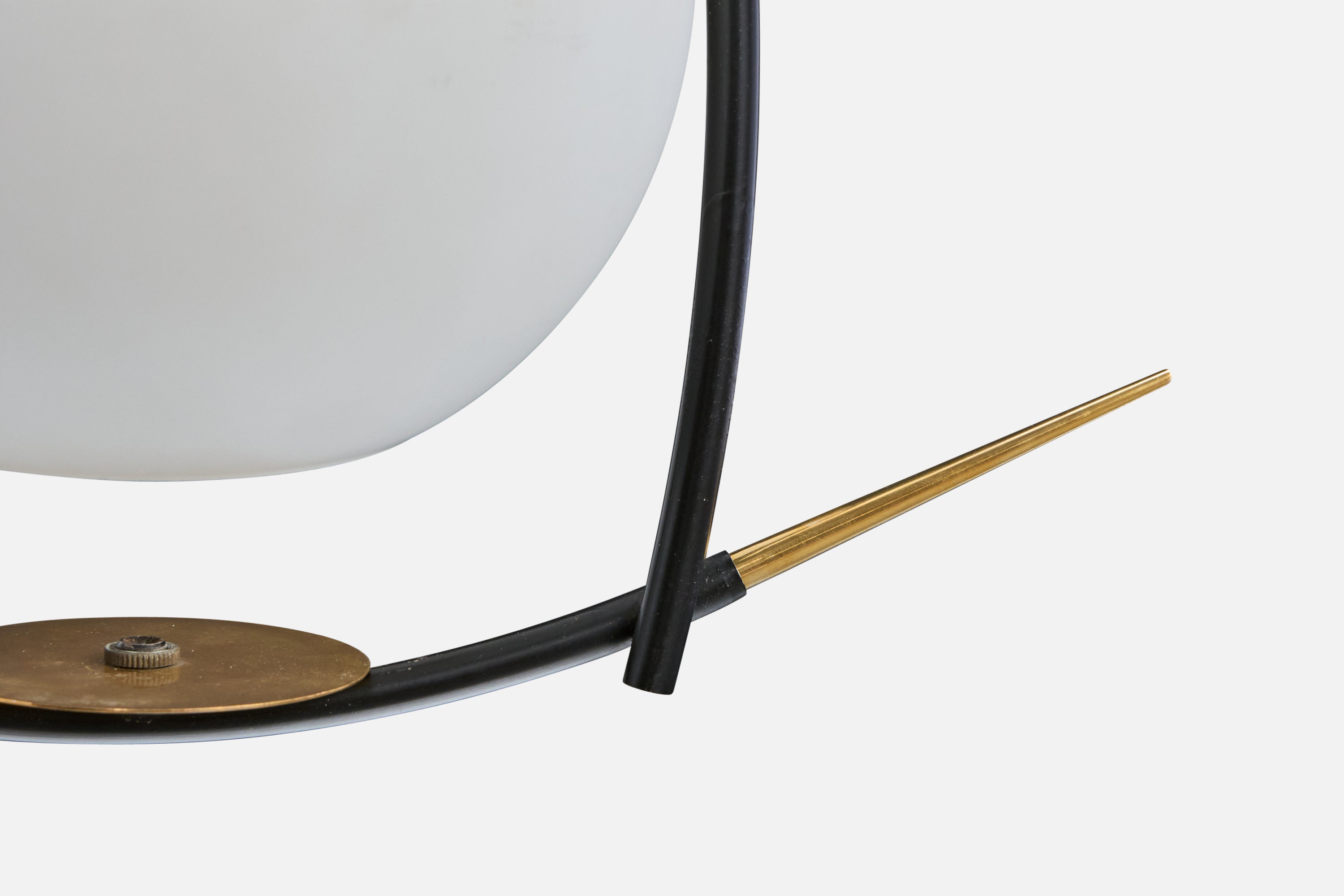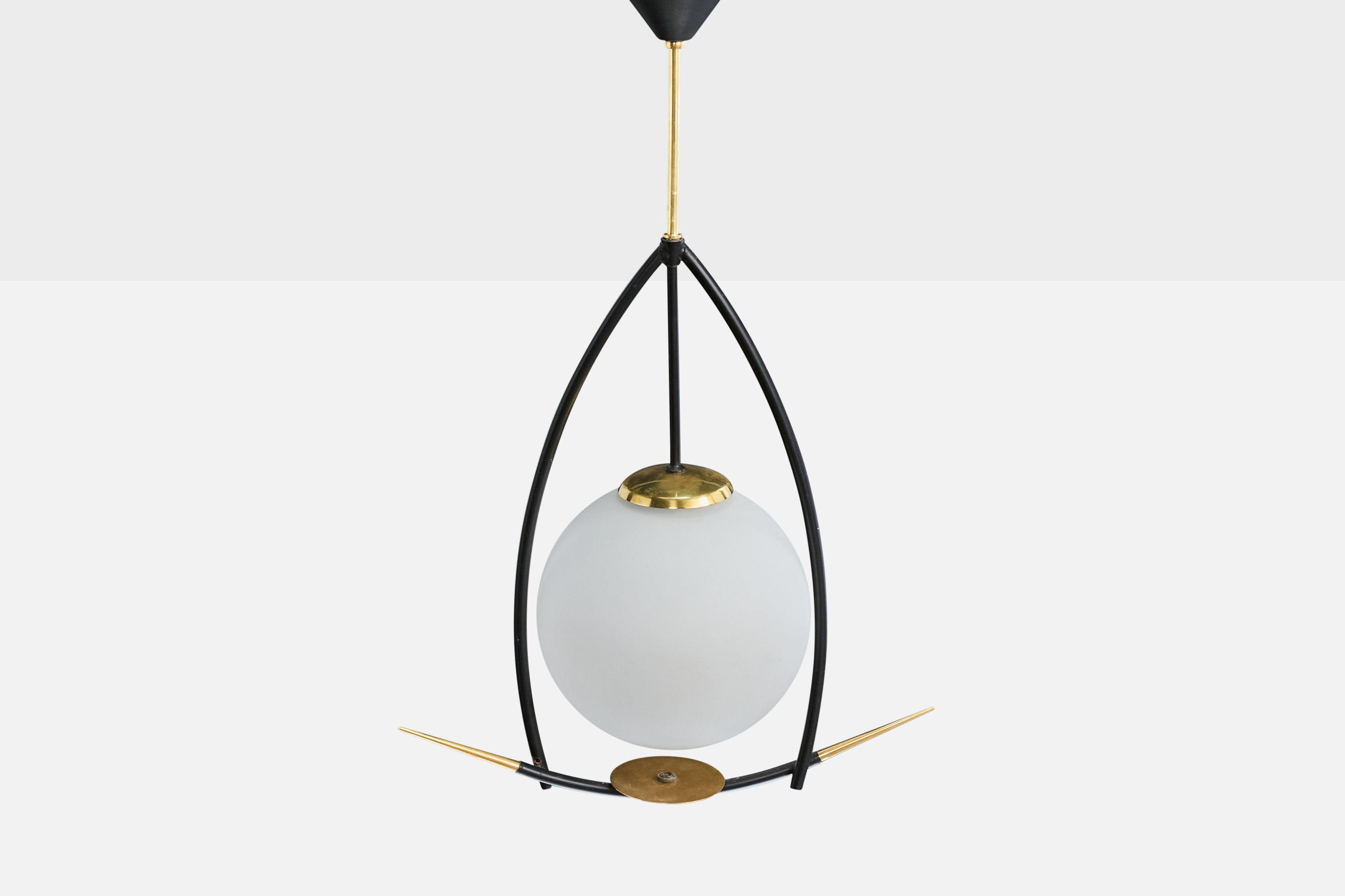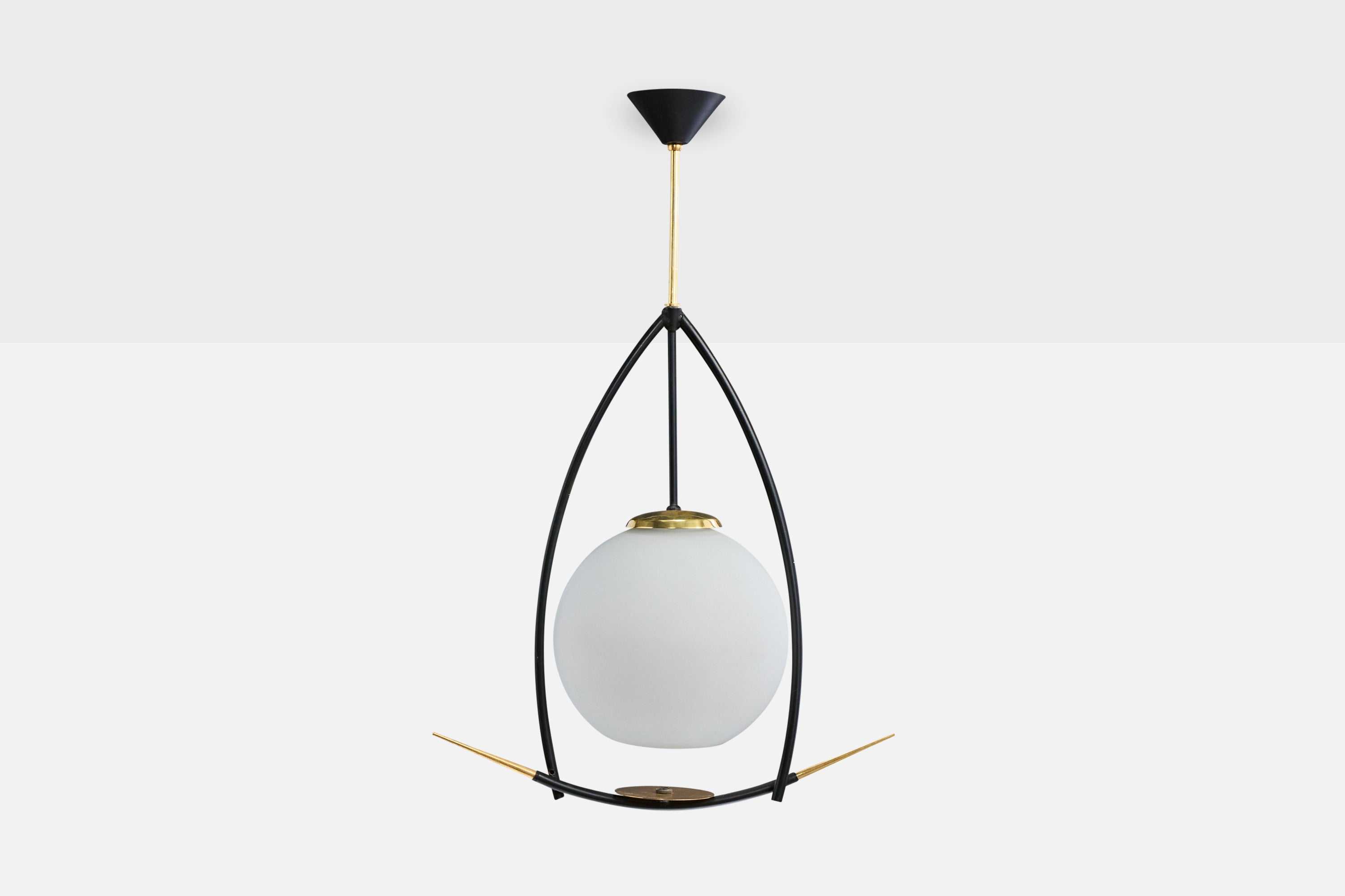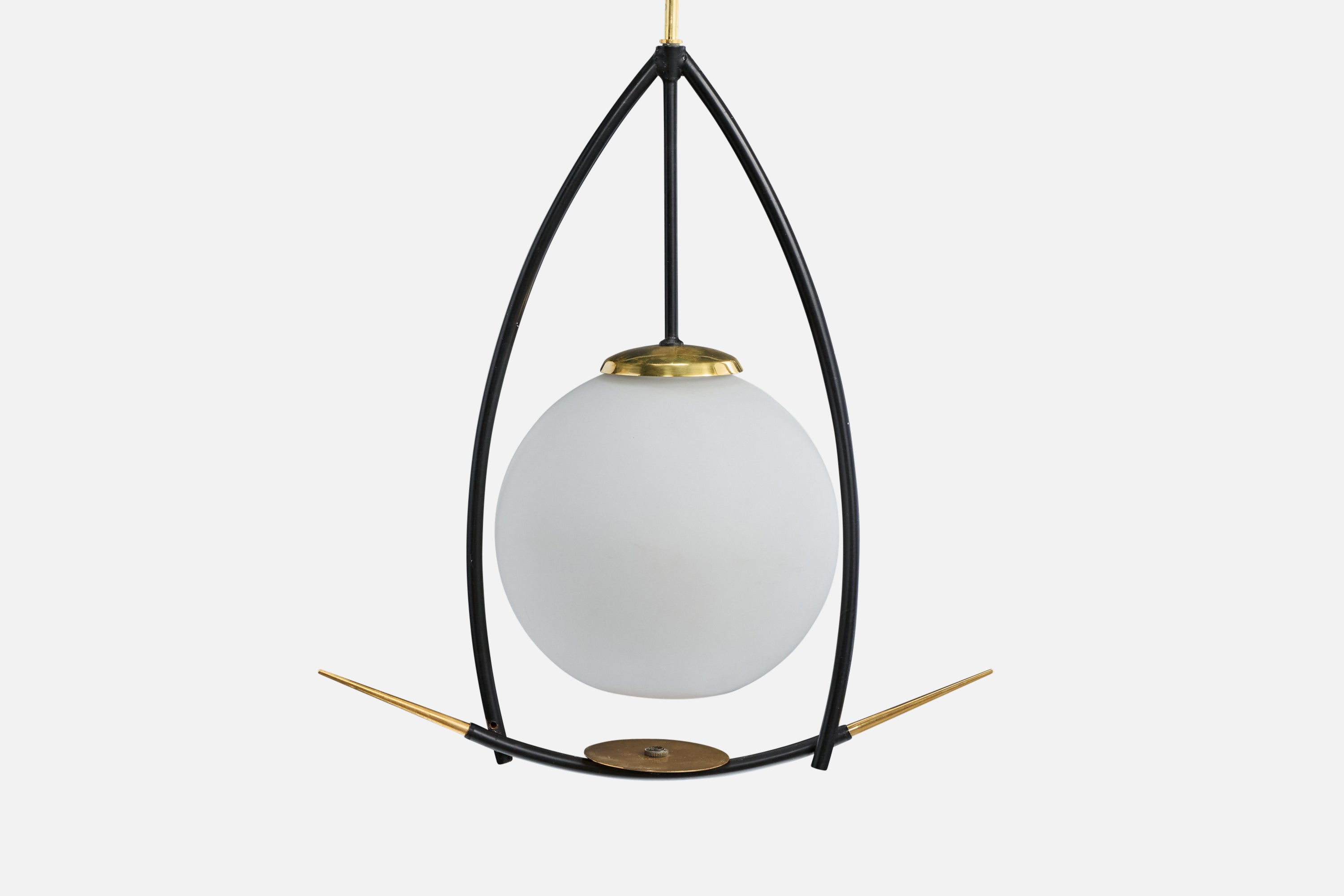 A brass, black-lacquered metal and white opaline glass pendant light designed and produced in France, c. 1950s.