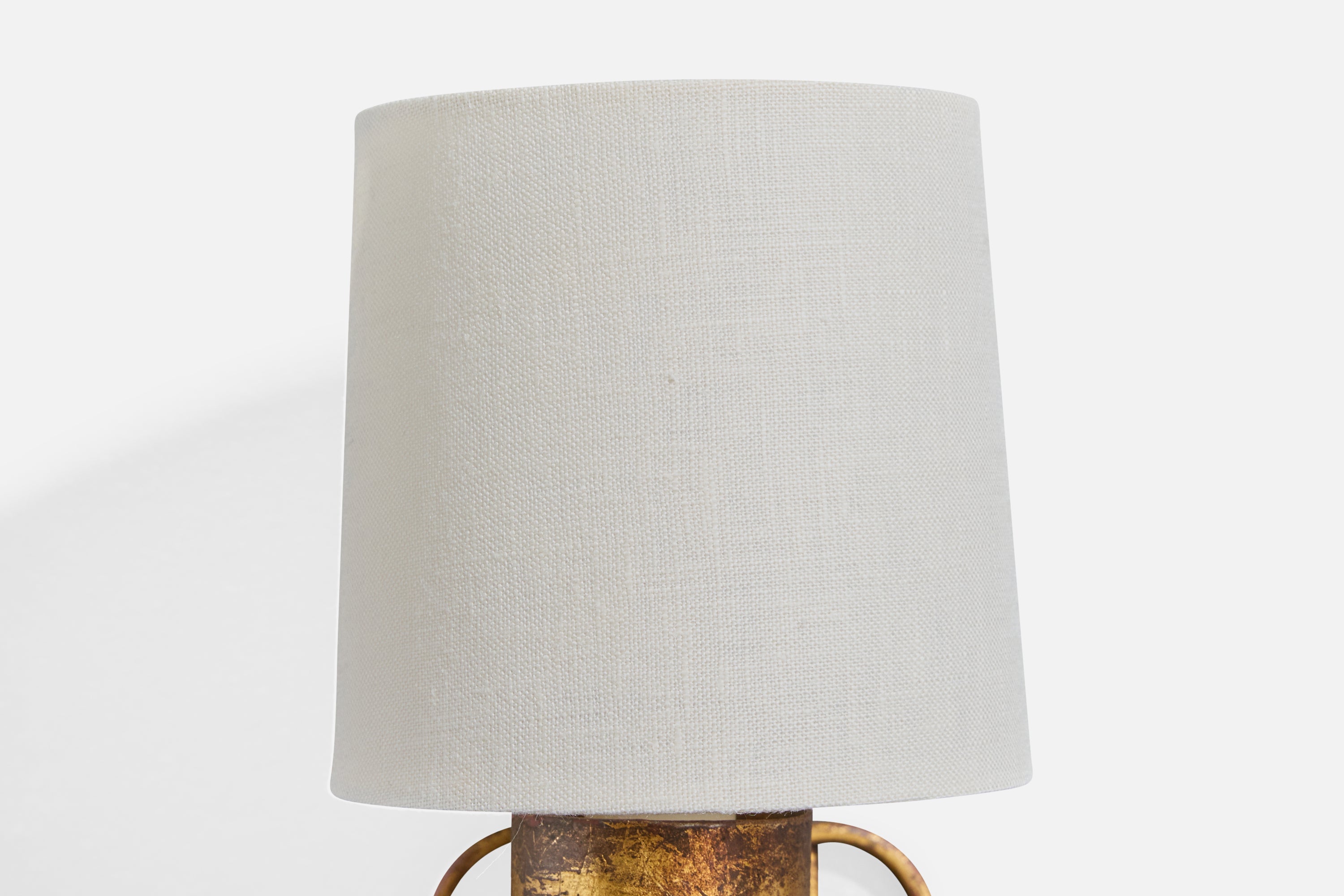 A pair of brass and white fabric wall lights likely designed and produced in France, c. 1940s.
