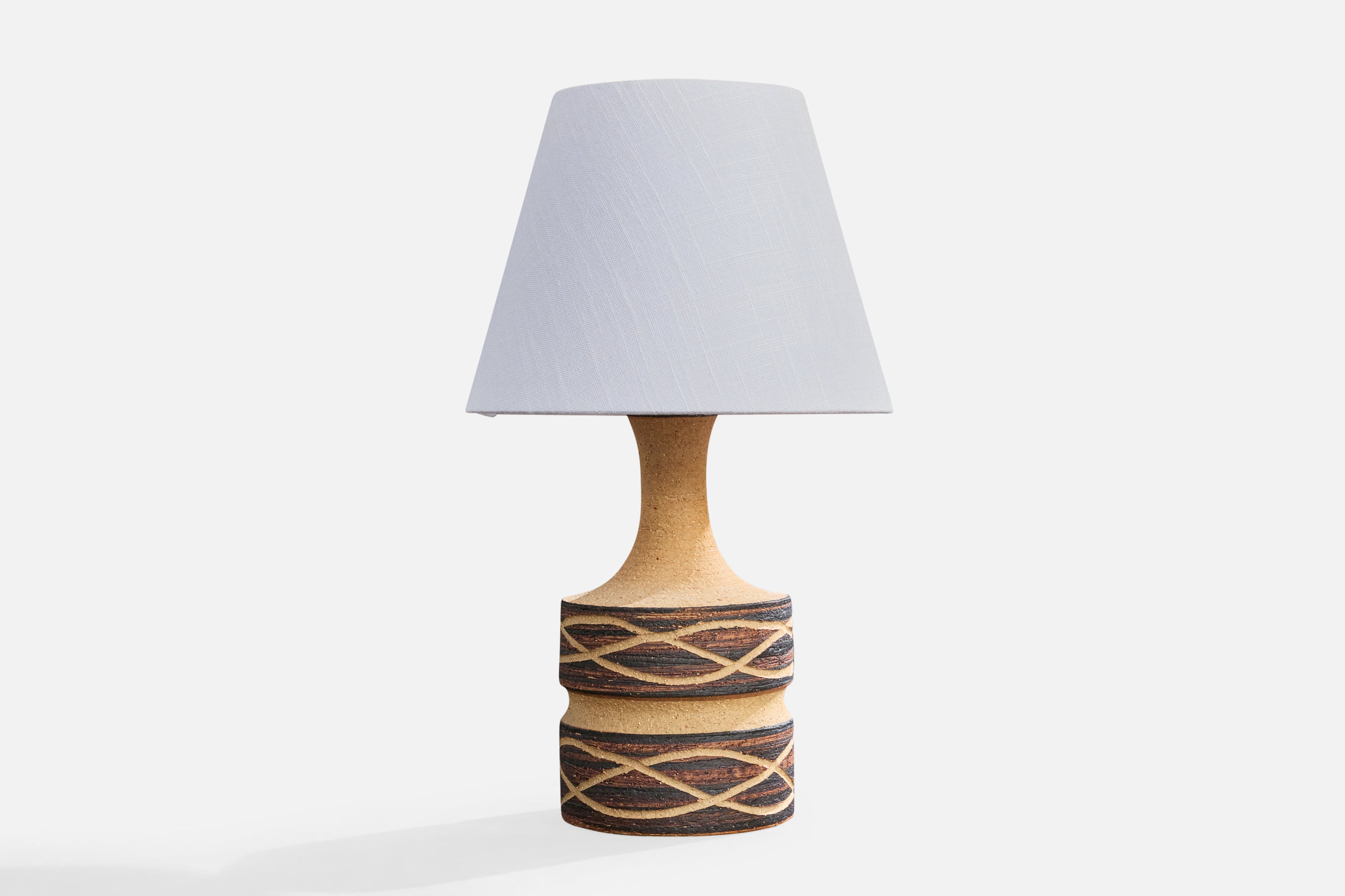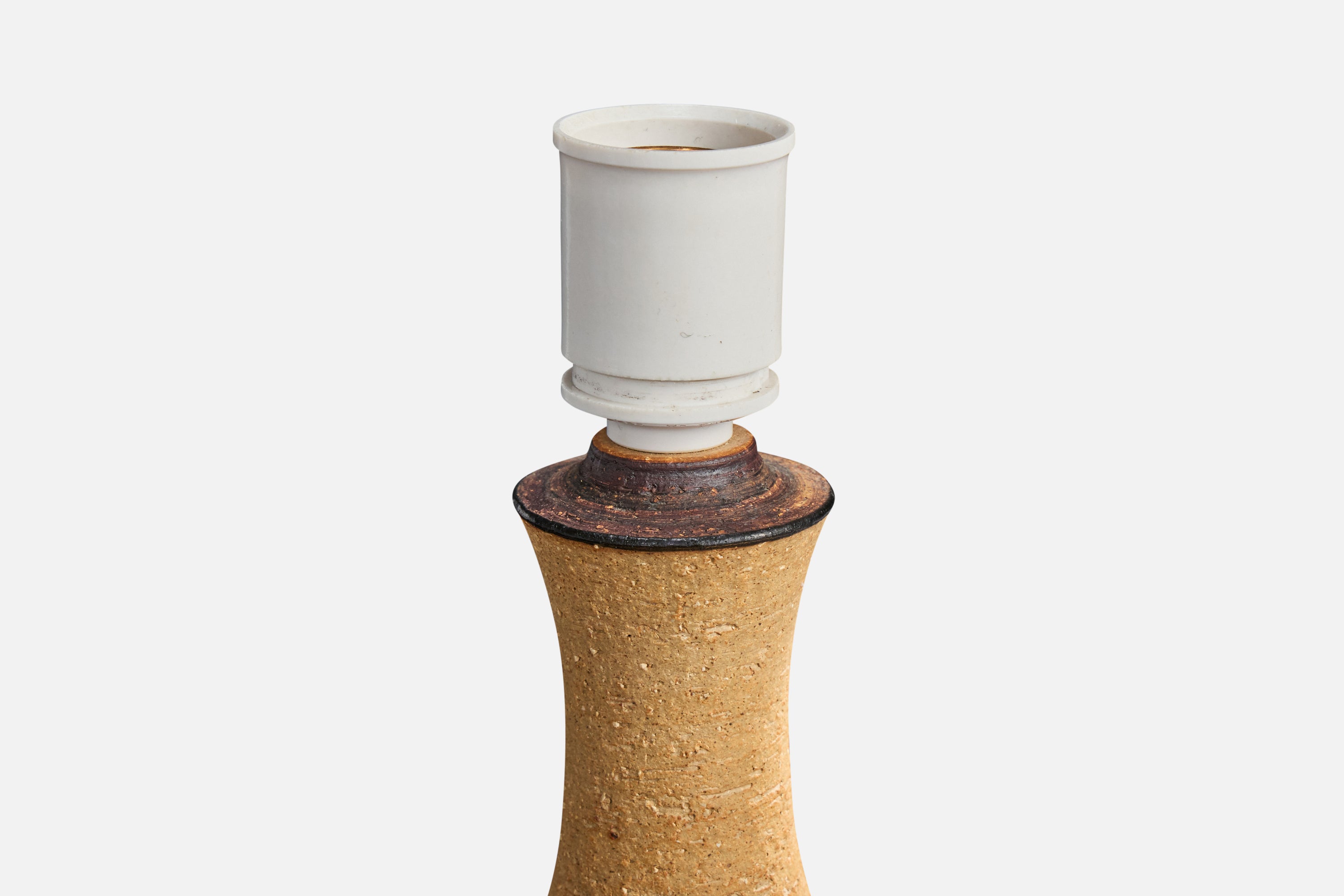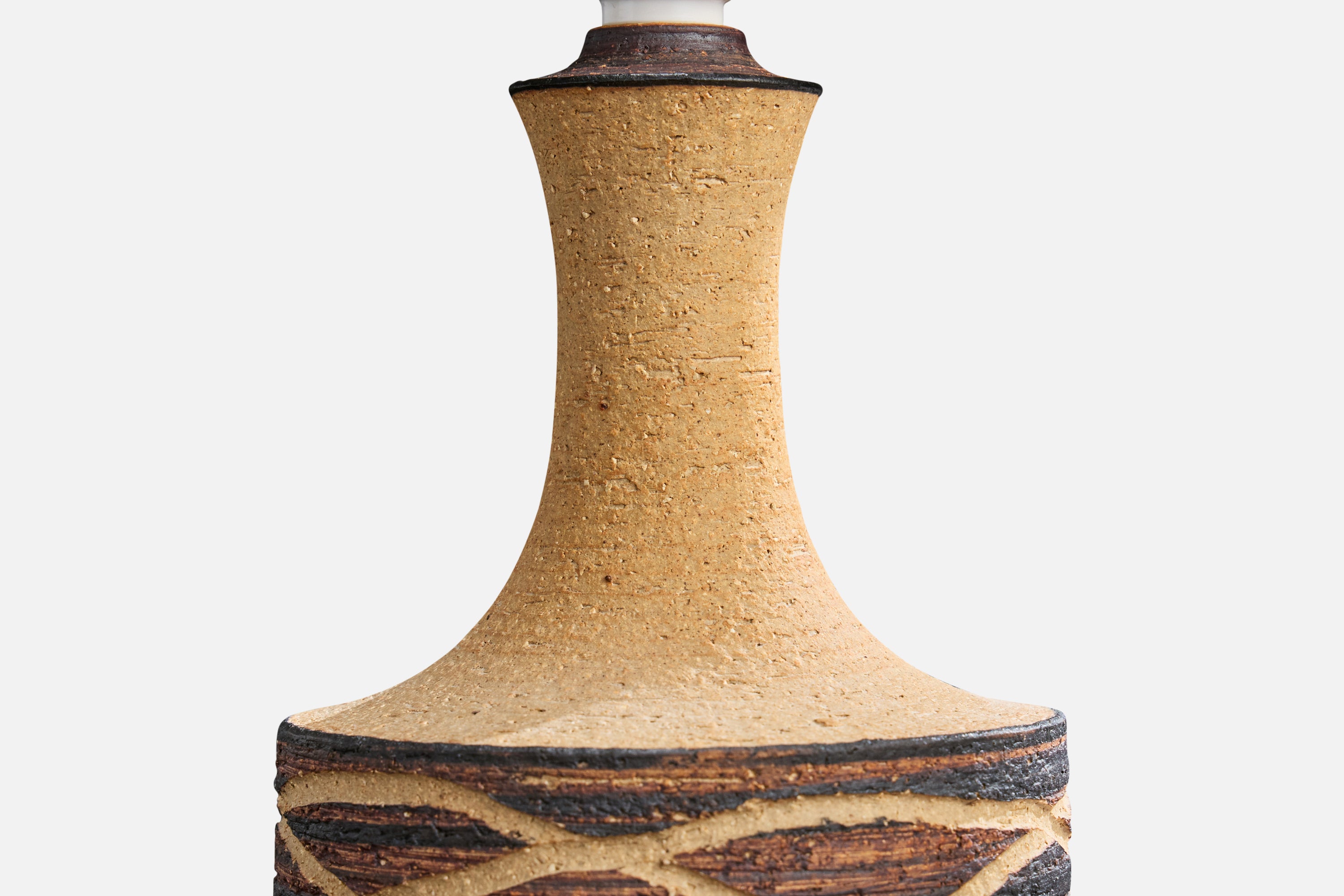 A brown and beige ceramic table lamp designed and produced by Jette Hellerøe, Denmark, c. 1960s.