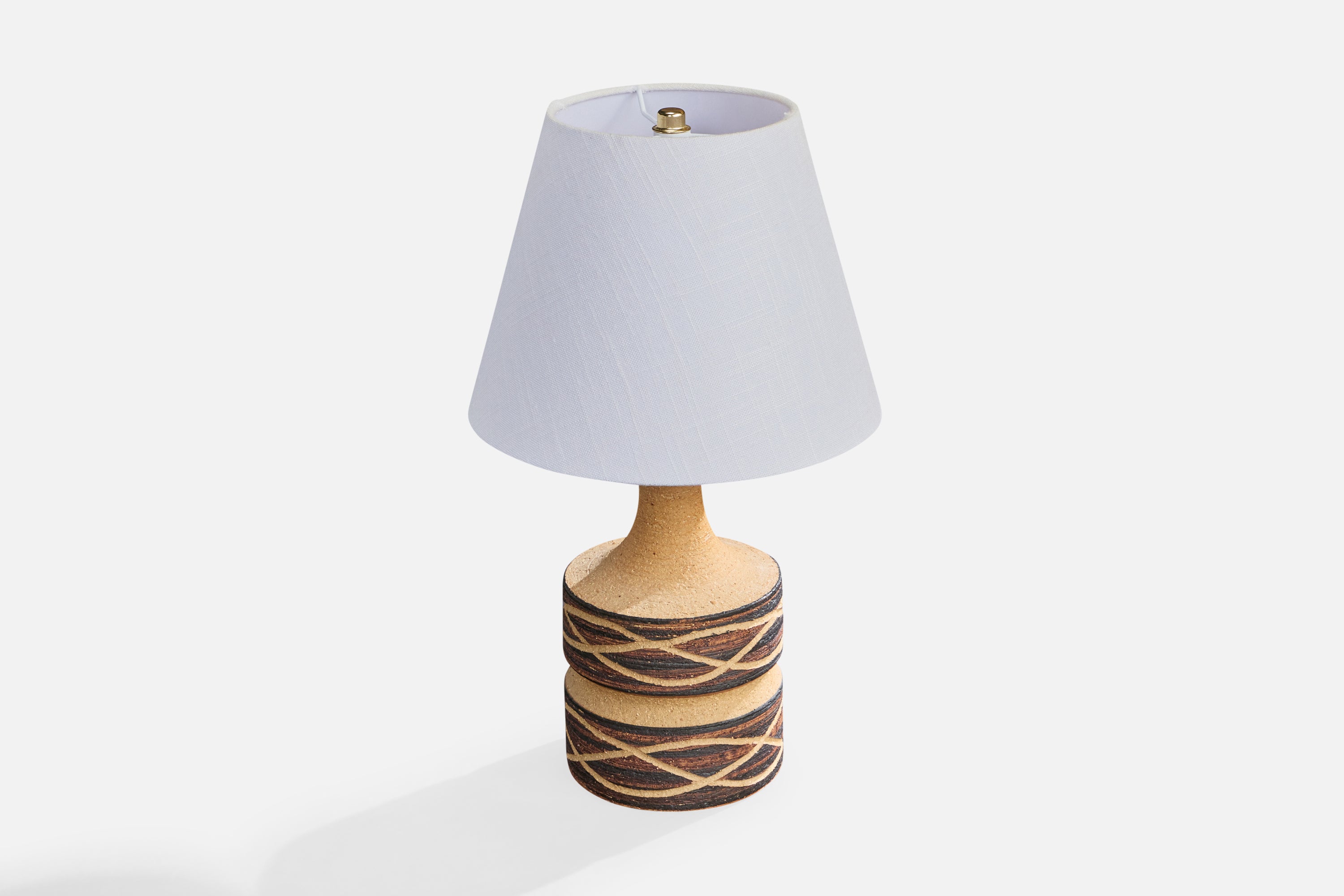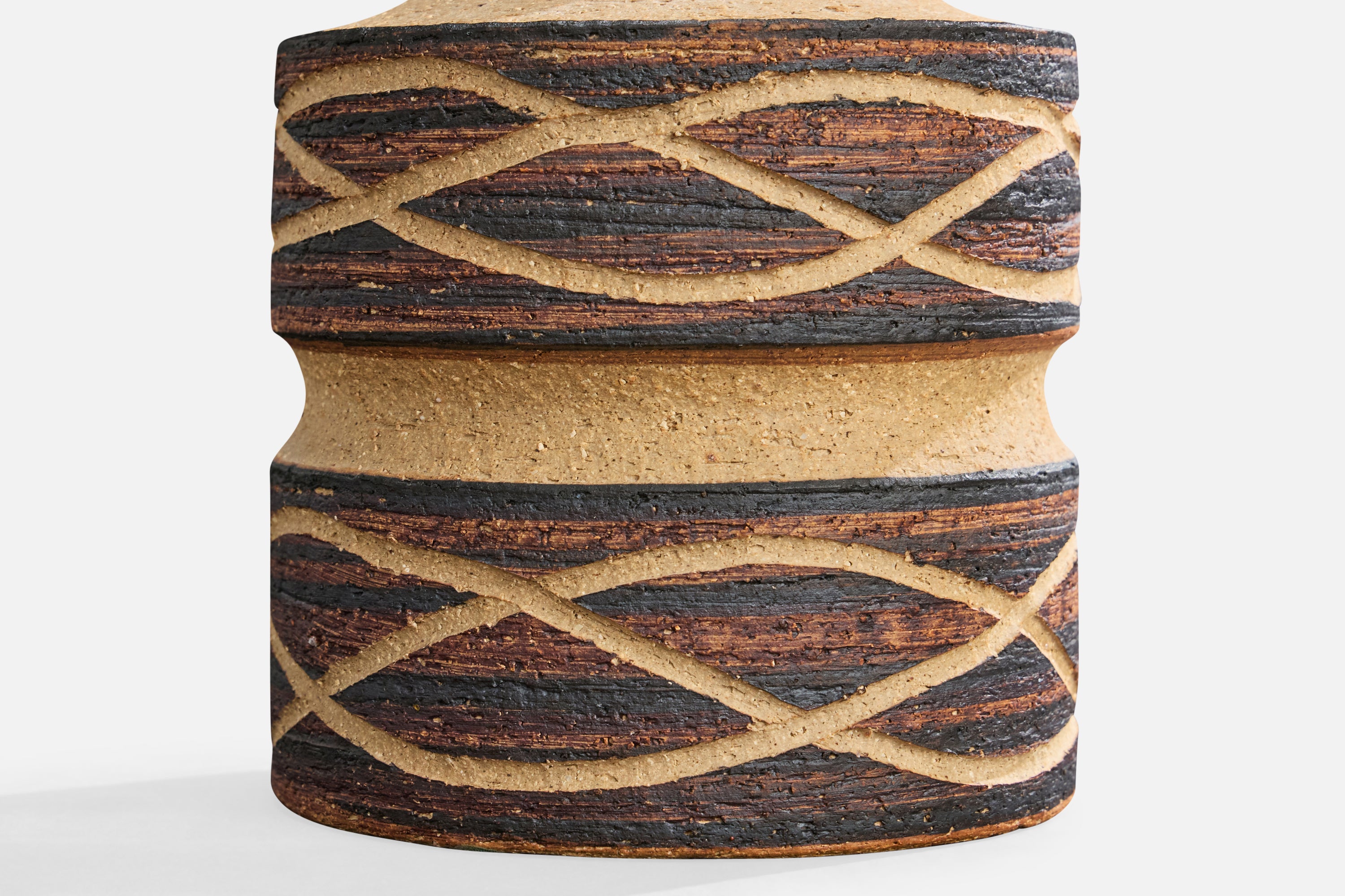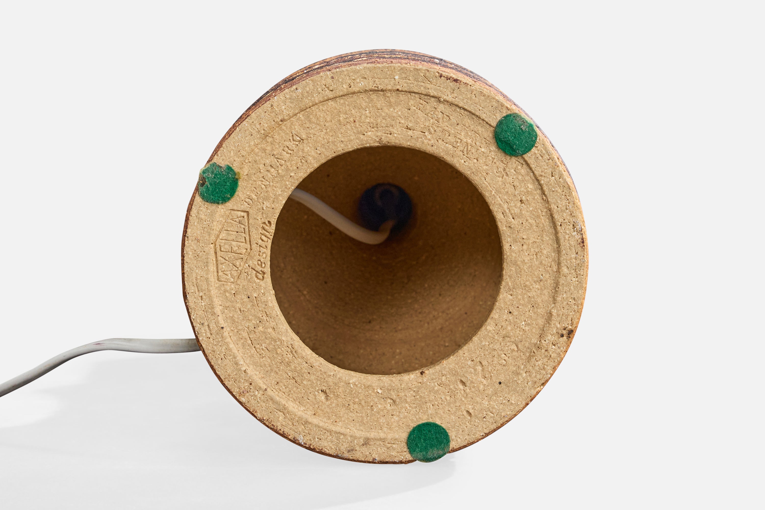 A brown and beige ceramic table lamp designed and produced by Jette Hellerøe, Denmark, c. 1960s.