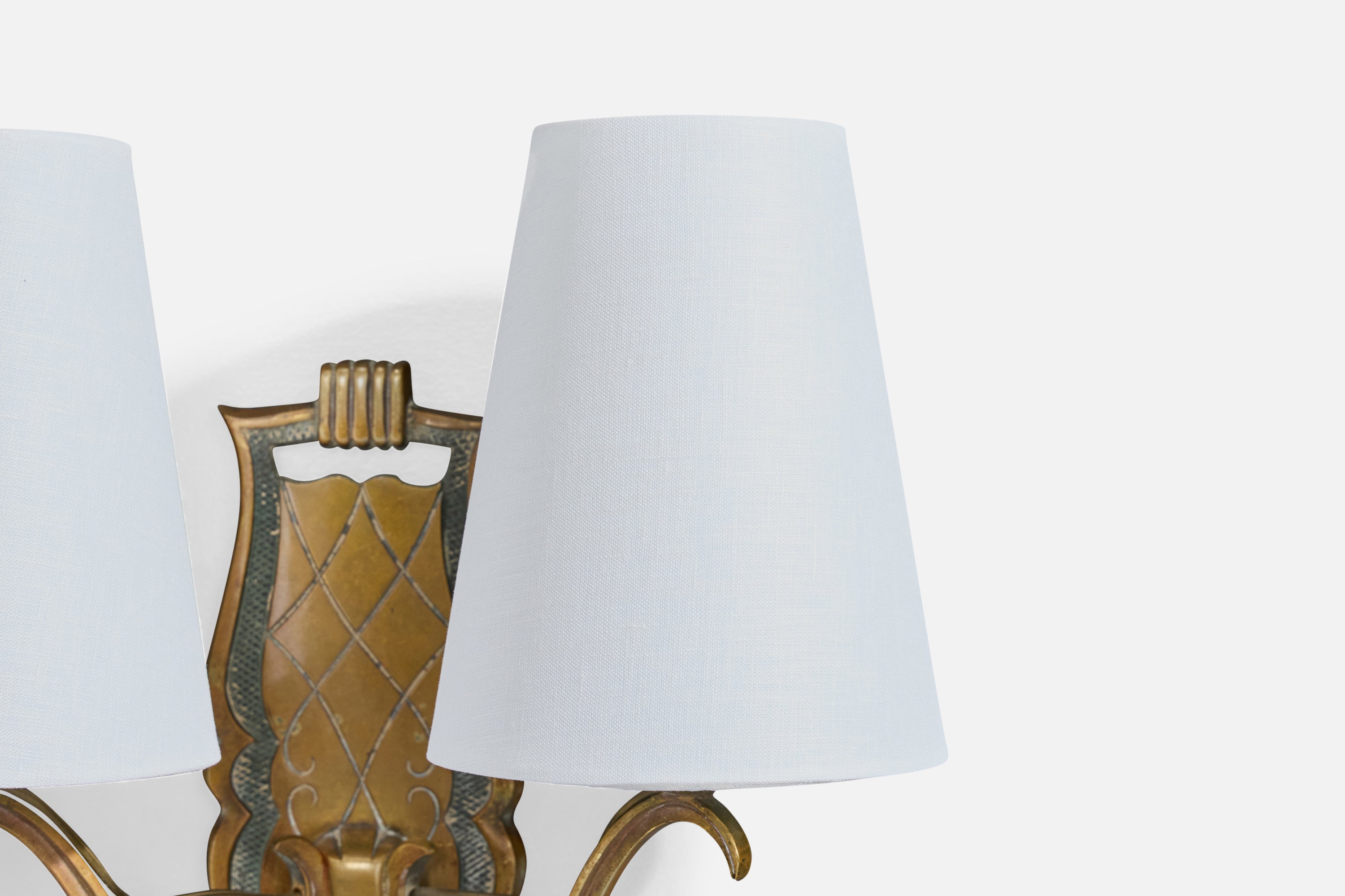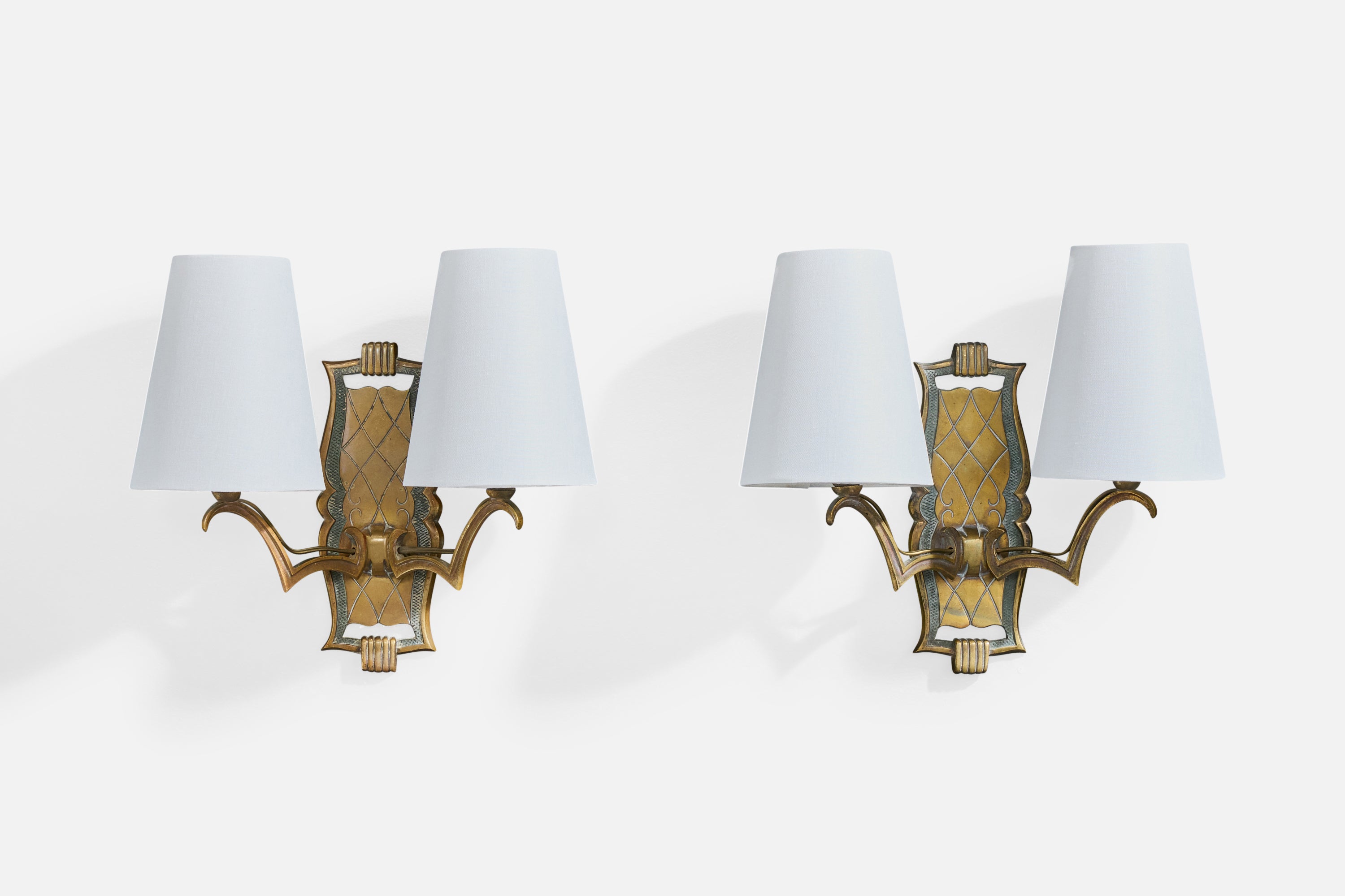 A pair of brass and white fabric wall lights designed and produced in France, c. 1930s.