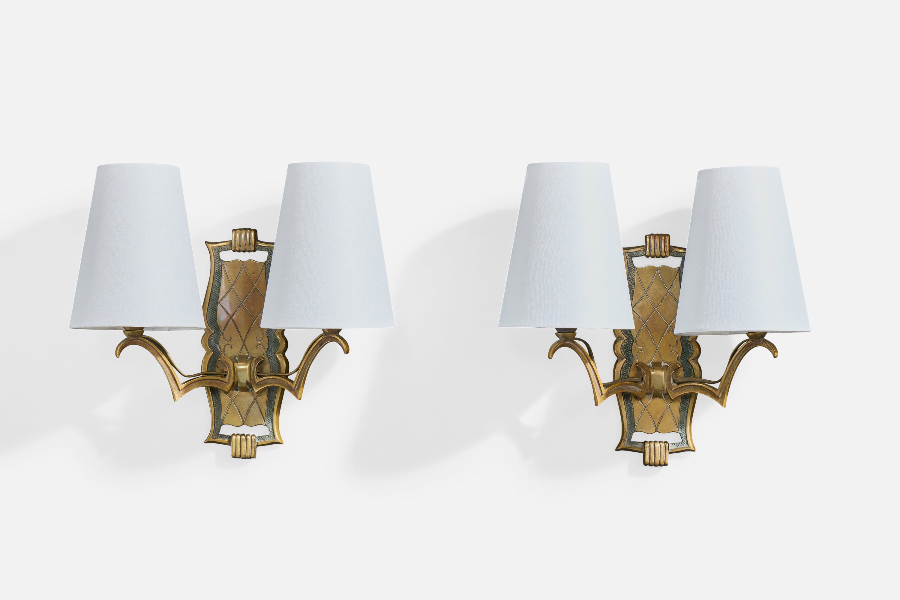 A pair of brass and white fabric wall lights designed and produced in France, c. 1930s.