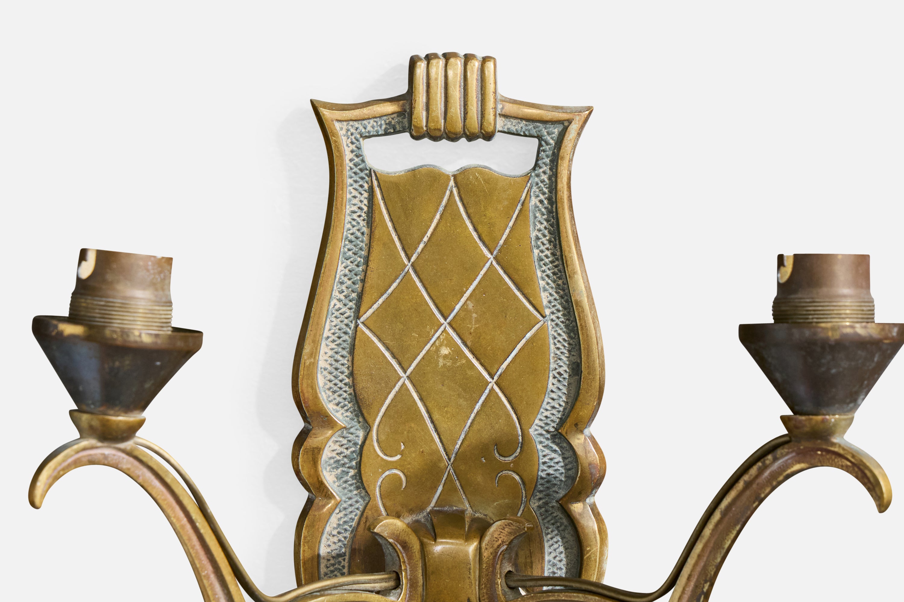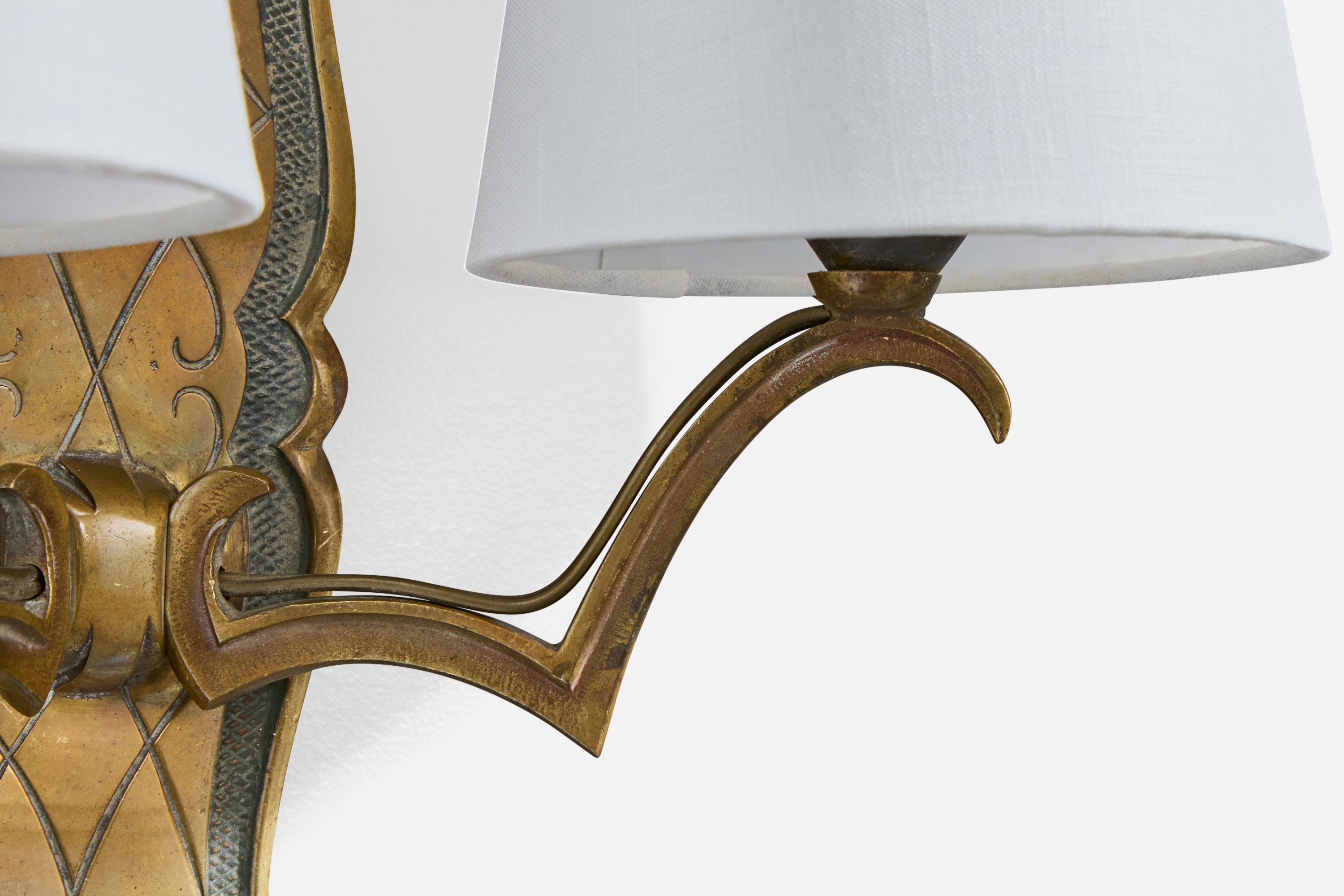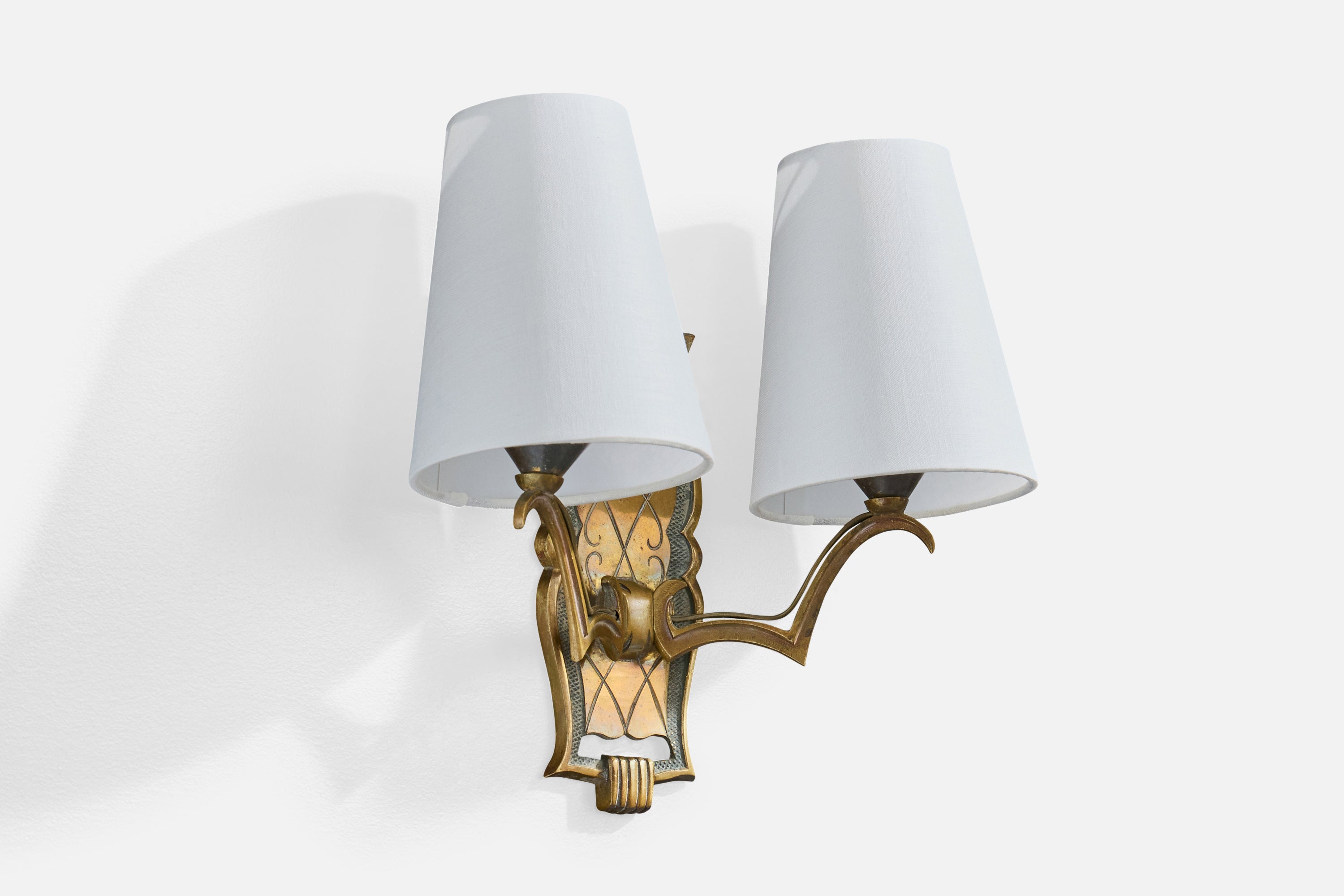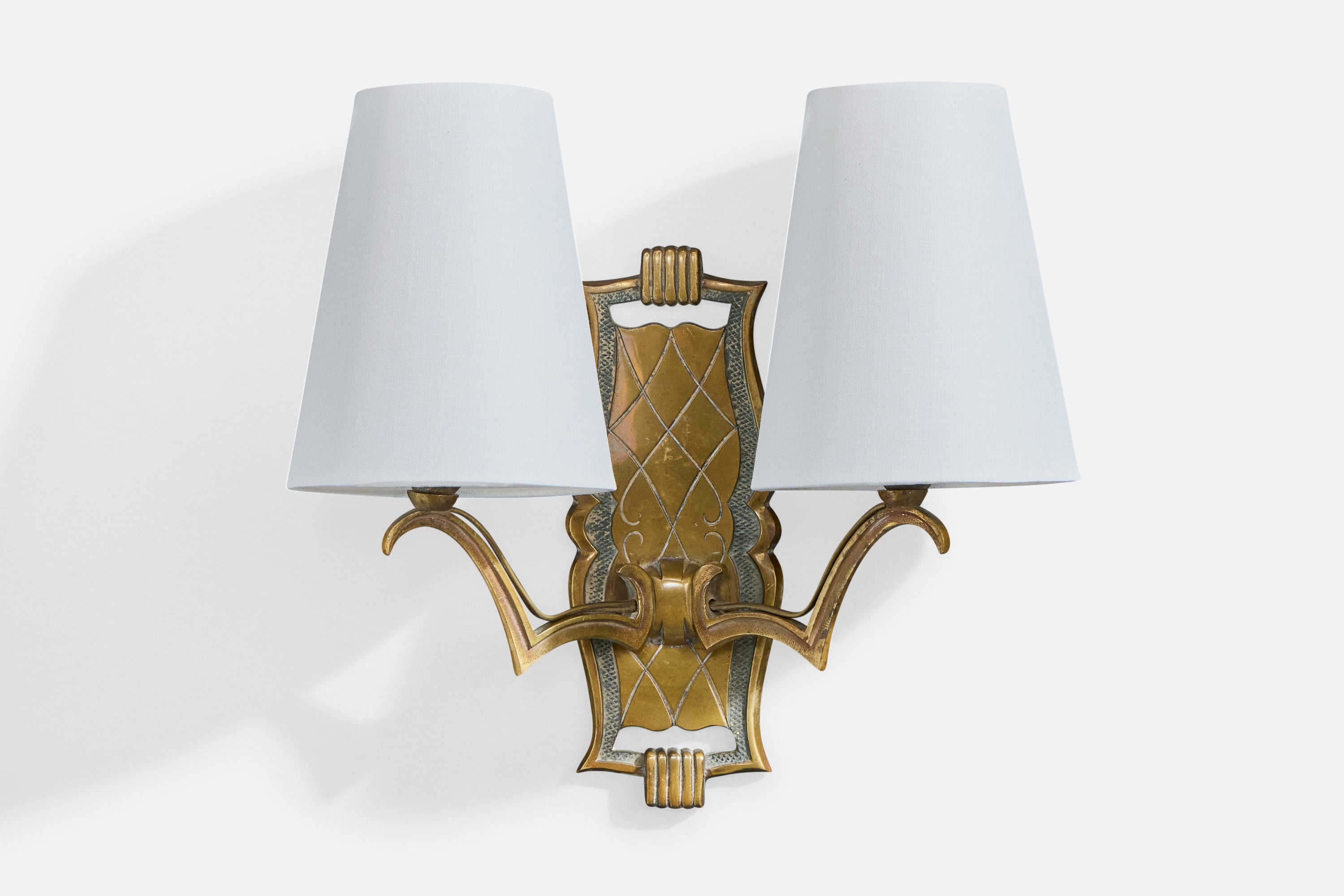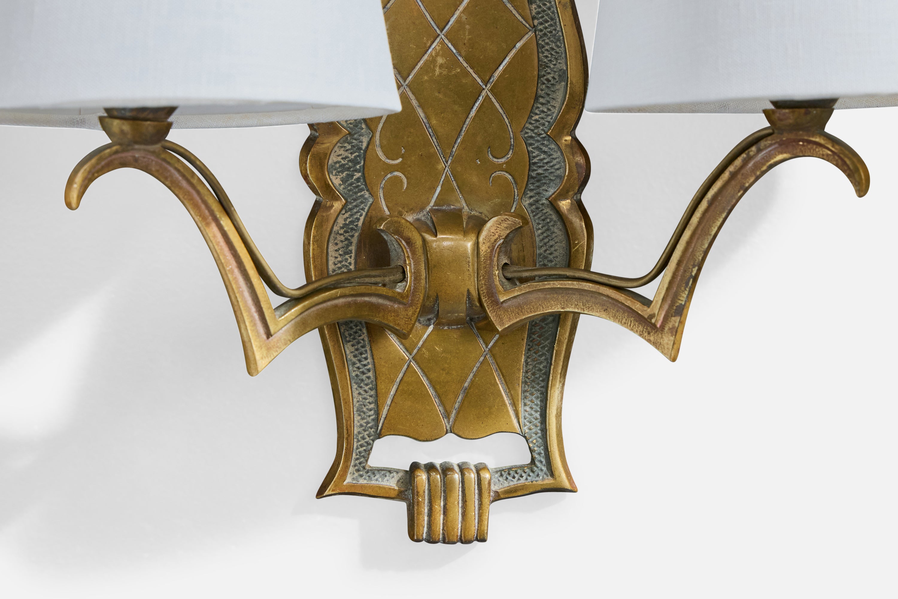 A brass and white fabric wall light designed and produced in France, c. 1930s.