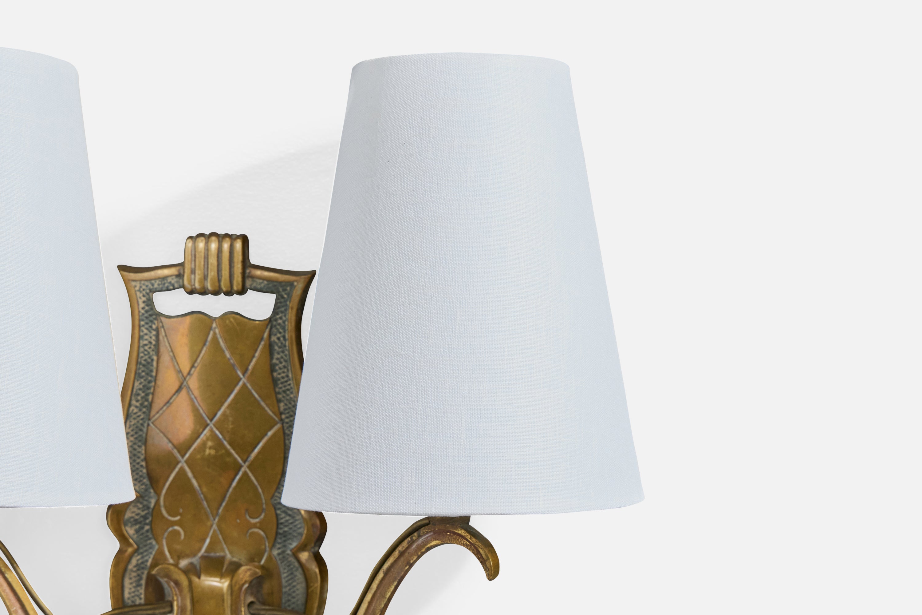 French Designer, Wall Light, Brass, Fabric, France, 1930s
