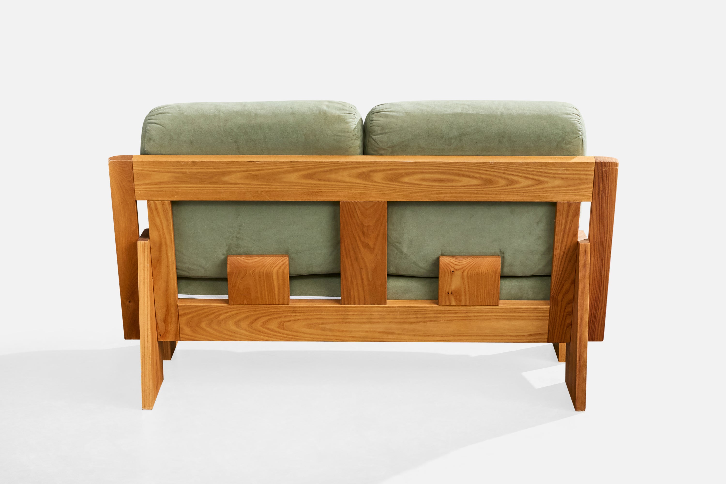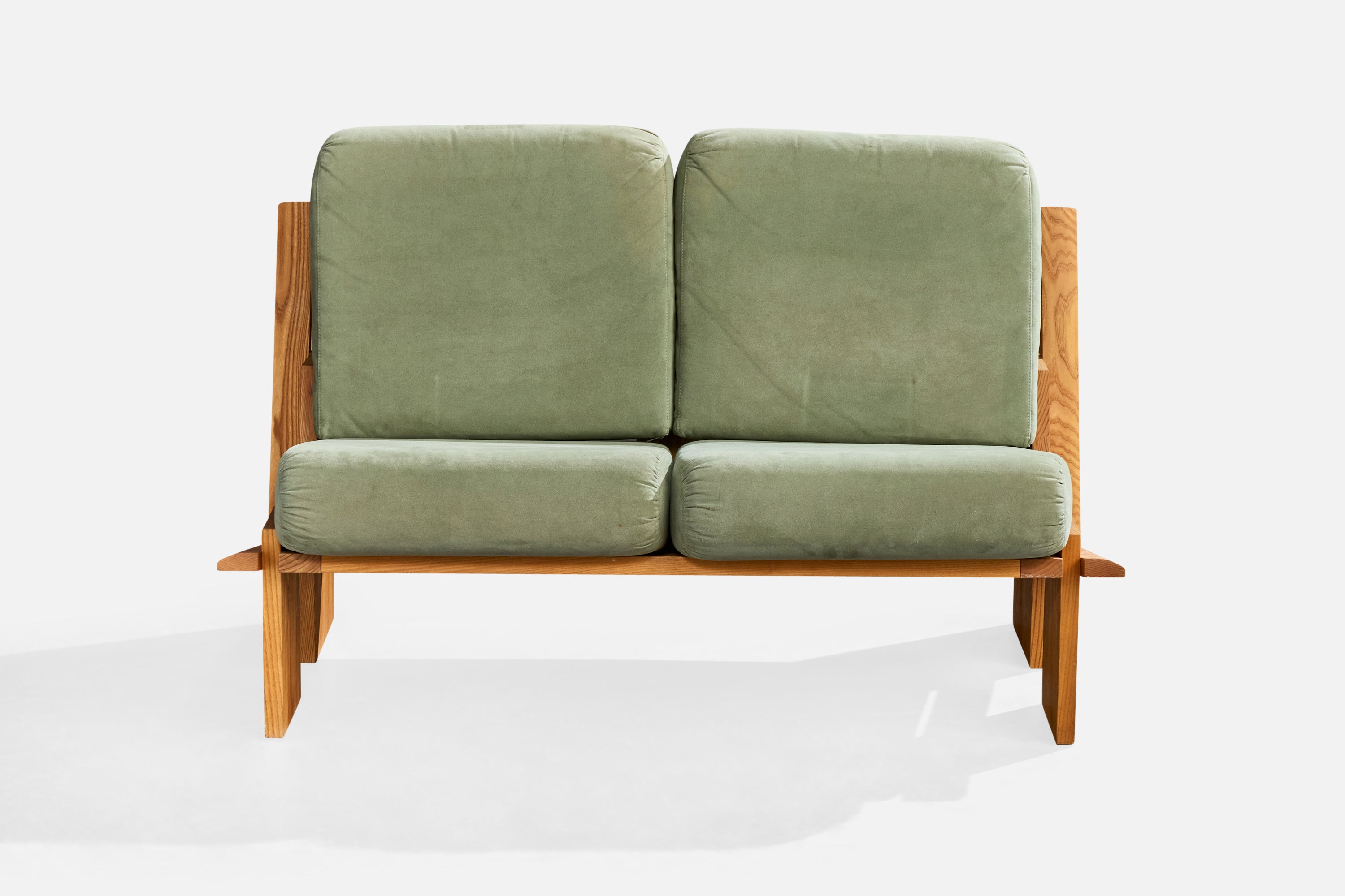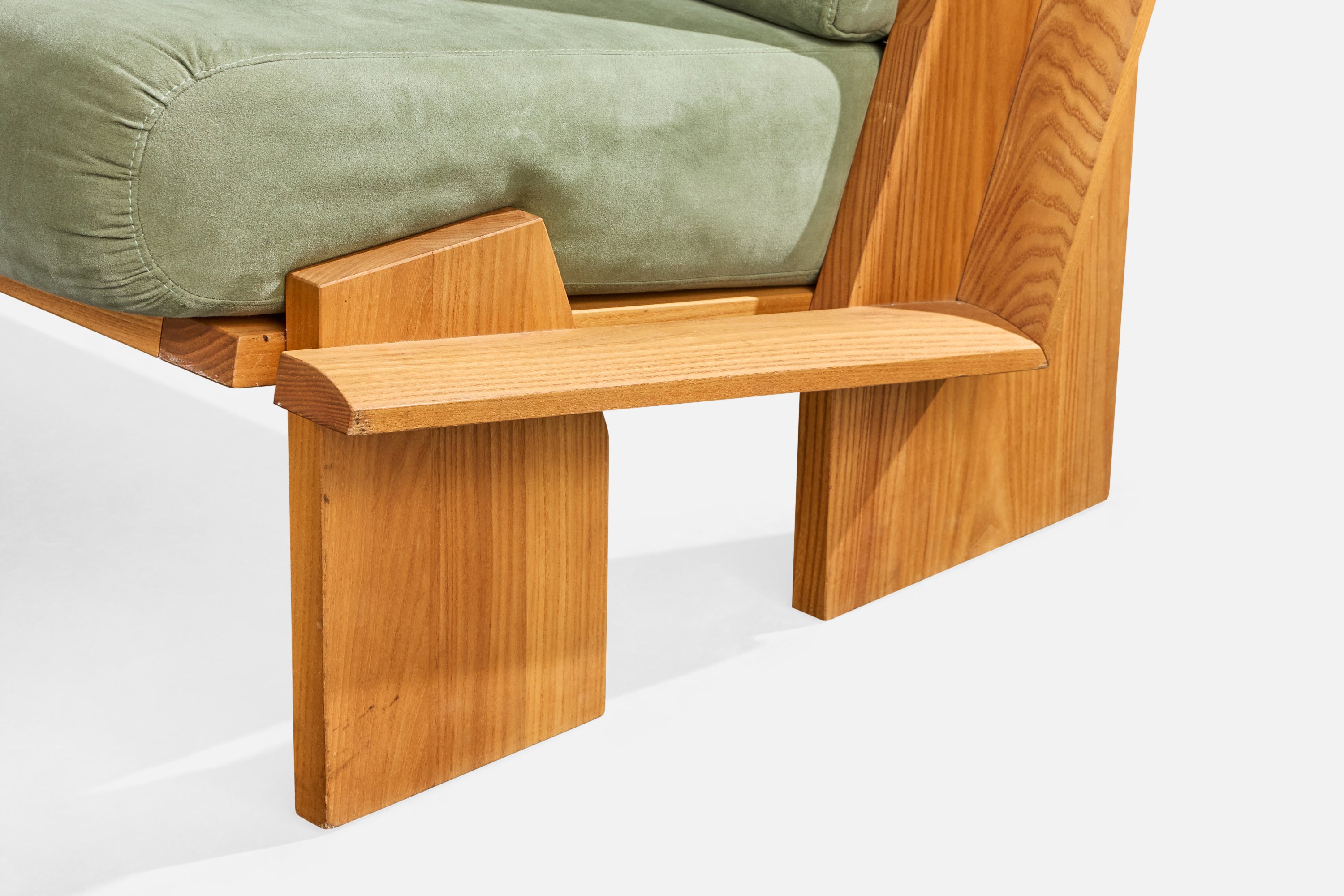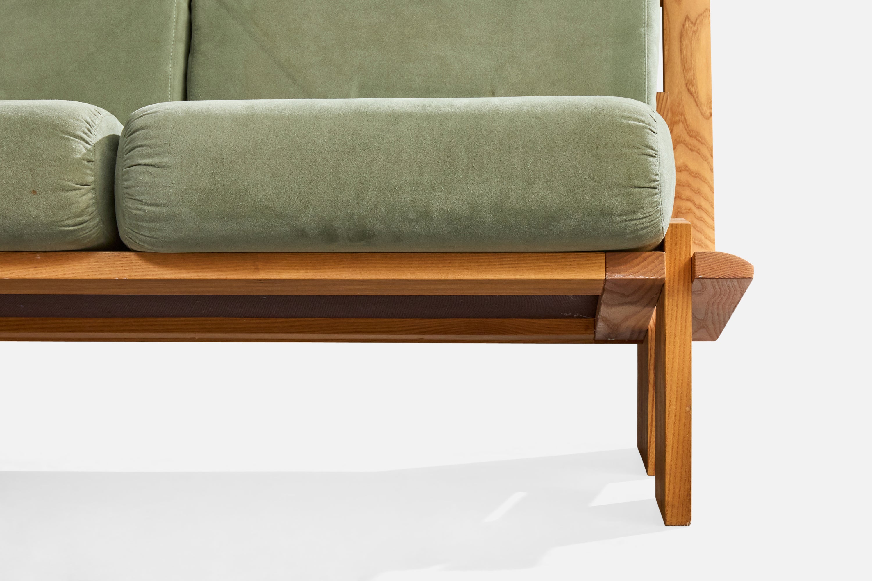 An oak and green fabric sofa likely designed and produced in France, c. 1980s.