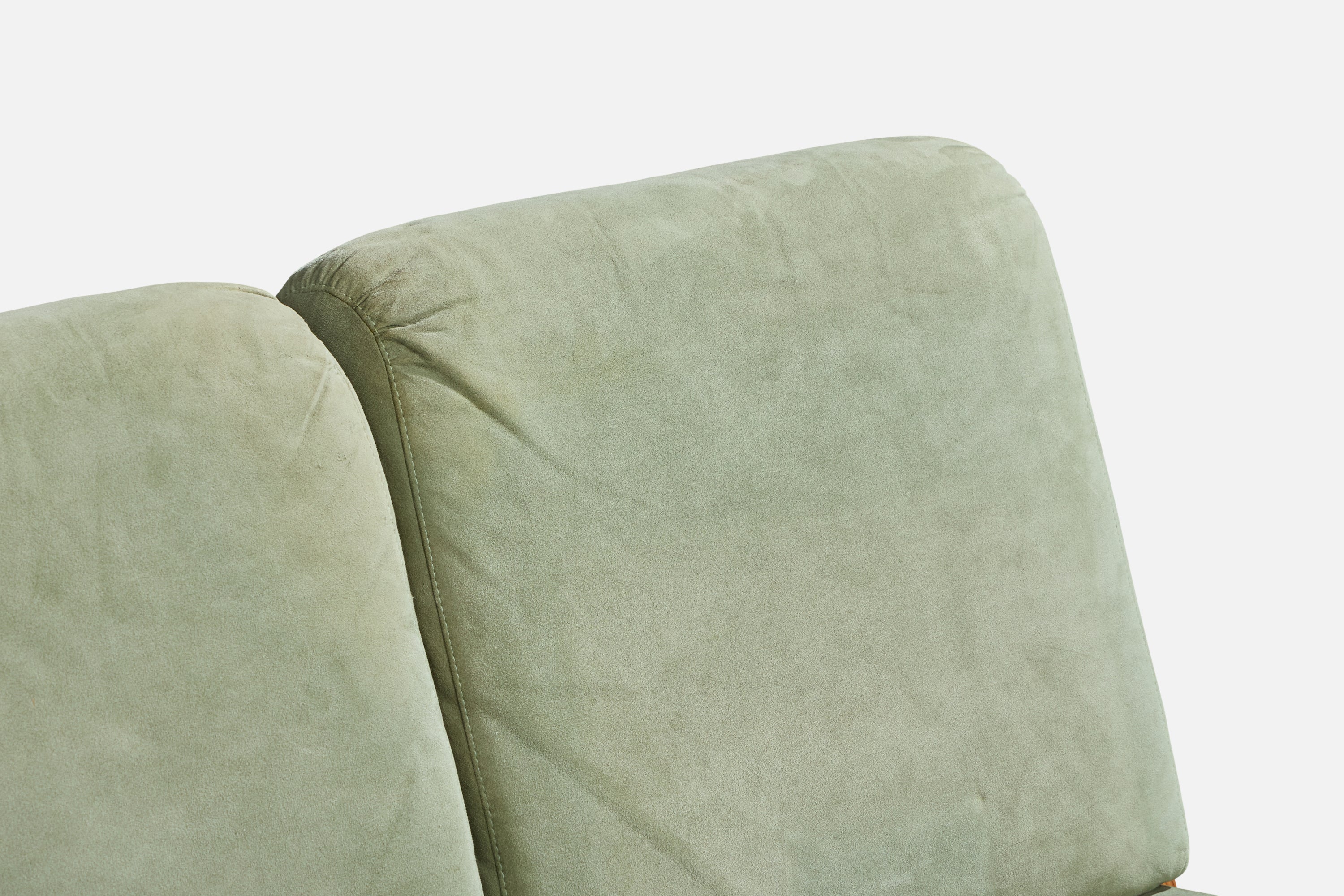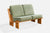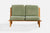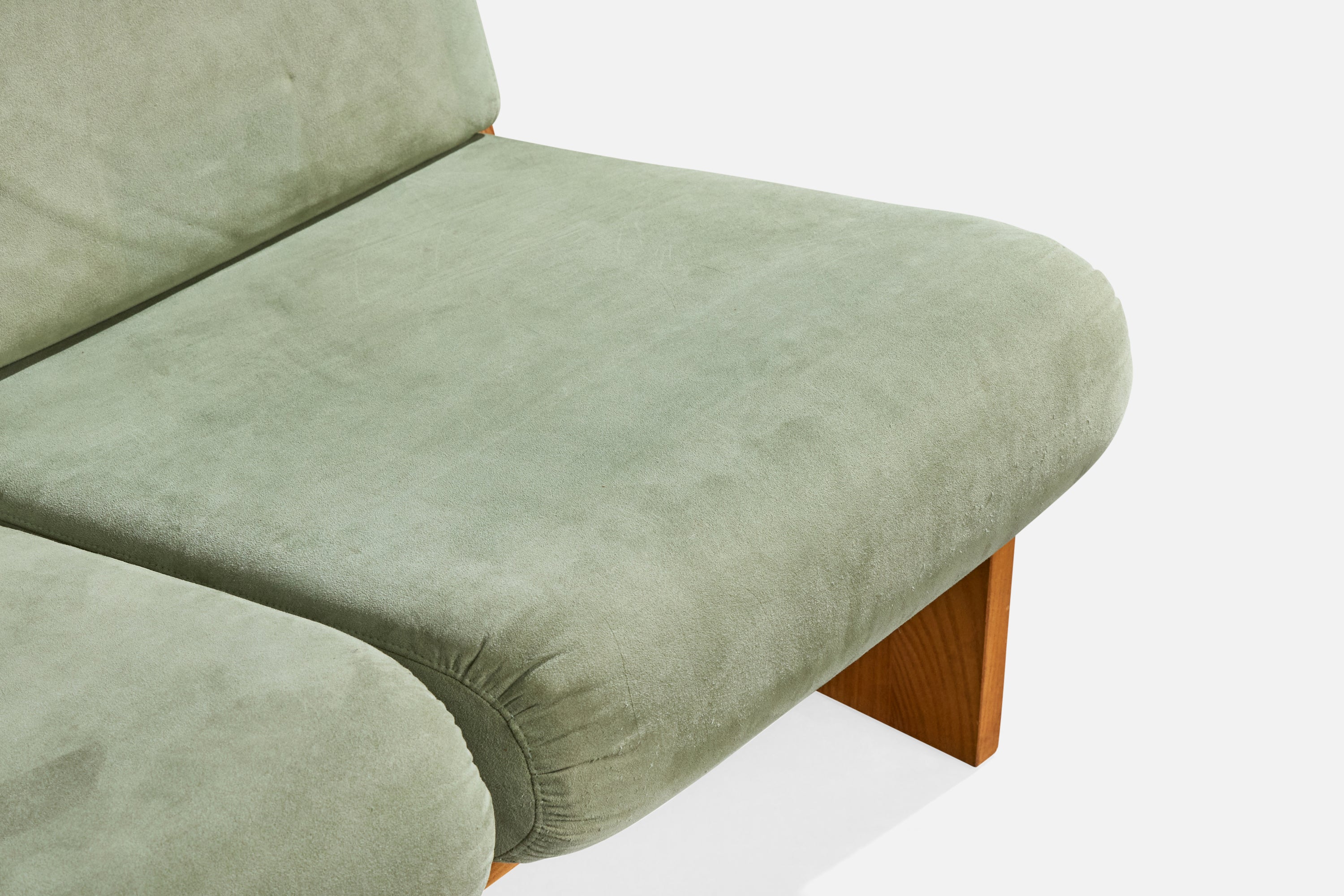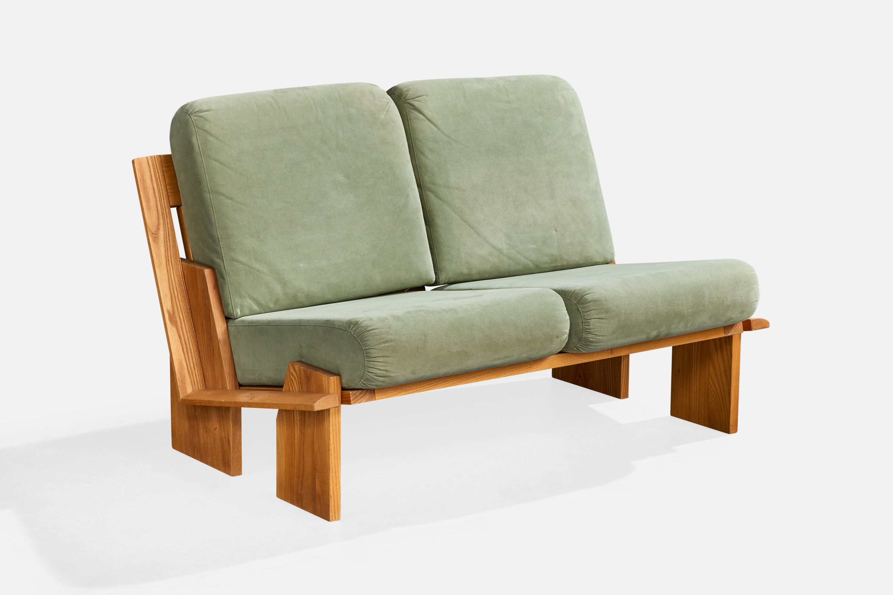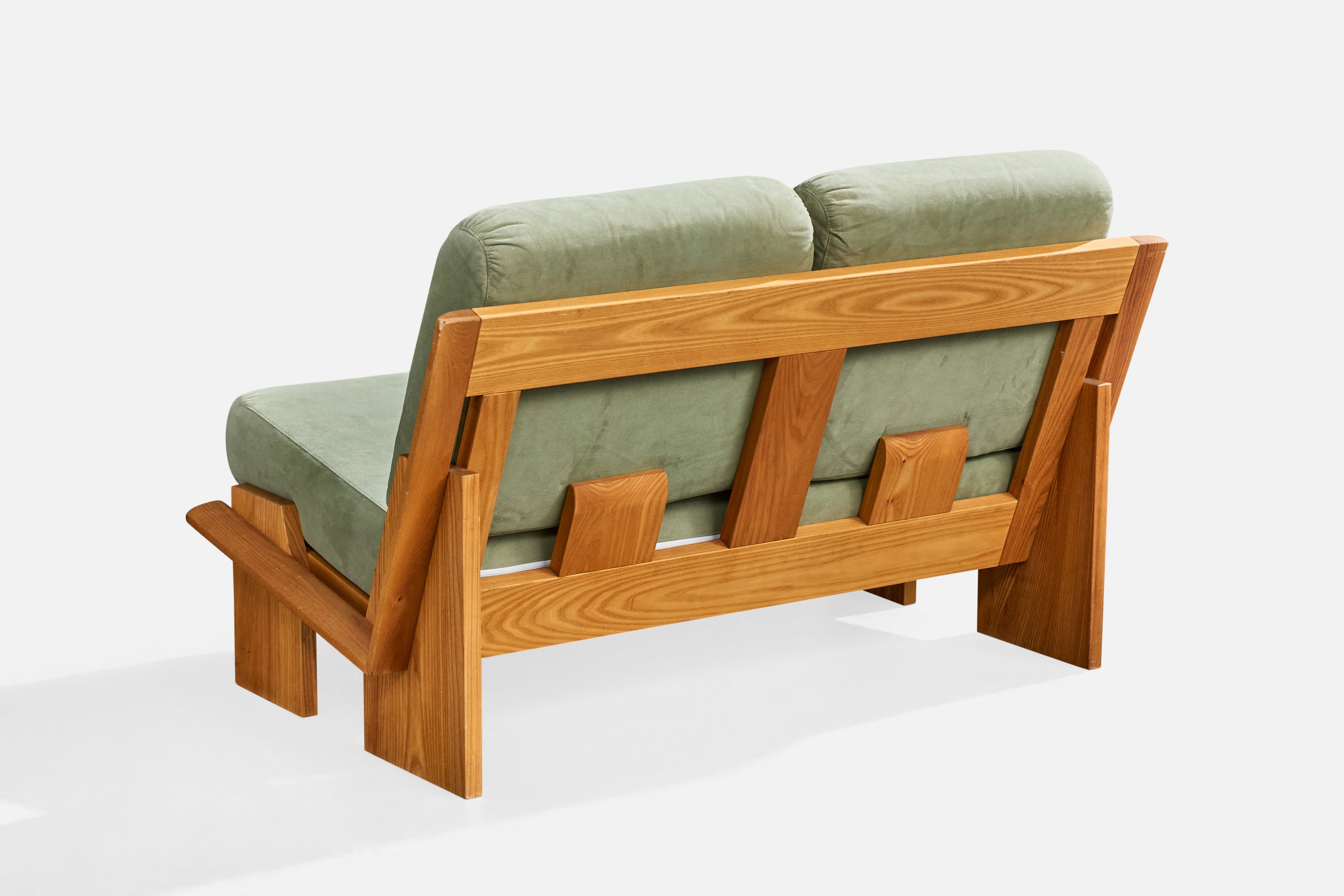 An oak and green fabric sofa likely designed and produced in France, c. 1980s.
