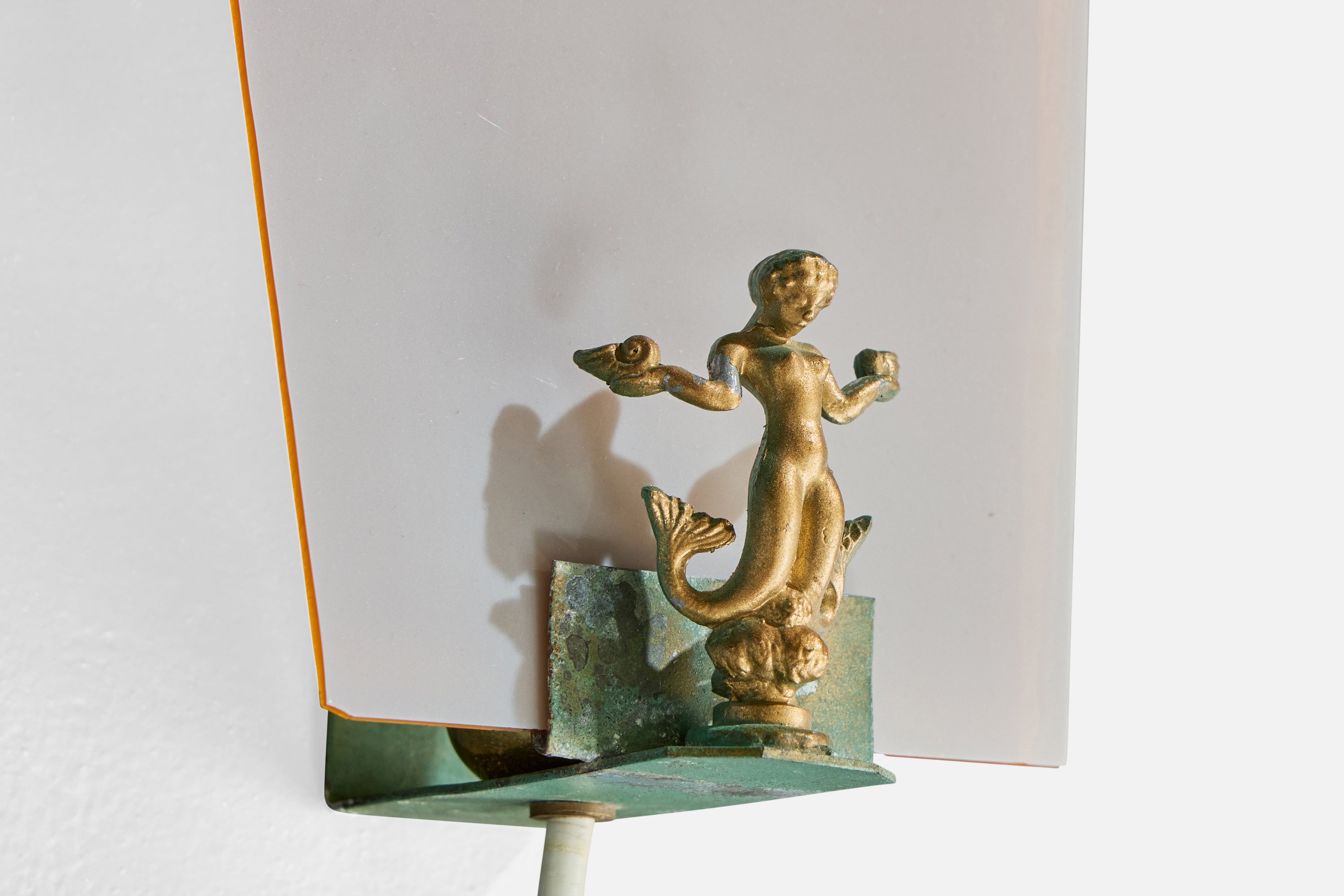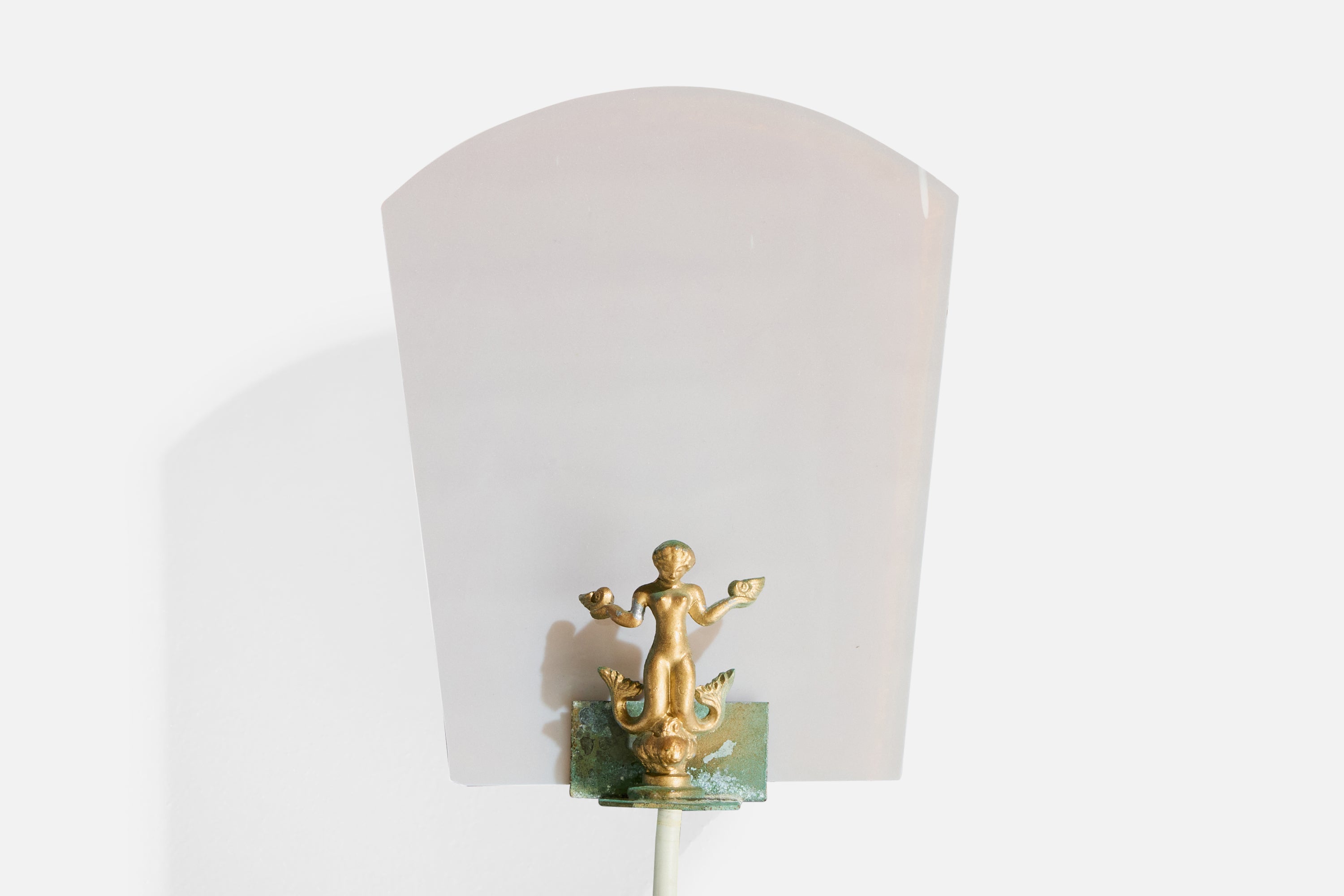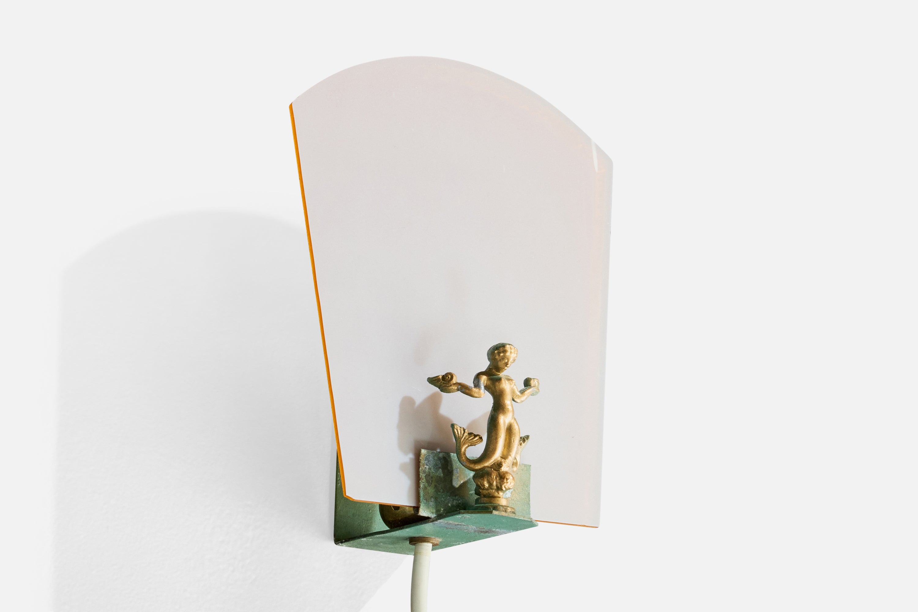 A gold. green-painted metal and opaline glass wall light designed and produced in Sweden, c. 1930s.