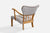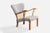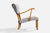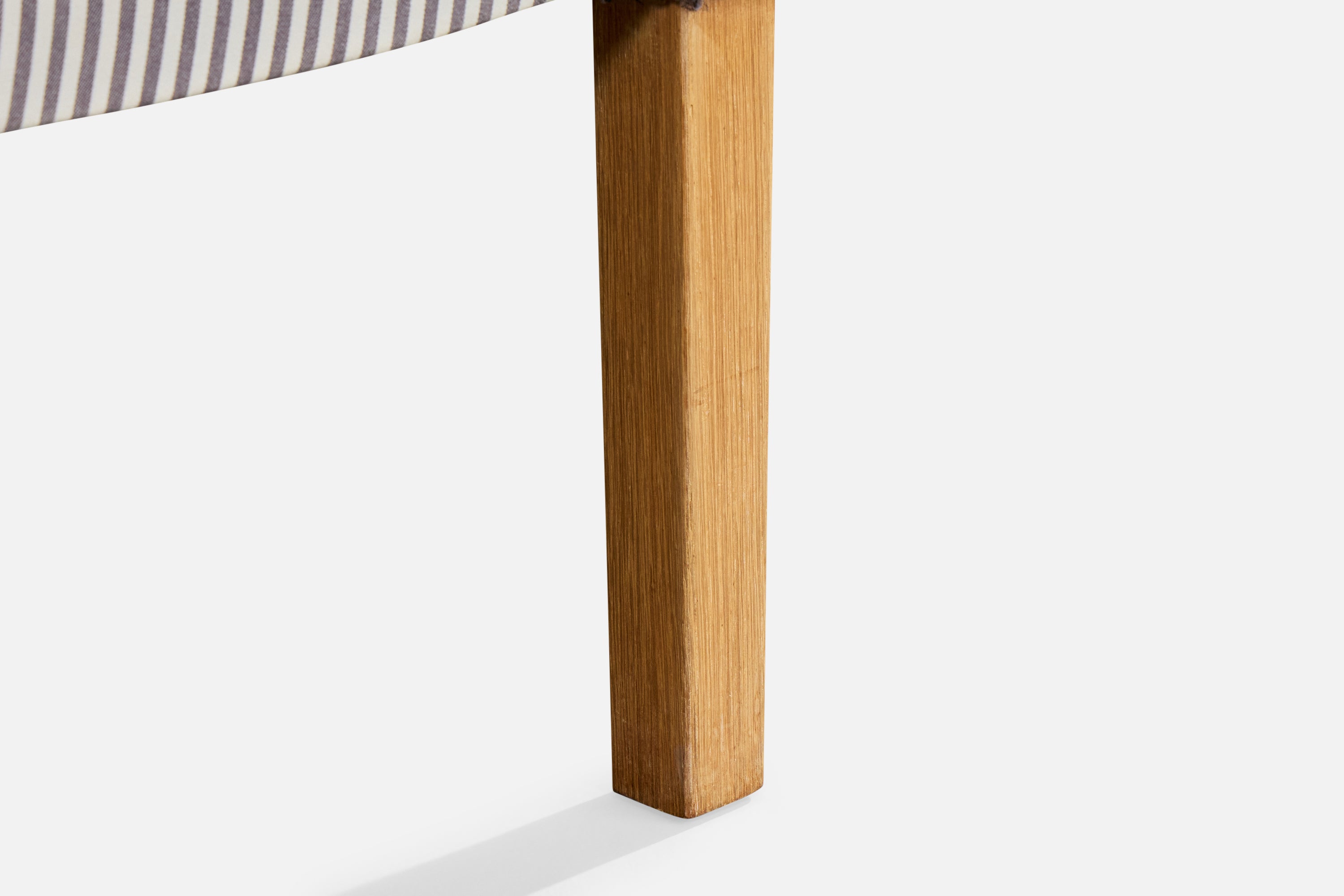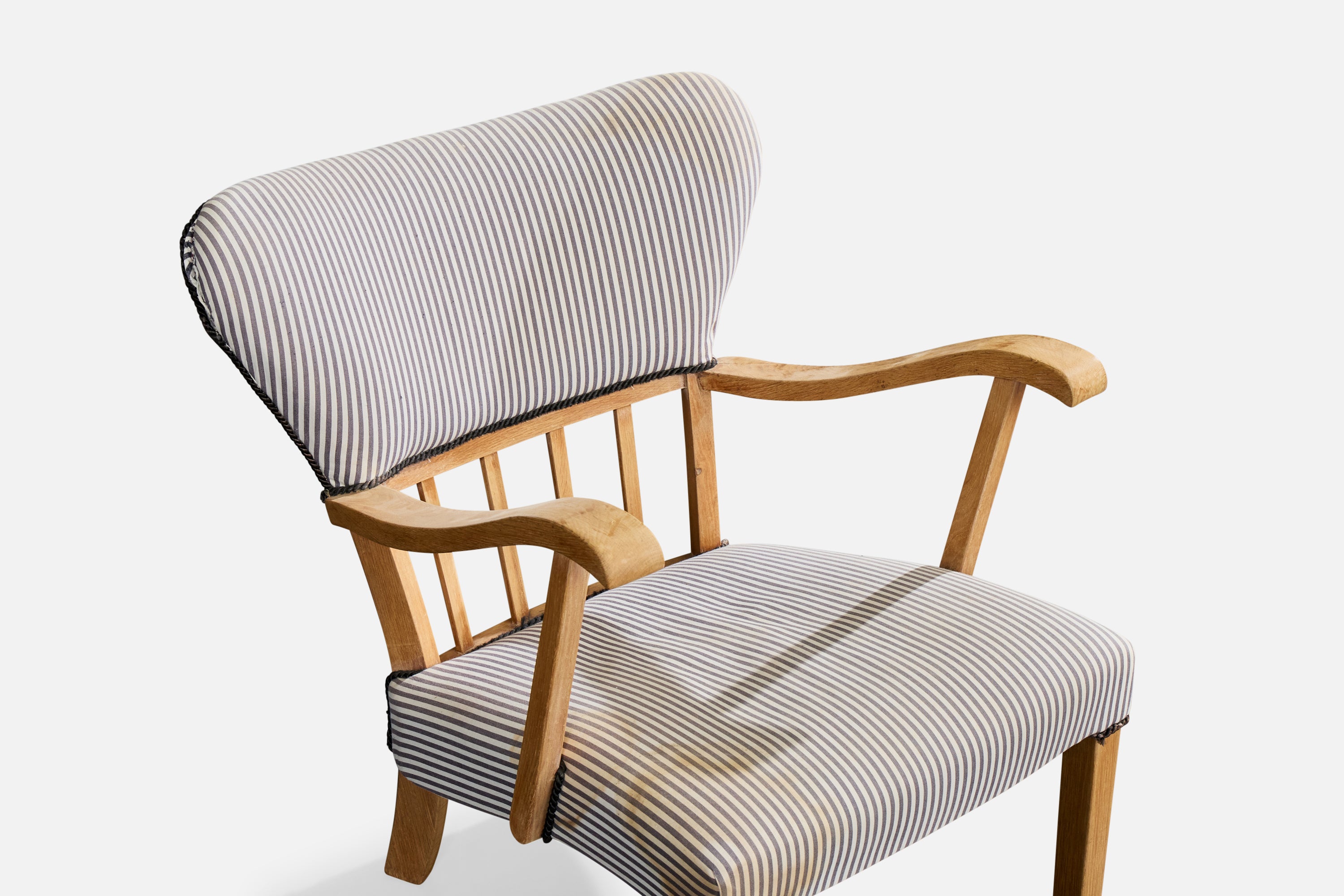 An oak and light grey fabric lounge chair designed and produced in Denmark, c. 1940s.