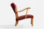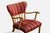 An oak and red fabric lounge chair designed and produced in Denmark, c. 1940s.