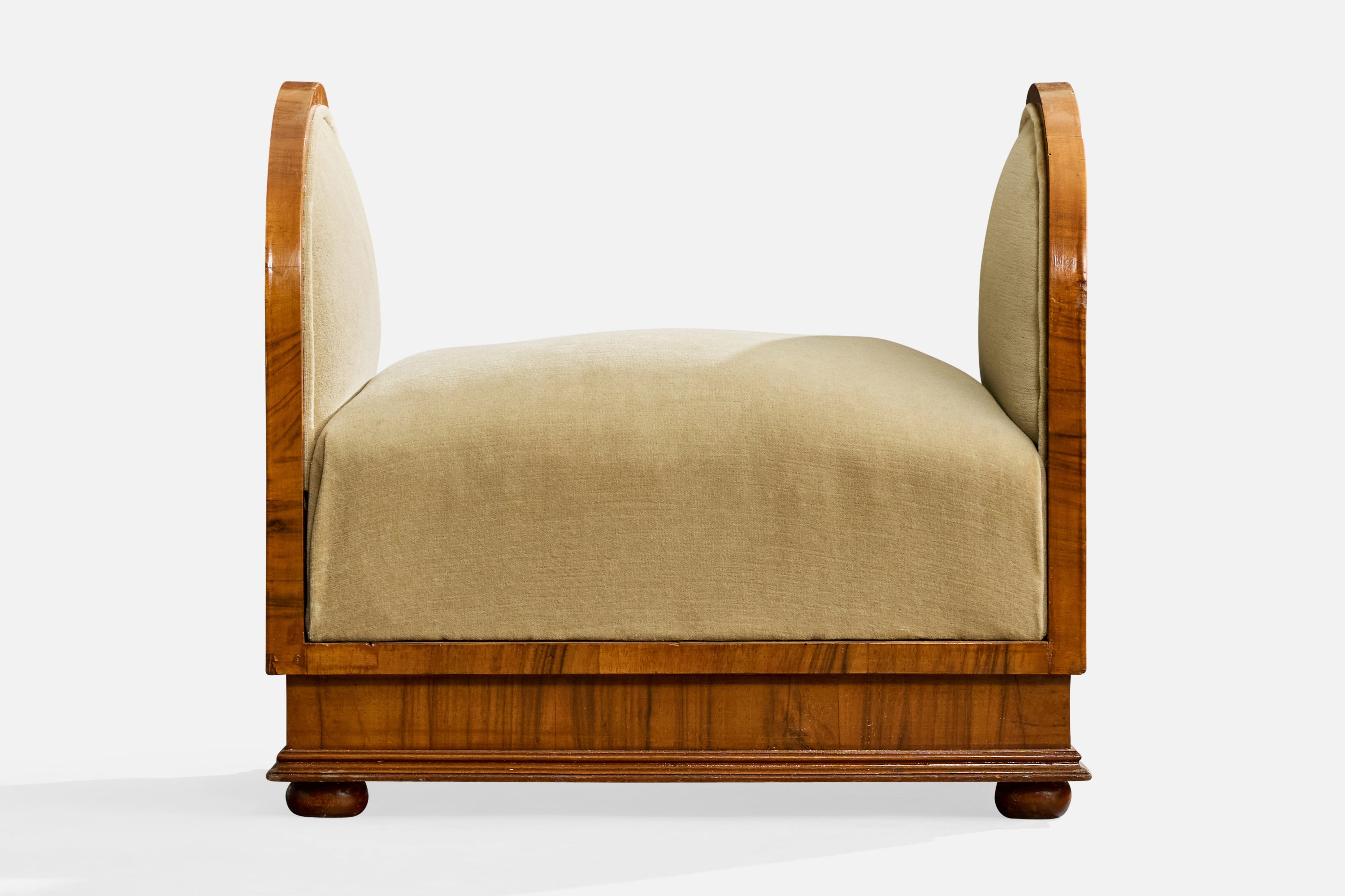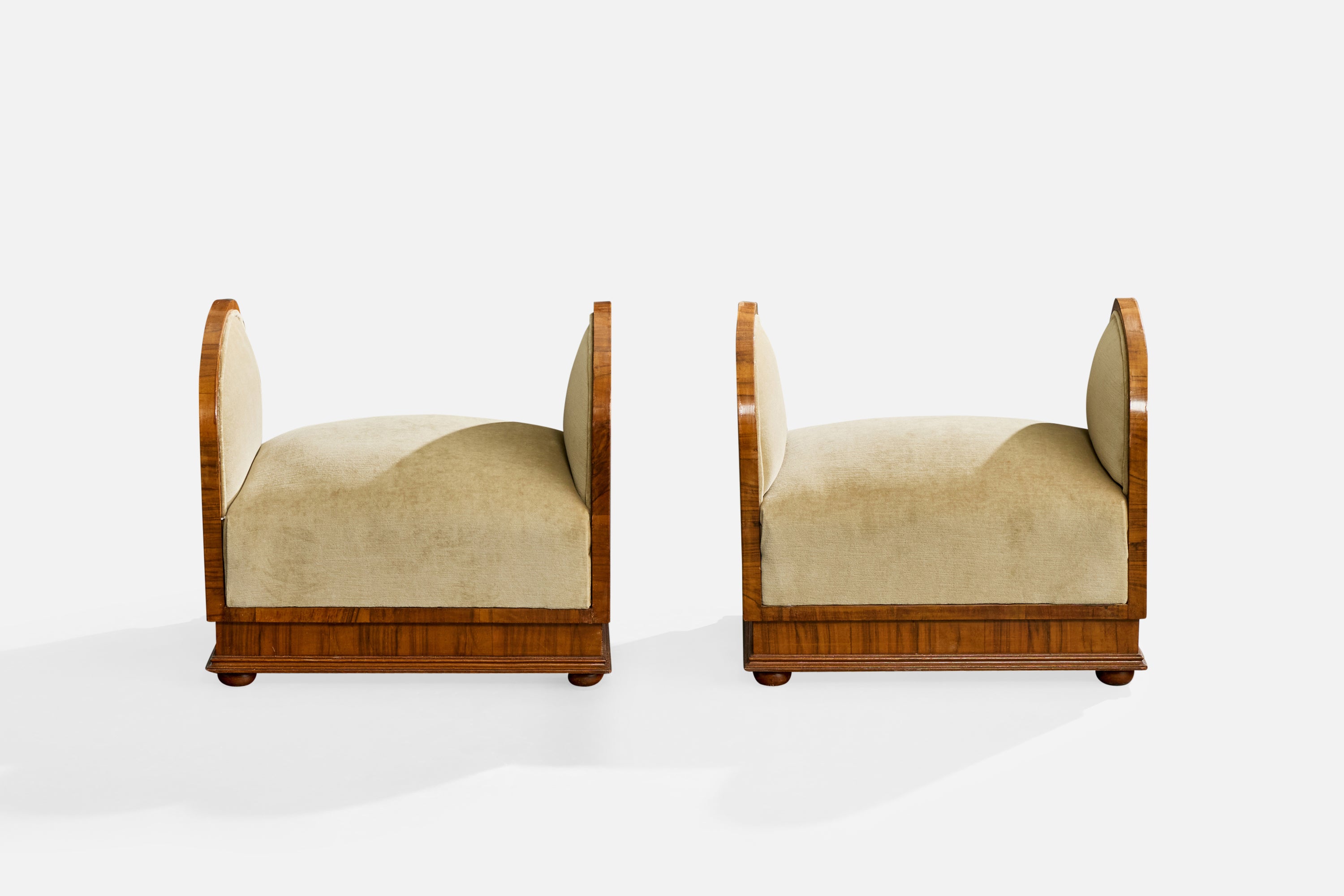 A pair of walnut and beige fabric stools or ottomans designed and produced in Italy, c. 1930s.