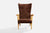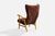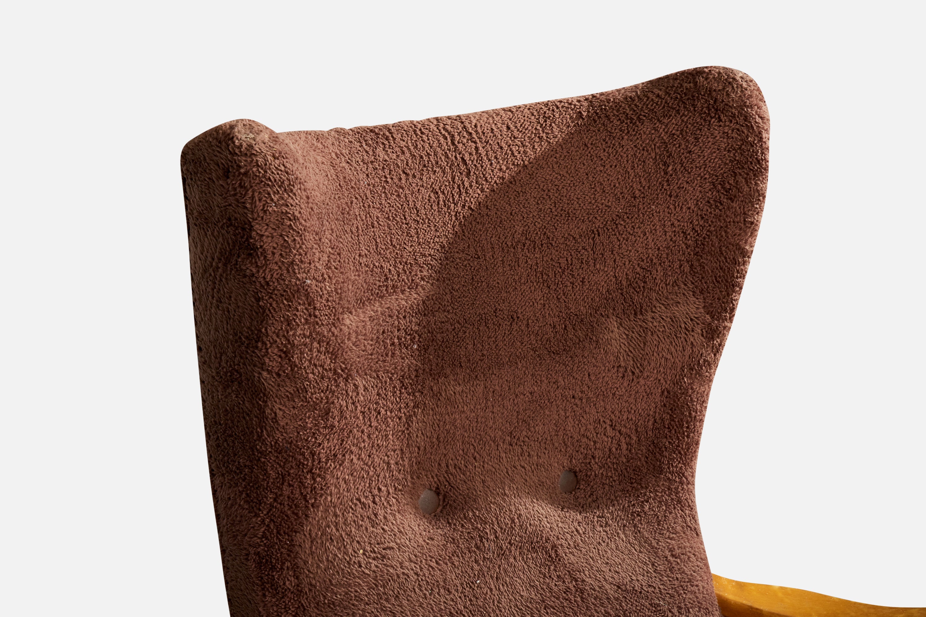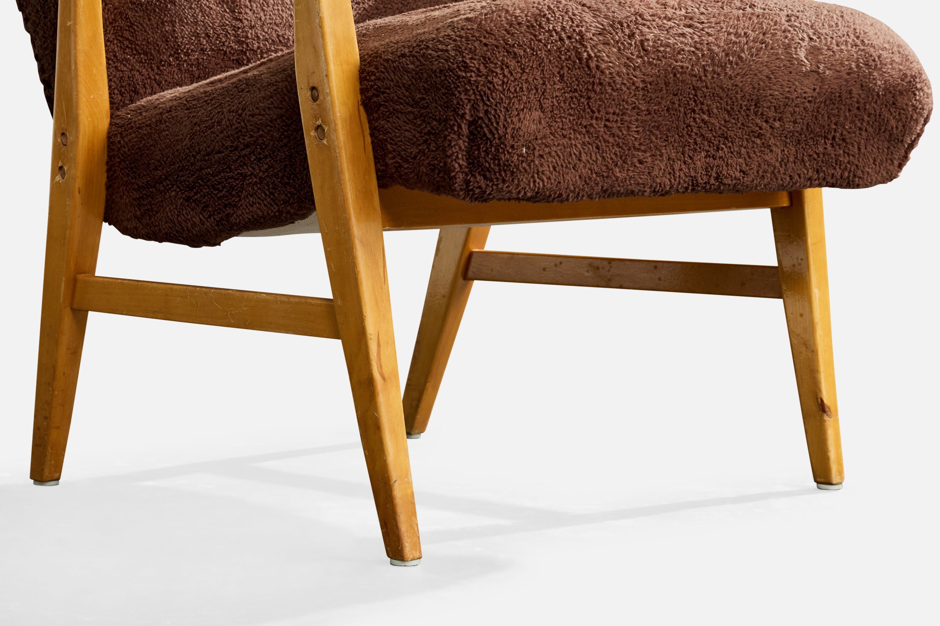 A birch and brown fabric lounge designed by Elias Svedberg and produced by Nordiska Kompaniet, Sweden, c. 1940s.