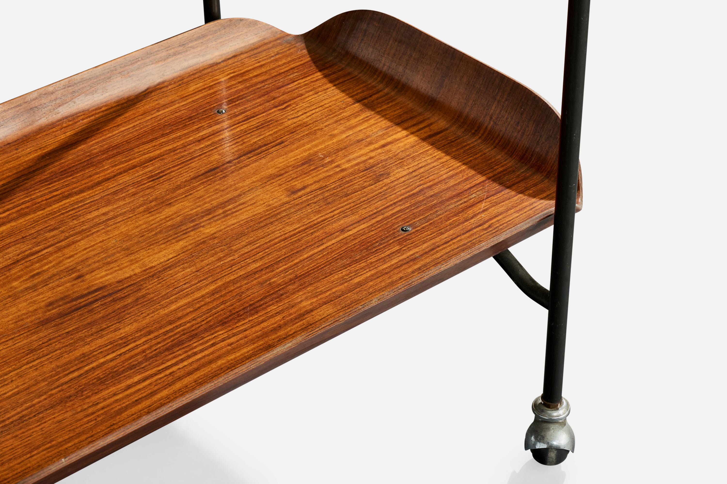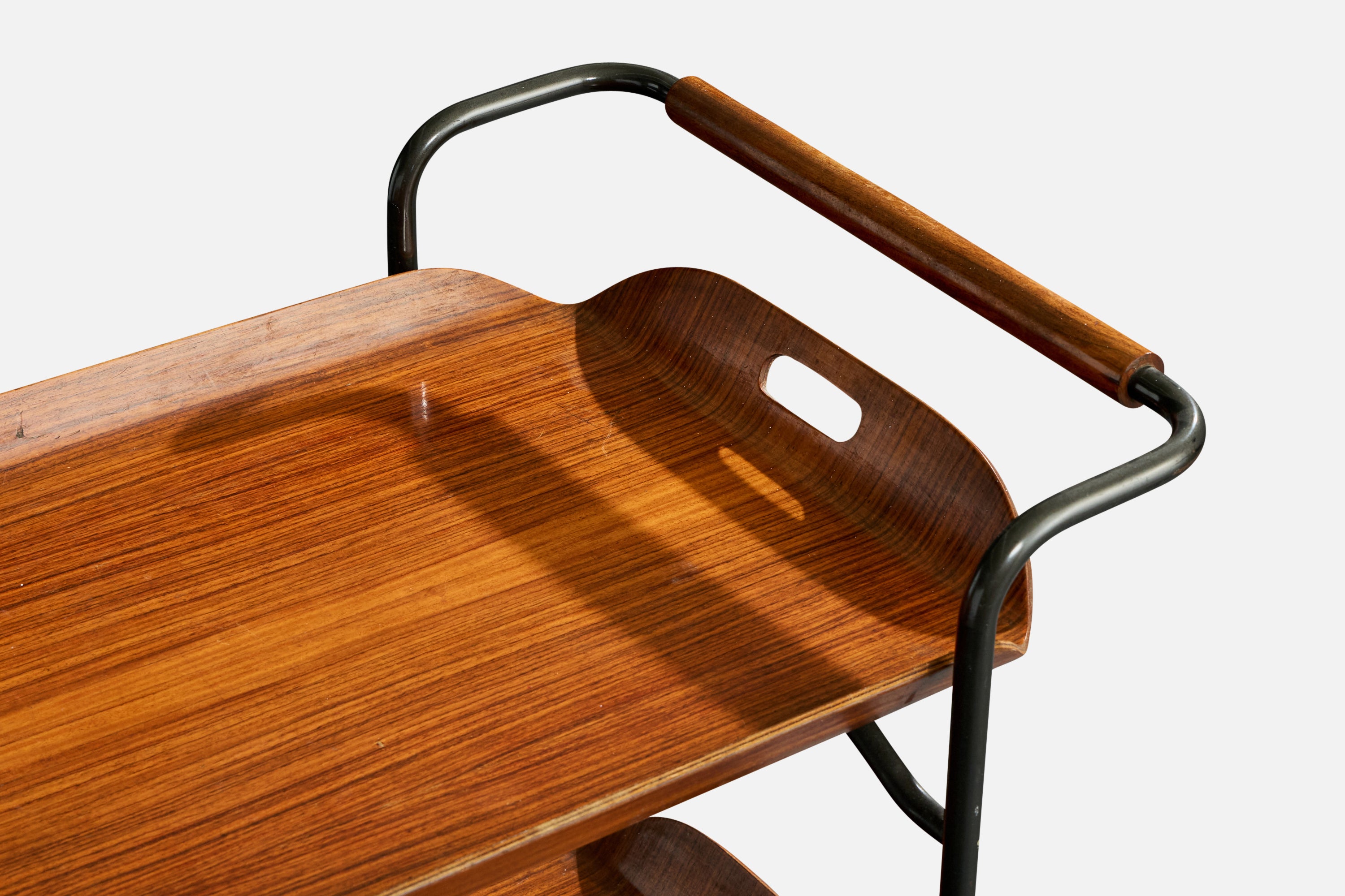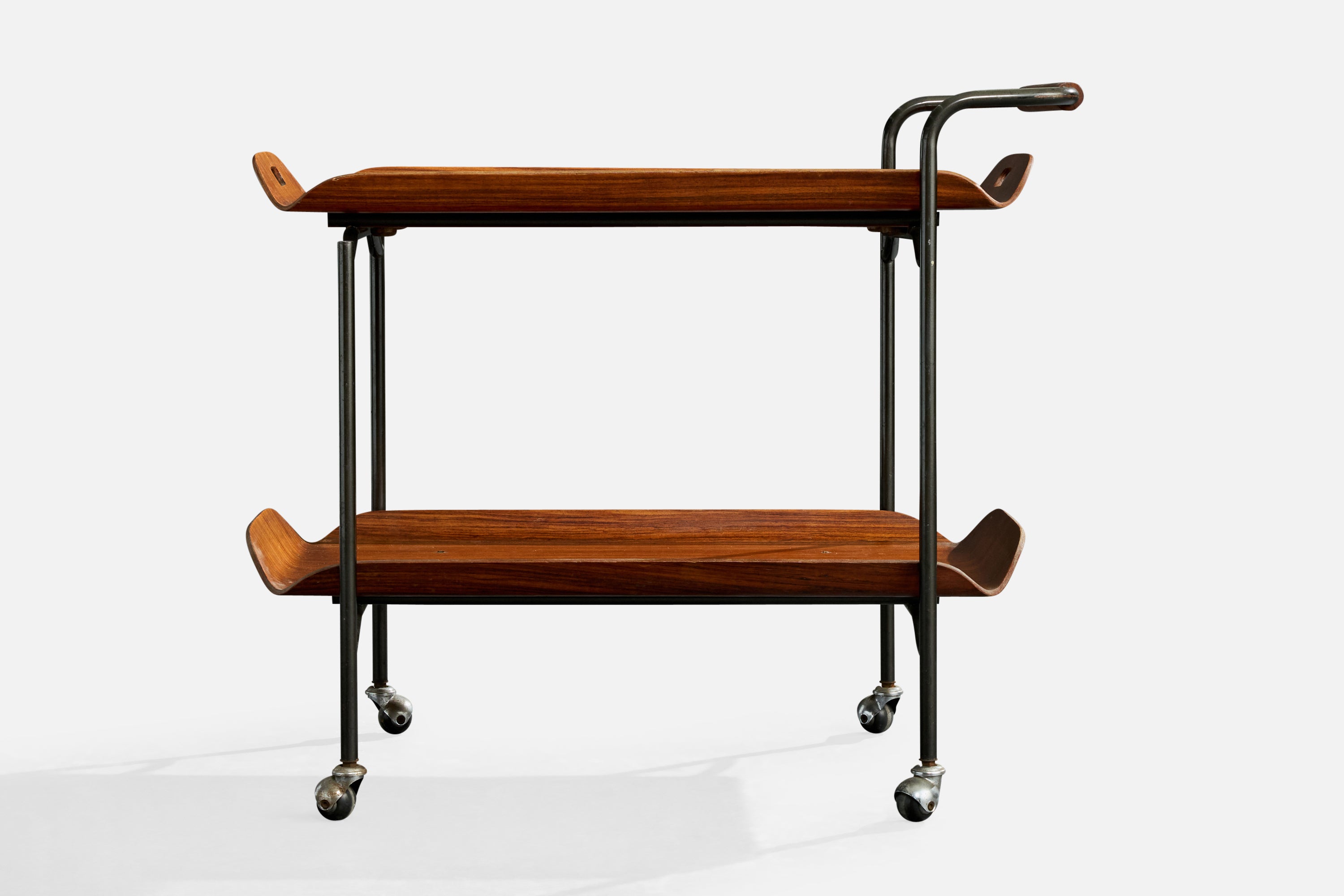 A teak and black-lacquered metal serving cart or bar cart designed and produced in Italy, c. 1950s.