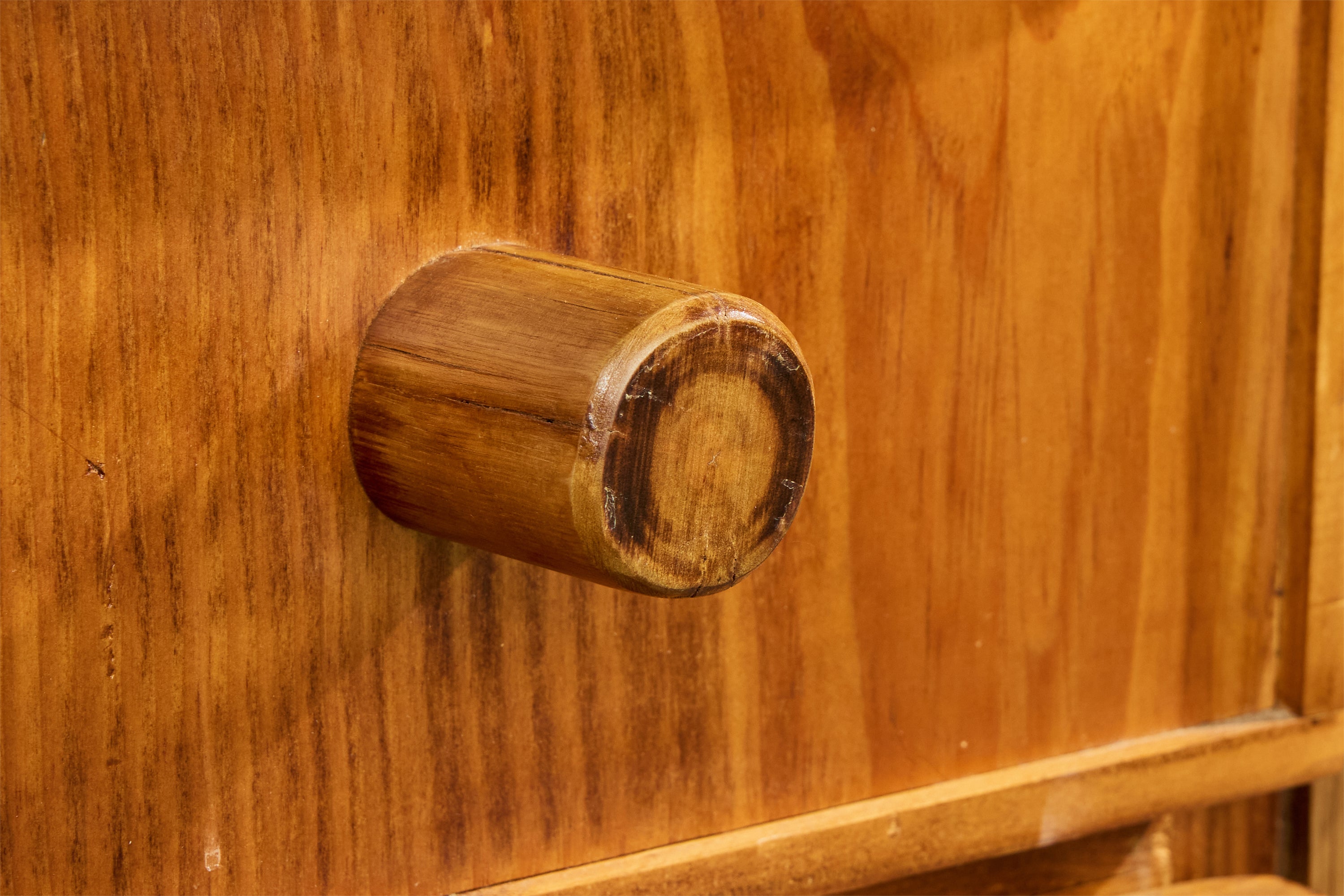 Both have minor imperfections from normal use on drawer and door fronts, as well as minor to moderate staining on drawer bottoms. One tabletop has a small burn mark; other has wood imperfection from manufactoring process. Legs have minor surface scratches and natural cracking.