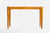 Frosted glass has some light staining on one edge of table; minor imperfections and scratches throughout glass tabletop surface and wood frame.