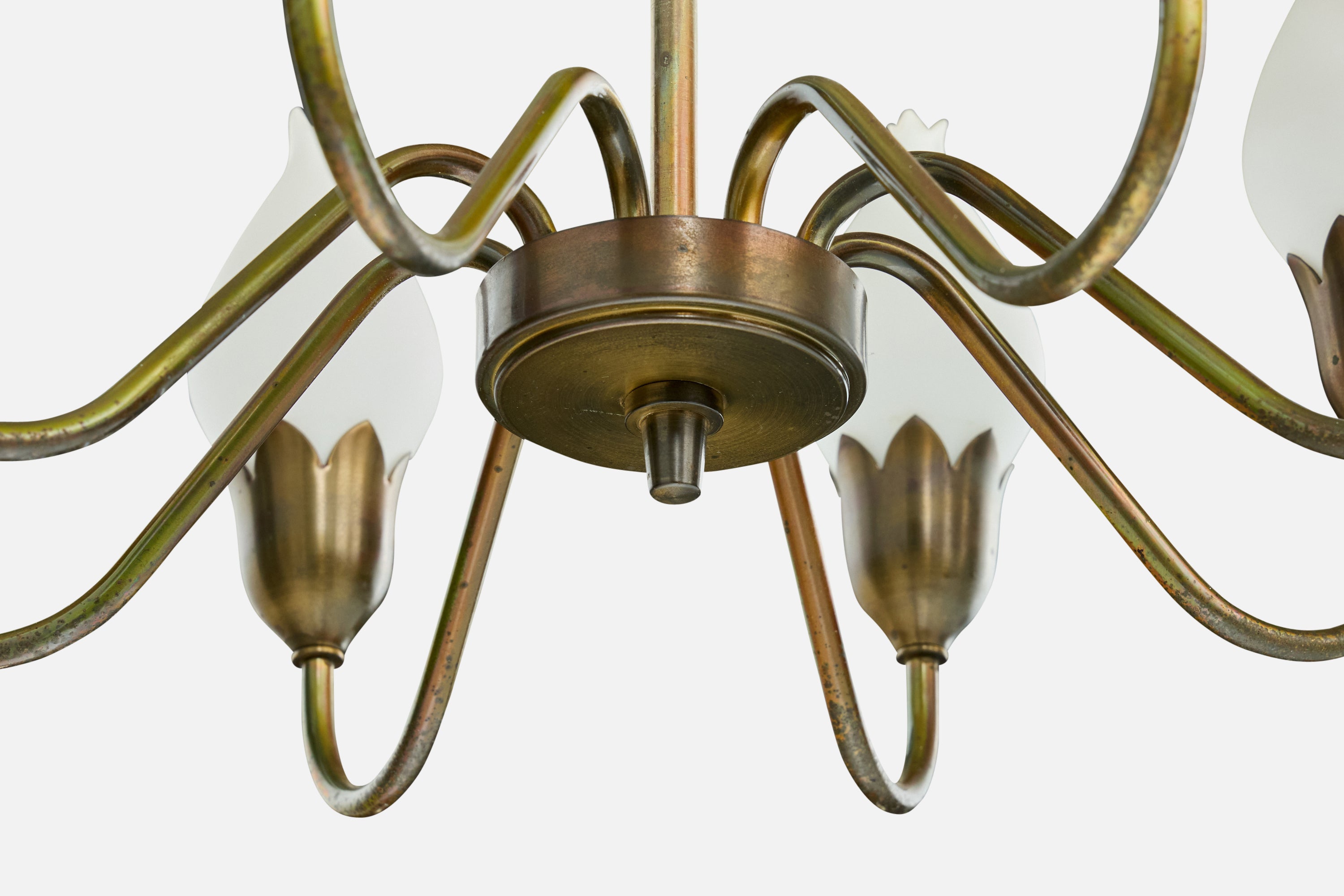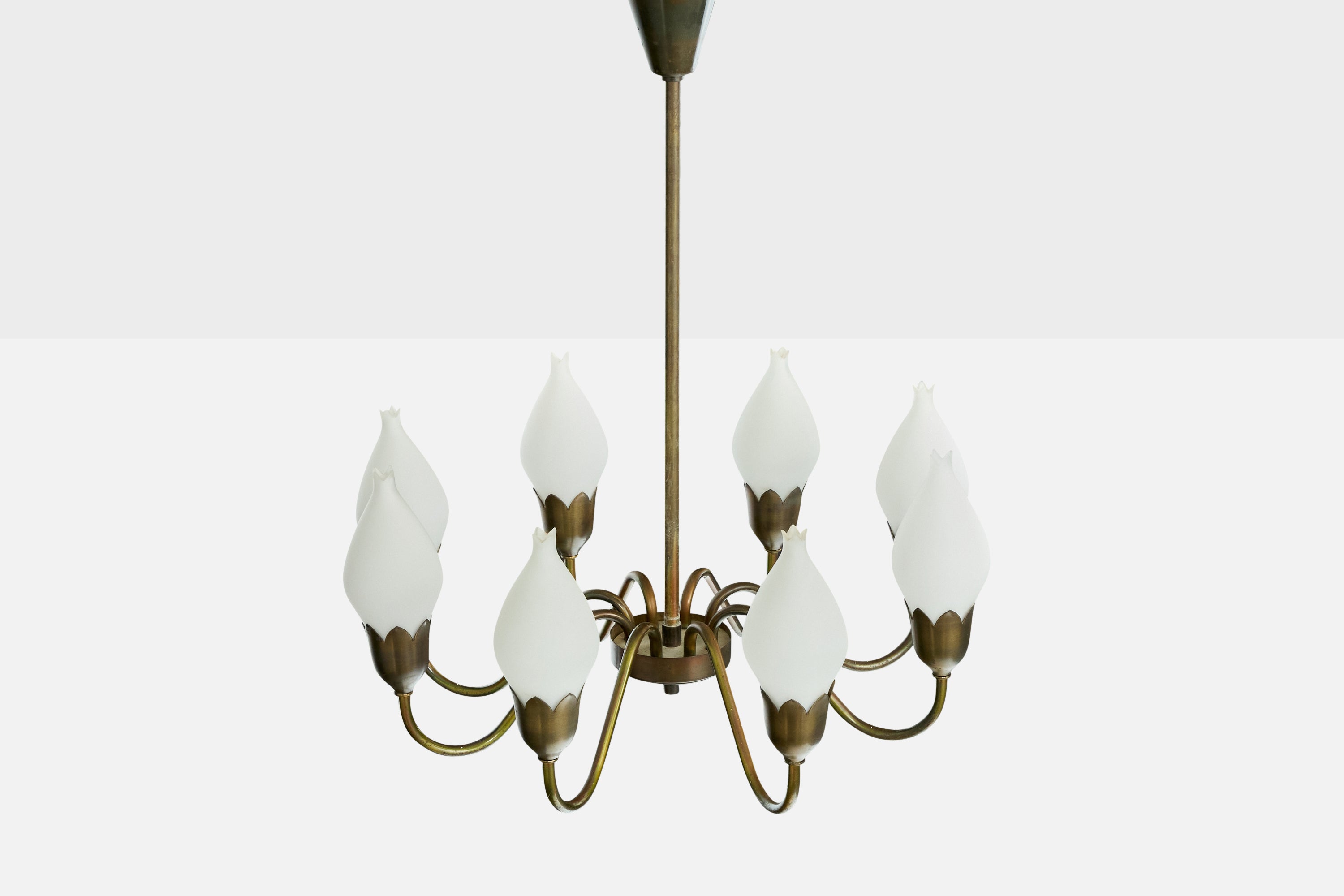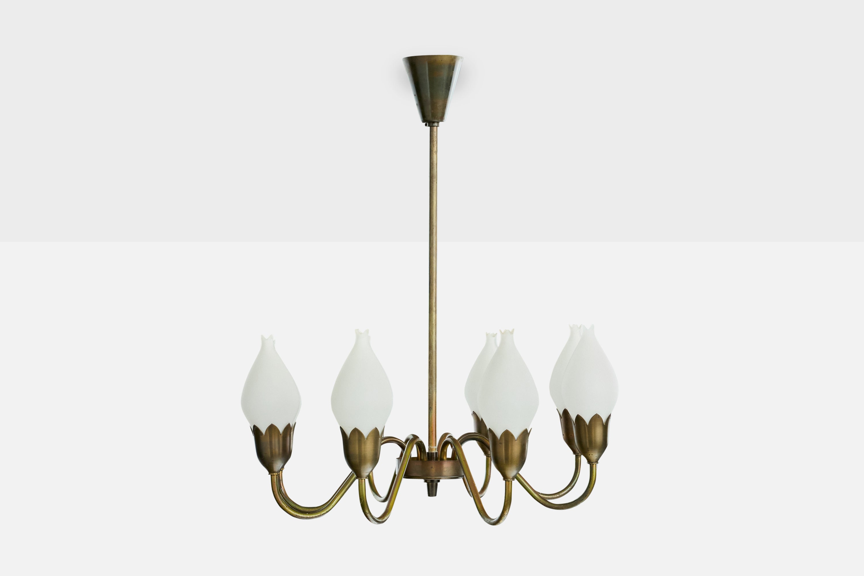 A brass and white opaline glass chandelier produced by Fog & Mørup, Denmark, c. 1950s.