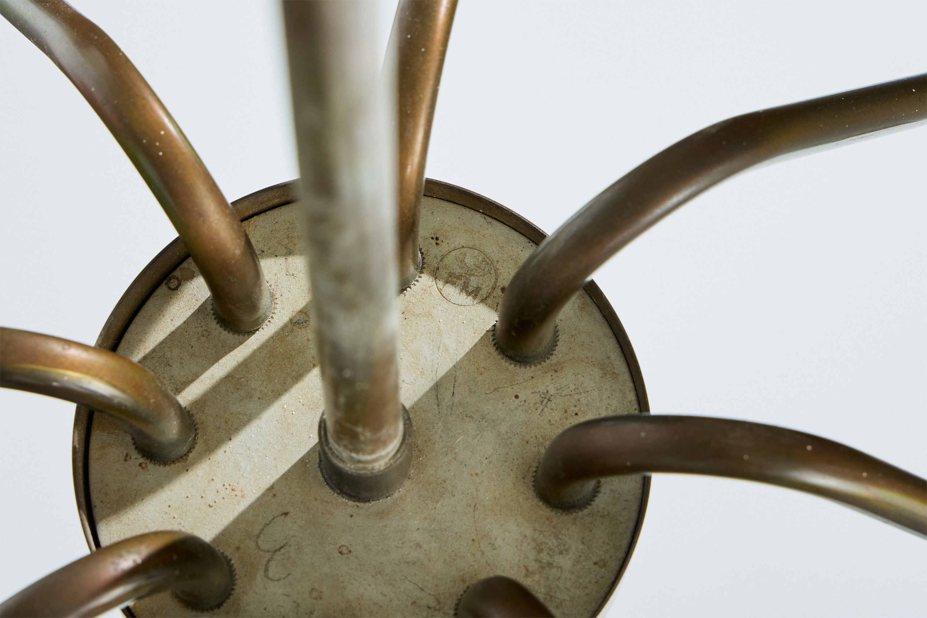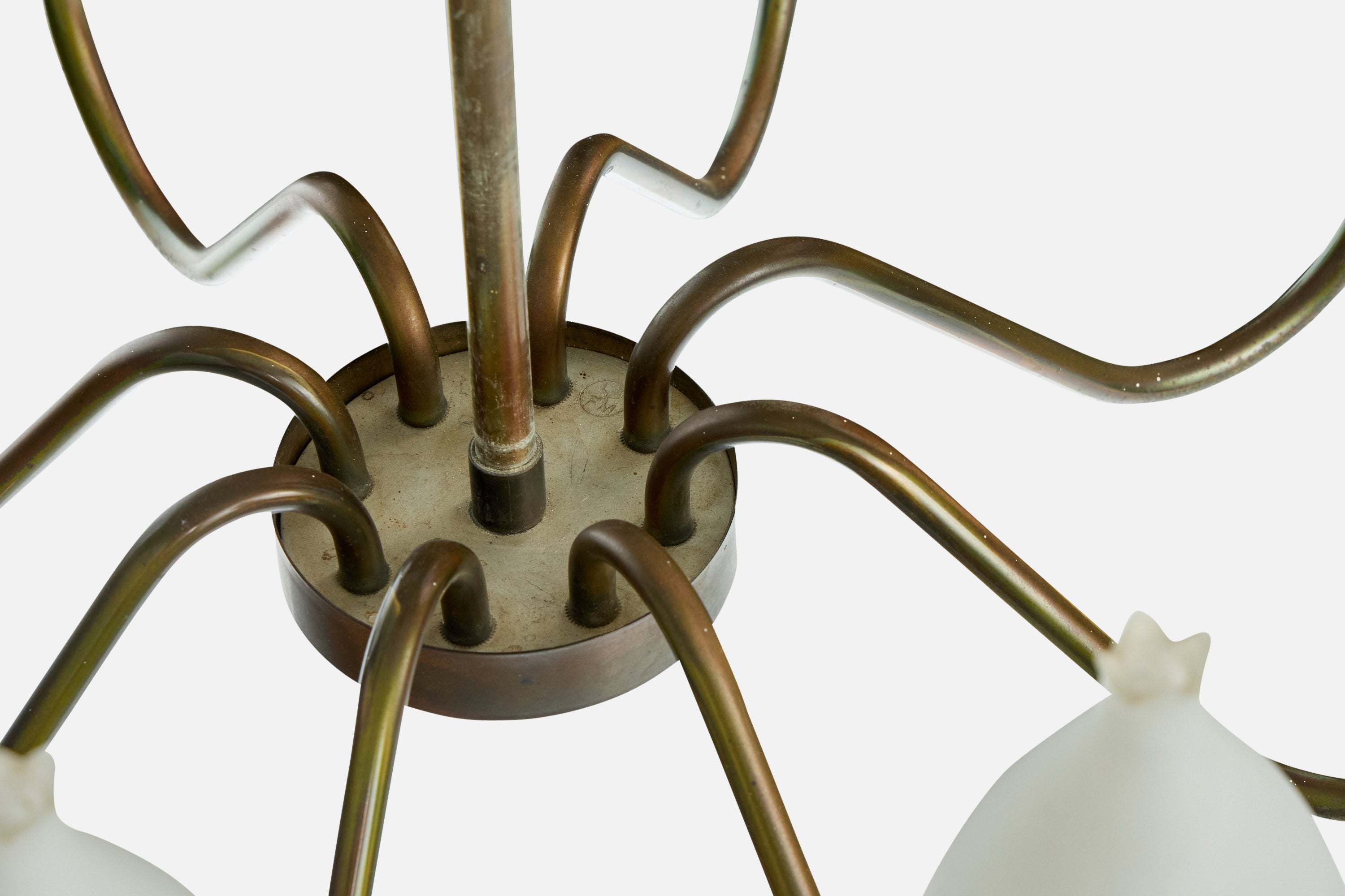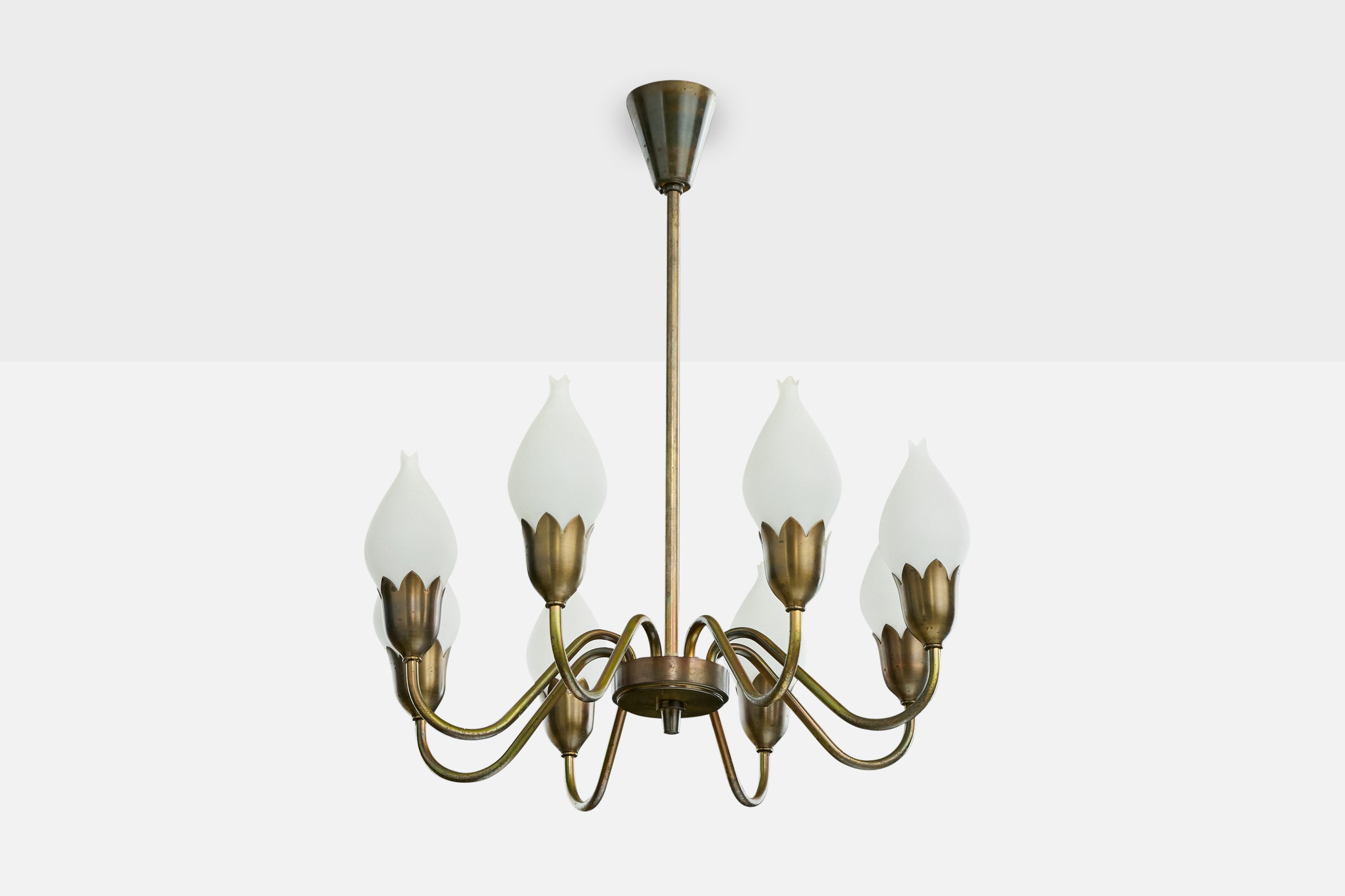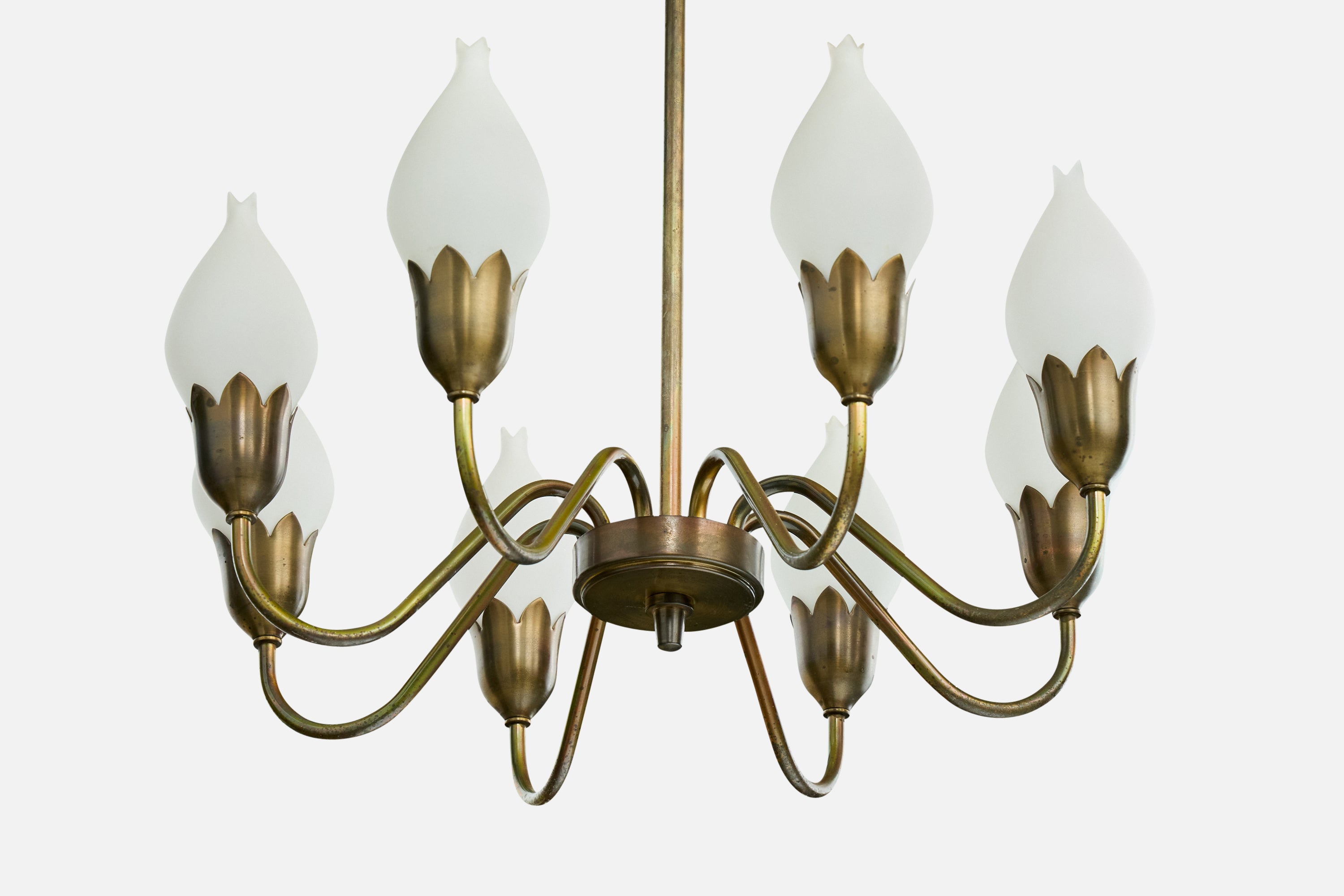 A brass and white opaline glass chandelier produced by Fog & Mørup, Denmark, c. 1950s.