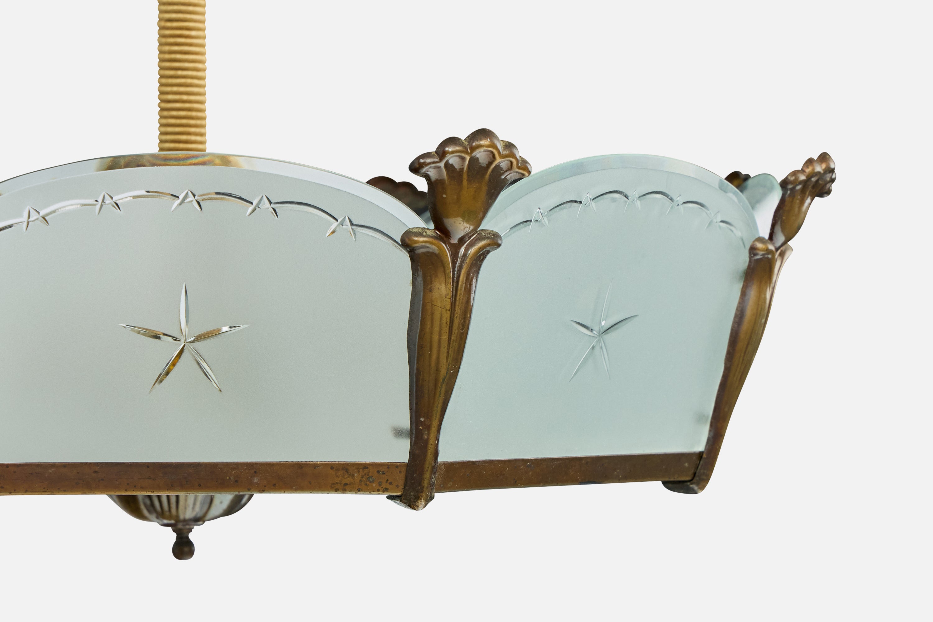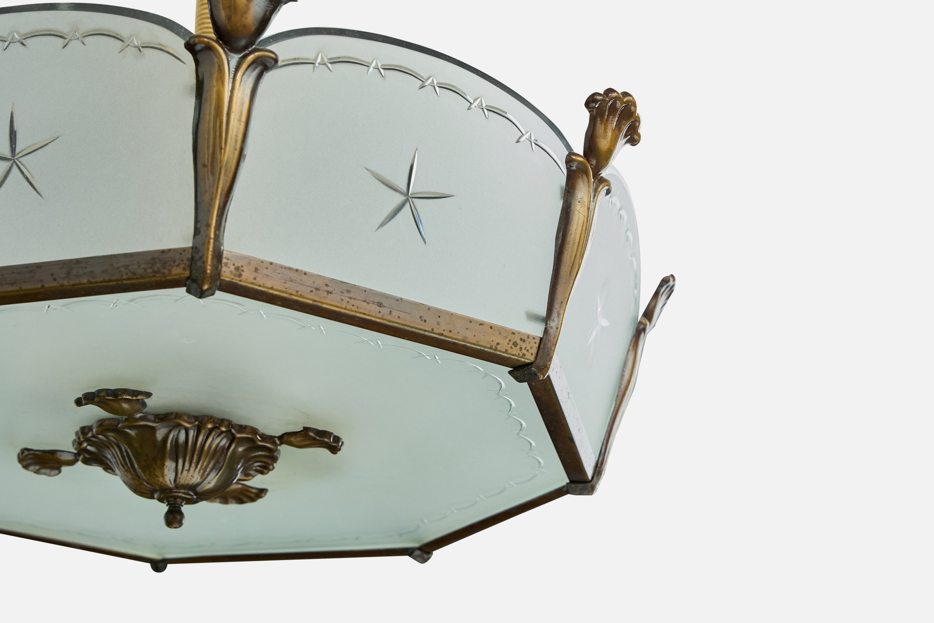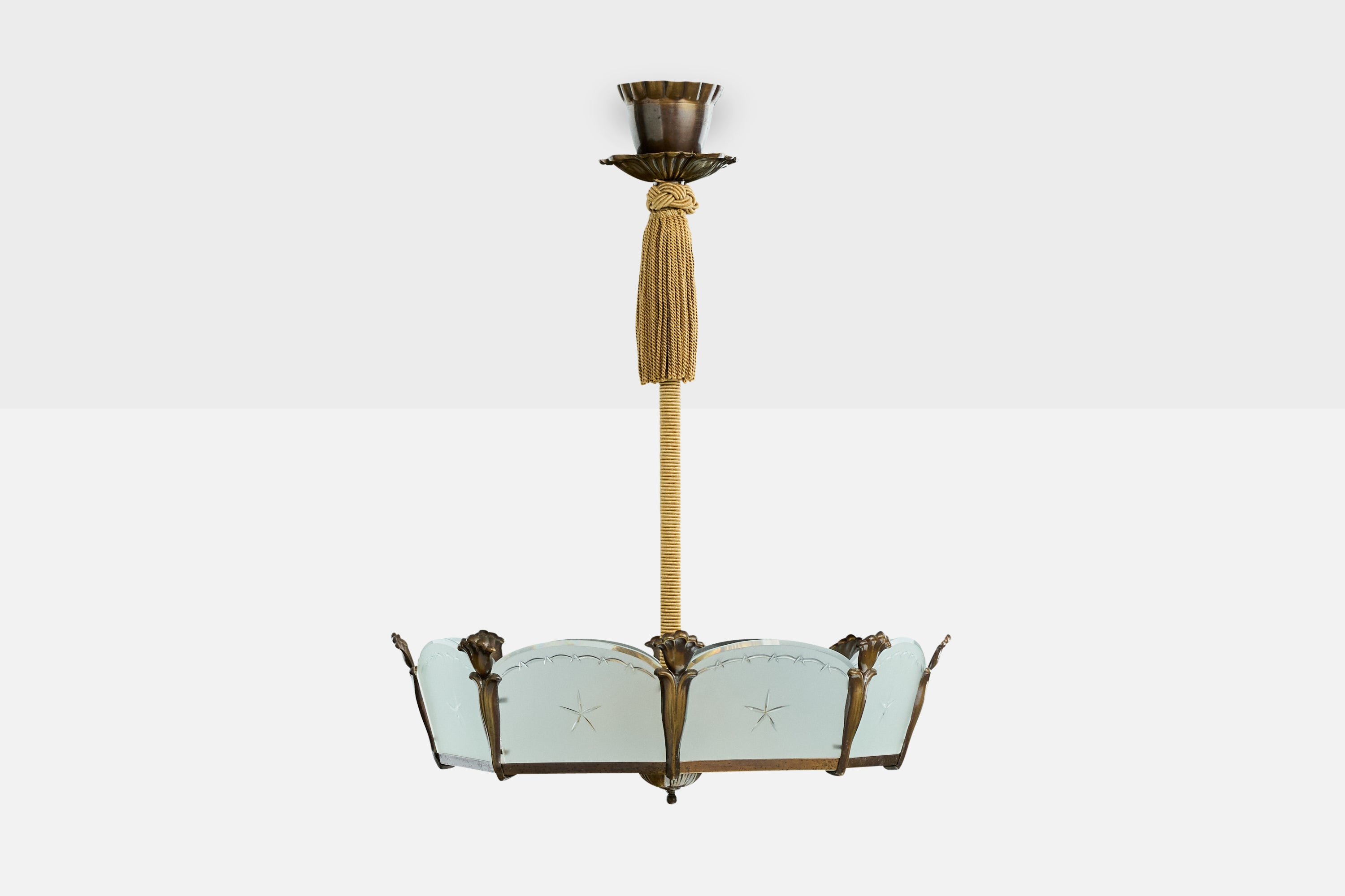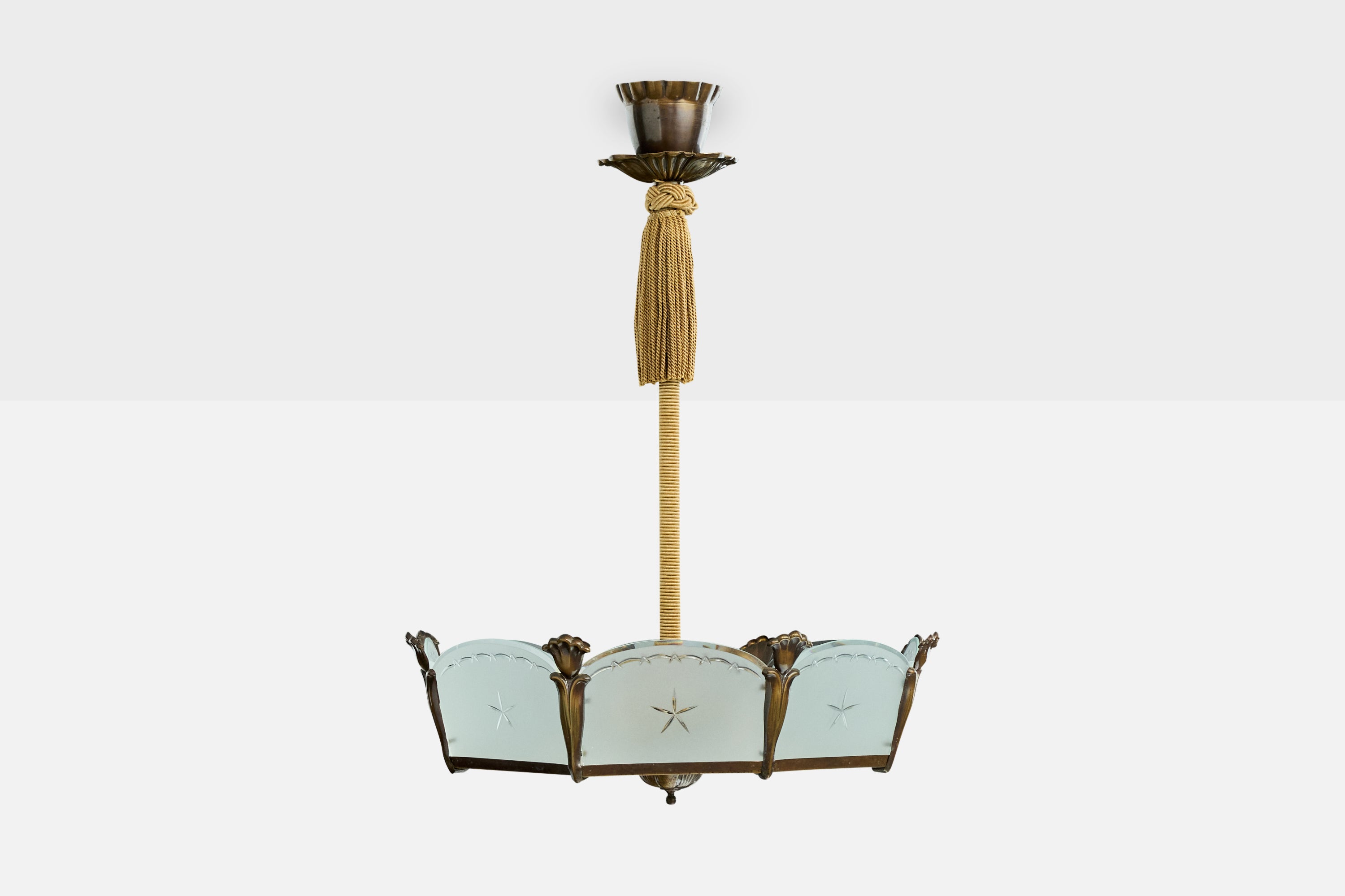 A brass, cord, and etched glass pendant produced by Elektriska AB Chr Bergh & Co, Sweden, c. 1930s.