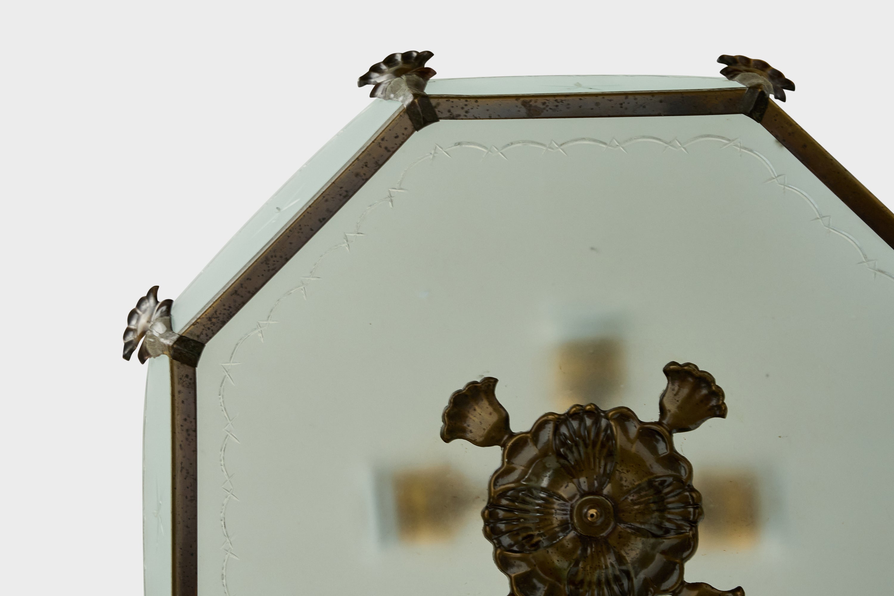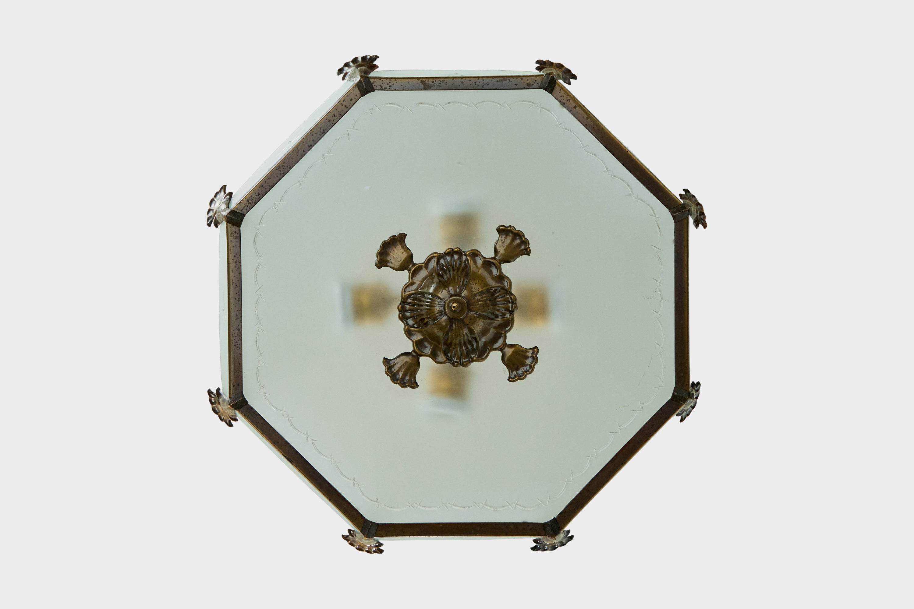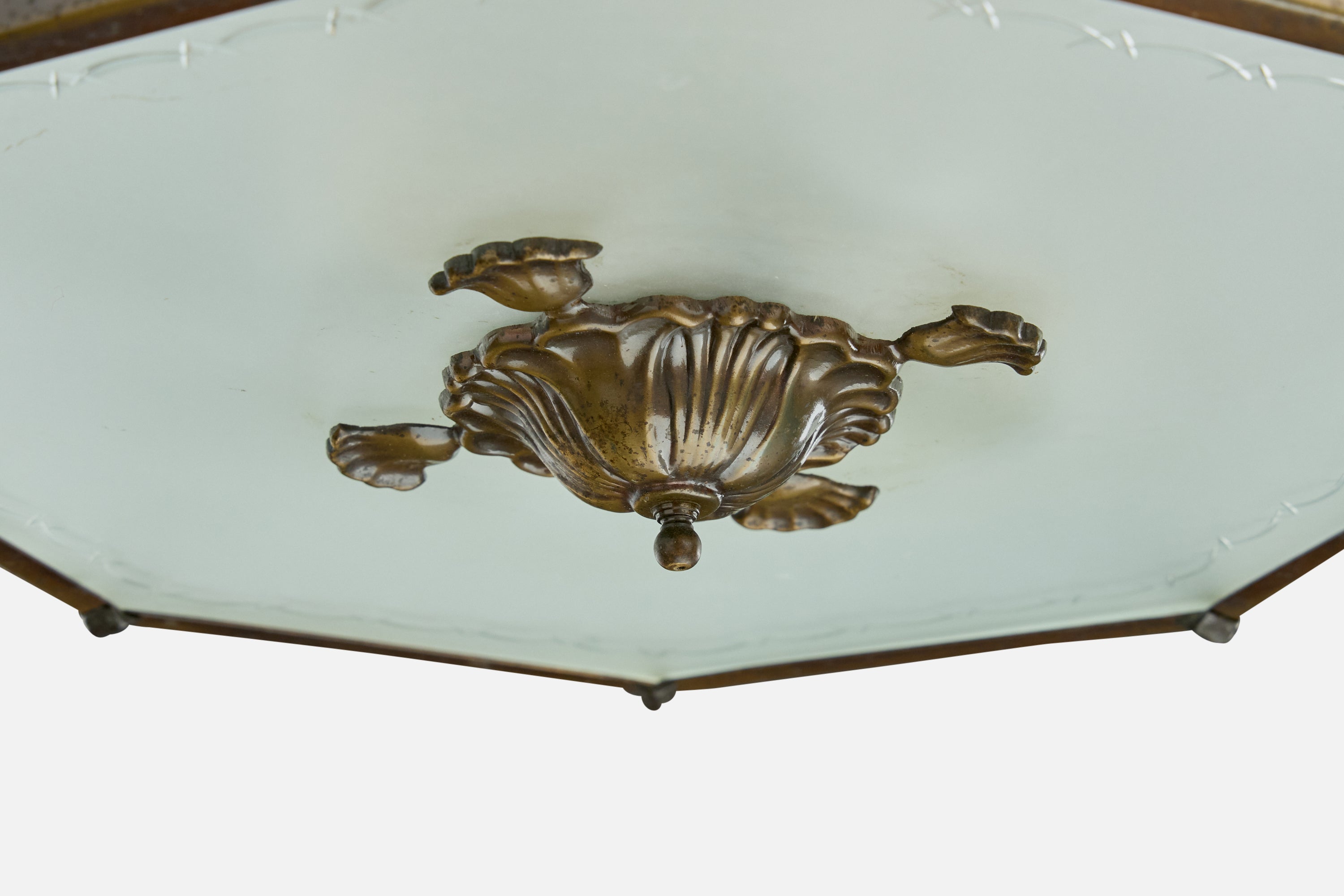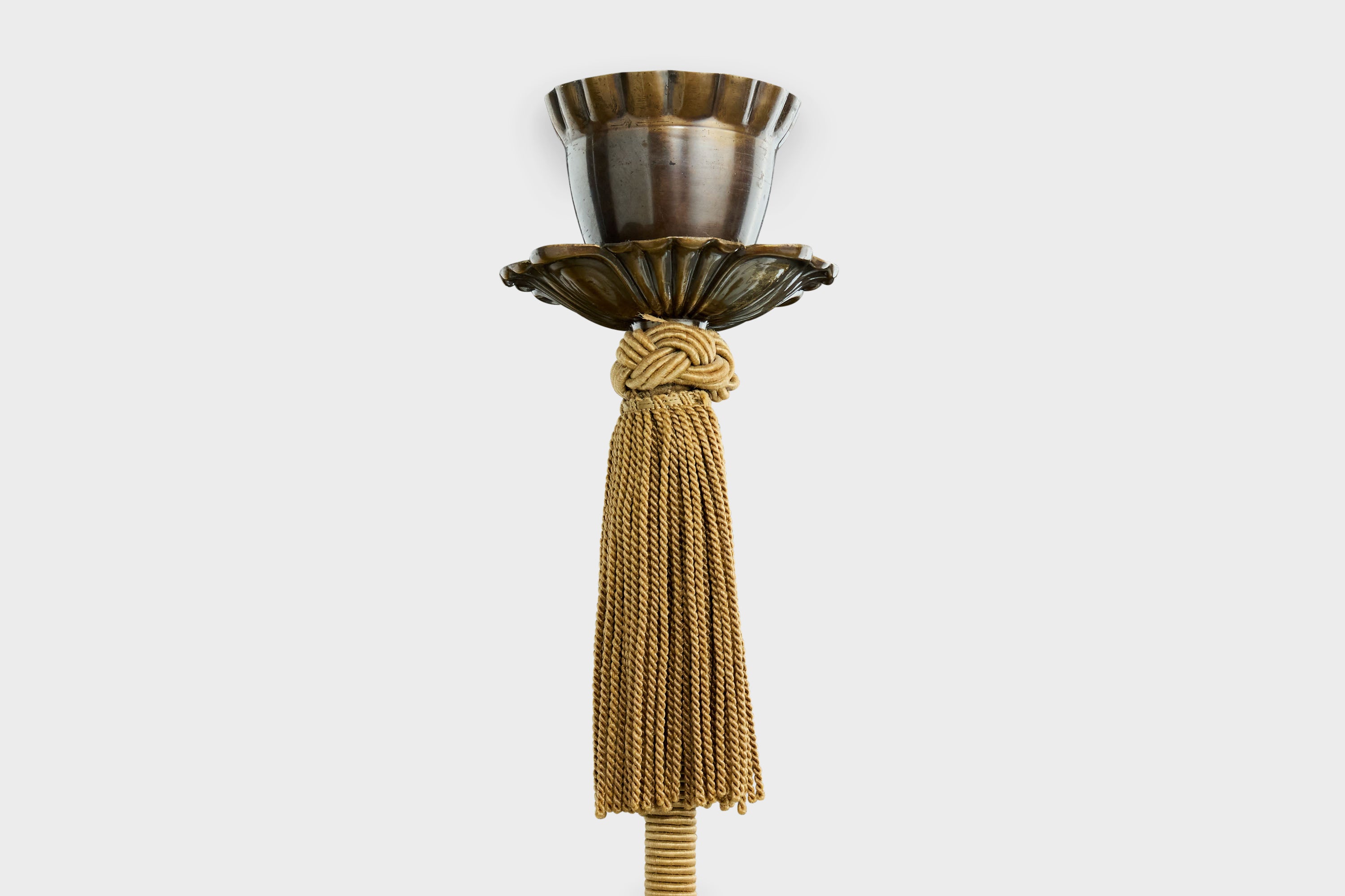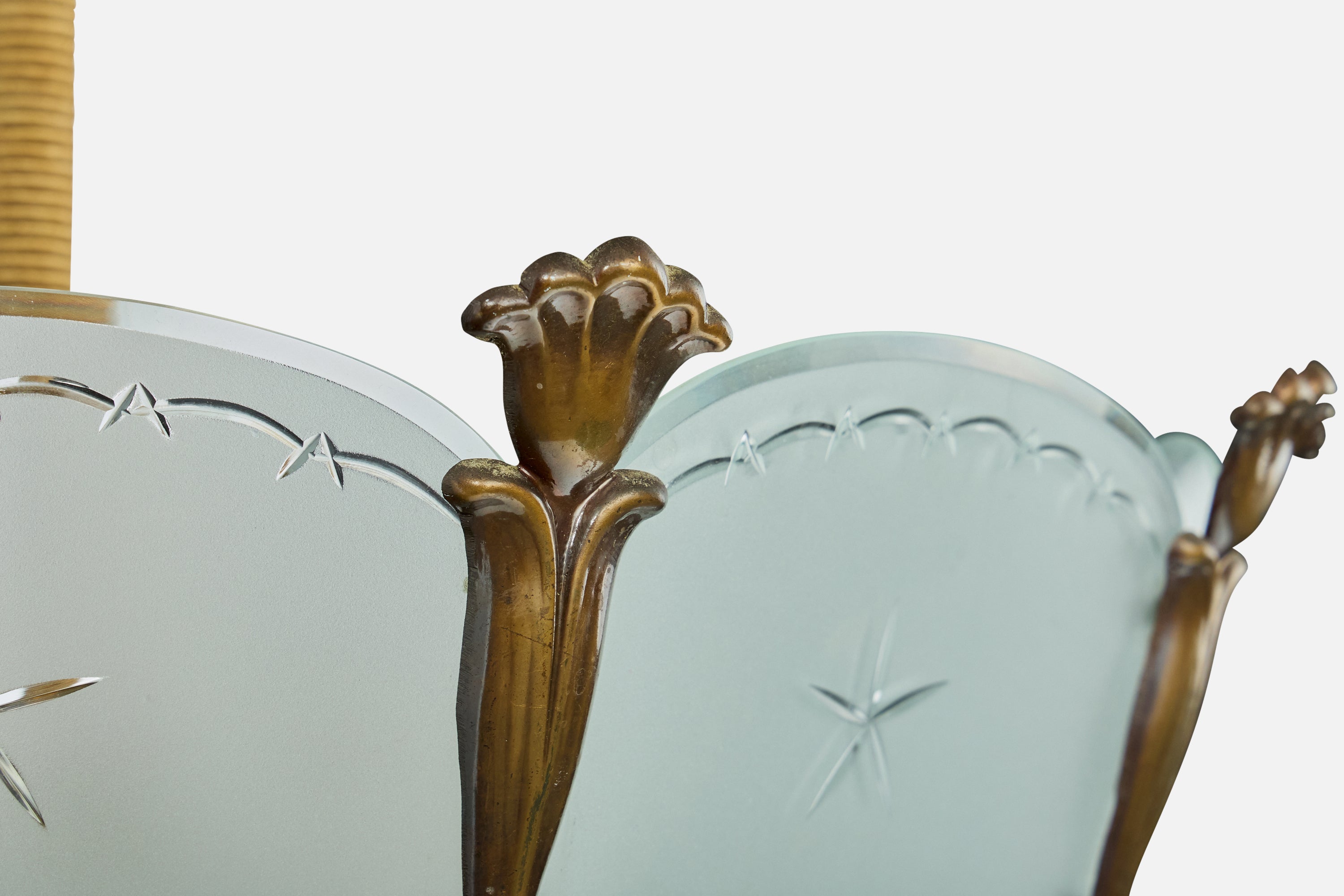 A brass, cord, and etched glass pendant produced by Elektriska AB Chr Bergh & Co, Sweden, c. 1930s.