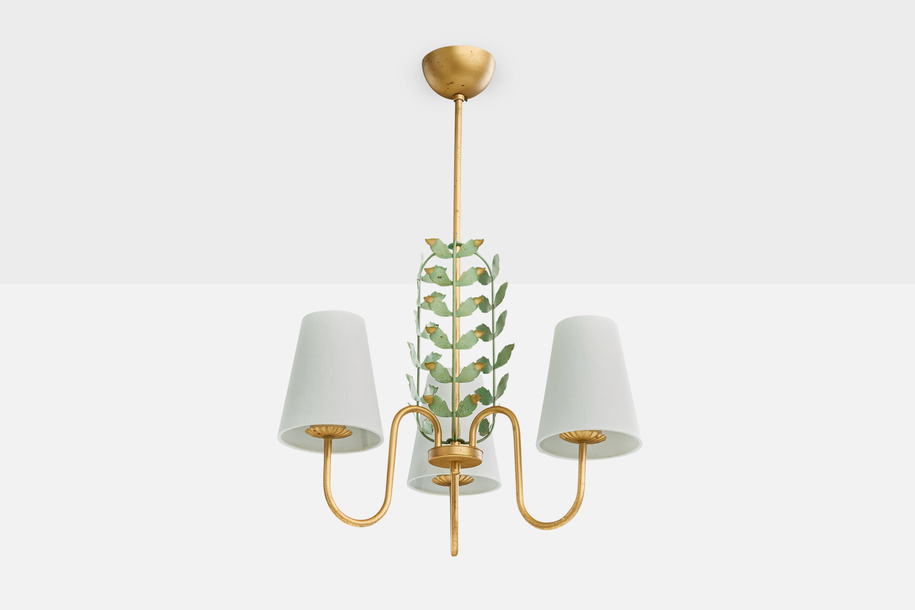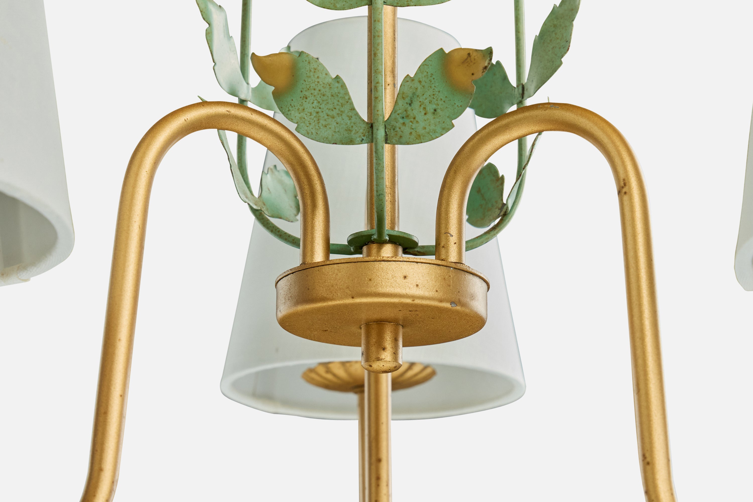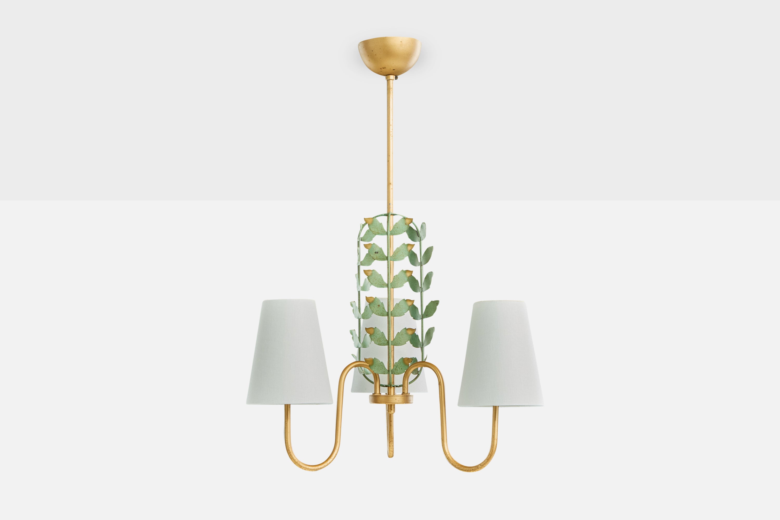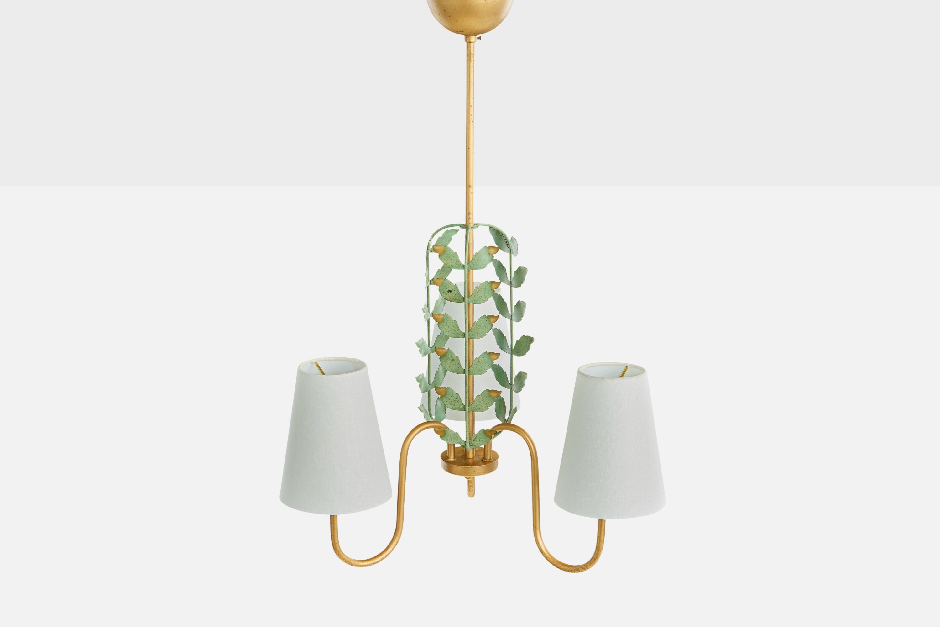 A green, gold-painted metal and white fabric chandelier designed and produced in Sweden, c. 1950s.