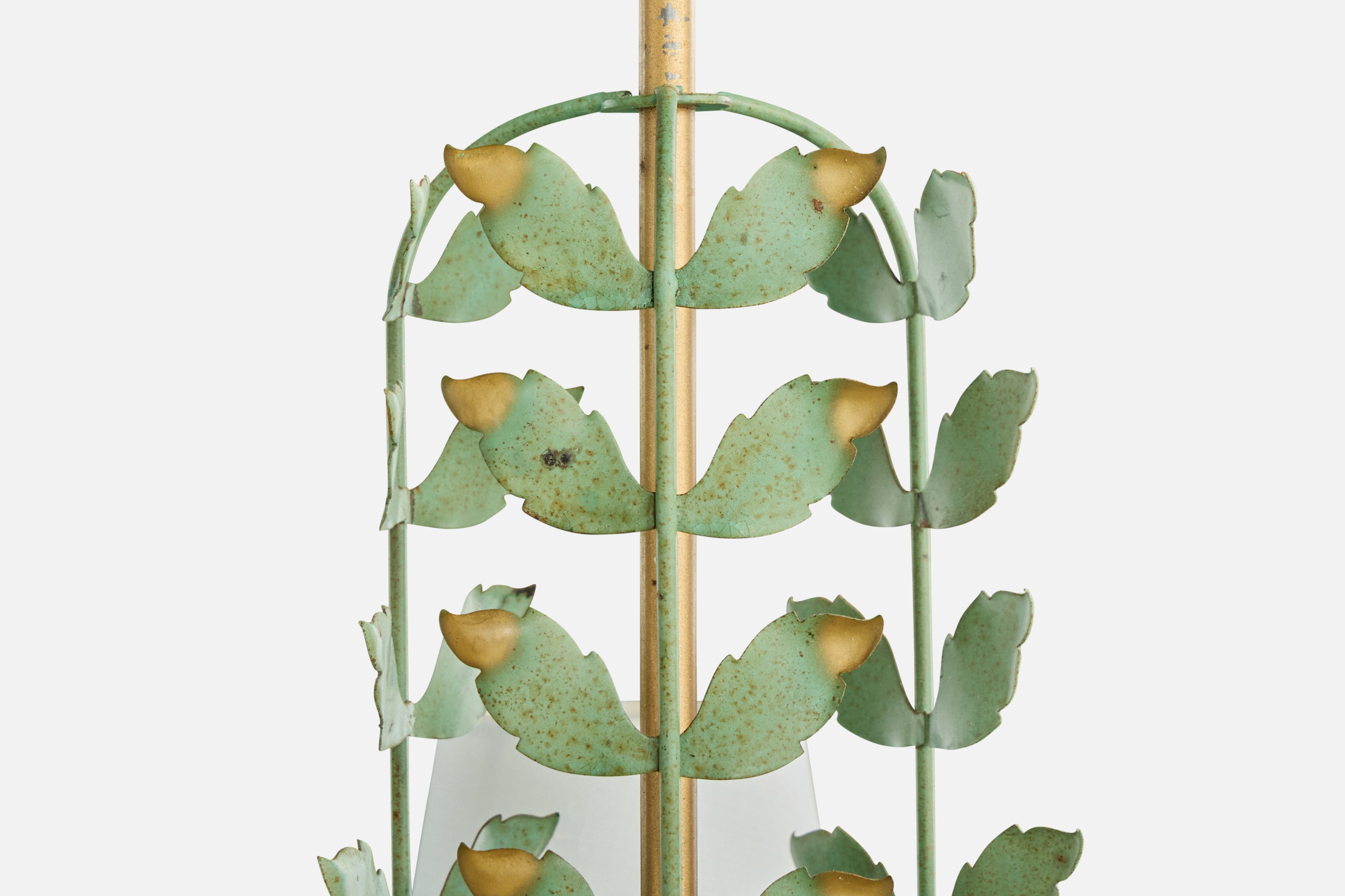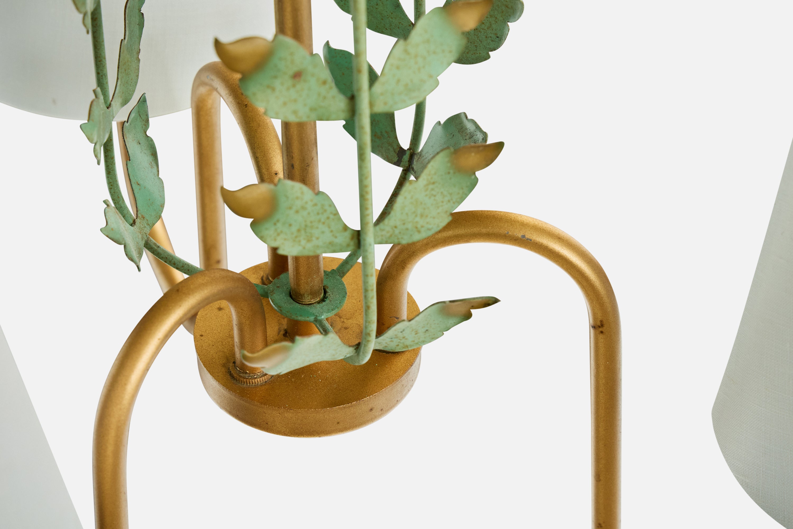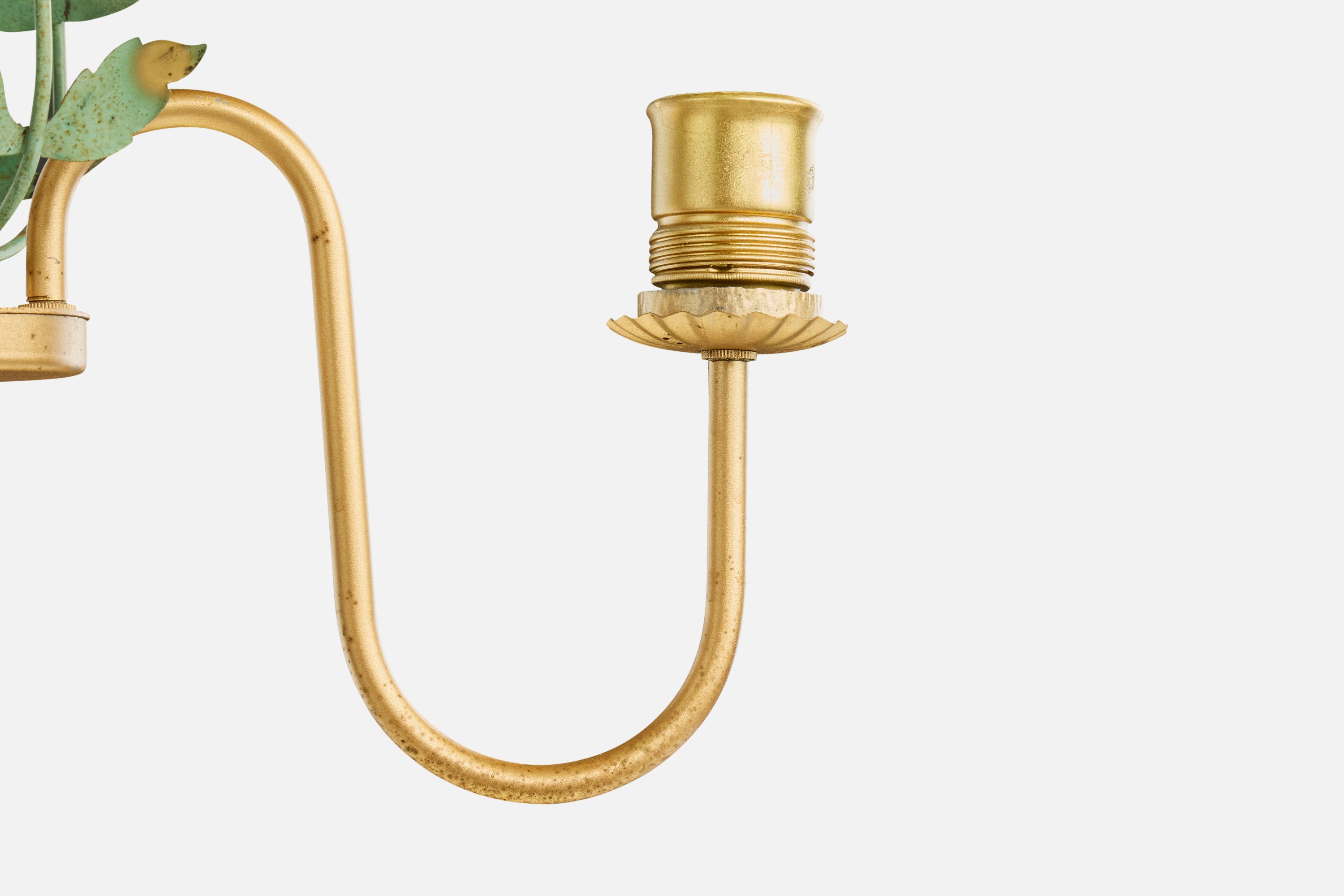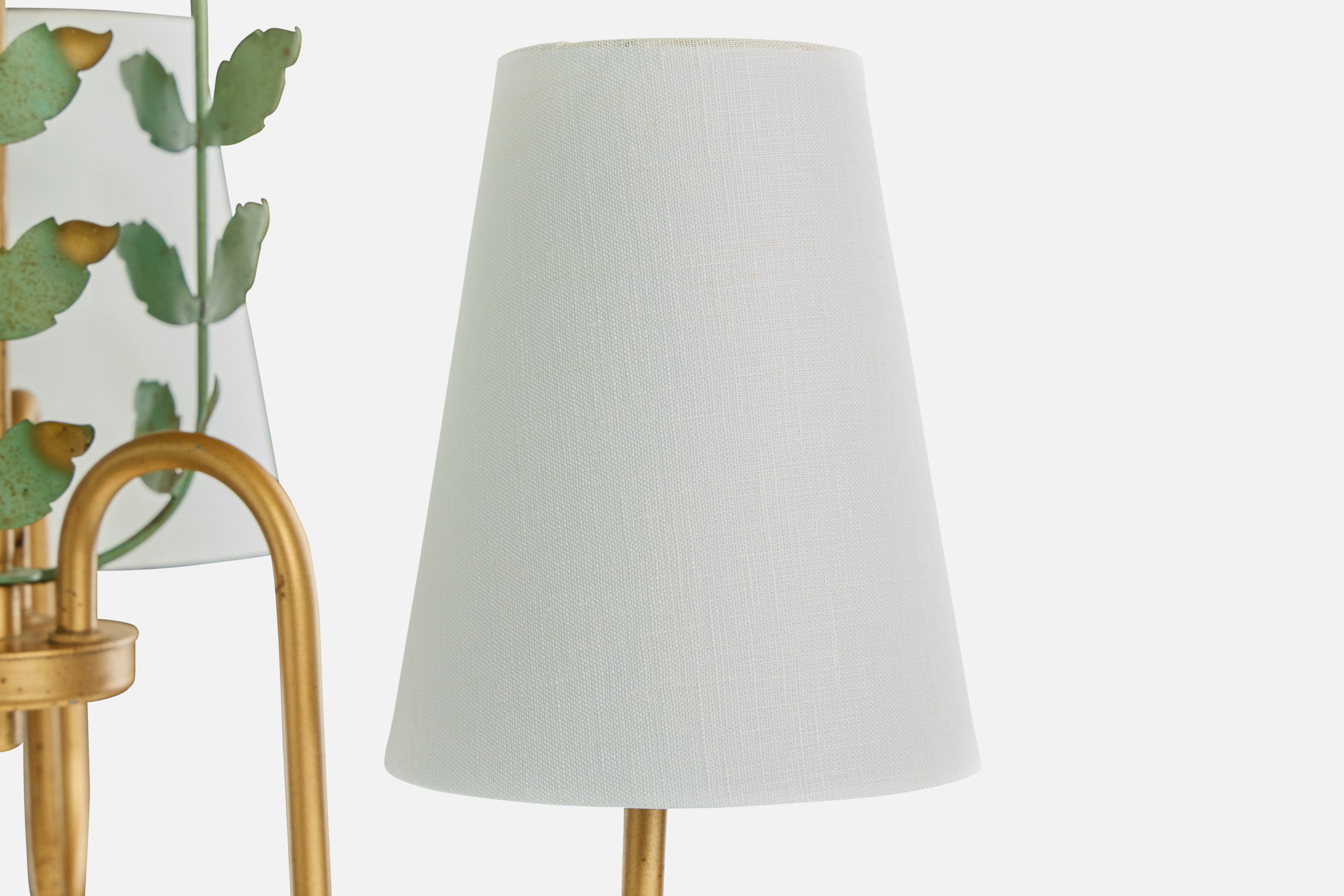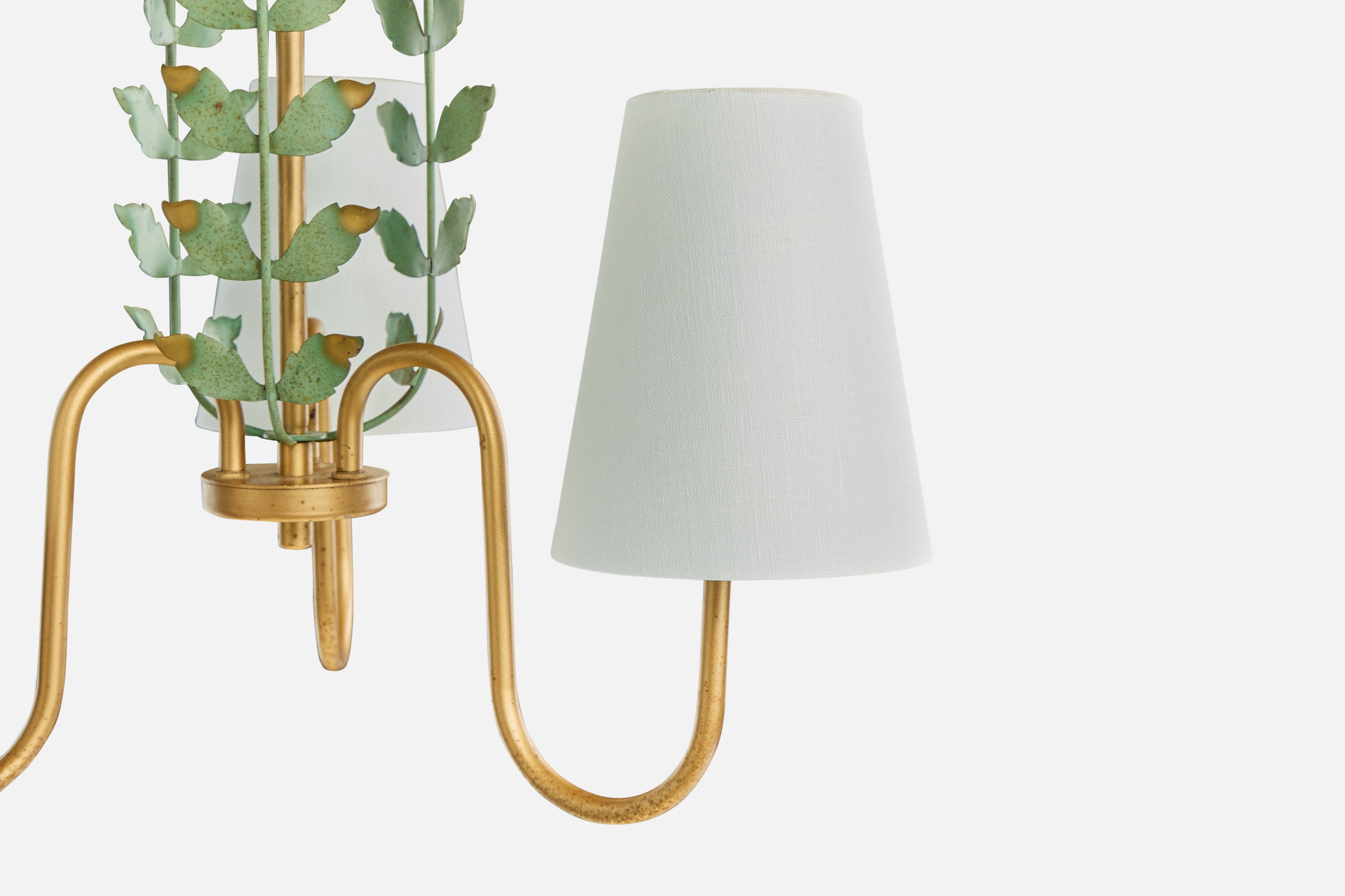 A green, gold-painted metal and white fabric chandelier designed and produced in Sweden, c. 1950s.