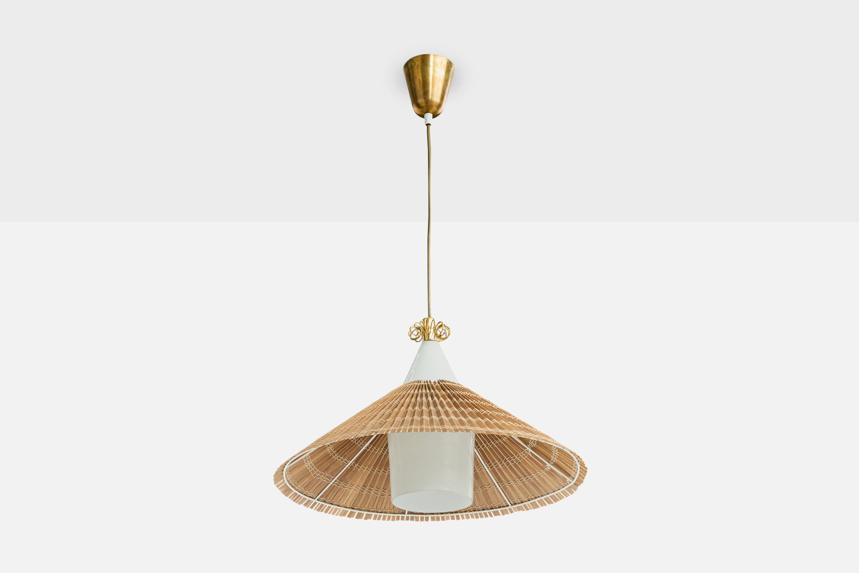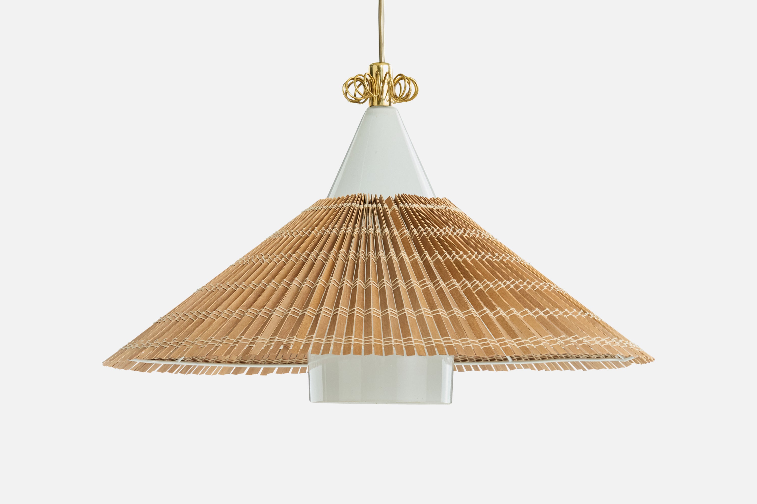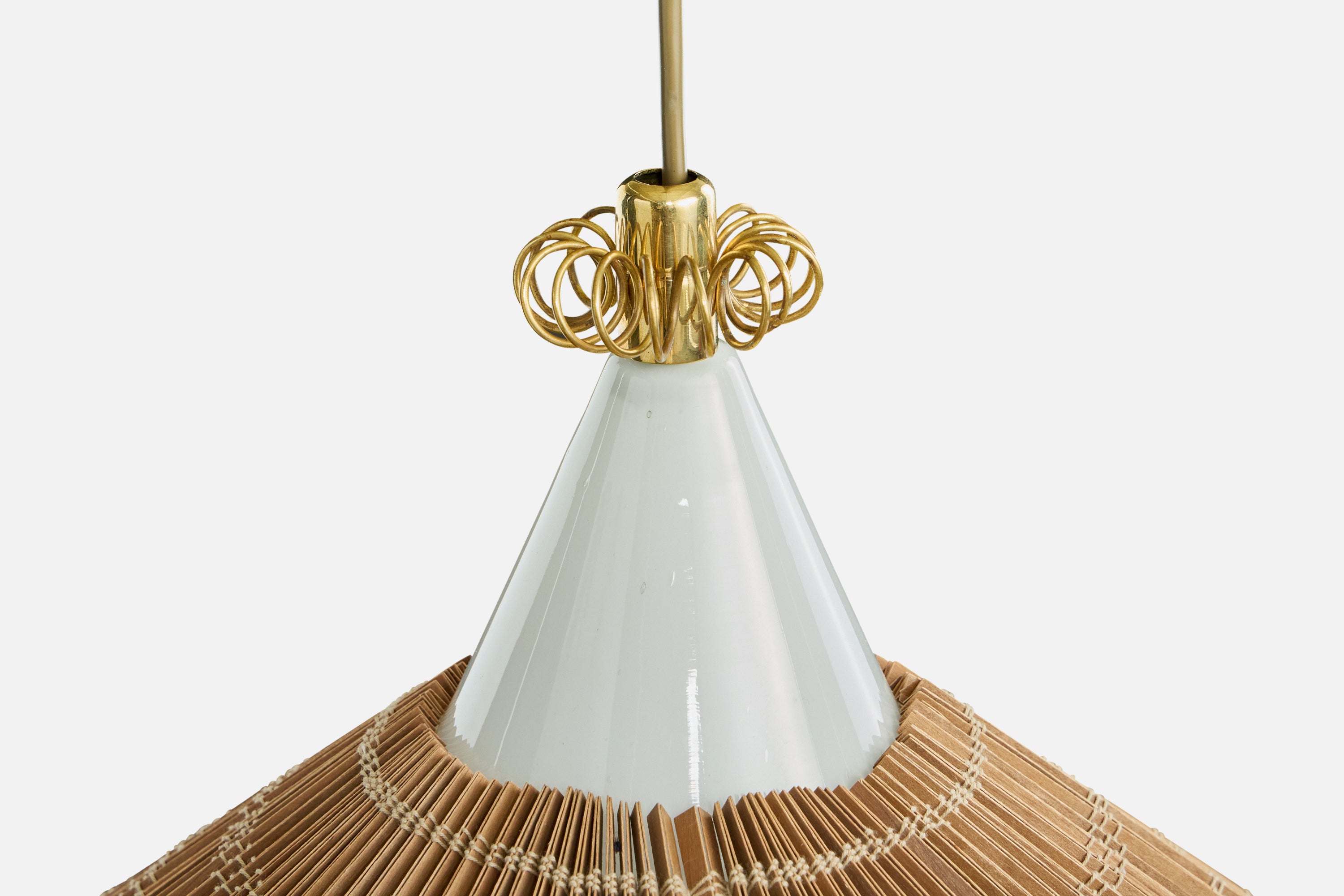 A brass, white opaline glass and reed pendant light produced by Idman, Finland, c. 1960.