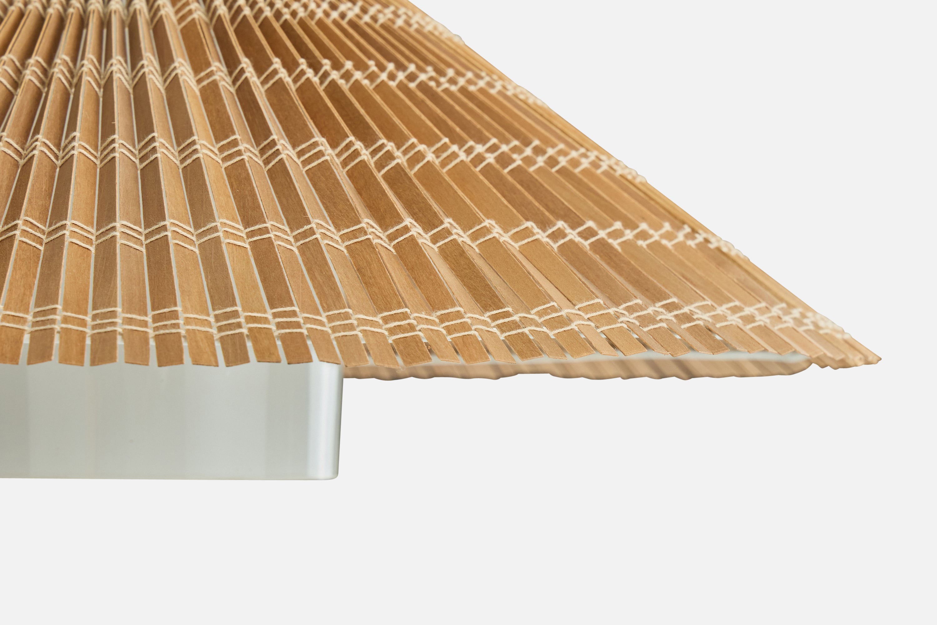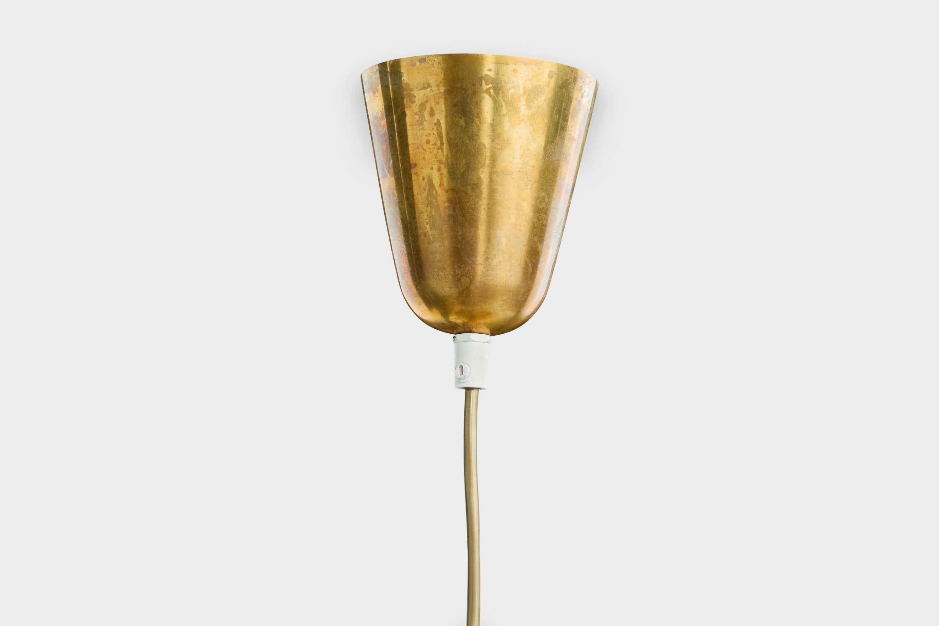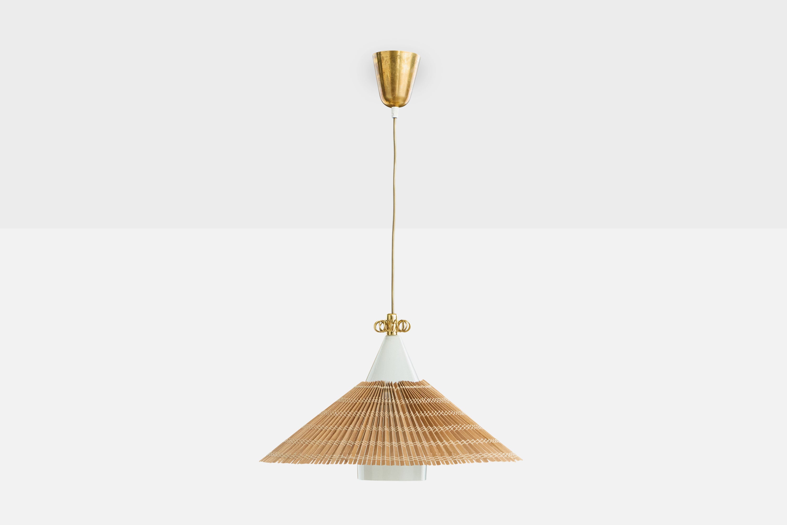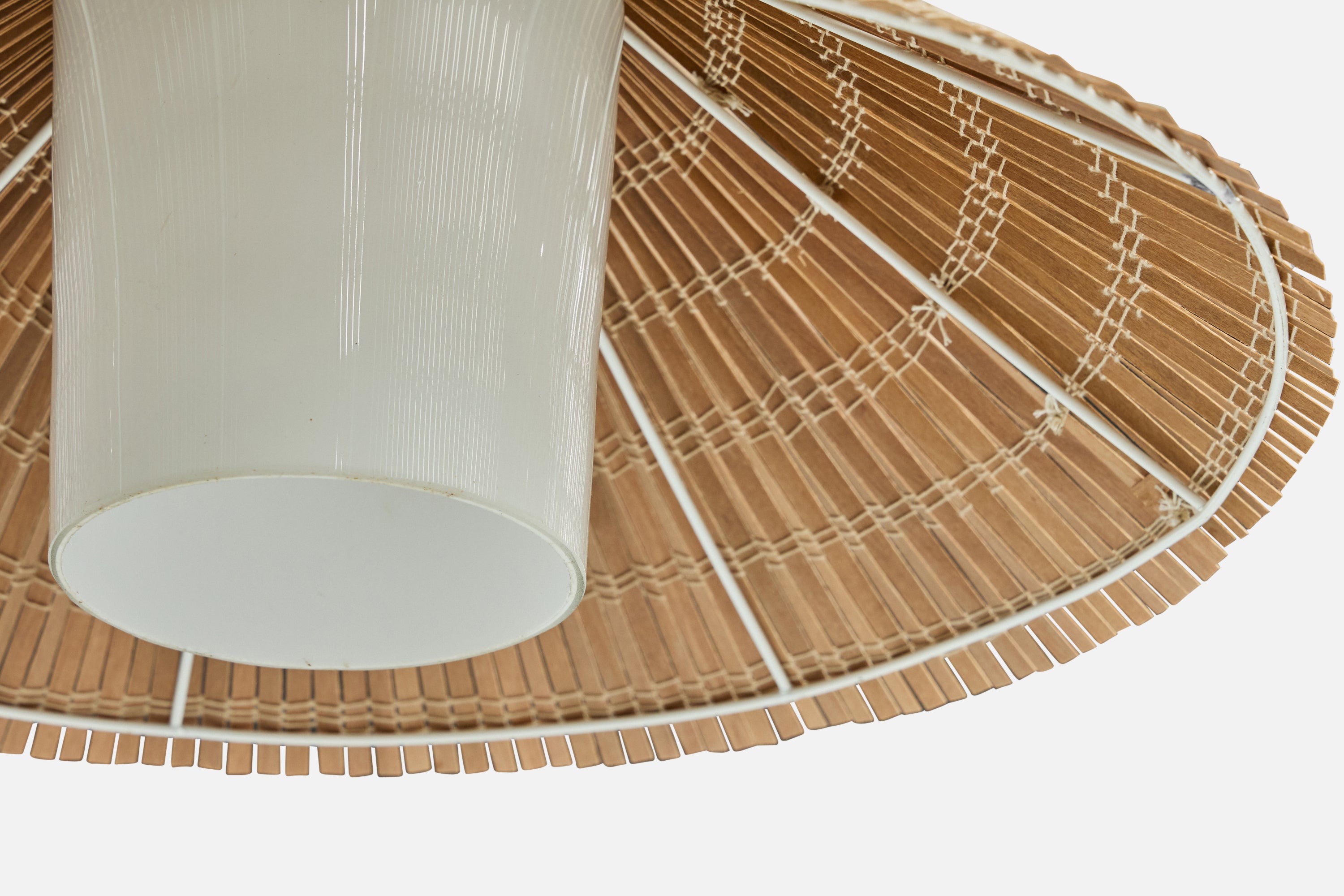 A brass, white opaline glass and reed pendant light produced by Idman, Finland, c. 1960.