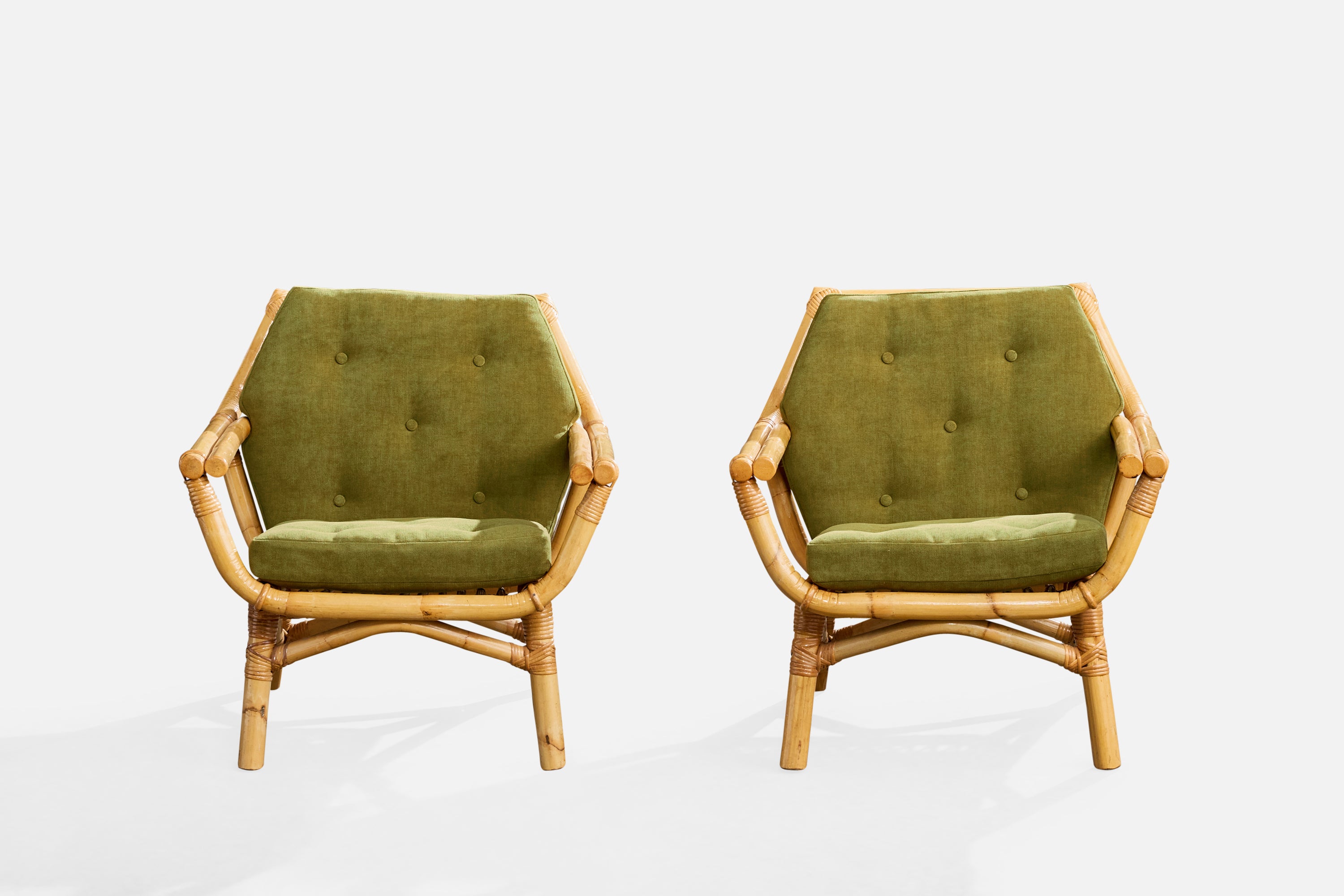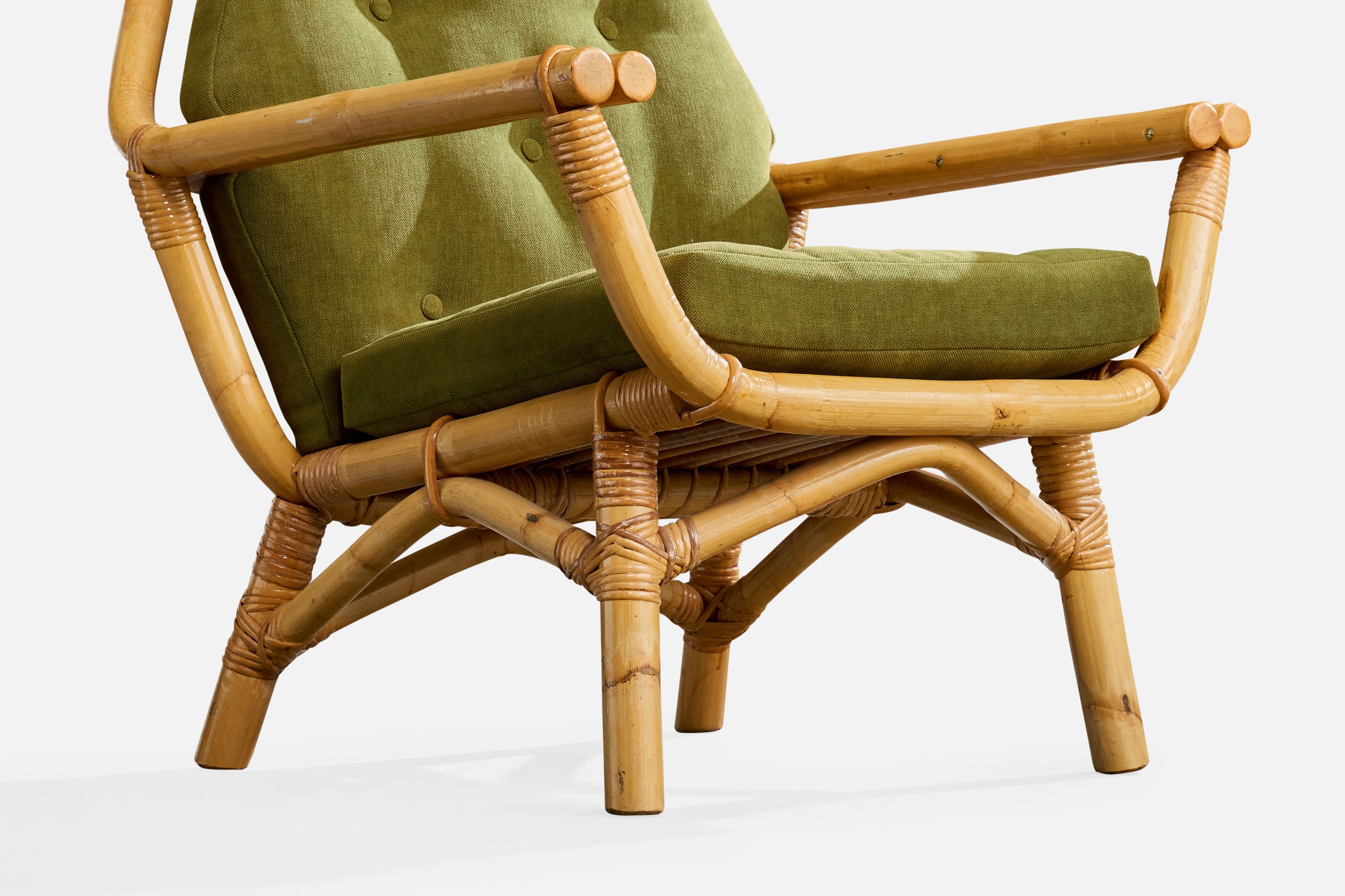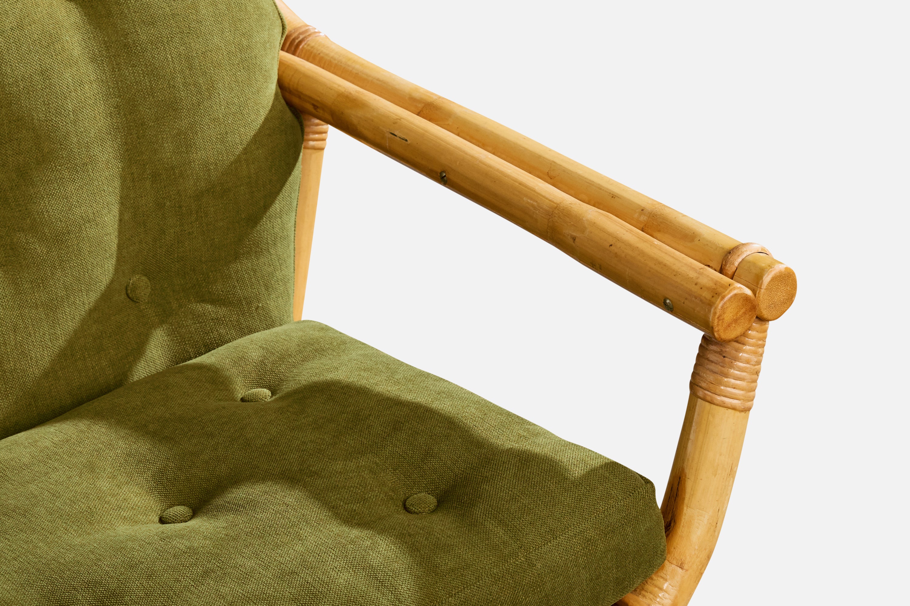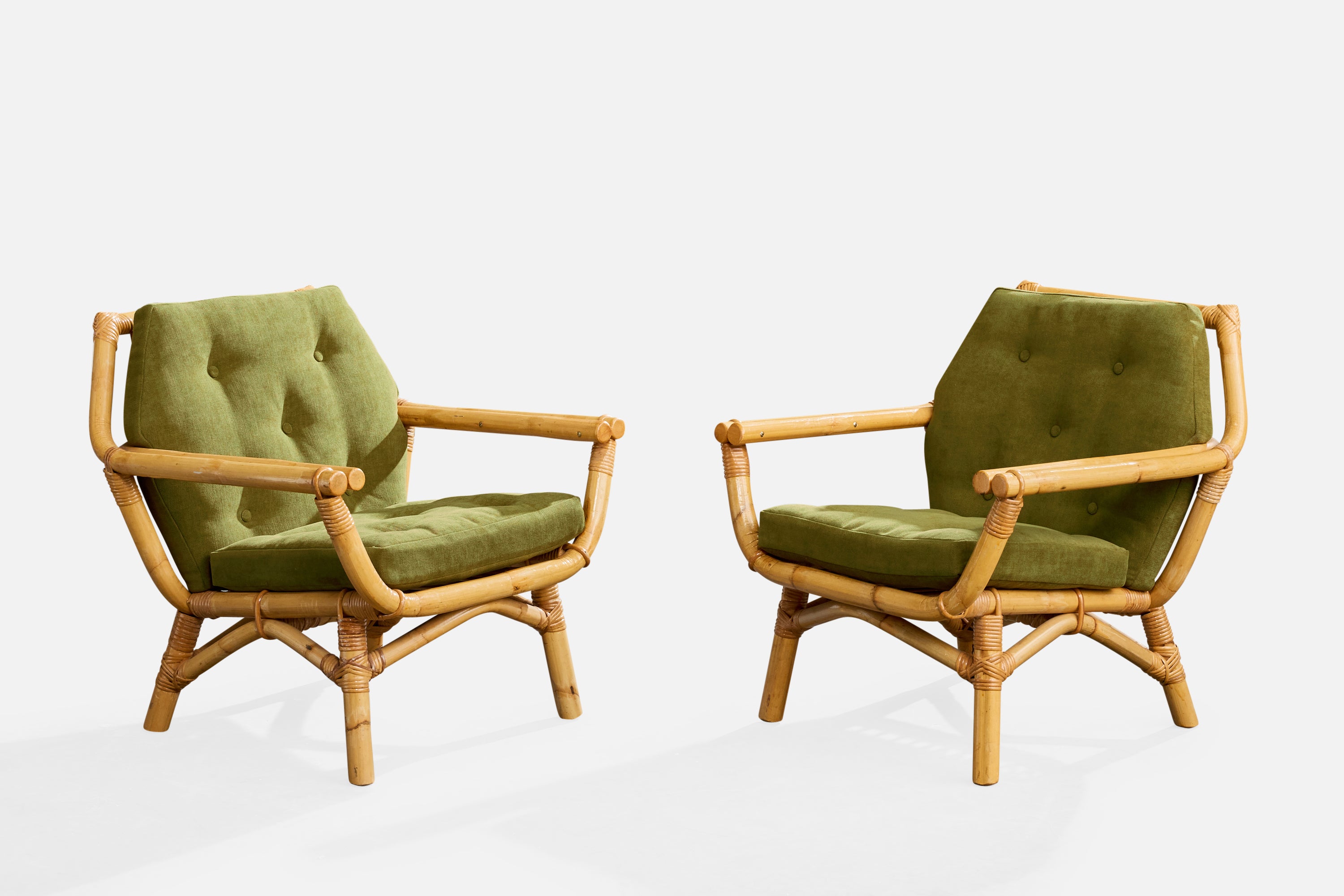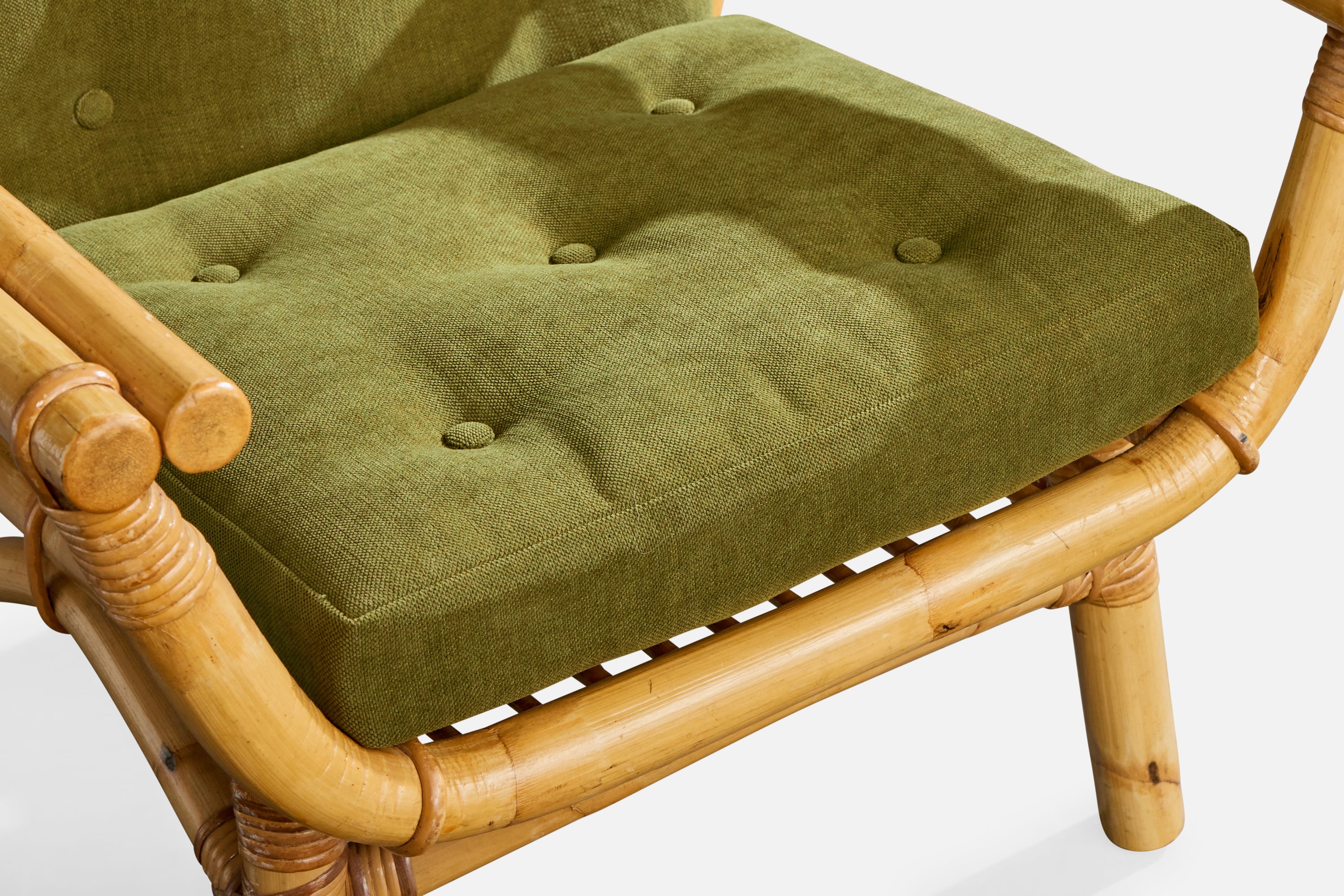 A pair of bamboo, rattan and green fabric lounge chairs likely designed and produced in Sweden, c. 1950s.
