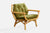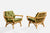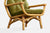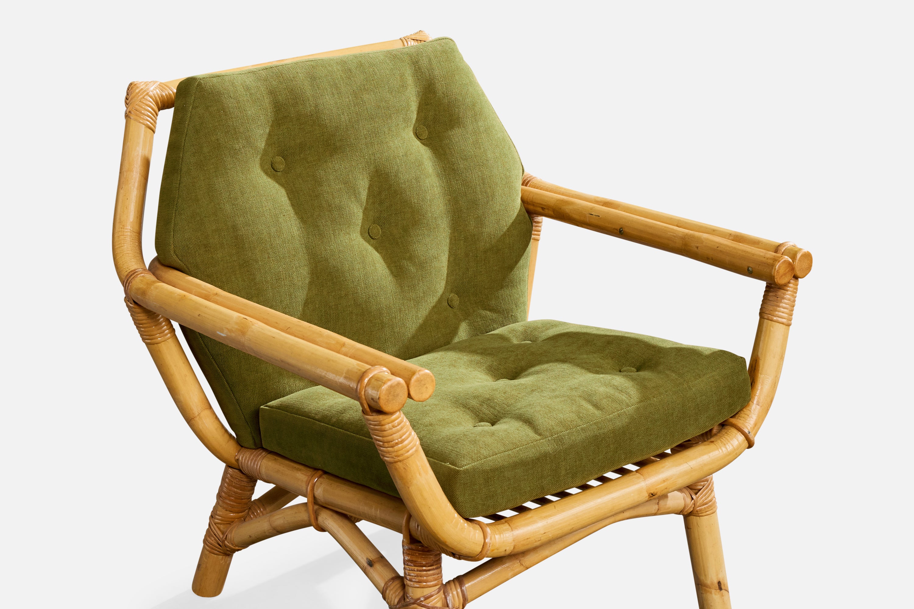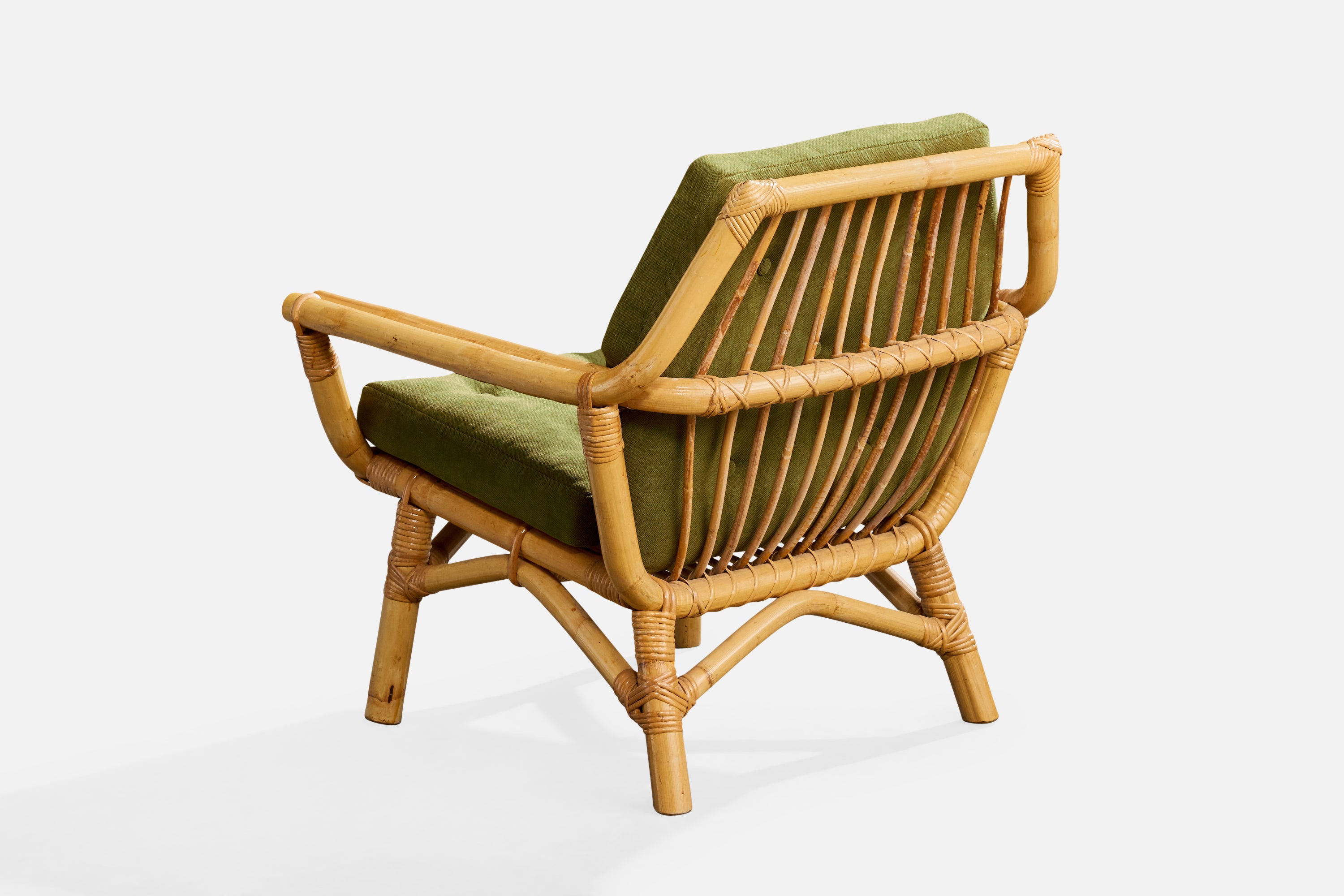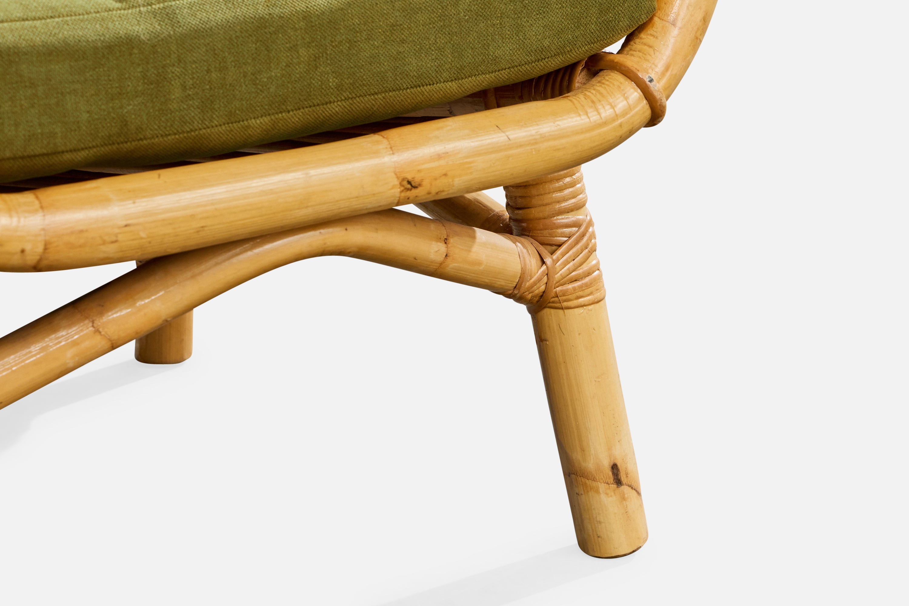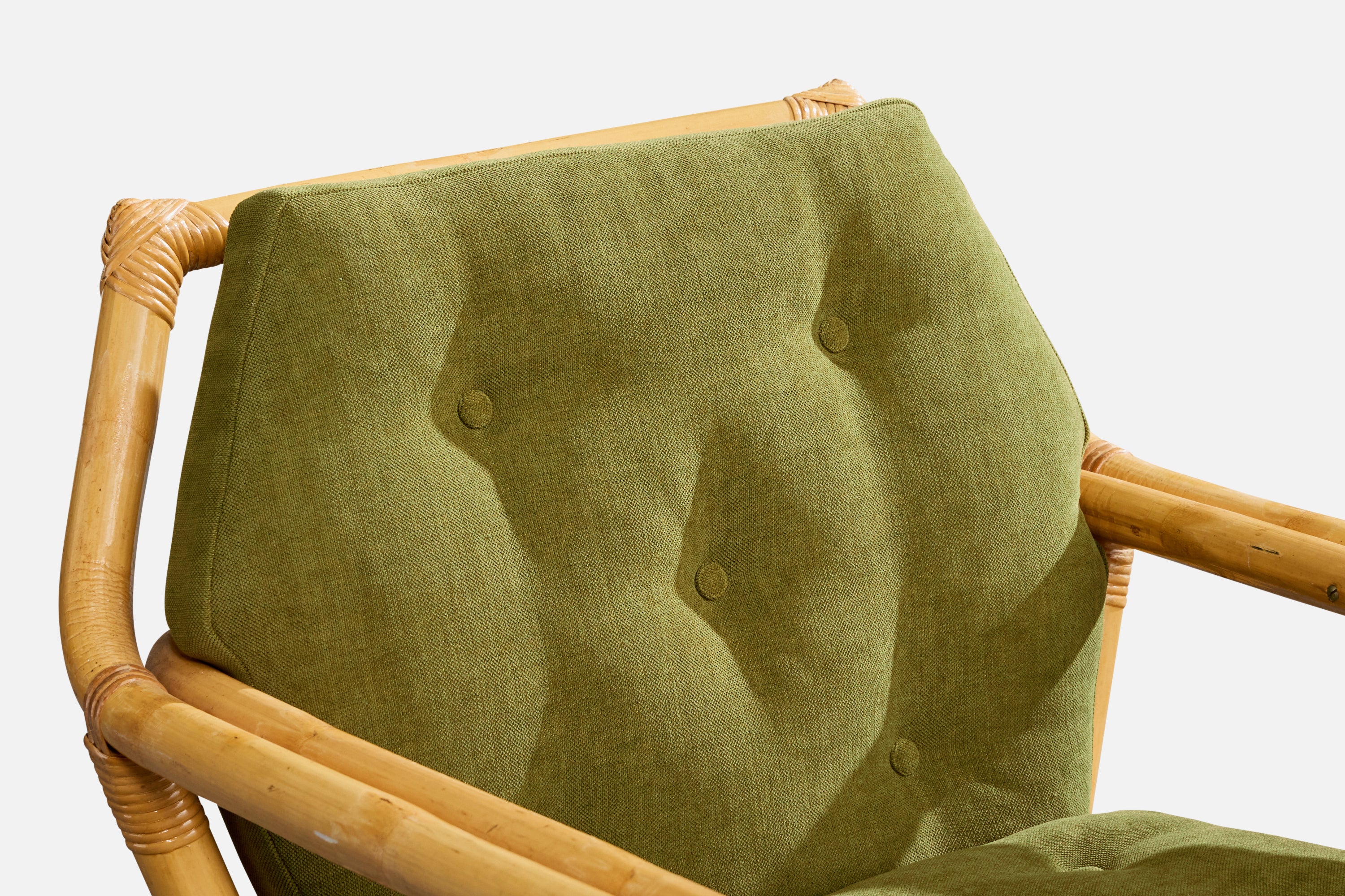 A pair of bamboo, rattan and green fabric lounge chairs likely designed and produced in Sweden, c. 1950s.