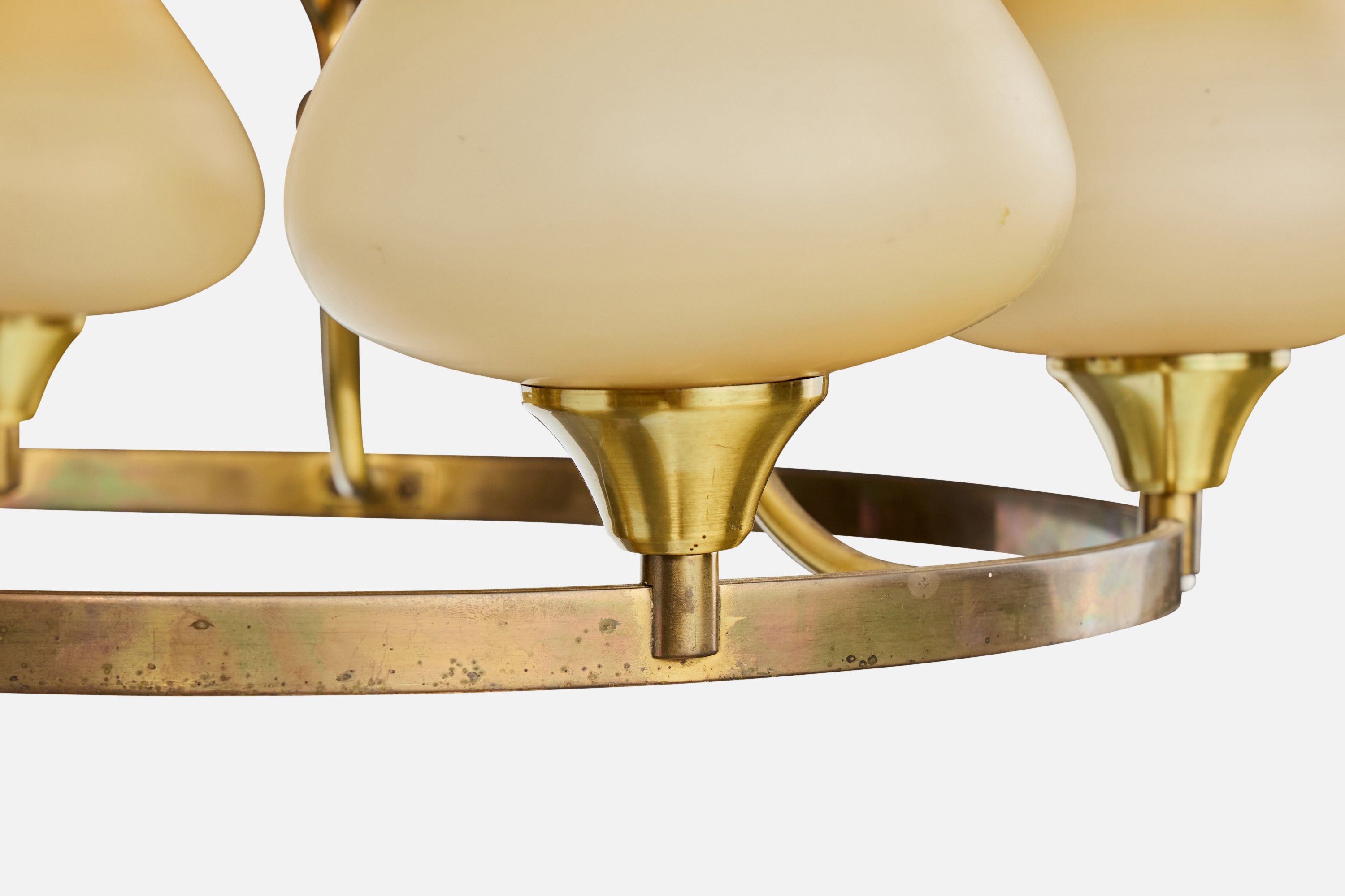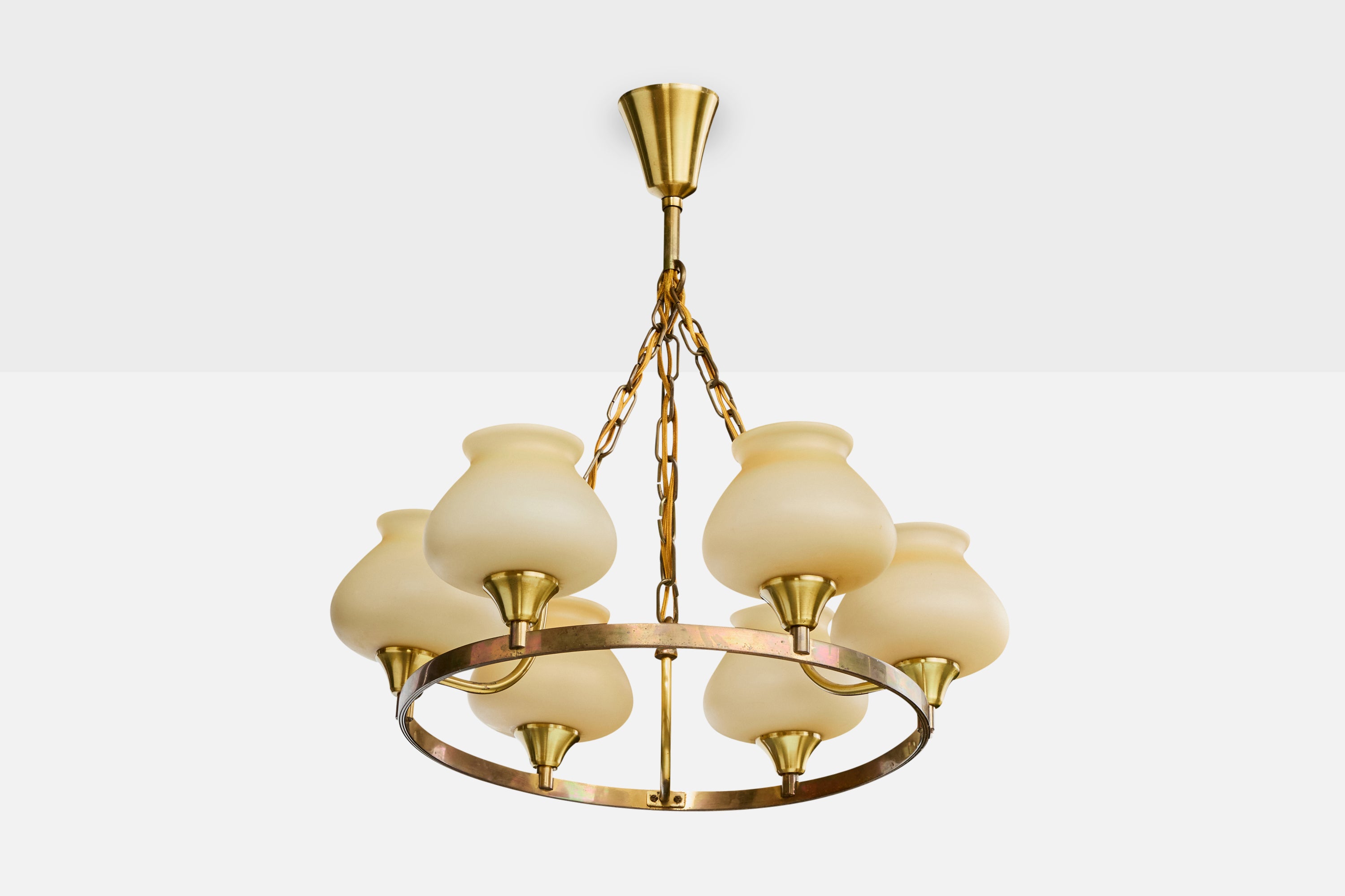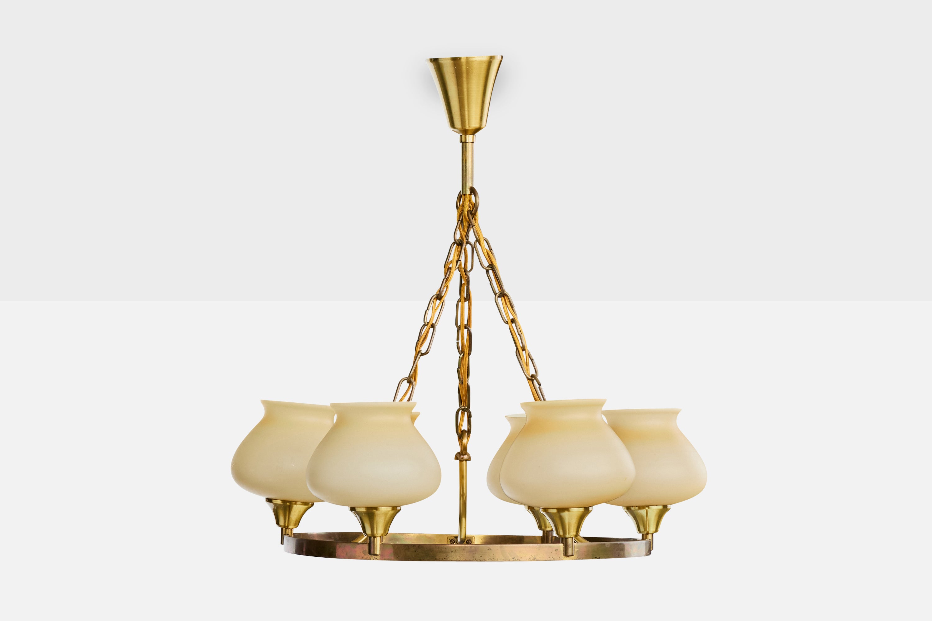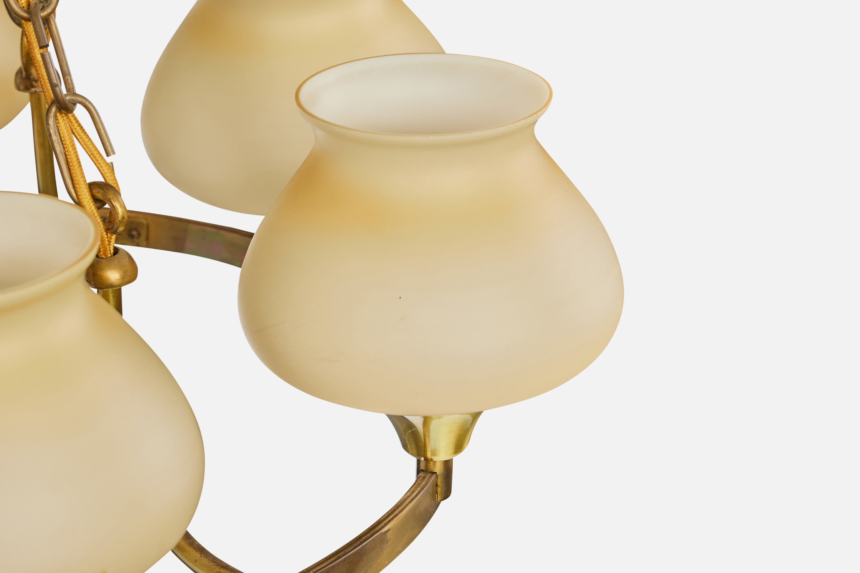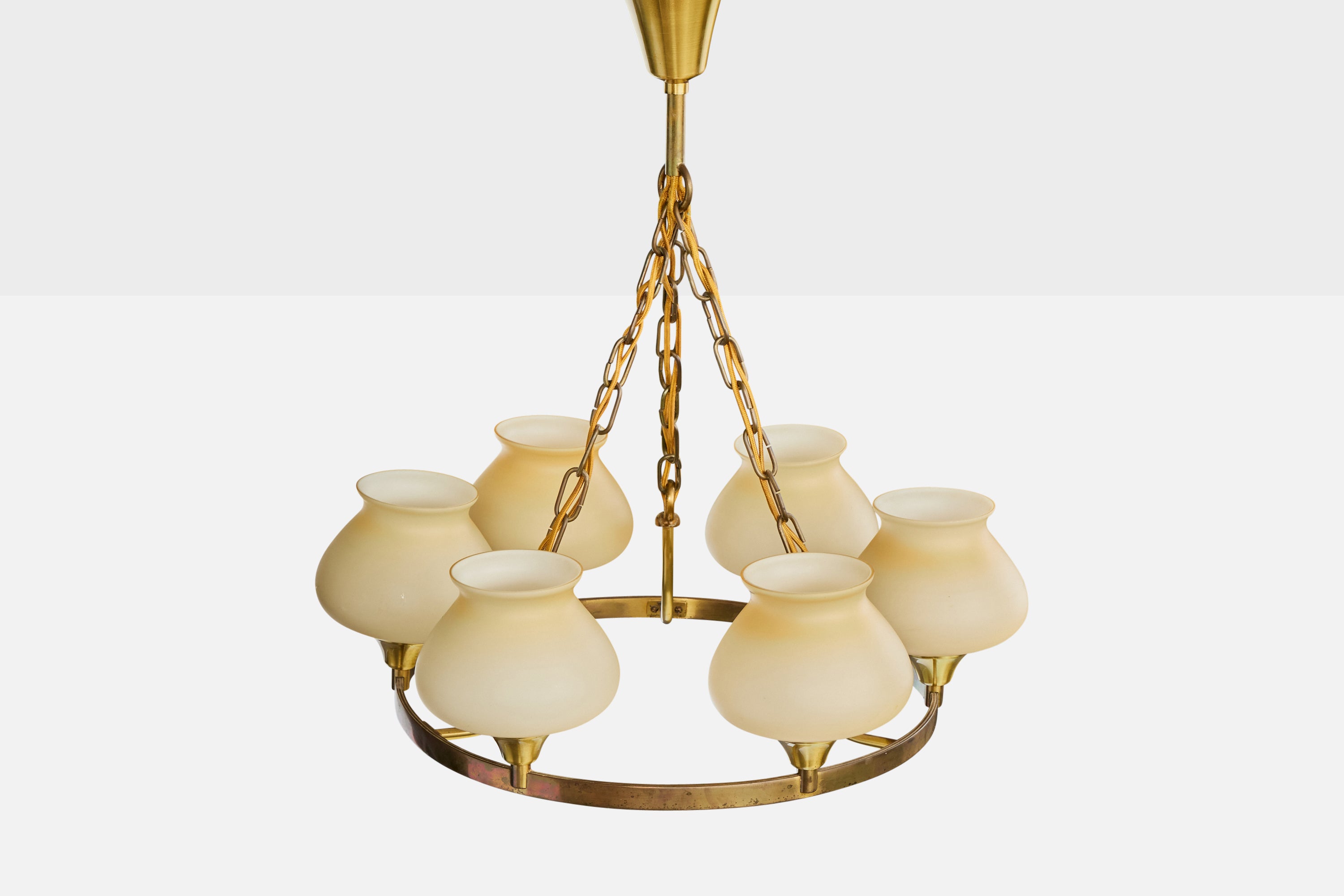 A brass and beige opaline glass chandelier designed and produced in Denmark, c. 1940s.