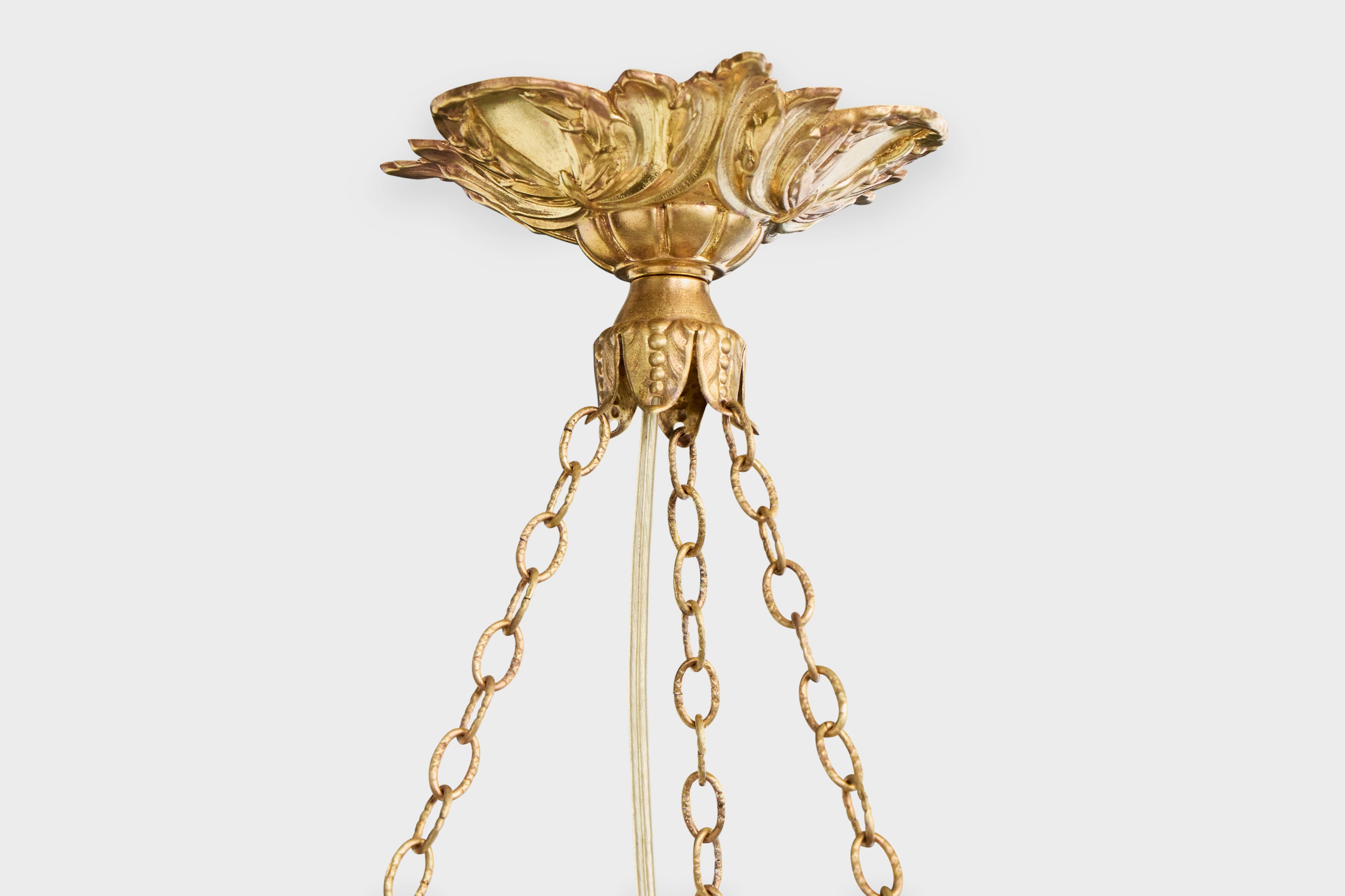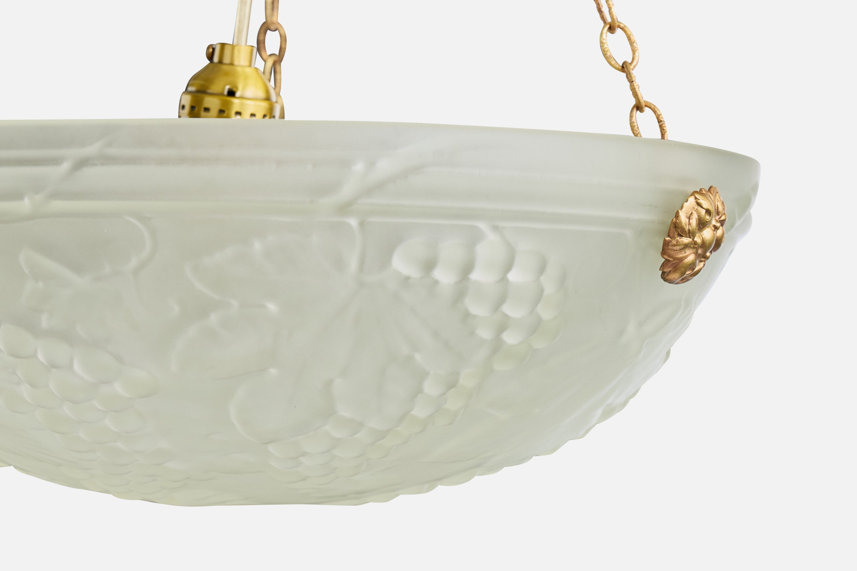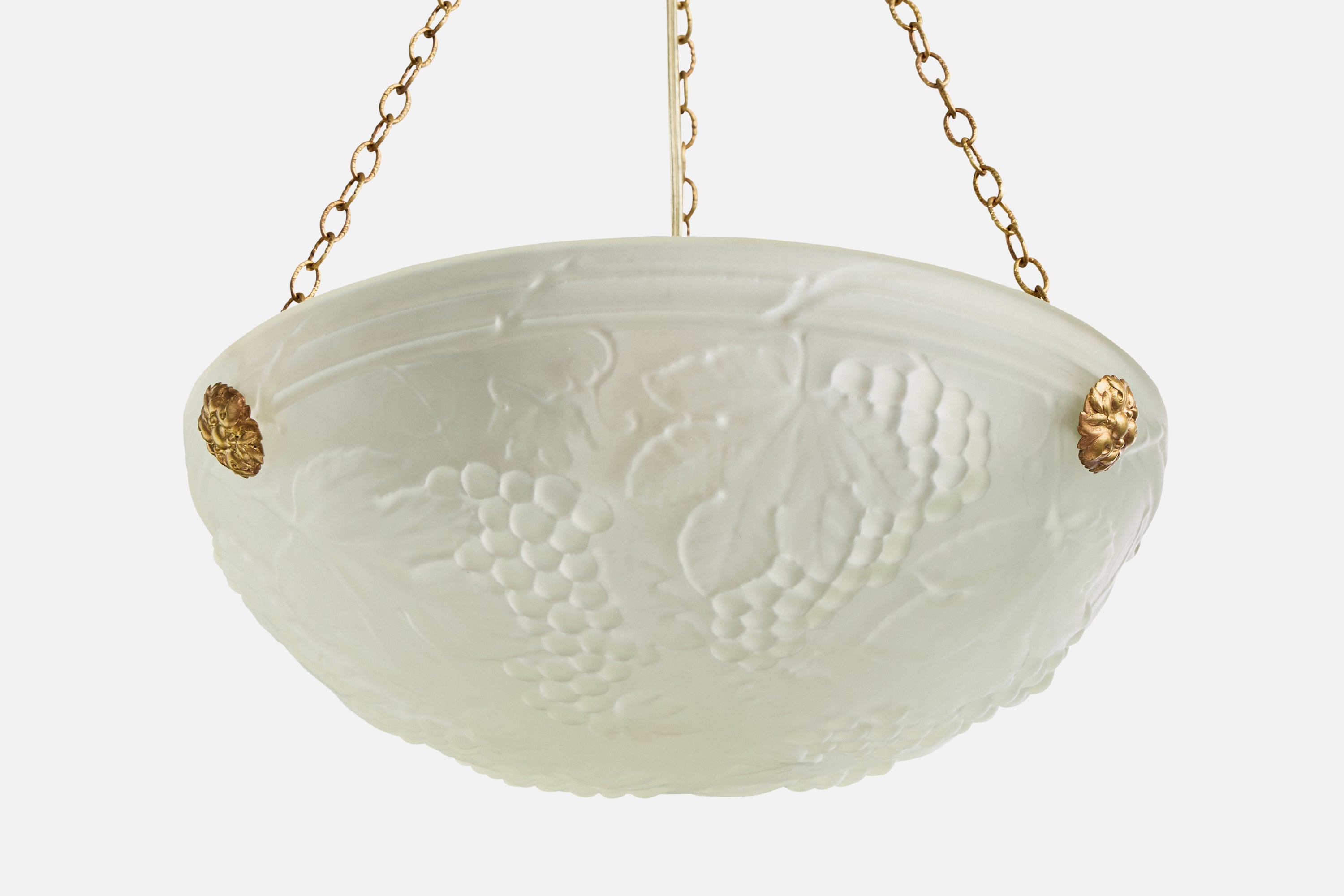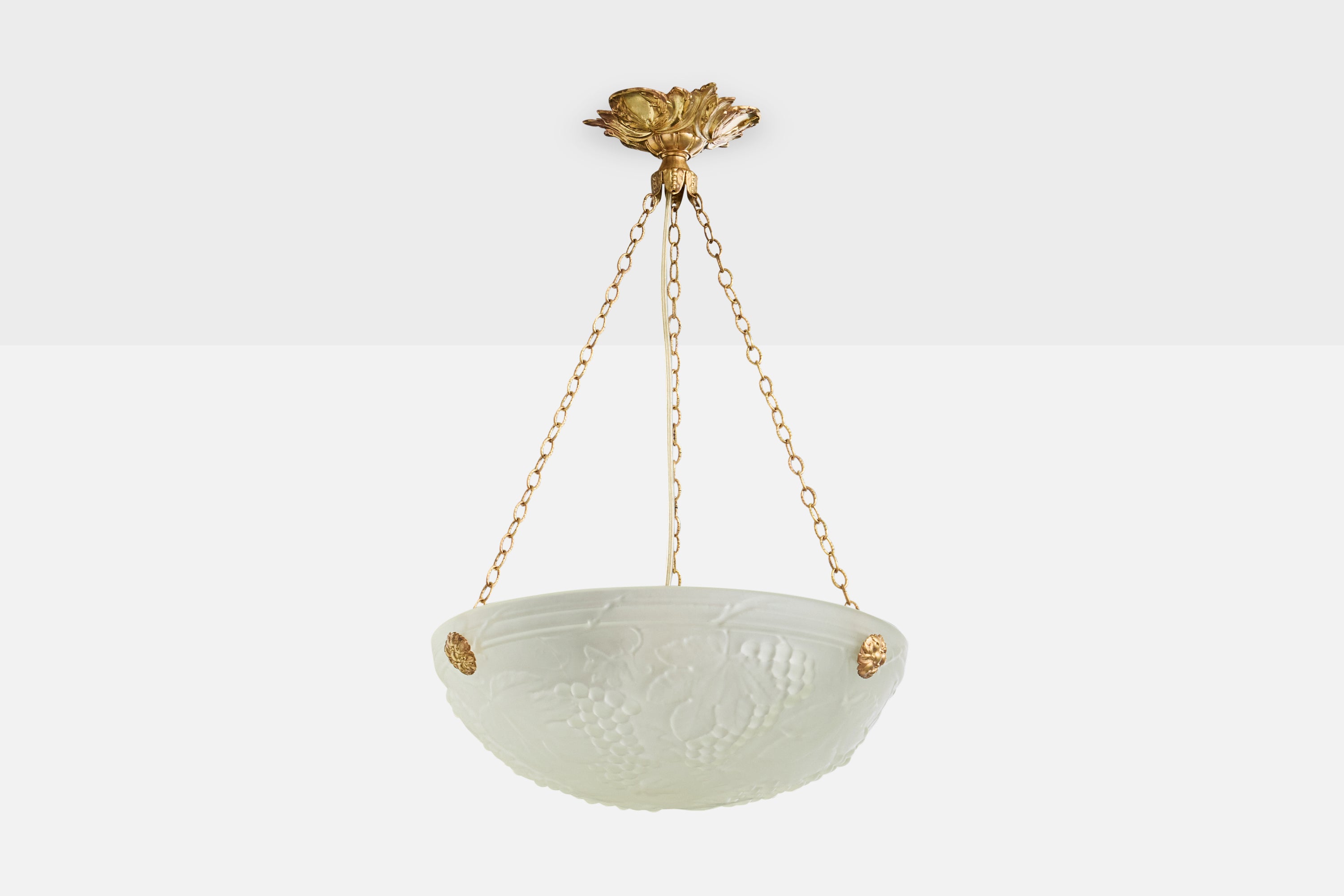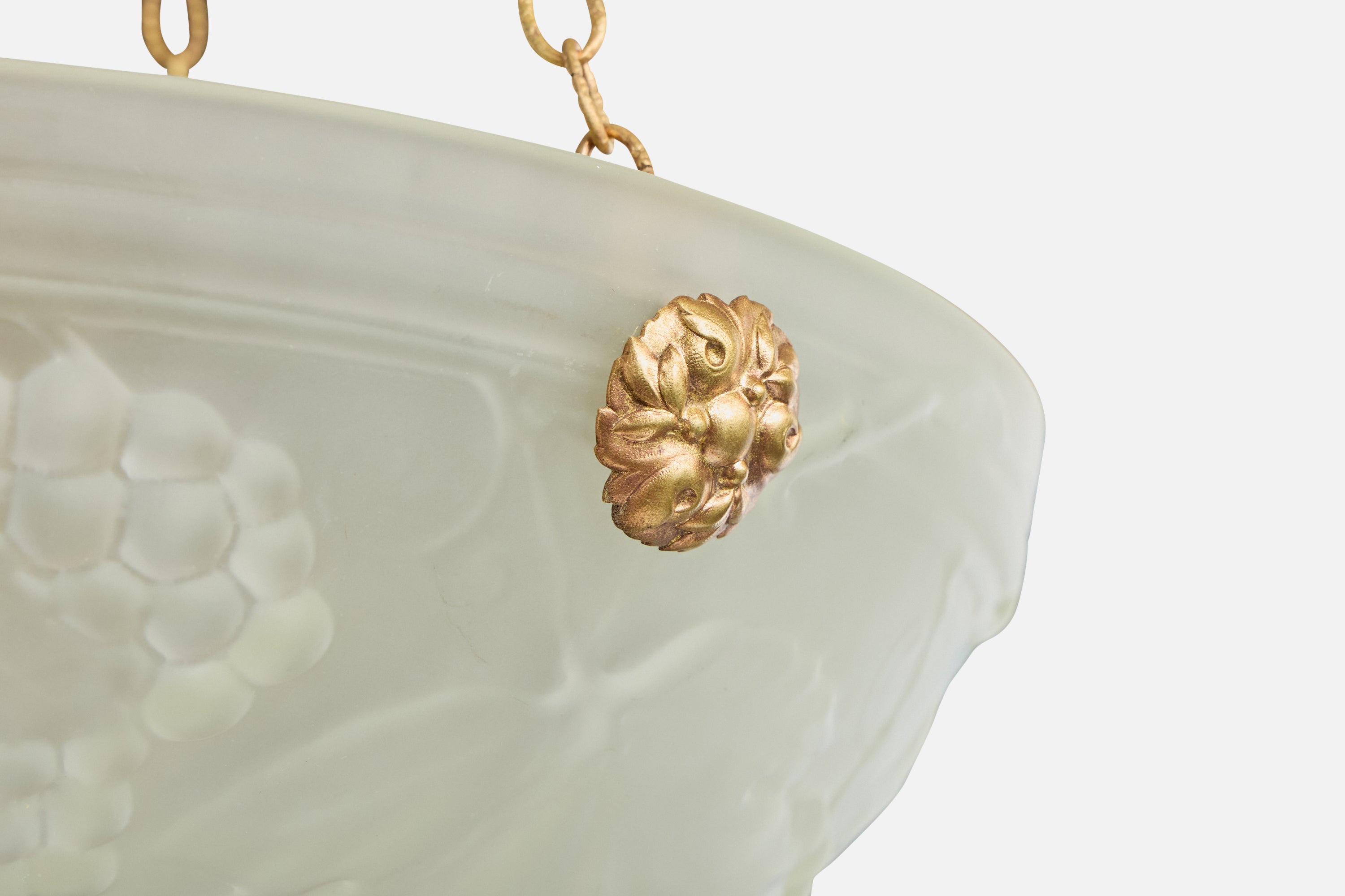French Designer, Pendant Light, Brass, Glass, France, 1930s