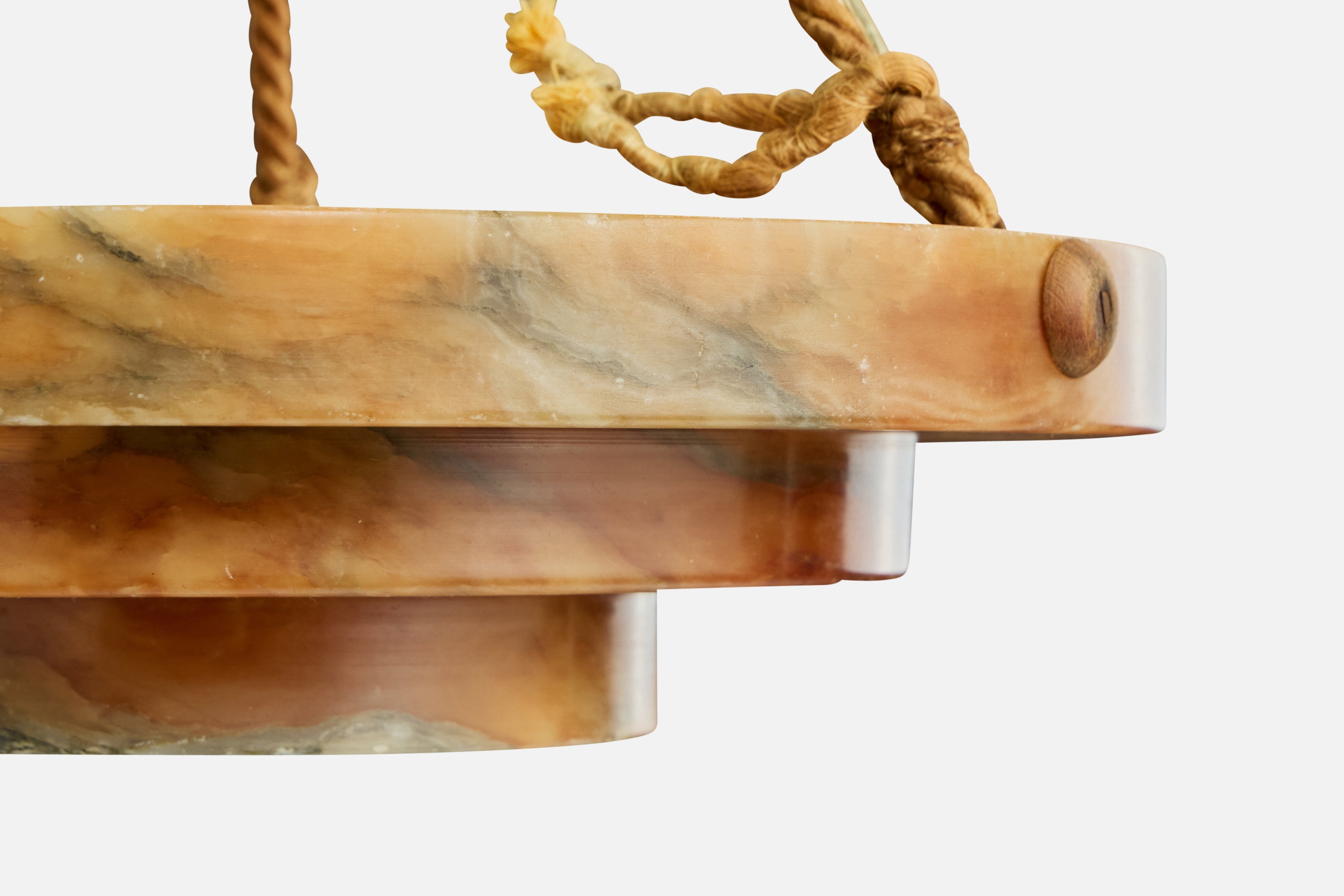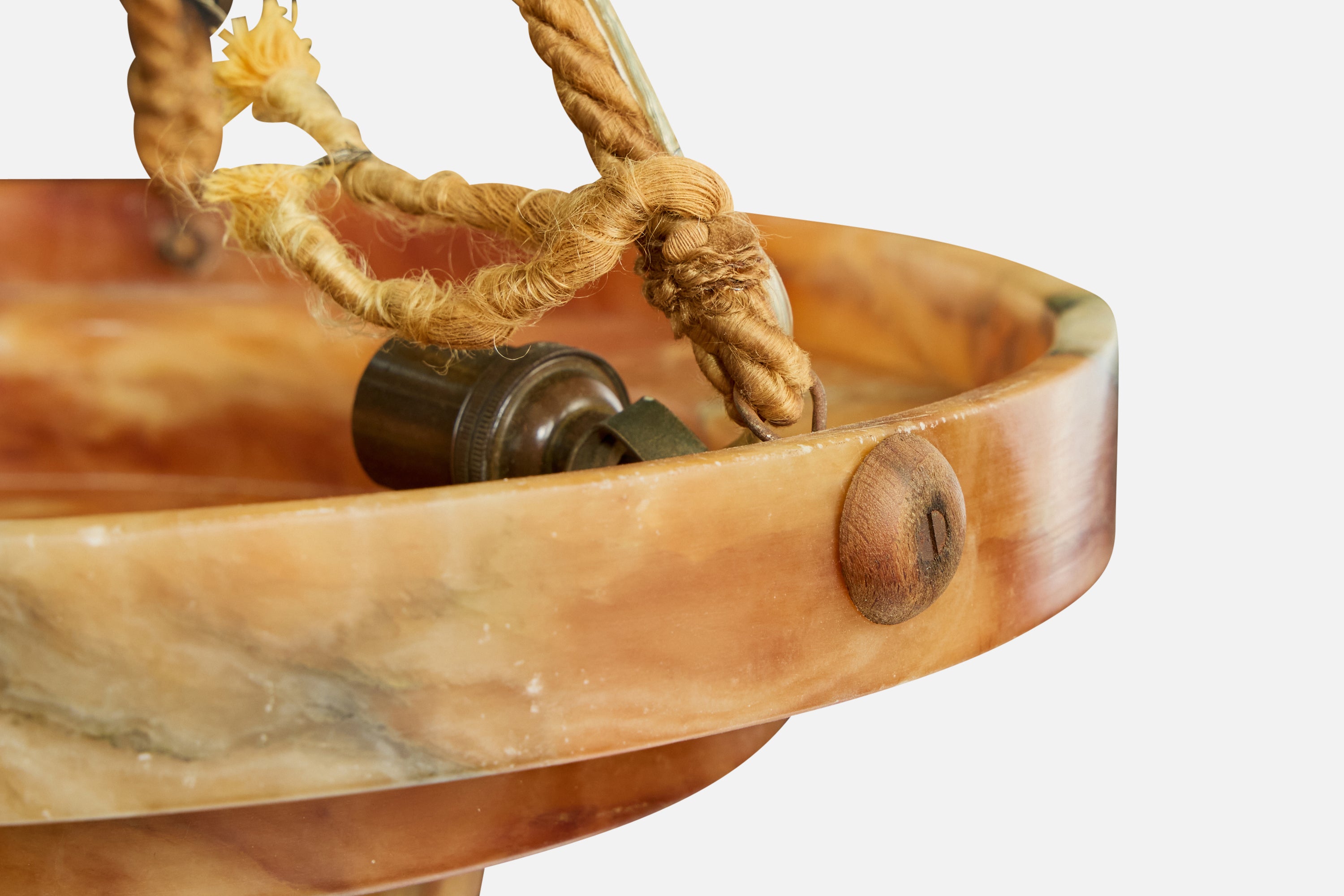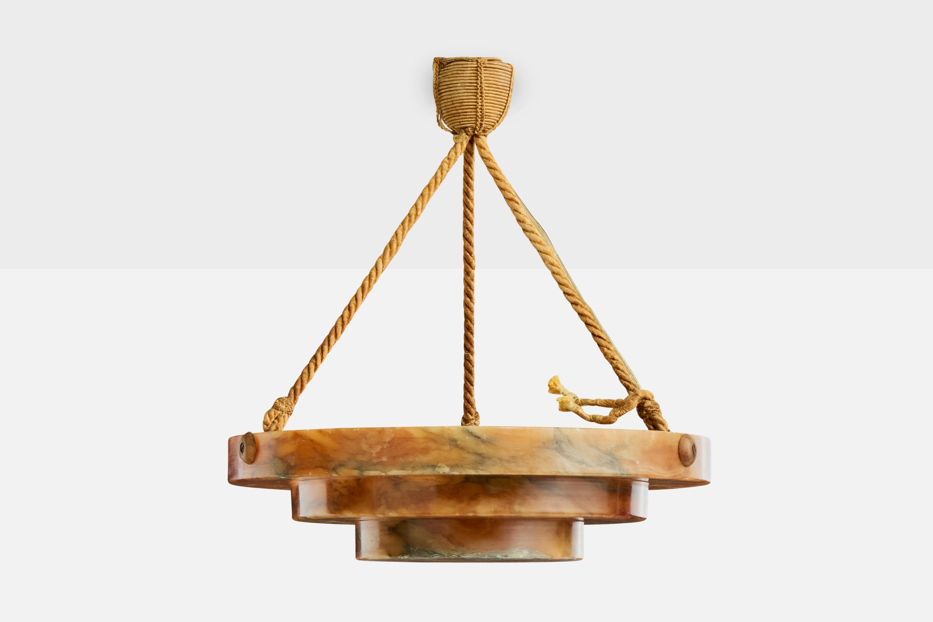 An alabaster, wood and brown rope pendant light likely designed and produced in France, c. 1930s.