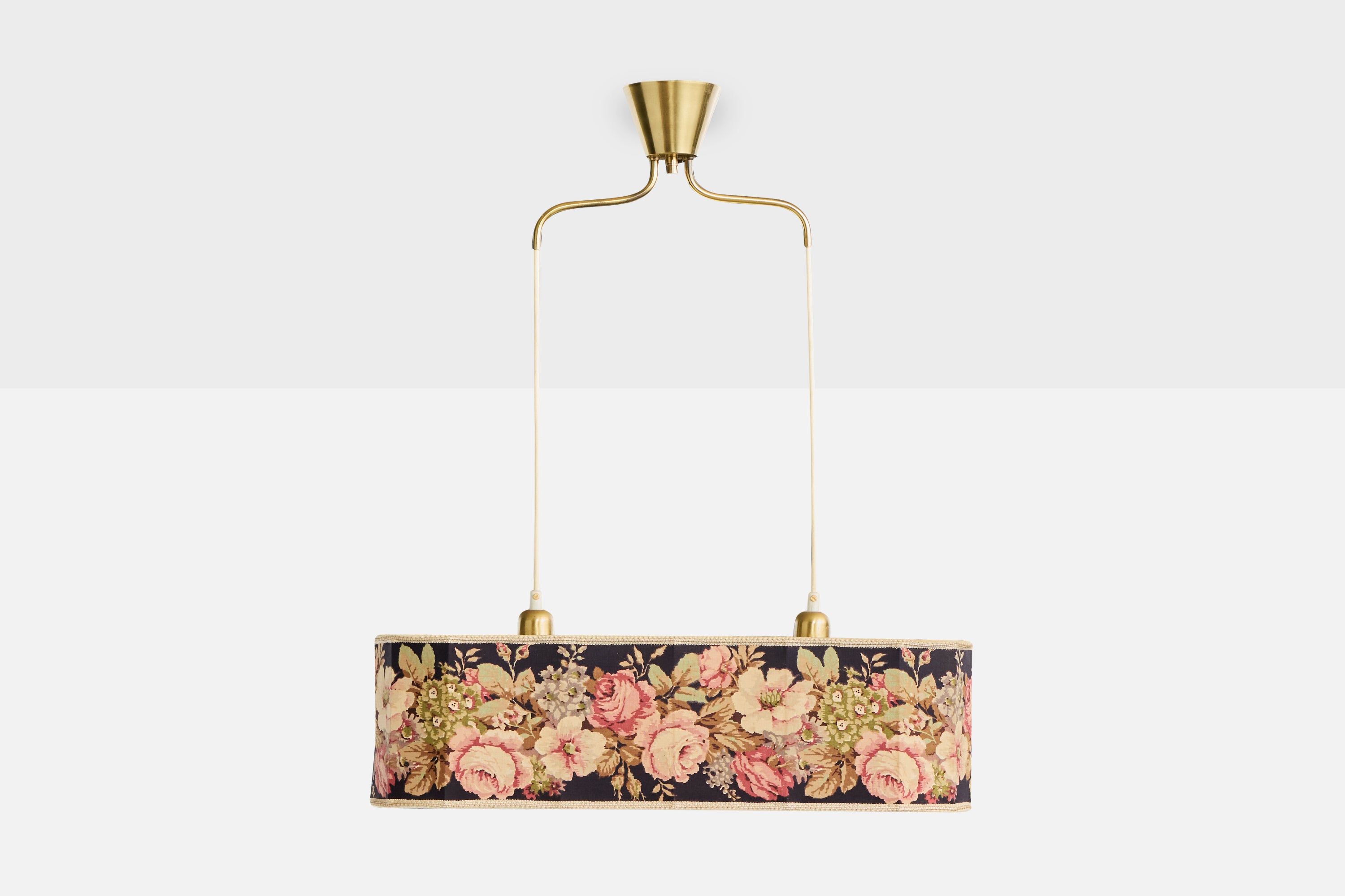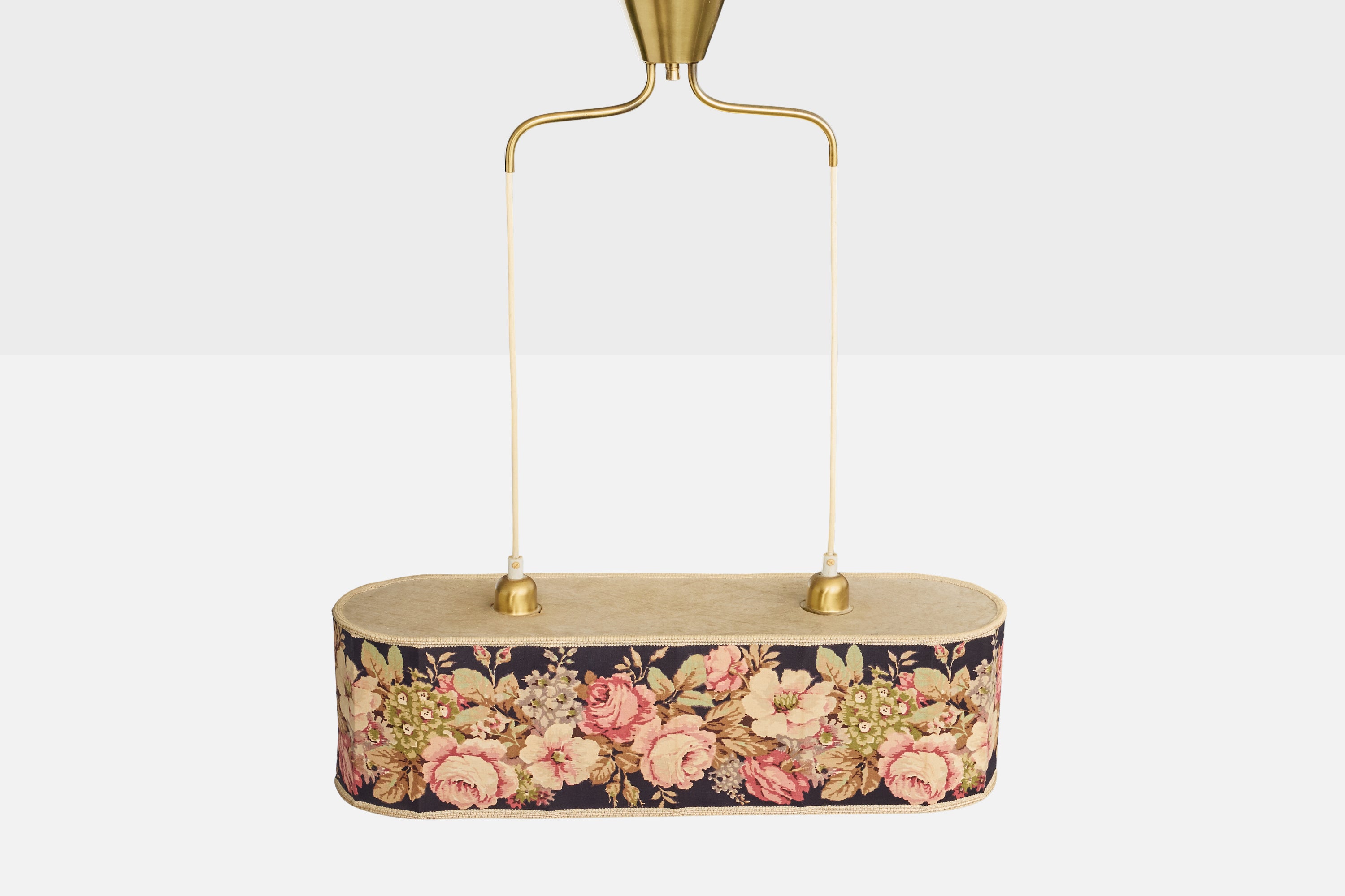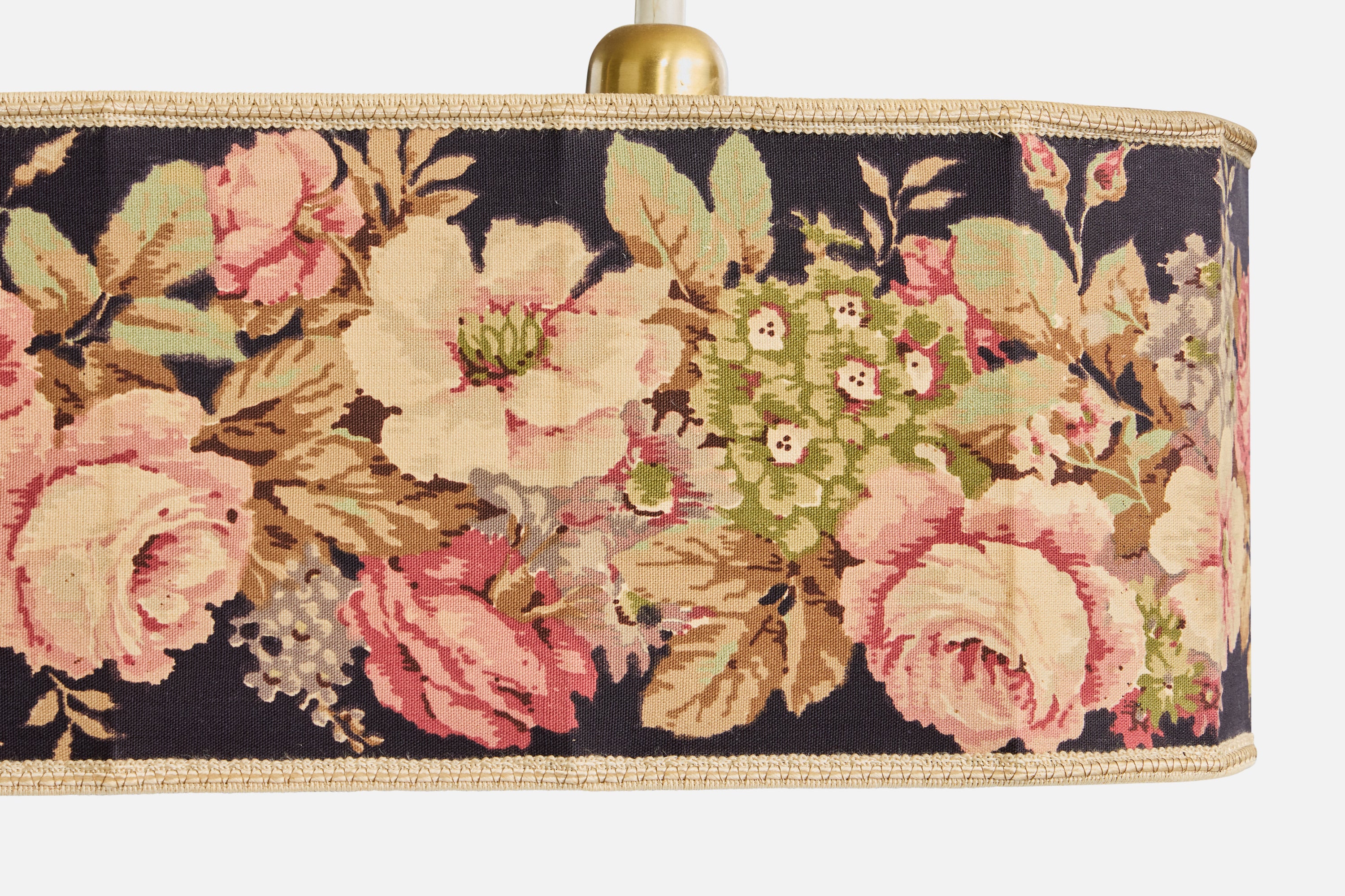 A brass and floral-printed fabric pendant light designed and produced in Sweden, c. 1950s.