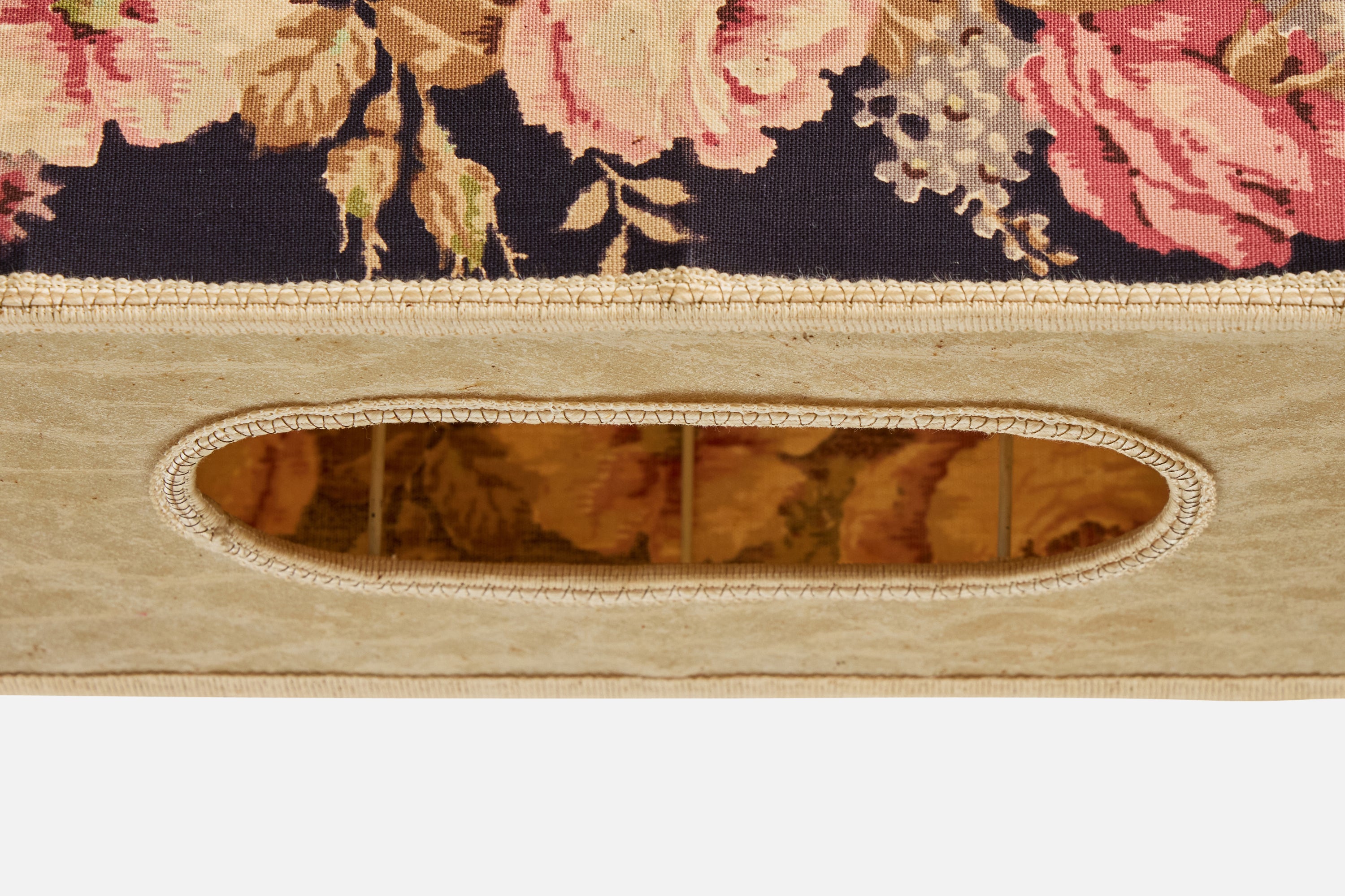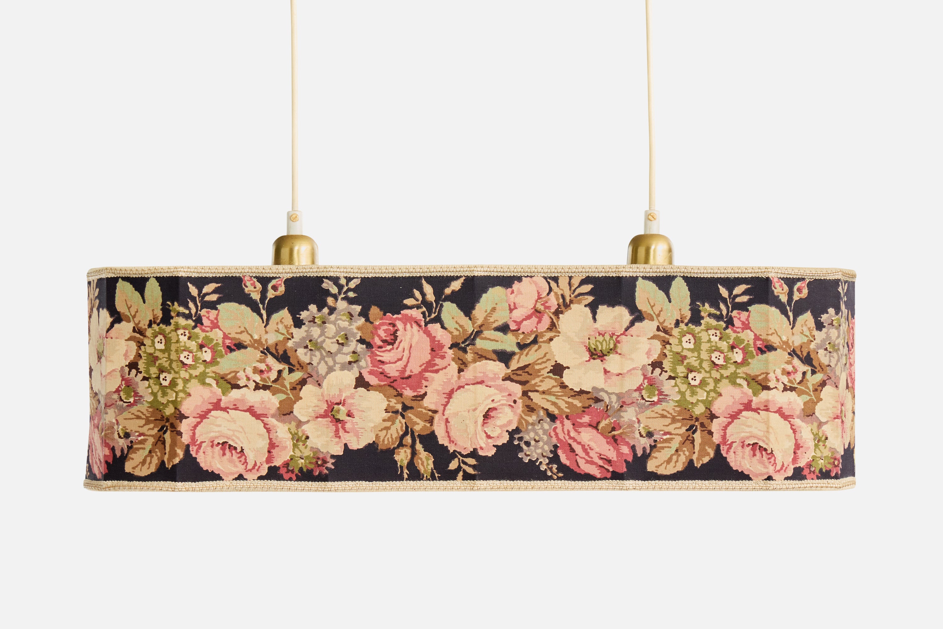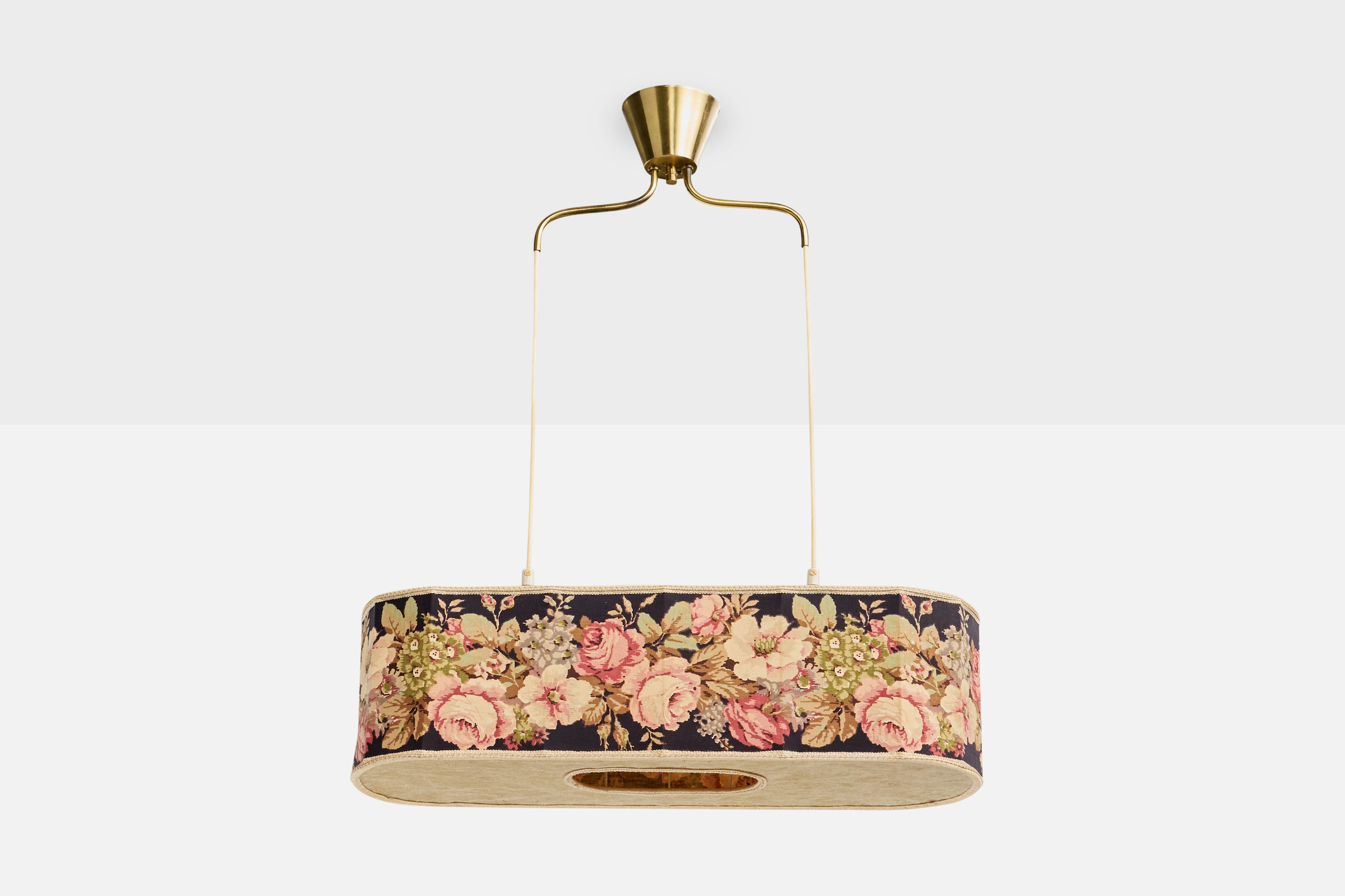 A brass and floral-printed fabric pendant light designed and produced in Sweden, c. 1950s.