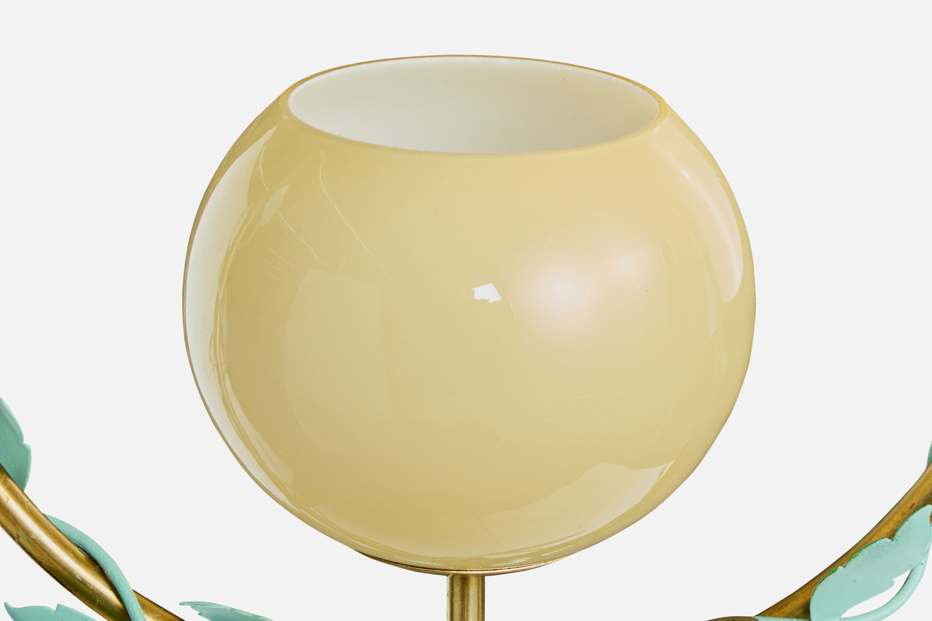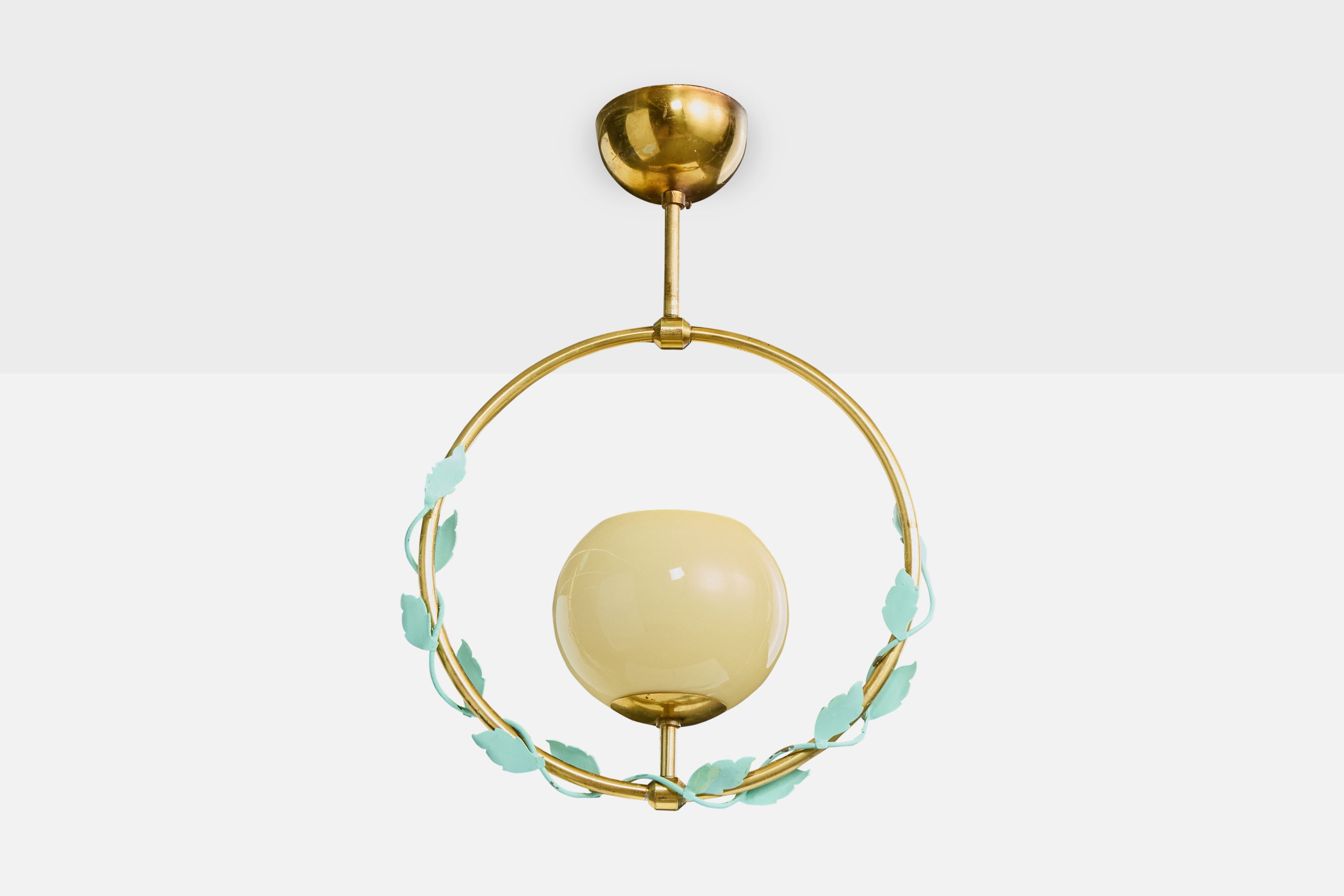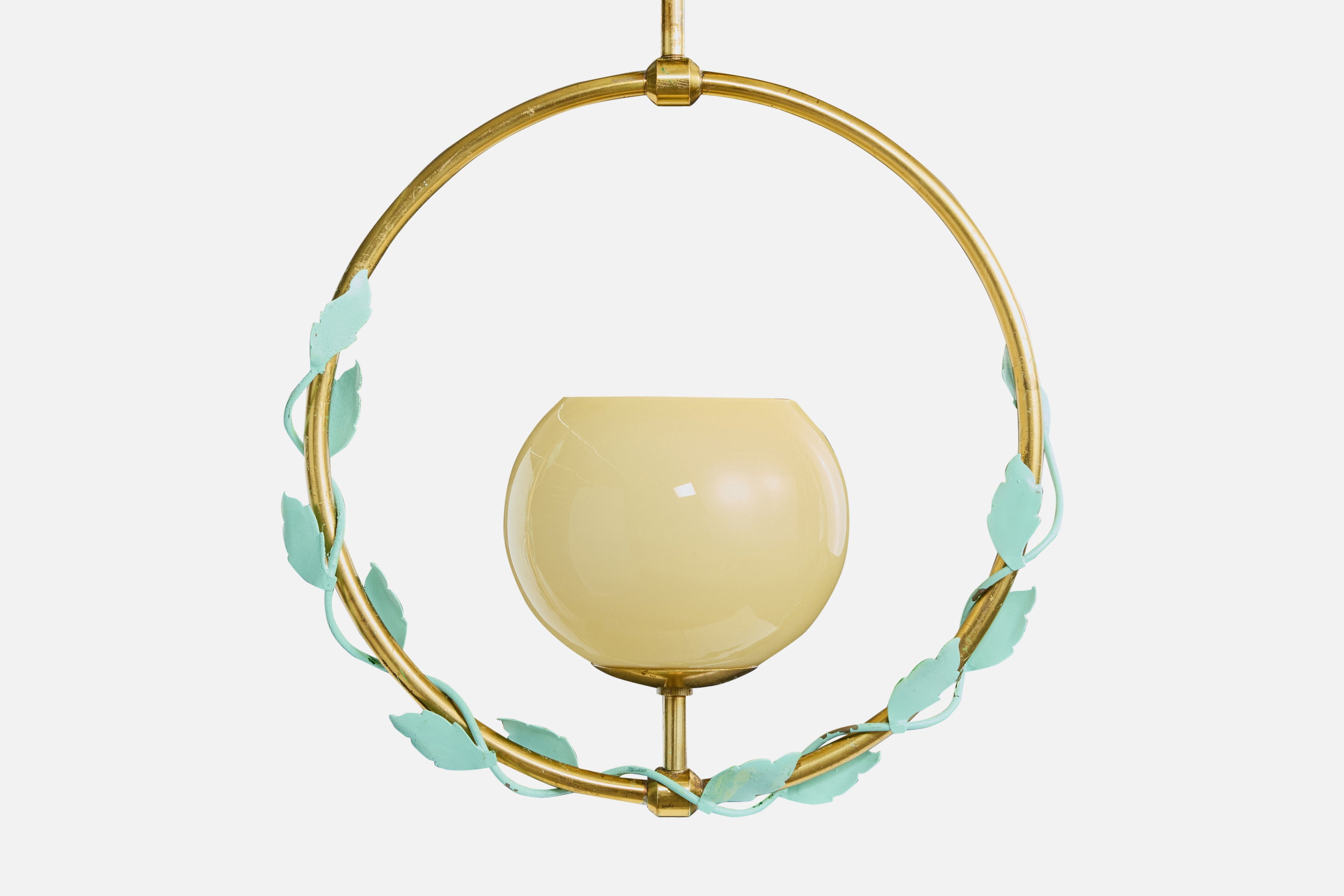 A brass, green-lacquered metal and yellow glass pendant light produced by Nybro Aramturfabrik, Sweden, c. 1950s.