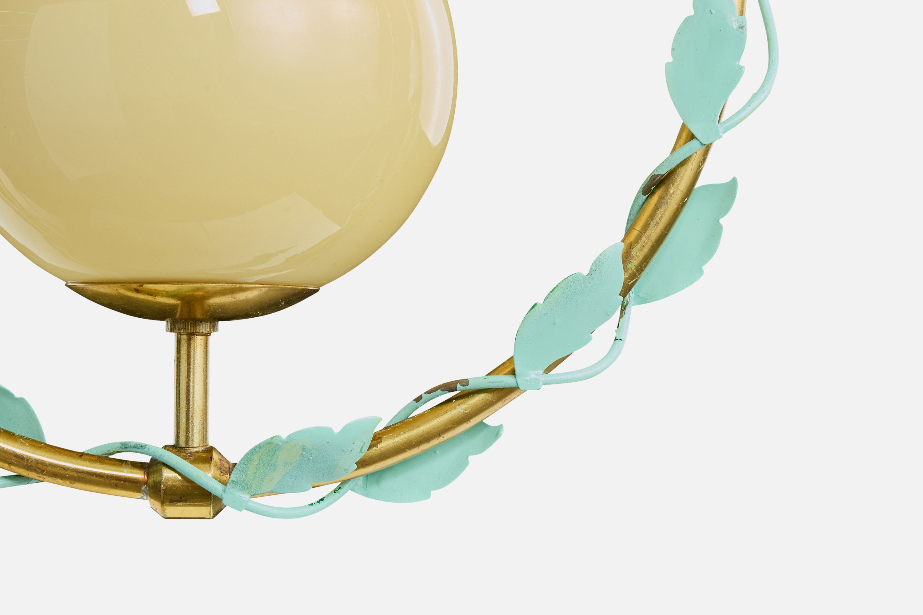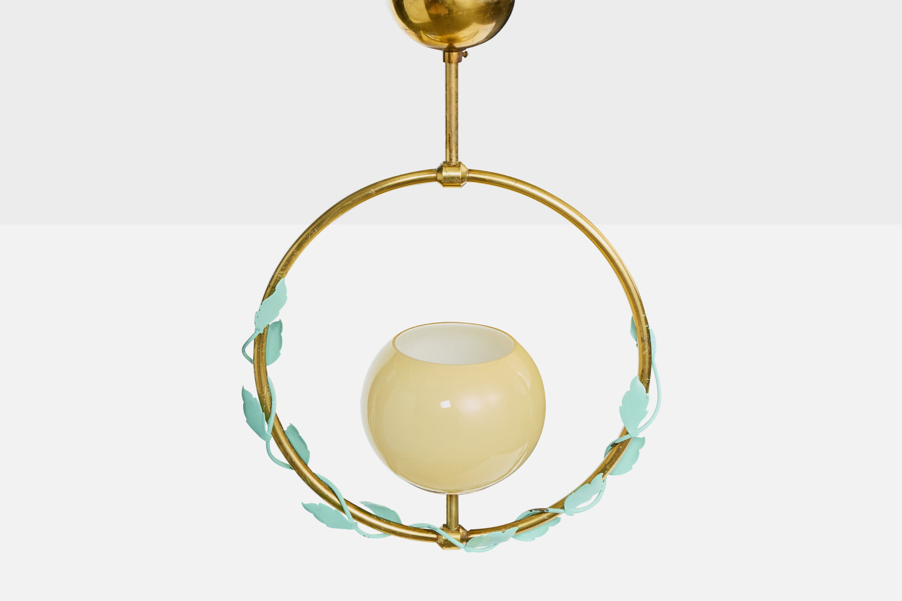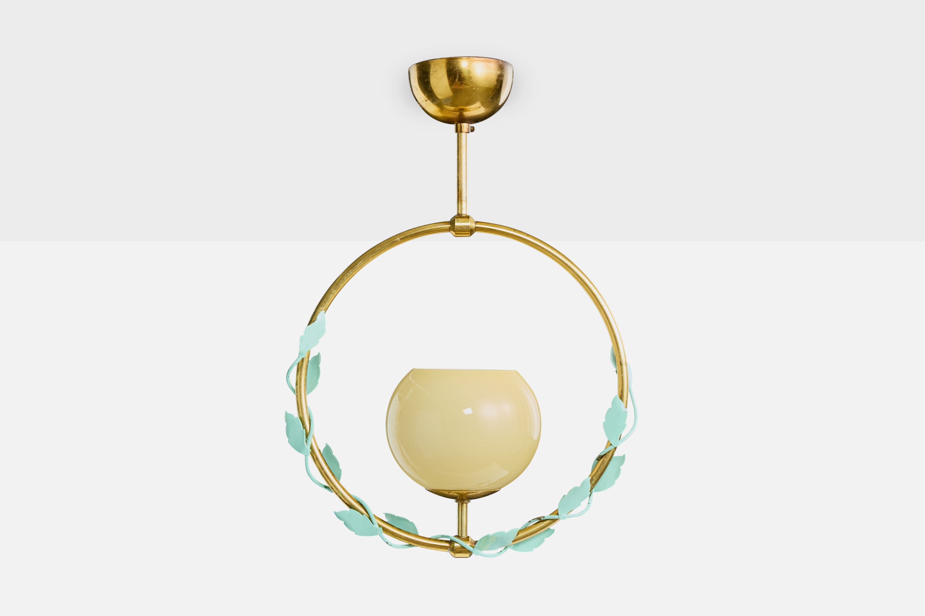 A brass, green-lacquered metal and yellow glass pendant light produced by Nybro Aramturfabrik, Sweden, c. 1950s.