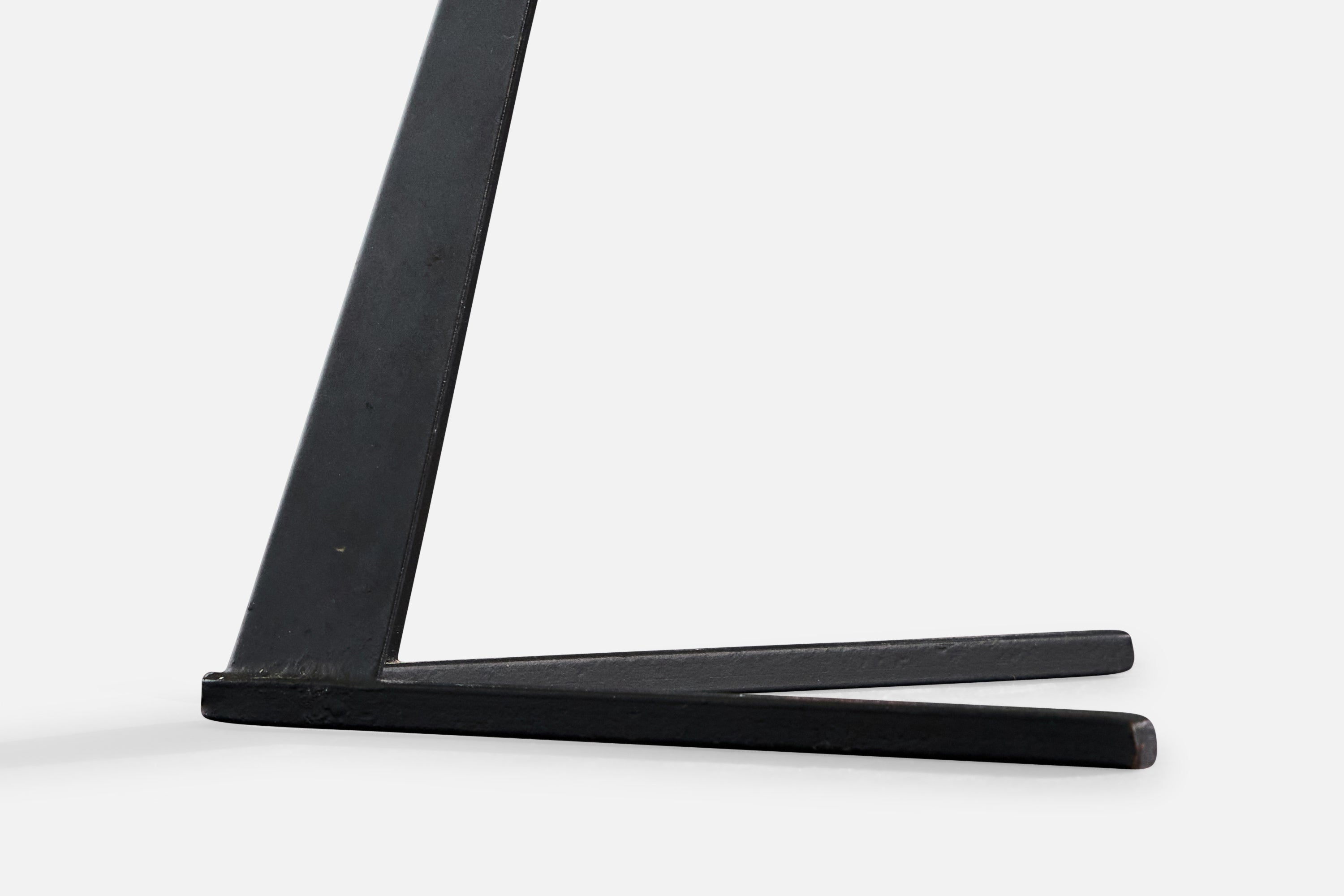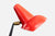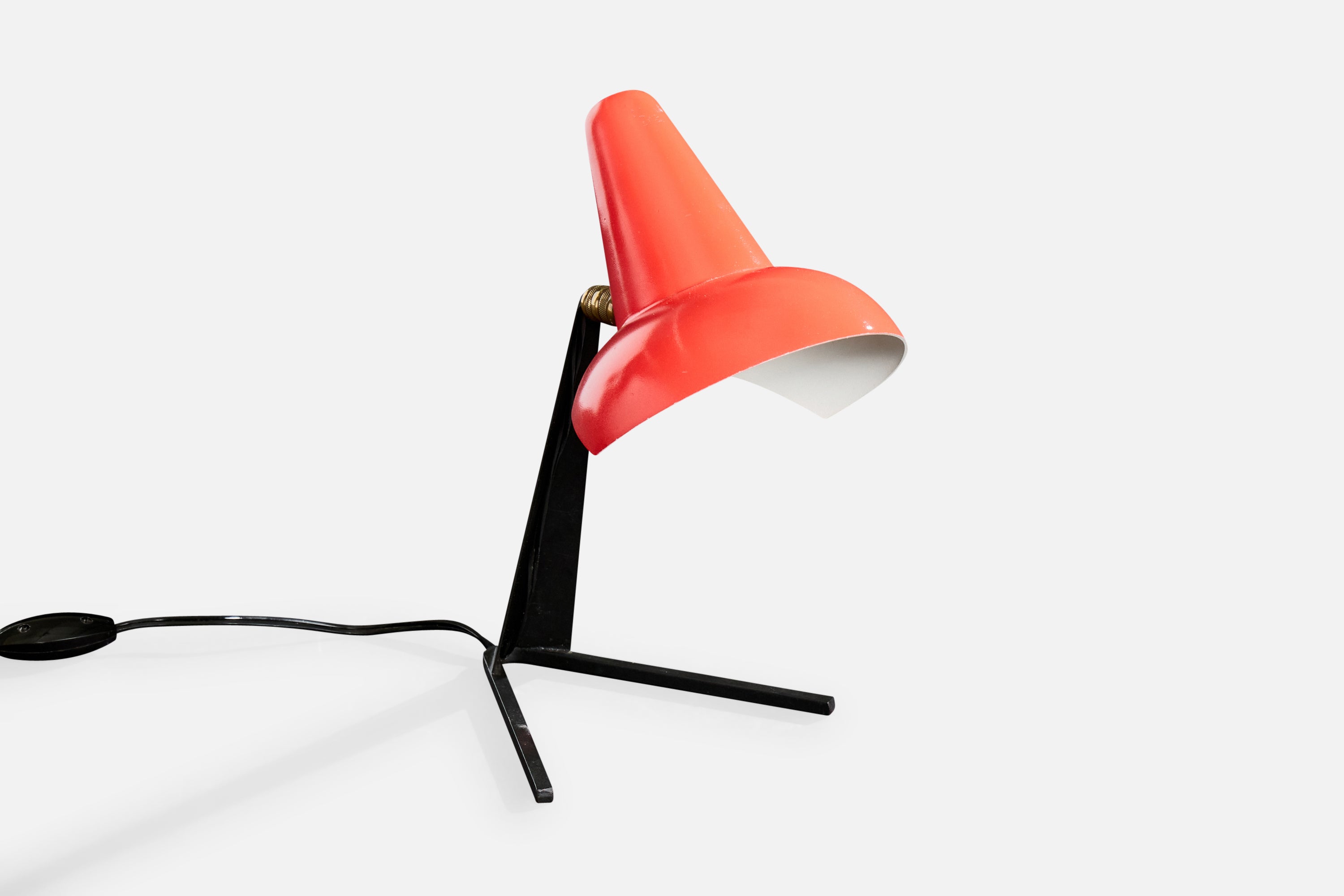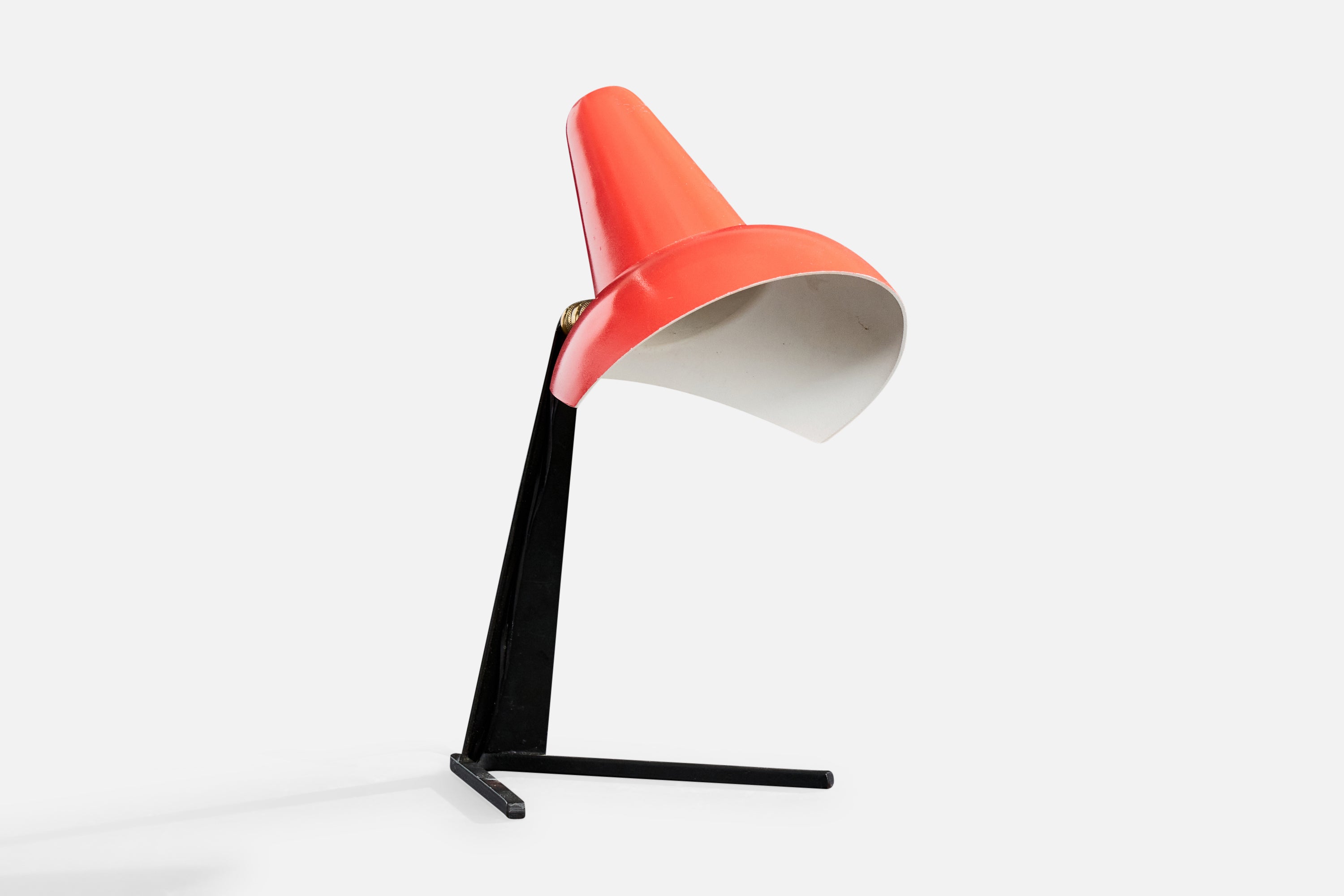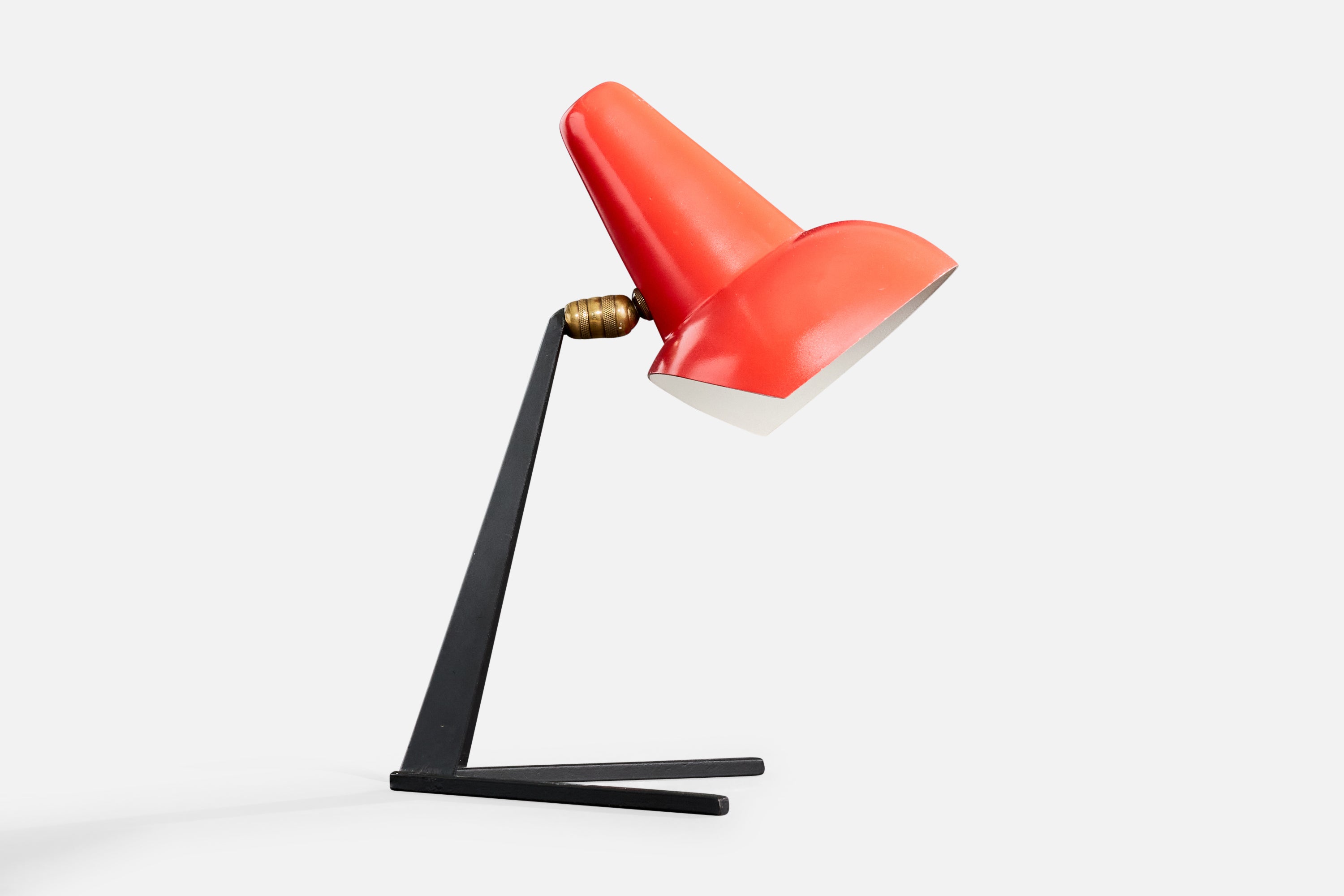 An adjustable brass, red and black lacquered metal table lamp or desk light likely designed and produced in France, c. 1950s.