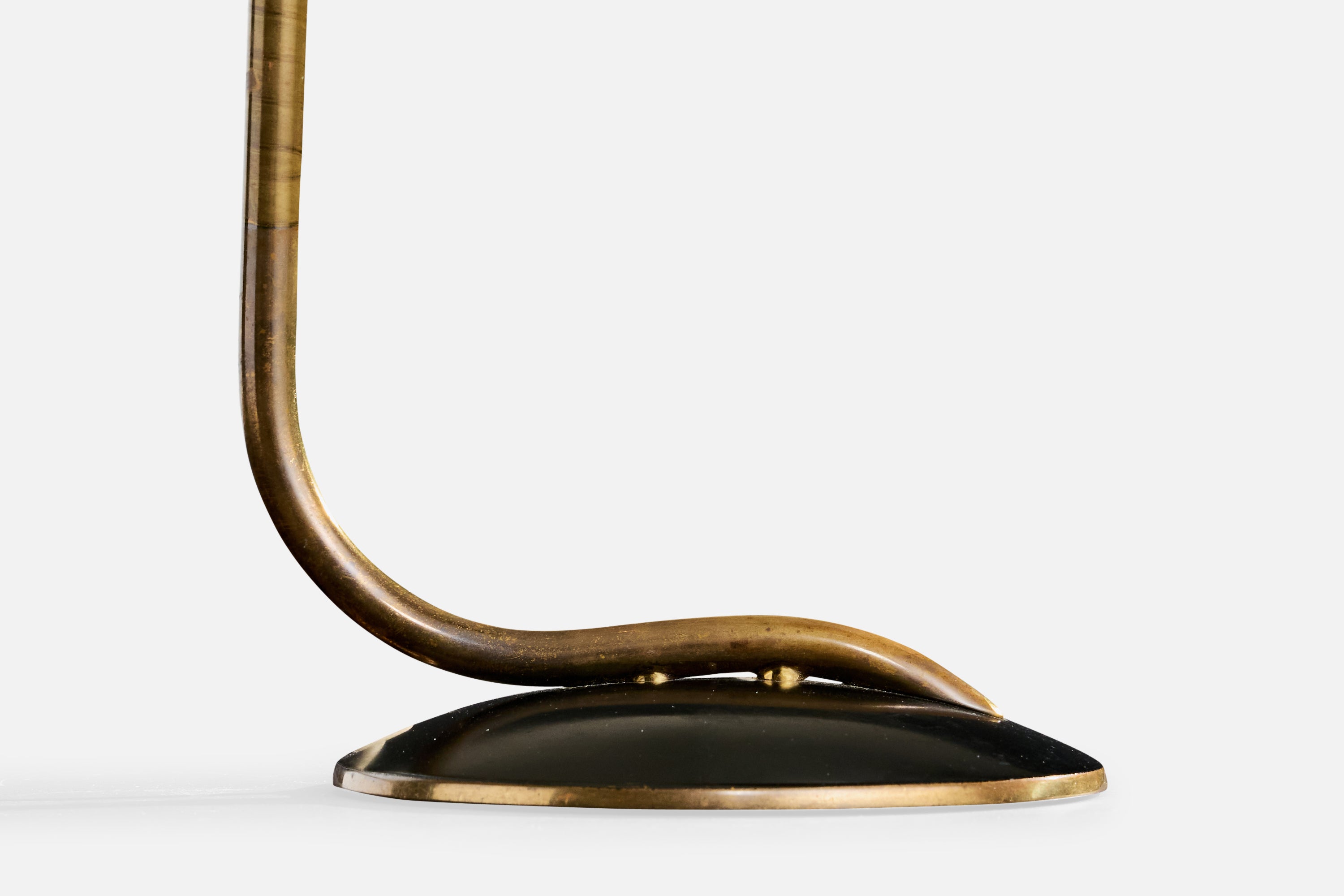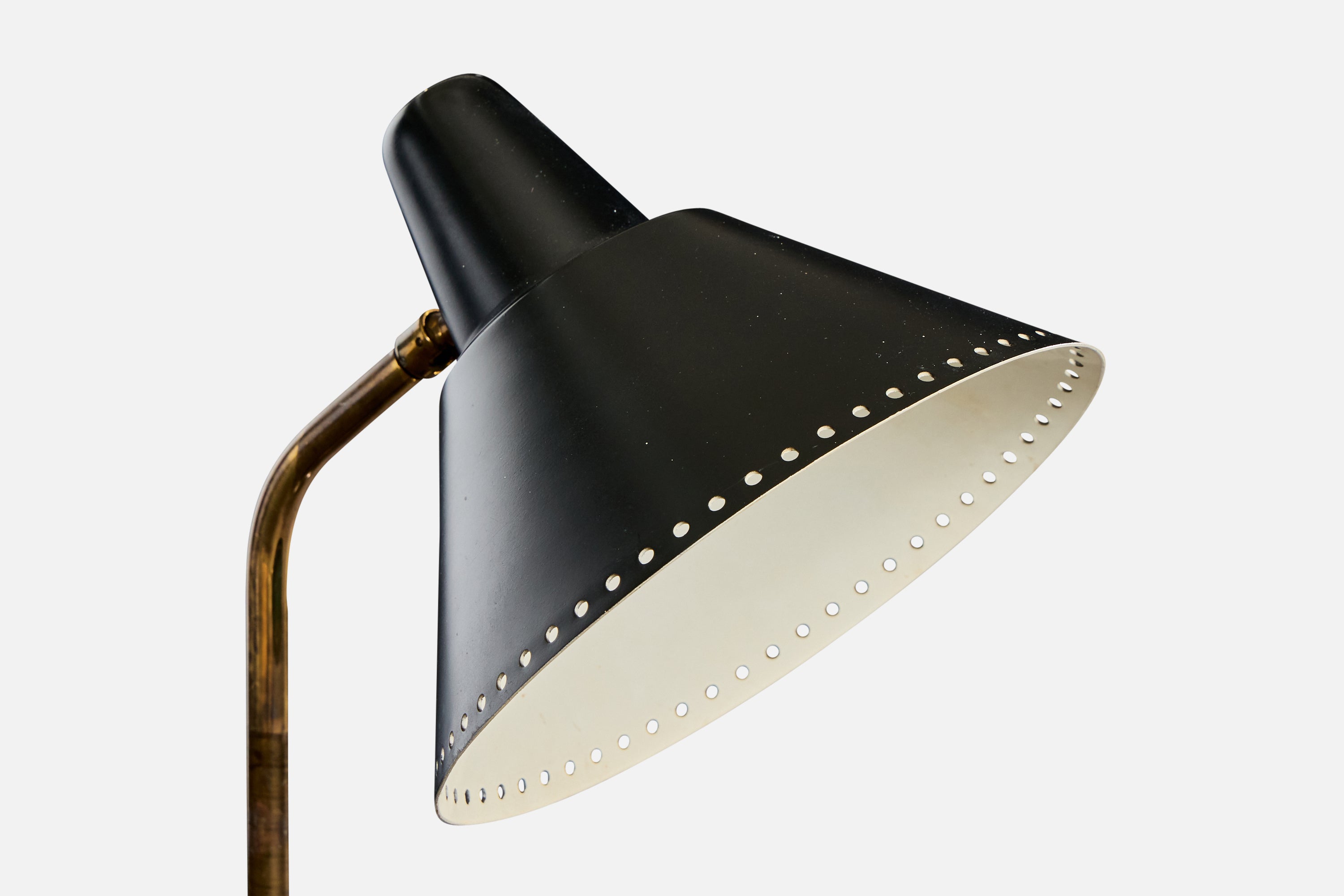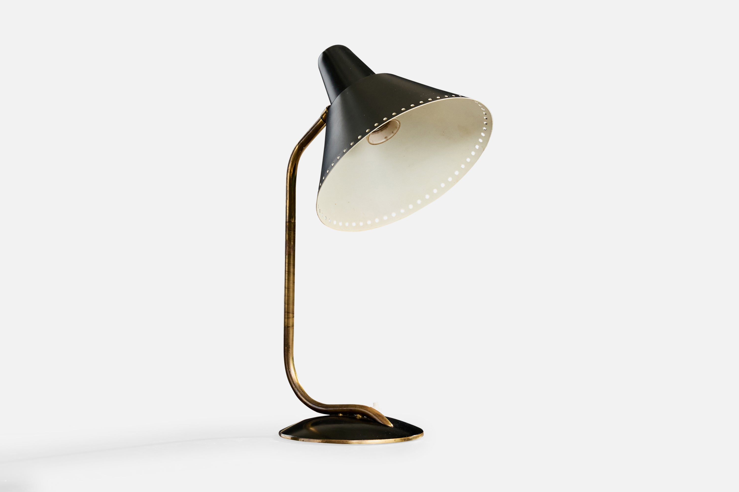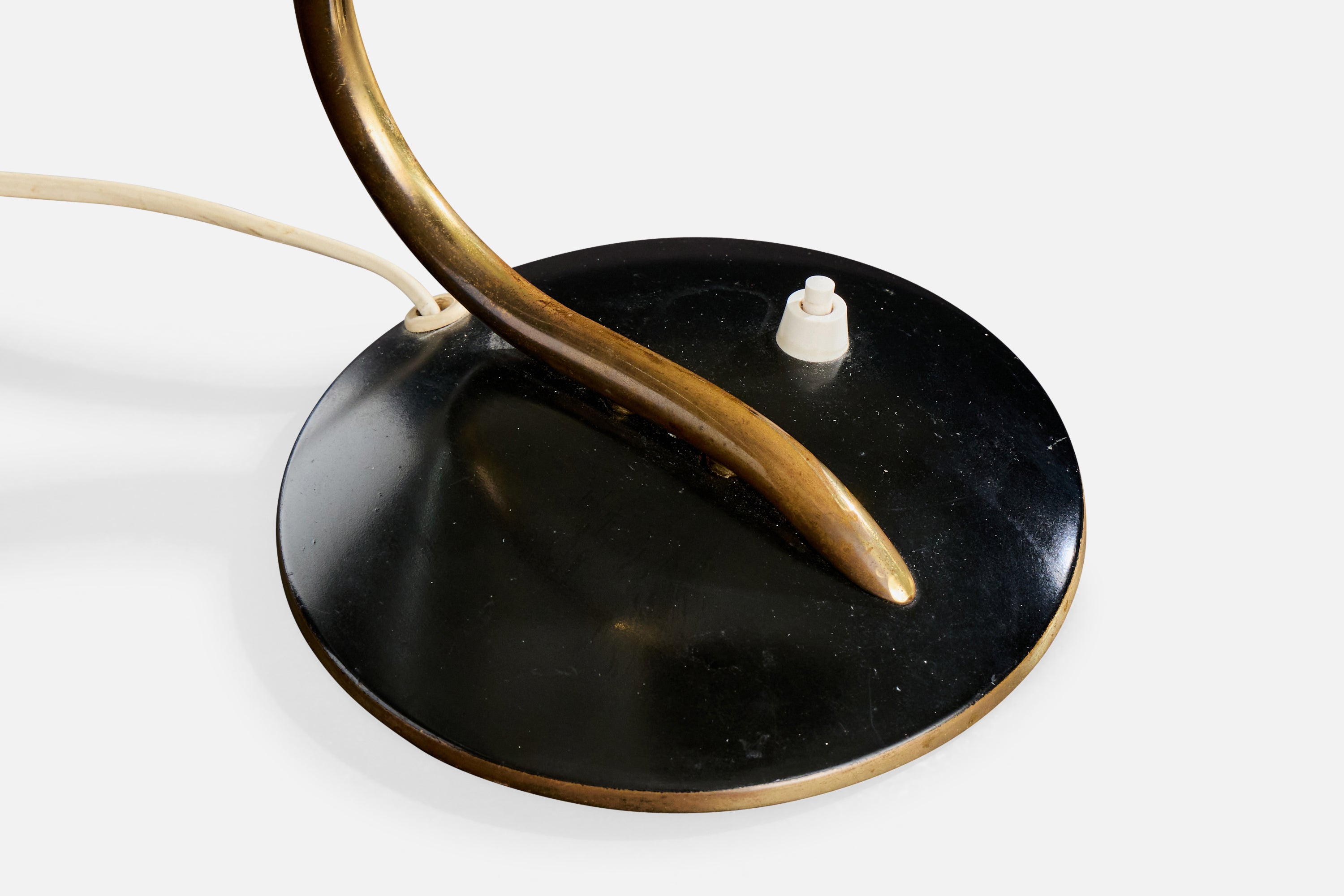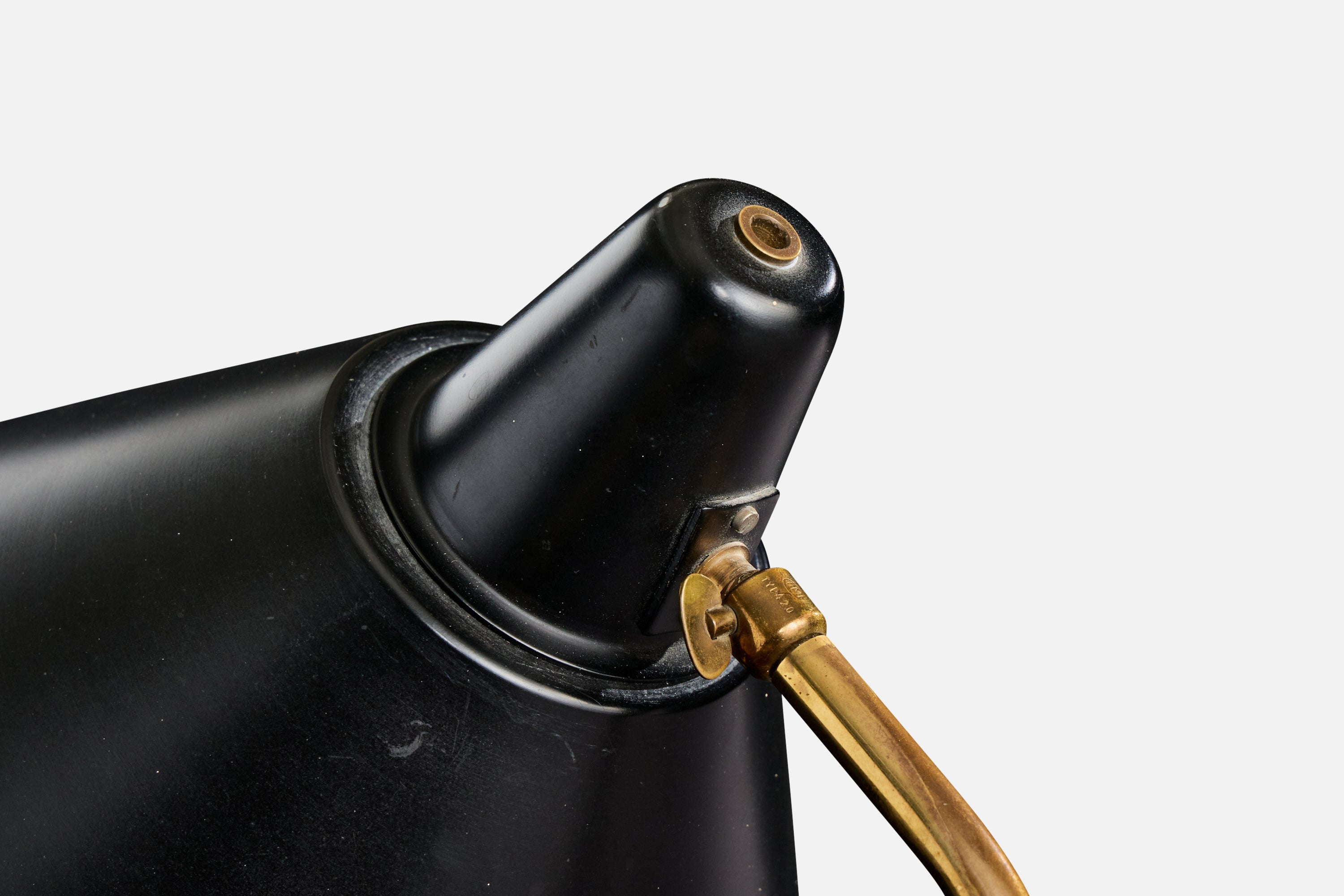 A black-lacquered metal and brass table lamp or desk light produced by Valinte, Finland, c. 1960s.
