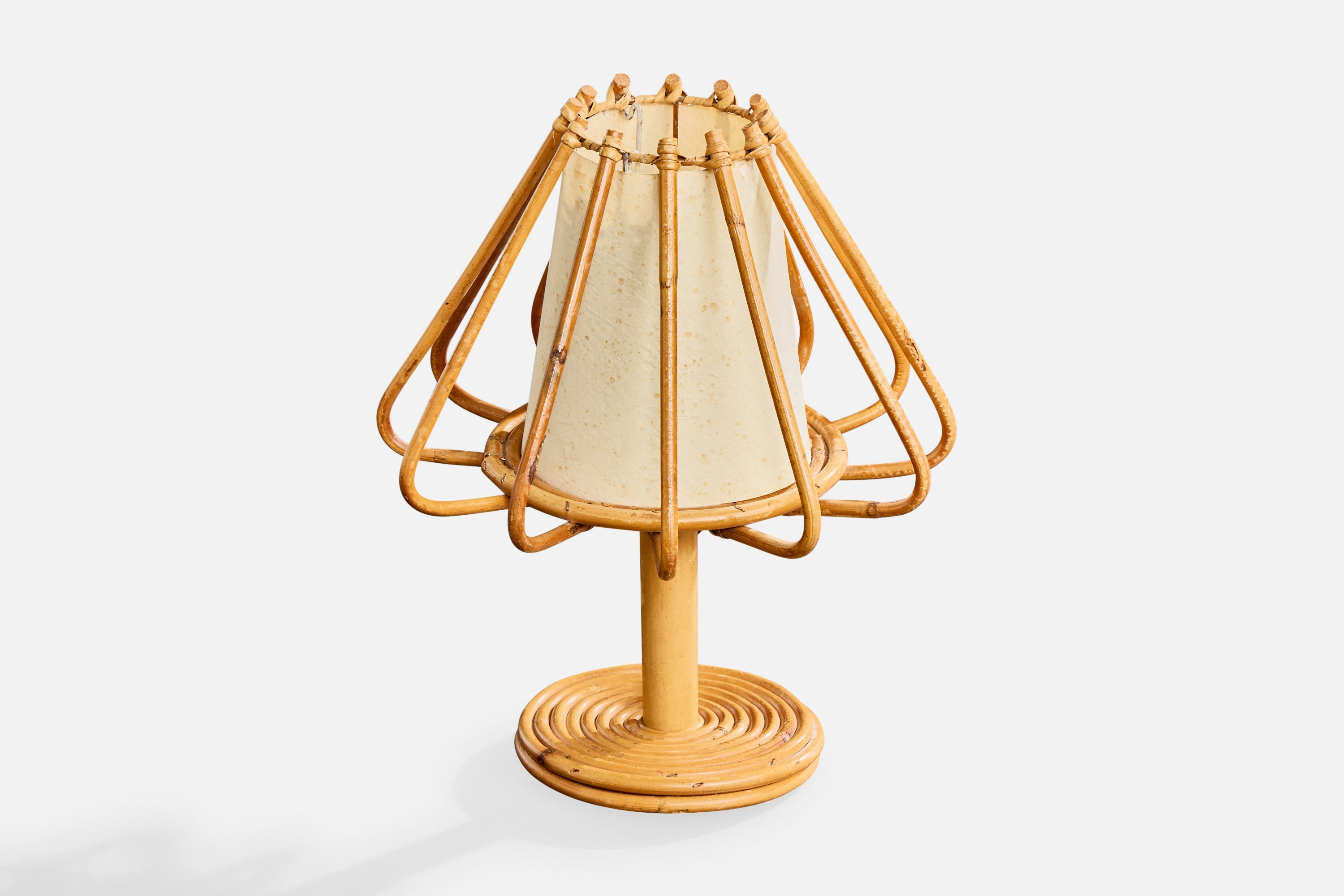 A bamboo, rattan and off-white parchment paper table lamp designed and produced in France, c. 1970s.