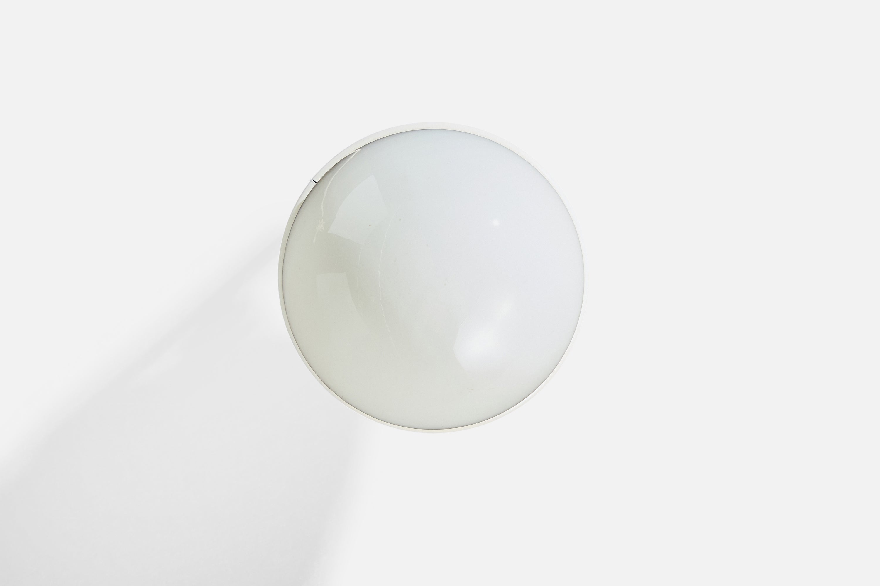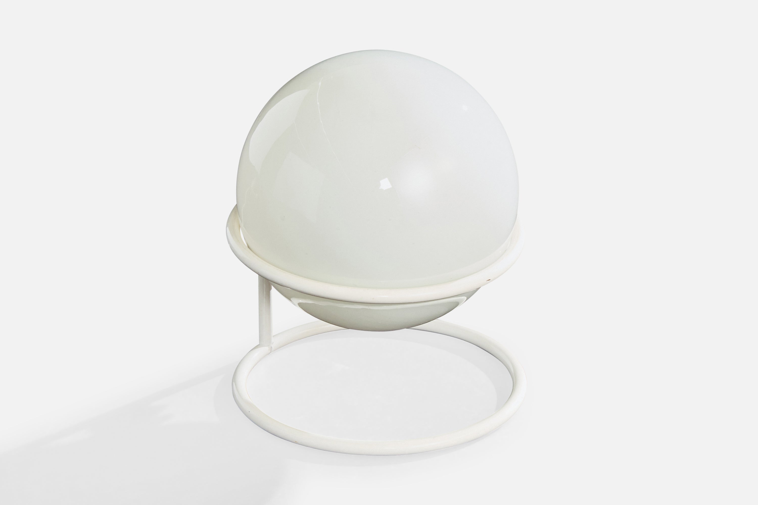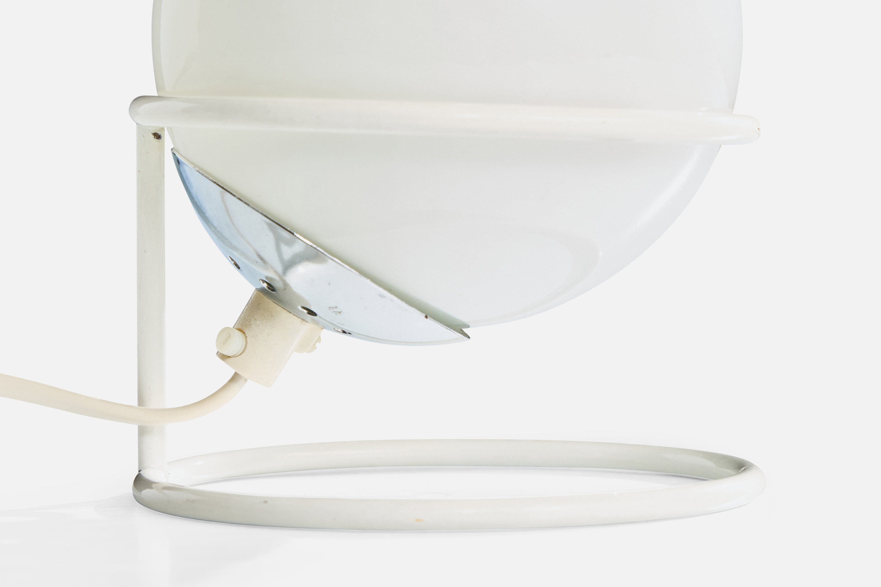 An opaline glass, white-lacquered and chrome plated metal table lamp designed and produced in Italy, c. 1970s.