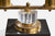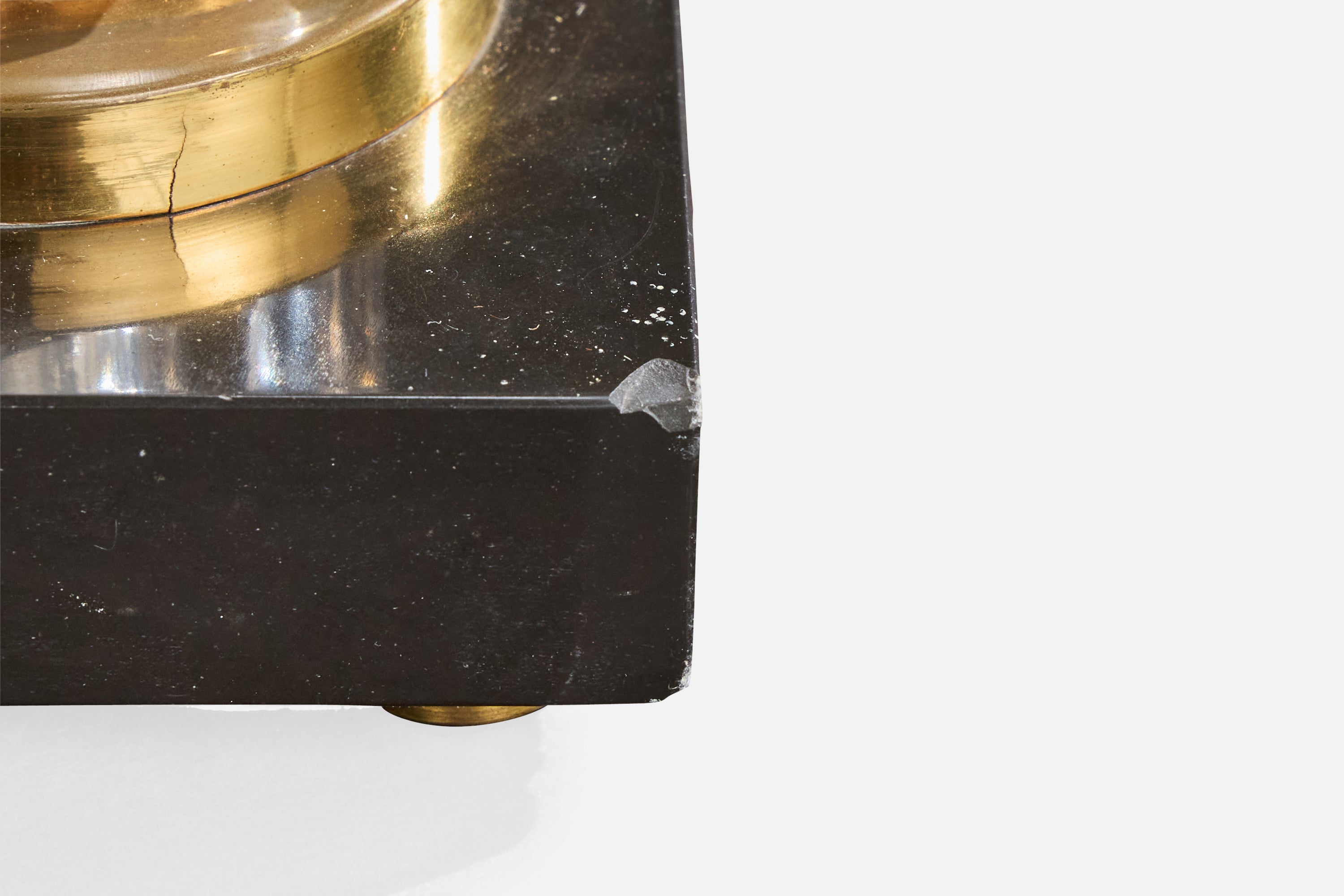 Moderate oxidation present throughout brass, small chips present in corners of stone/slate base.