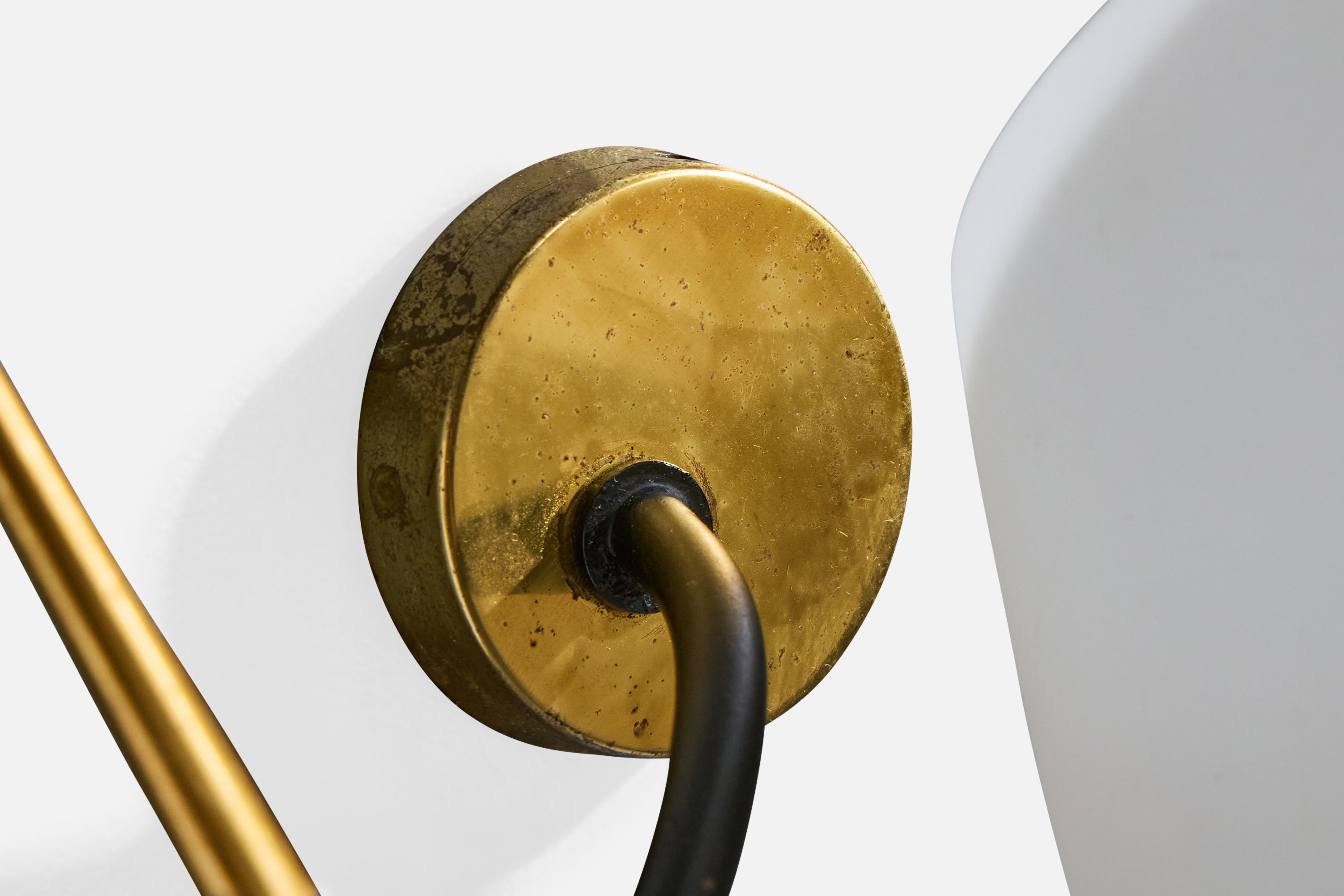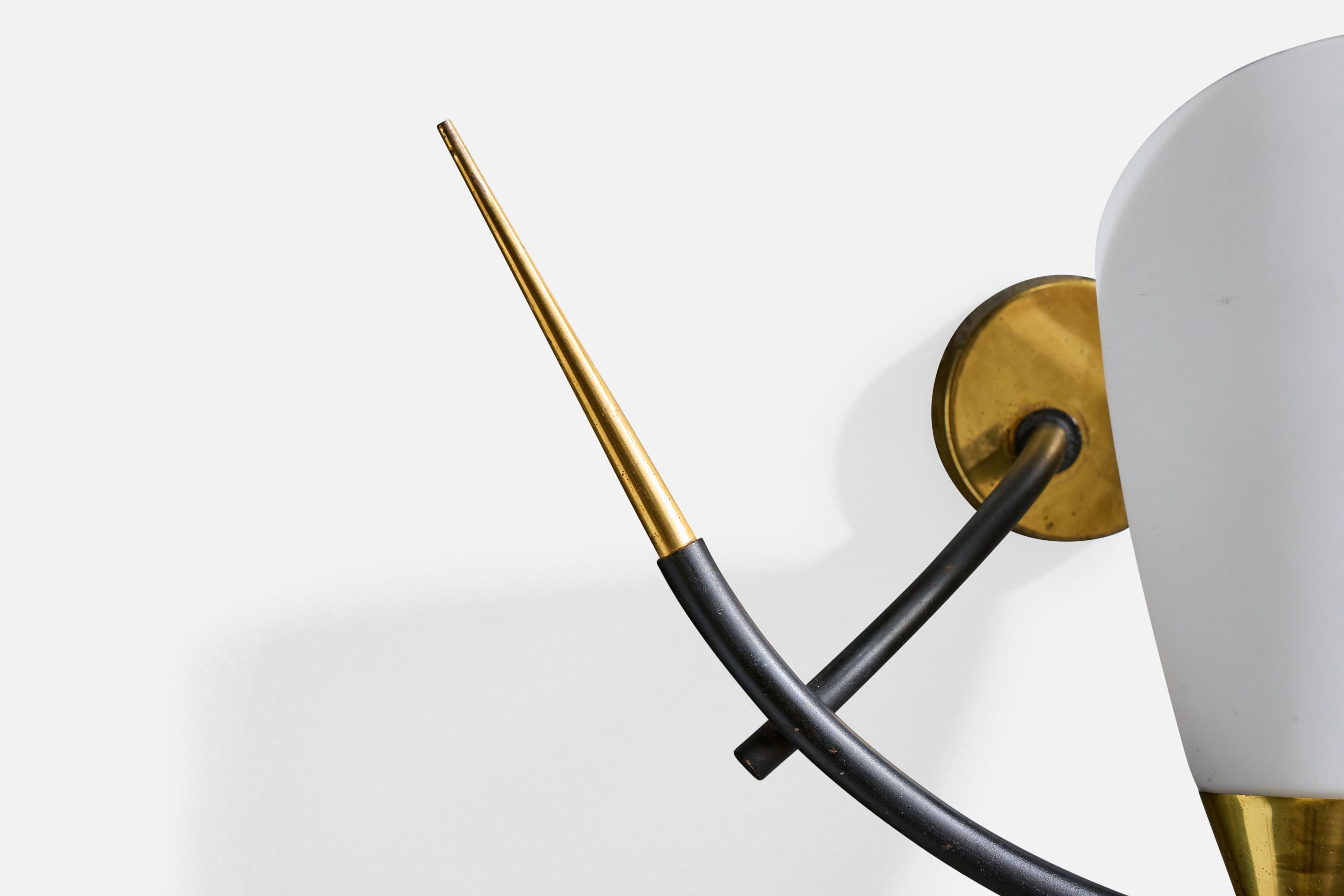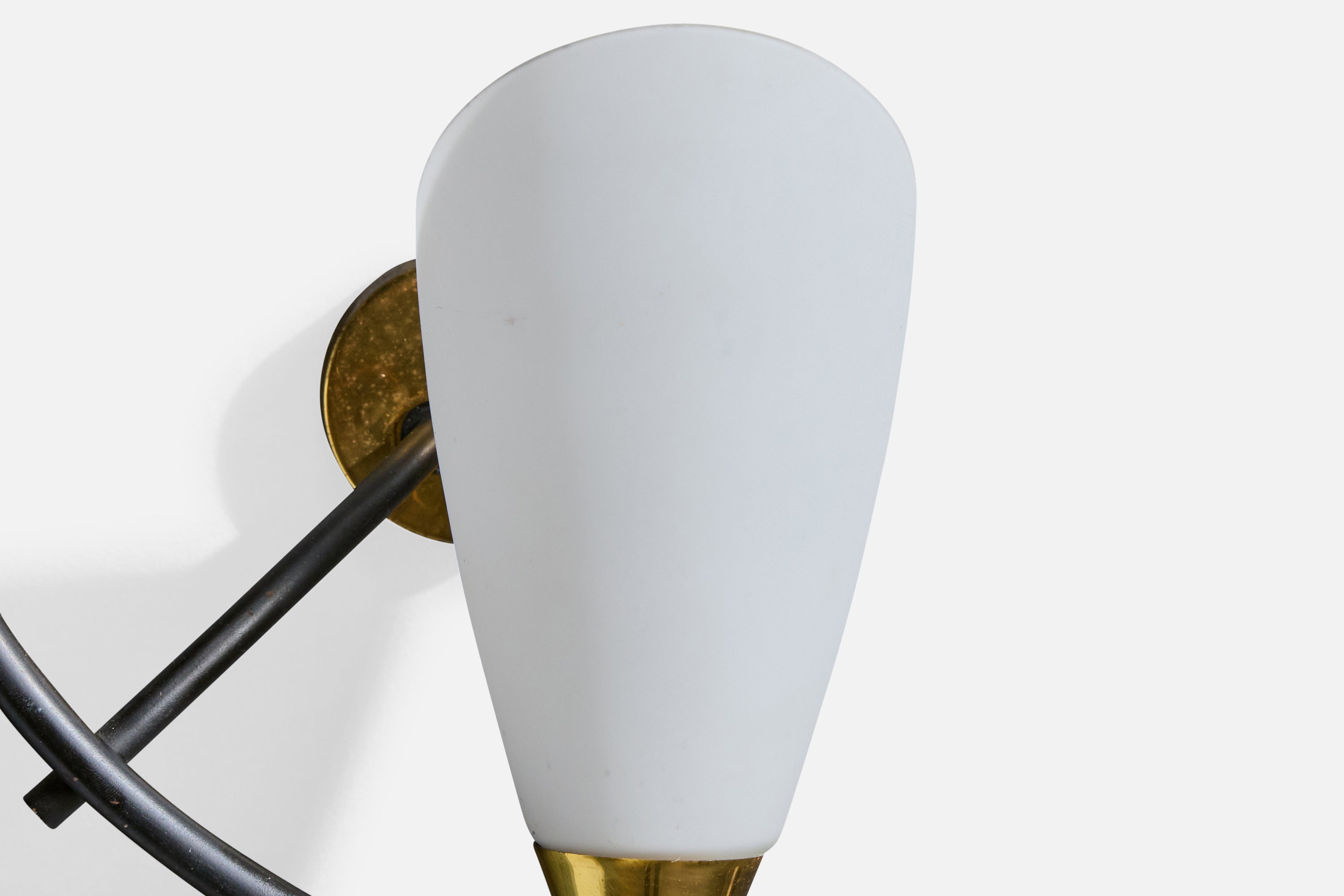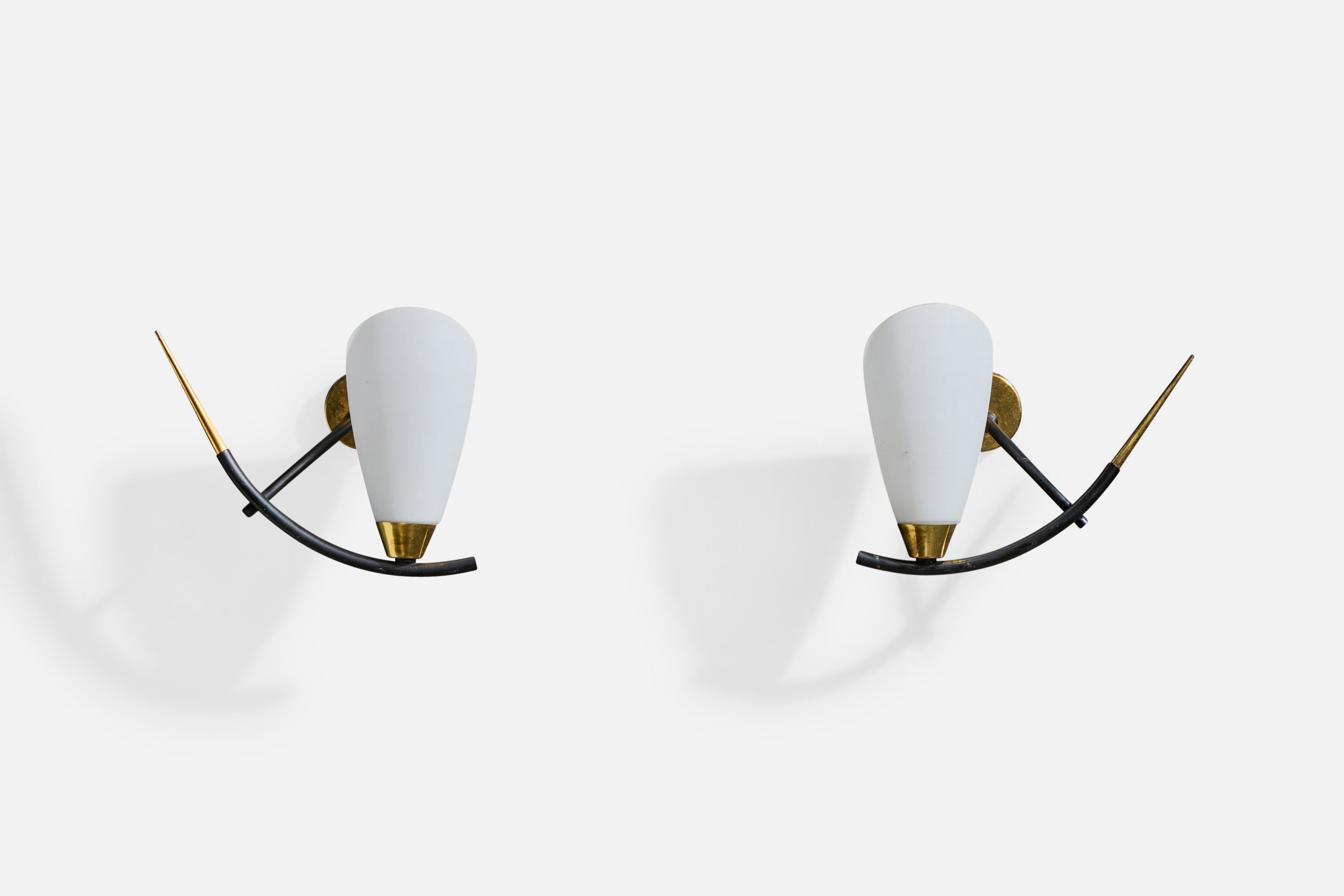 A pair of brass, black-lacquered metal and white opaline glass wall lights designed and produced in France, c. 1950s.