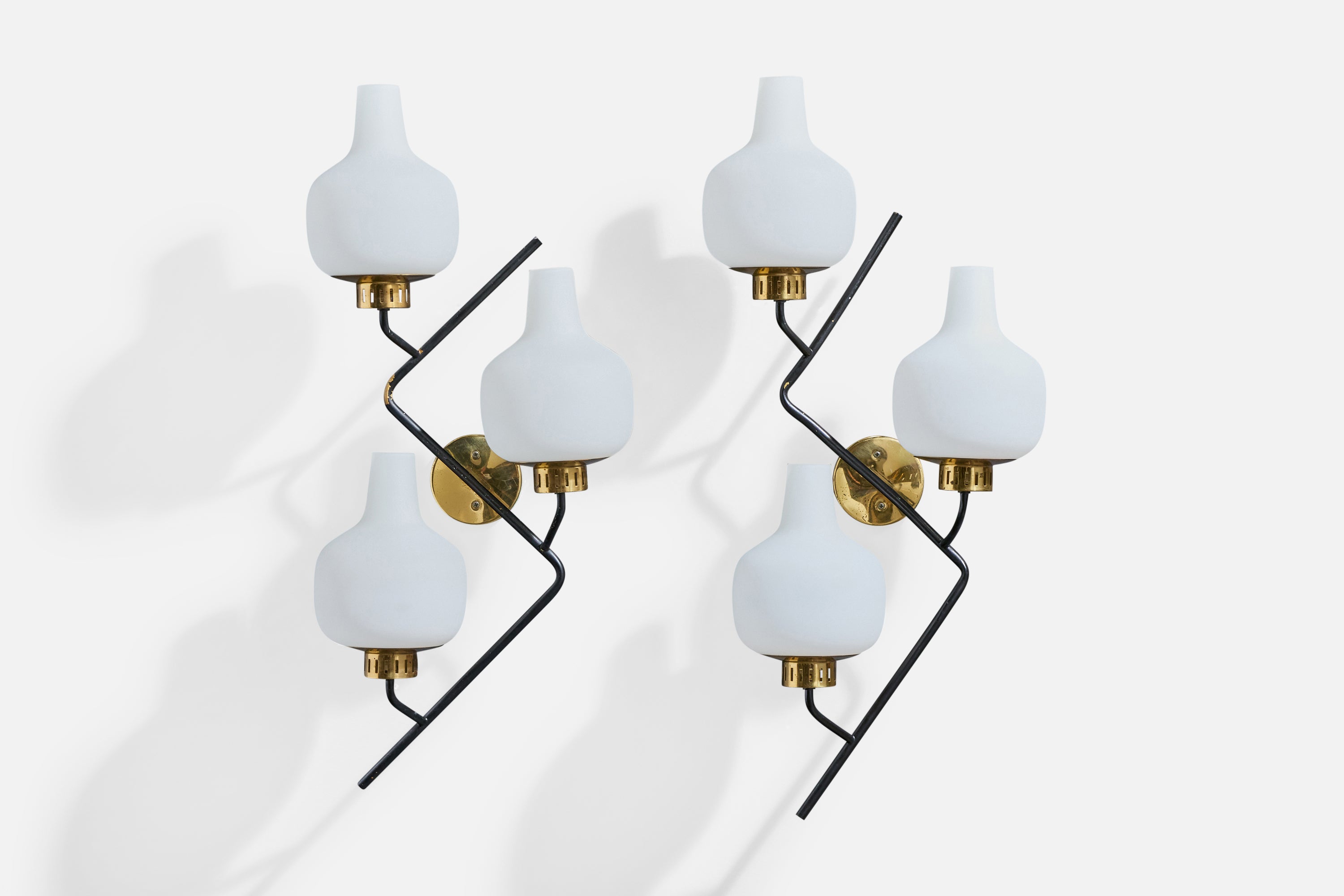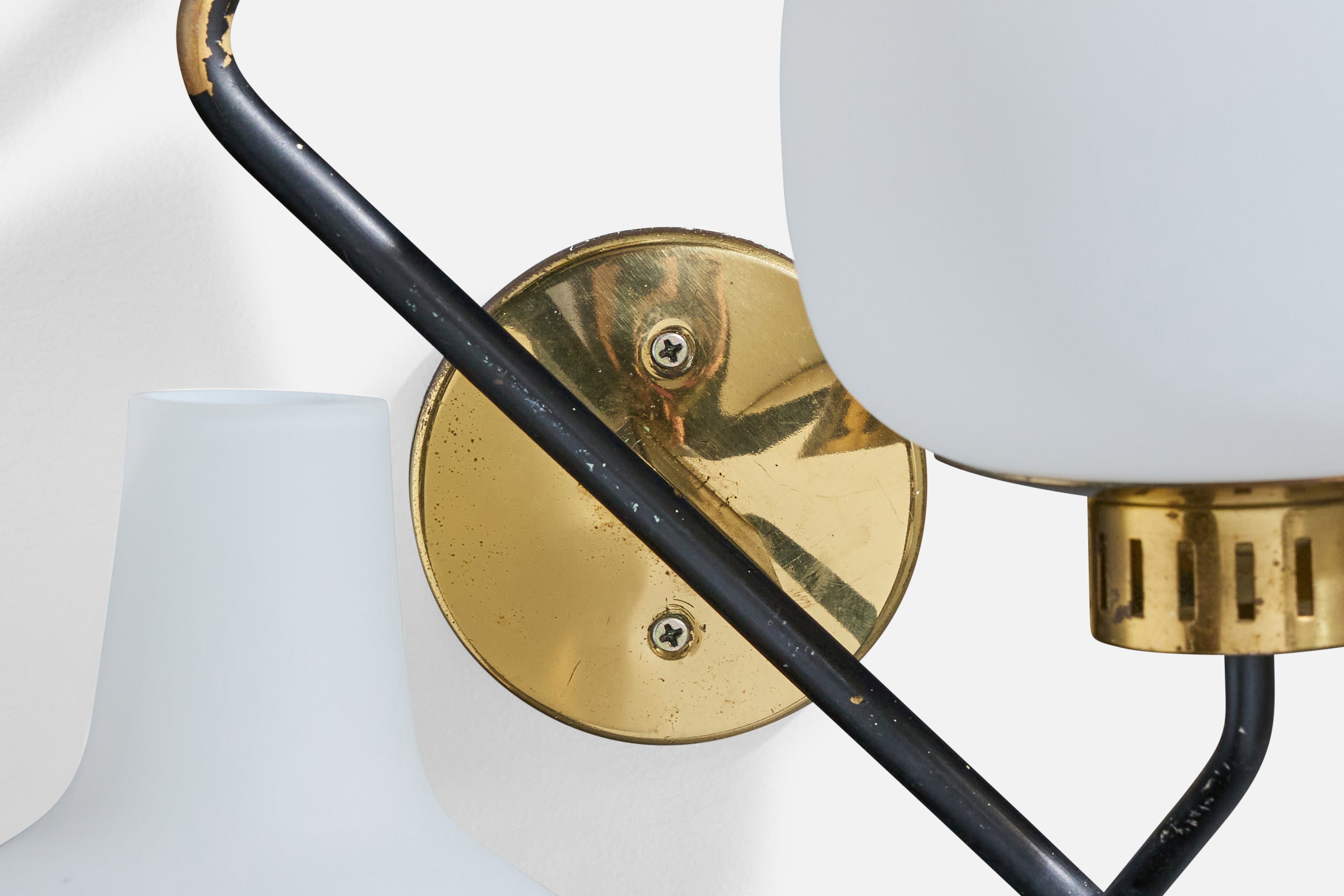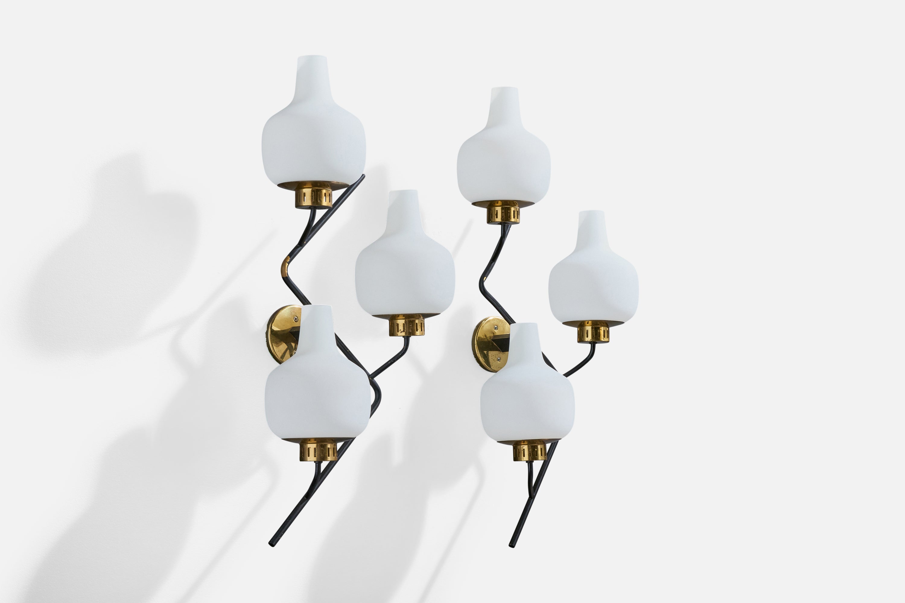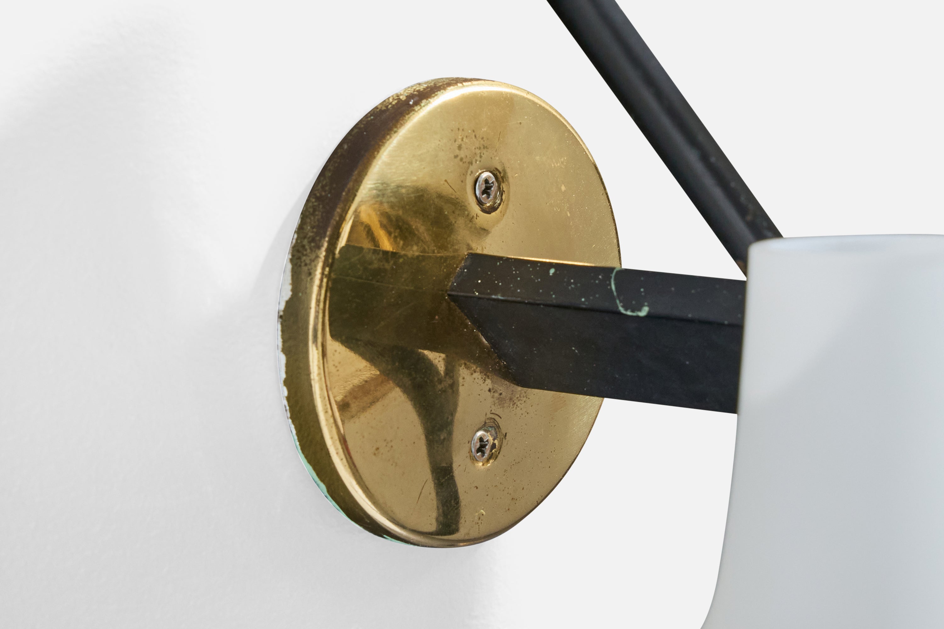 A pair of brass, black-lacquered metal and white opaline glass wall lights designed and produced in Italy, c. 1950s.